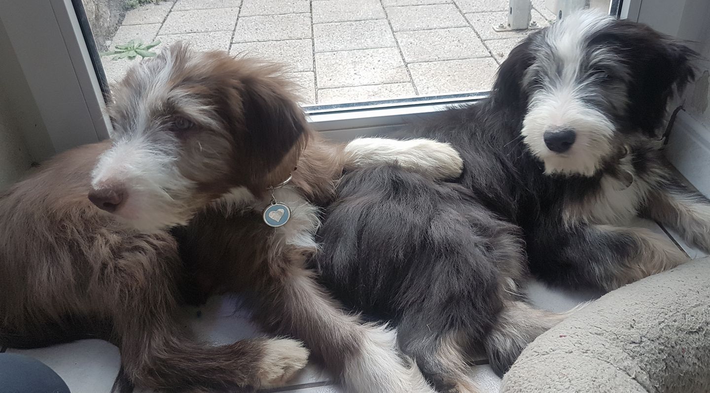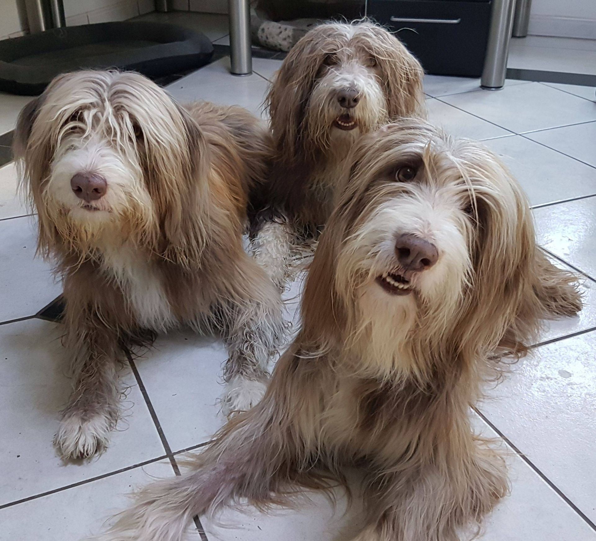 Tja, vier sind ausgezogen, dass eine Hündin bleibt, war von vornherein klar, denn genau deshalb haben wir diesen Wurf gemacht aber wir haben uns dieses Mal wirklich sehr schwer mit der Wahl getan, weil alle auf ihre Art ganz besonders waren. Blaze hingegen wusste schon zu ihrer Geburtsstunde, dass sie mein Hund wird. Sonst hätte sie sich nicht gleich in meine Hände geschmissen :-) Aber auch im Laufe der Wochen hat sie das ganz deutlich gezeigt. Schon mit geschlossenen Augen hat sie immer meine Nähe gesucht, hat gespürt, wenn ich den Raum betreten habe und lag einfach immer bei mir. Ich weiss gar nicht, wie wir das übersehen konnten? Wahrscheinlich, weil sie die „falsche“ Farbe hatte, obwohl sie sich so bemüht hat, im Braun aufzuholen. So haben wir halt jetzt unseren ersten, fast schwarzen Beardie. Aber…. ohne braun geht wohl doch nicht. Für Brady waren sehr viele Interessenten da aber irgendwie konnte unser Herz nicht loslassen. Wirklich einlassen konnte ich mich auf niemanden. So wie sich Blaze mich ausgesucht hat, hat sich Brady Jochen ausgesucht. Jetzt haben wir nicht nur die „falsche“ Farbe sondern auch noch das „falsche“ Geschlecht :-) Unser erster Rüde, der nie geplant war aber jetzt nicht mehr wegzudenken ist. Was sagt uns das? Sag niemals nie. Sämtliche Vorsätze wurden über Bord geworfen - niemals zwei Welpen gleichzeitig und niemals einen Rüden in einen Weiberhaushalt. Es ist verrückt und es wird sich vieles ändern aber wir haben es keine Sekunde bereut. Brady ist so ein lieber Schatz und es stimmt einfach doch, dass Rüden anders sind.