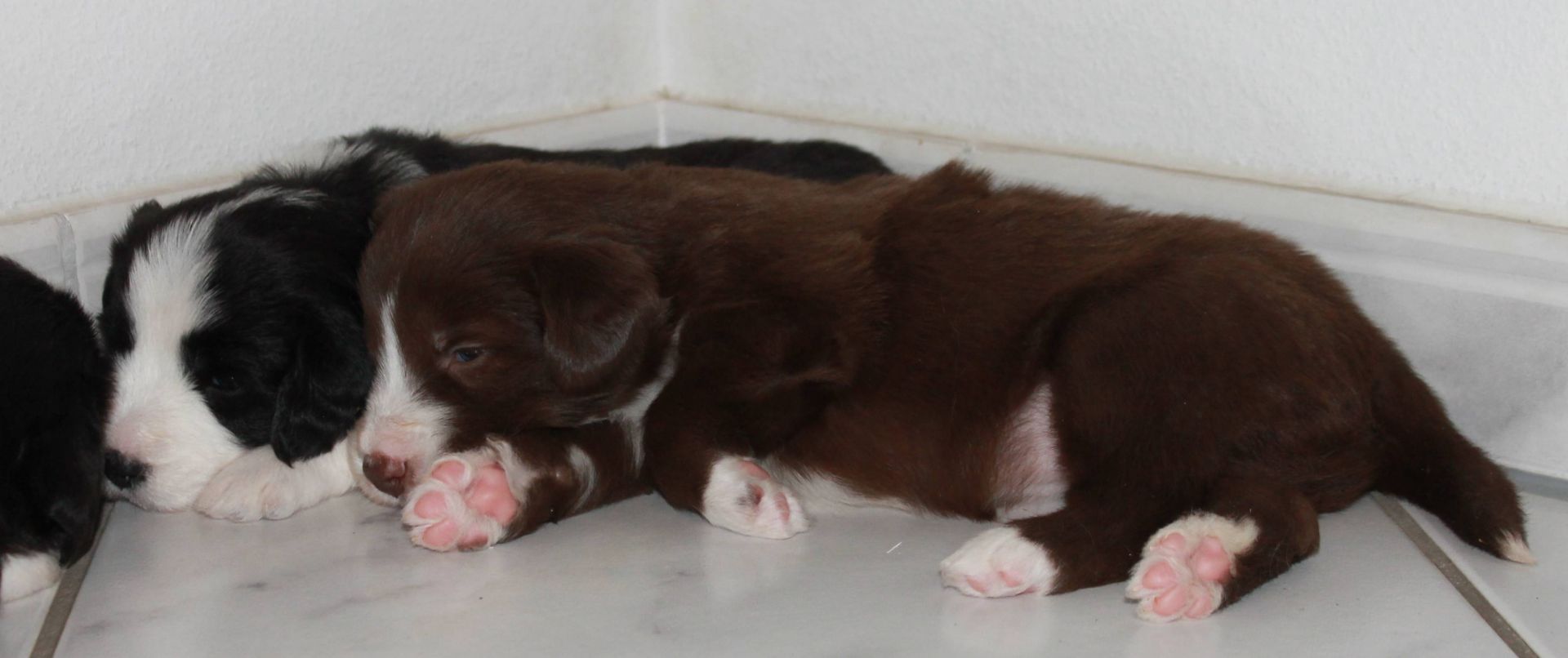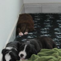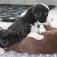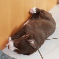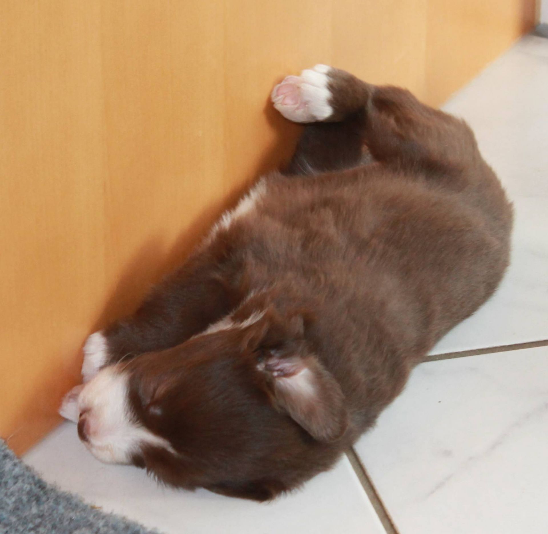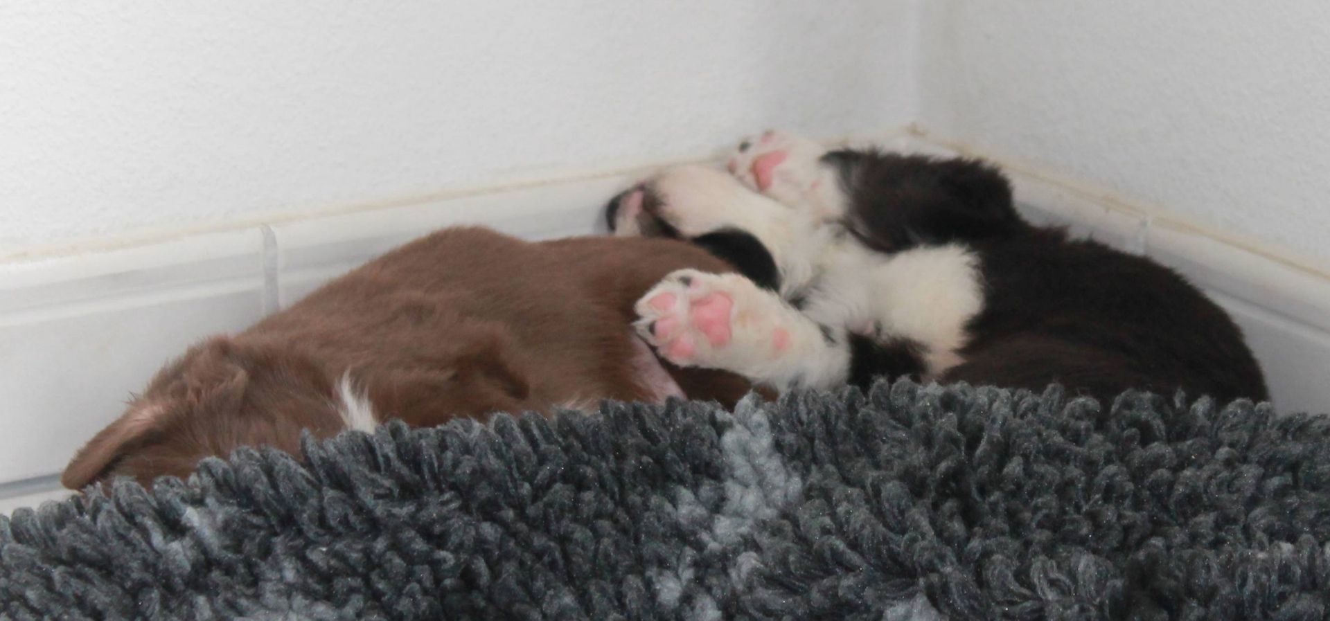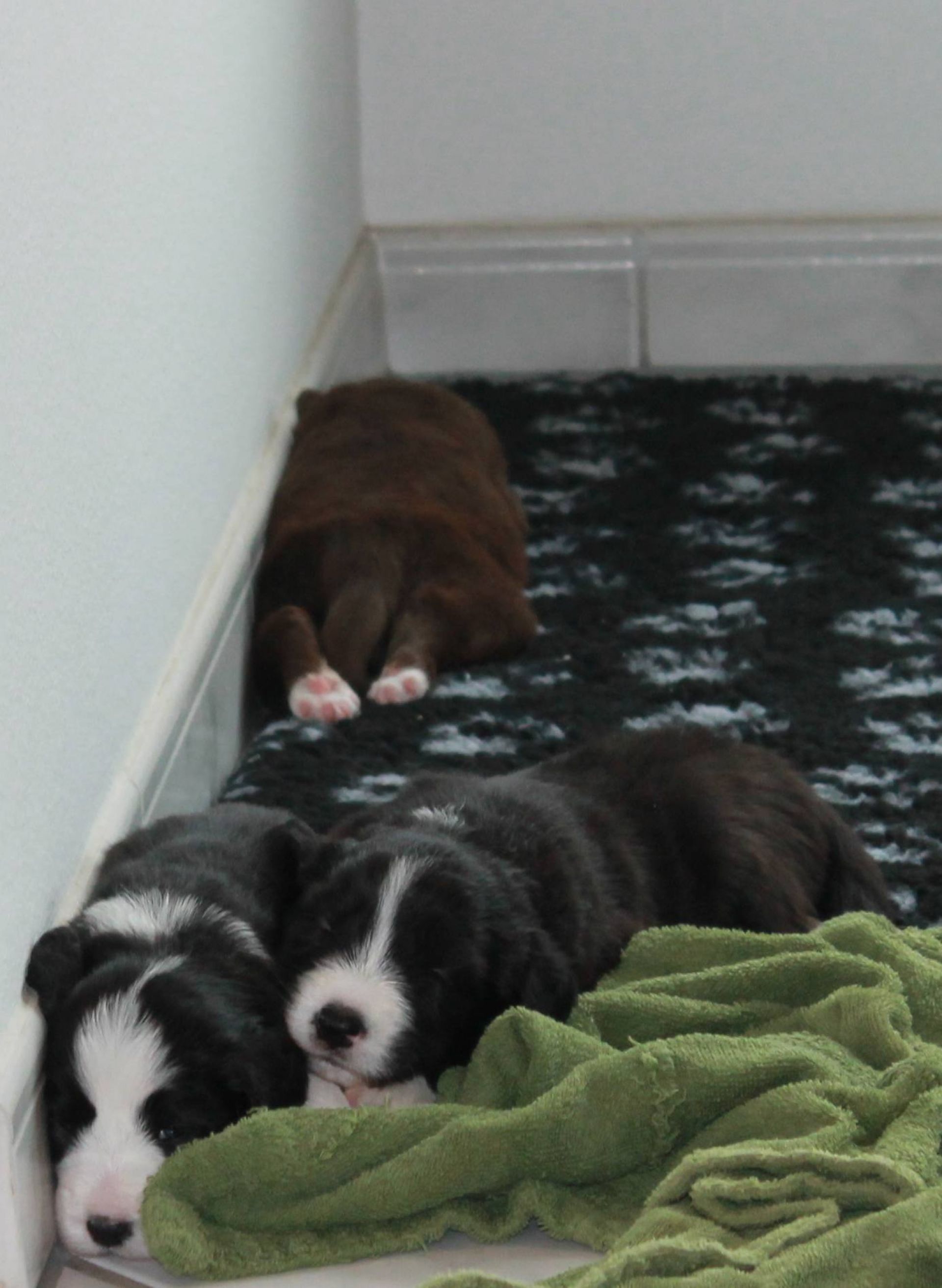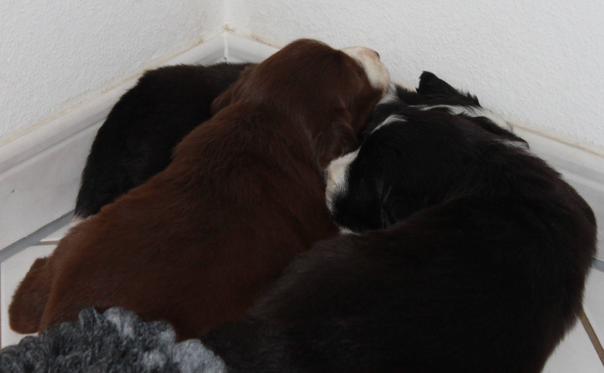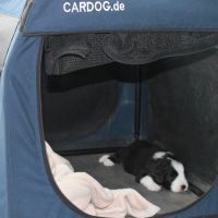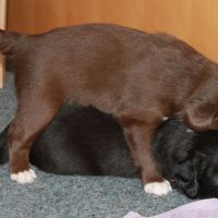 Heute hatten wir nochmal eine Premiere - Easy durfte zum ersten Mal zu den Welpen. Ok, ich musste Pebbles ein bisschen daran erinnern, dass sie nicht die Weltherrschaft hat :D Als das geklärt war, lag Easy im Auslauf und Pebbles draussen und hat ganz entspannt geschlafen. Easy fand die Welpen allerdings ein bissle gruselig, vorallem als sie andocken wollten.
