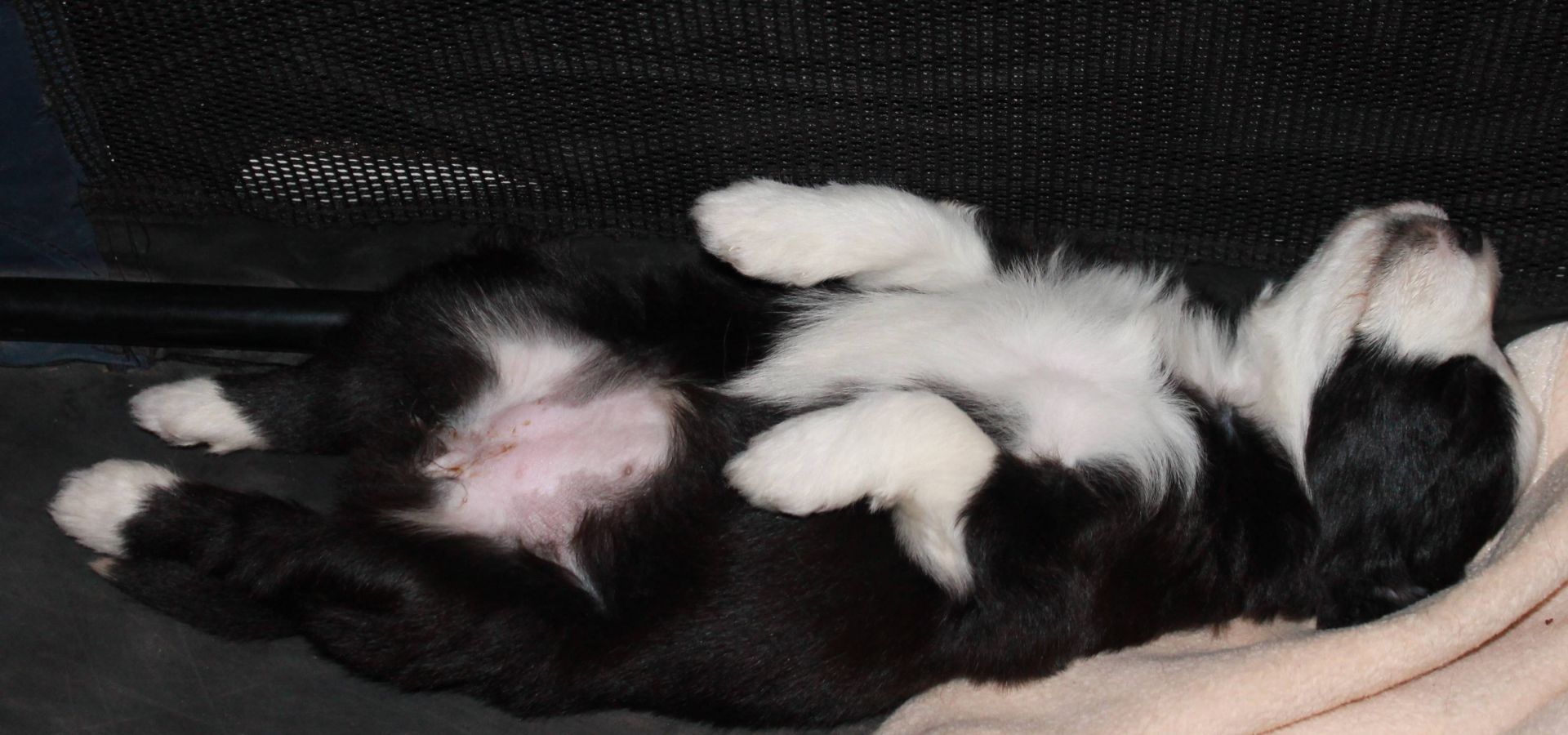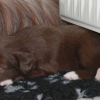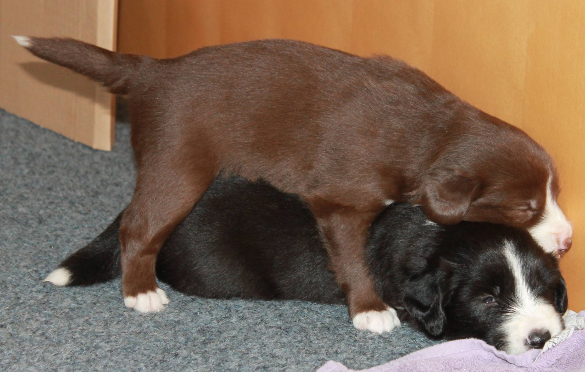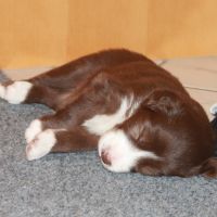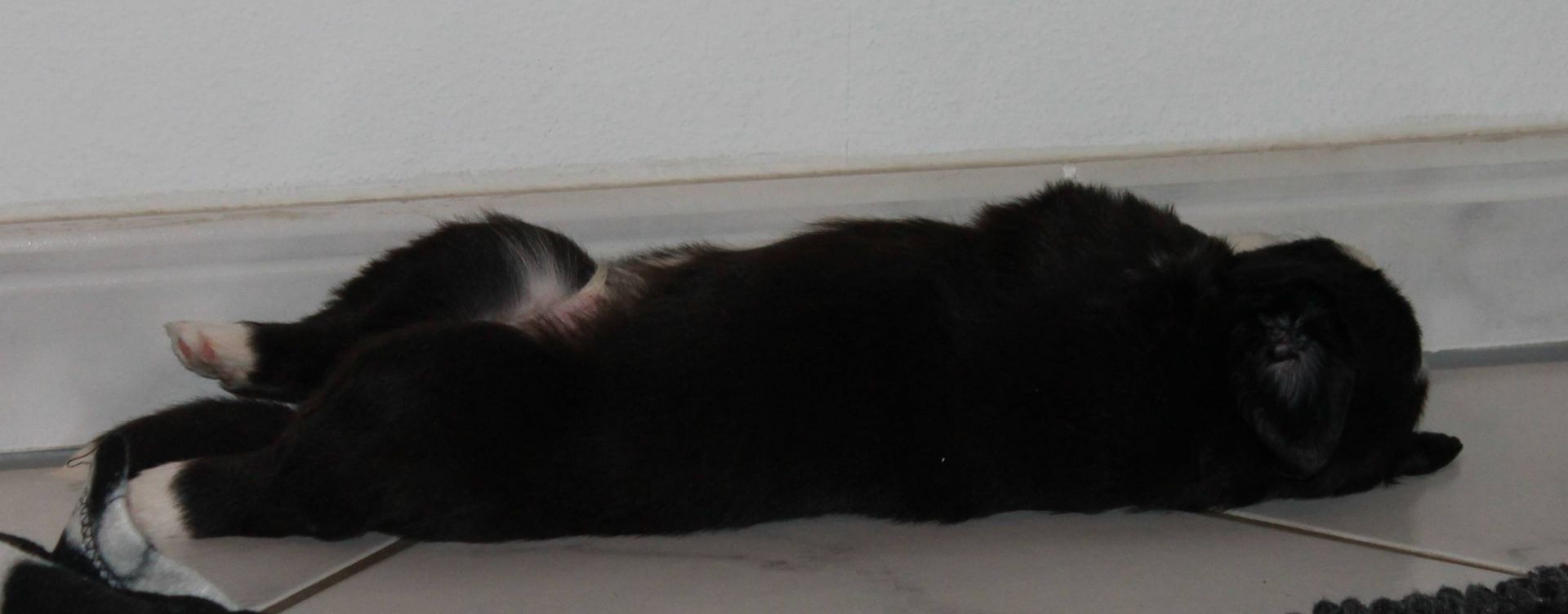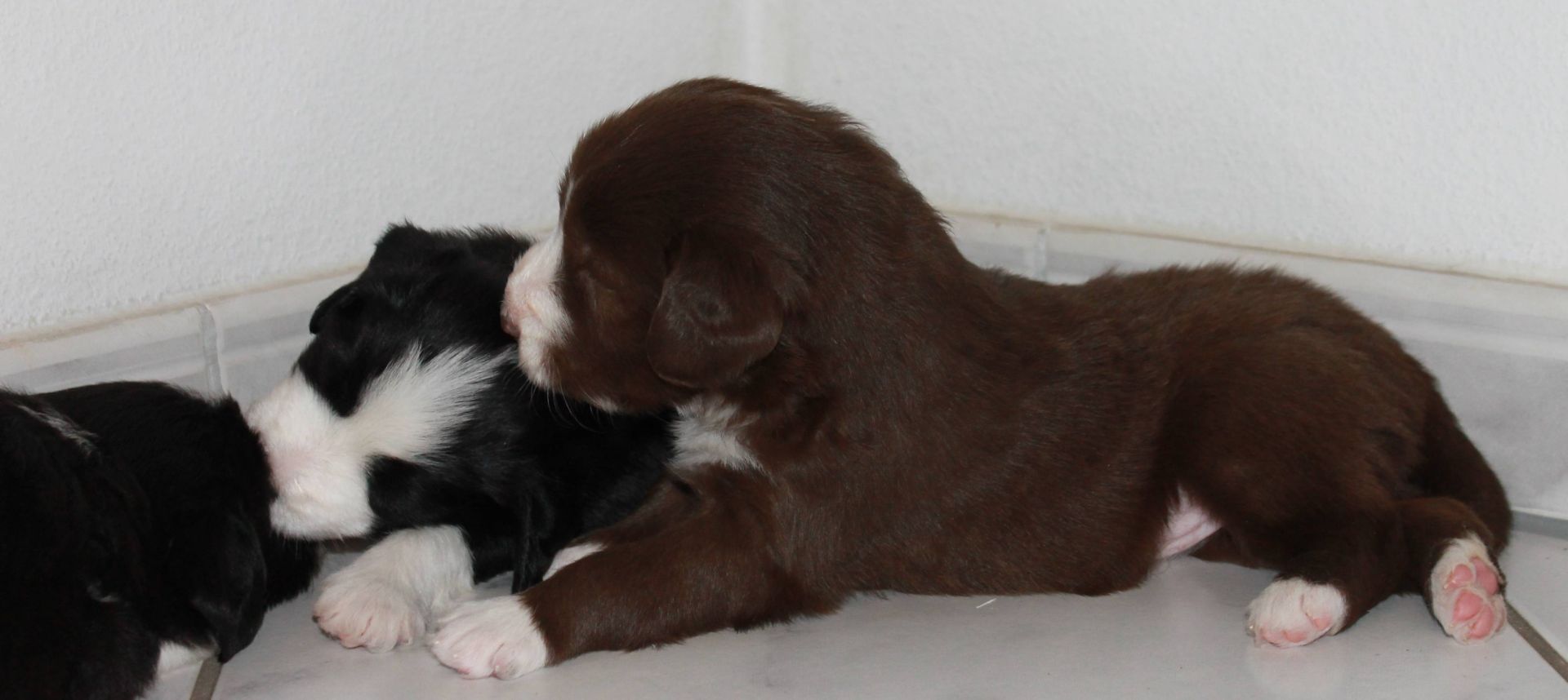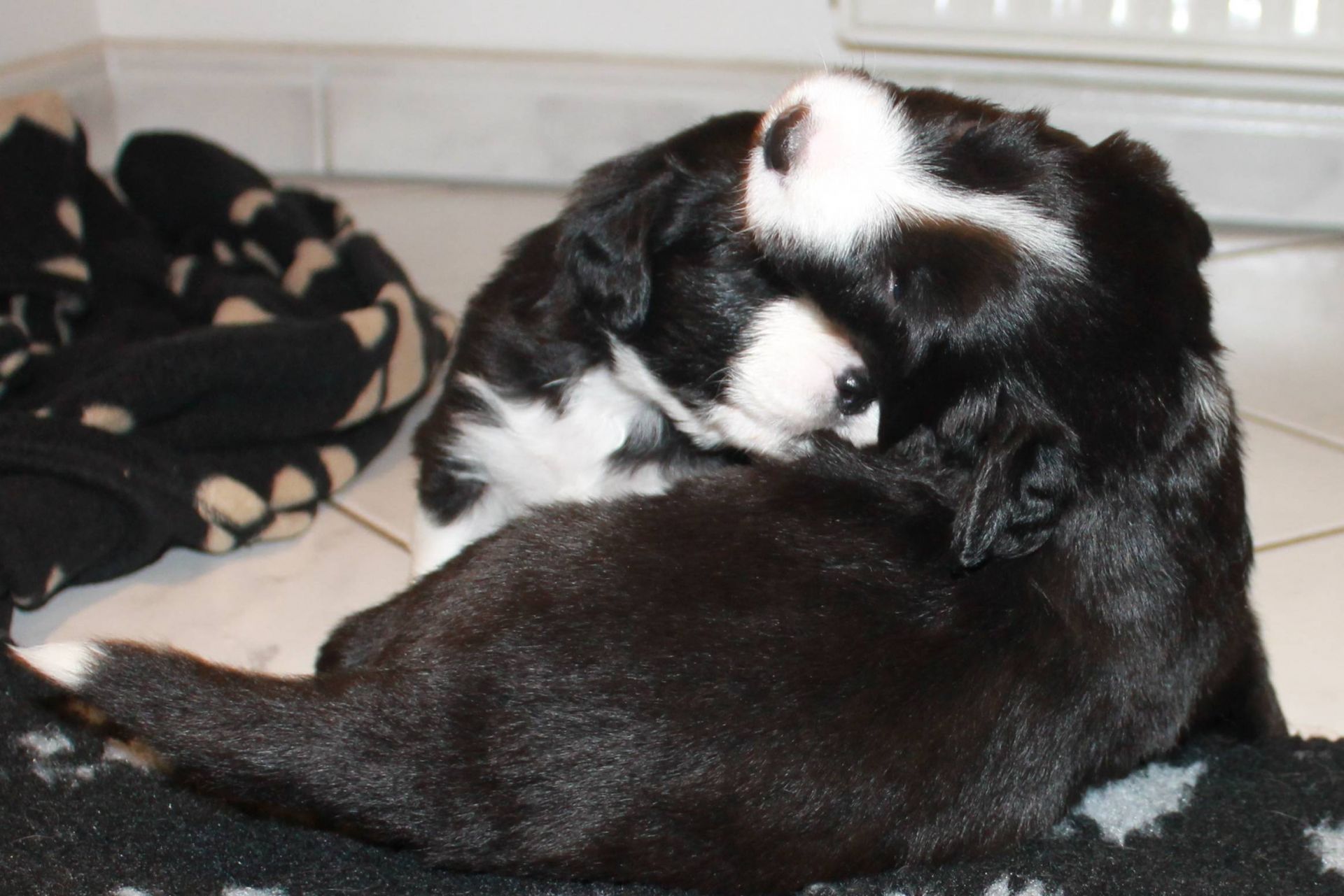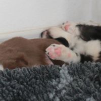 Heute hatten wir nochmal eine Premiere - Easy durfte zum ersten Mal zu den Welpen. Ok, ich musste Pebbles ein bisschen daran erinnern, dass sie nicht die Weltherrschaft hat :D Als das geklärt war, lag Easy im Auslauf und Pebbles draussen und hat ganz entspannt geschlafen. Easy fand die Welpen allerdings ein bissle gruselig, vorallem als sie andocken wollten.