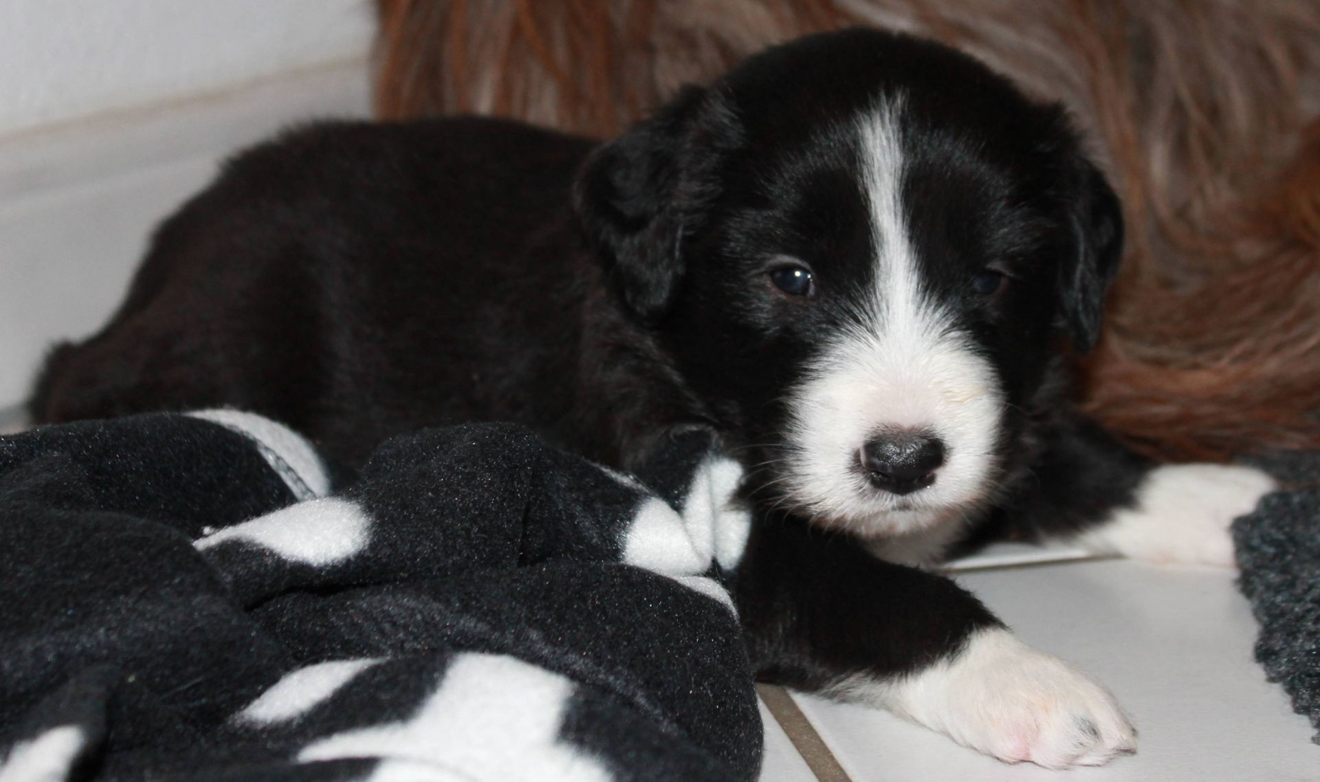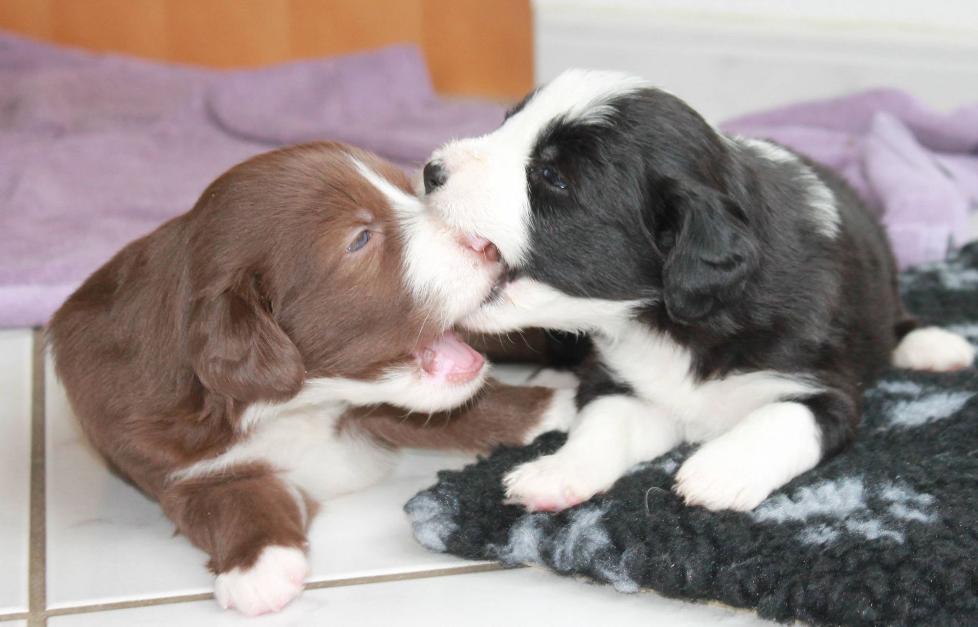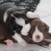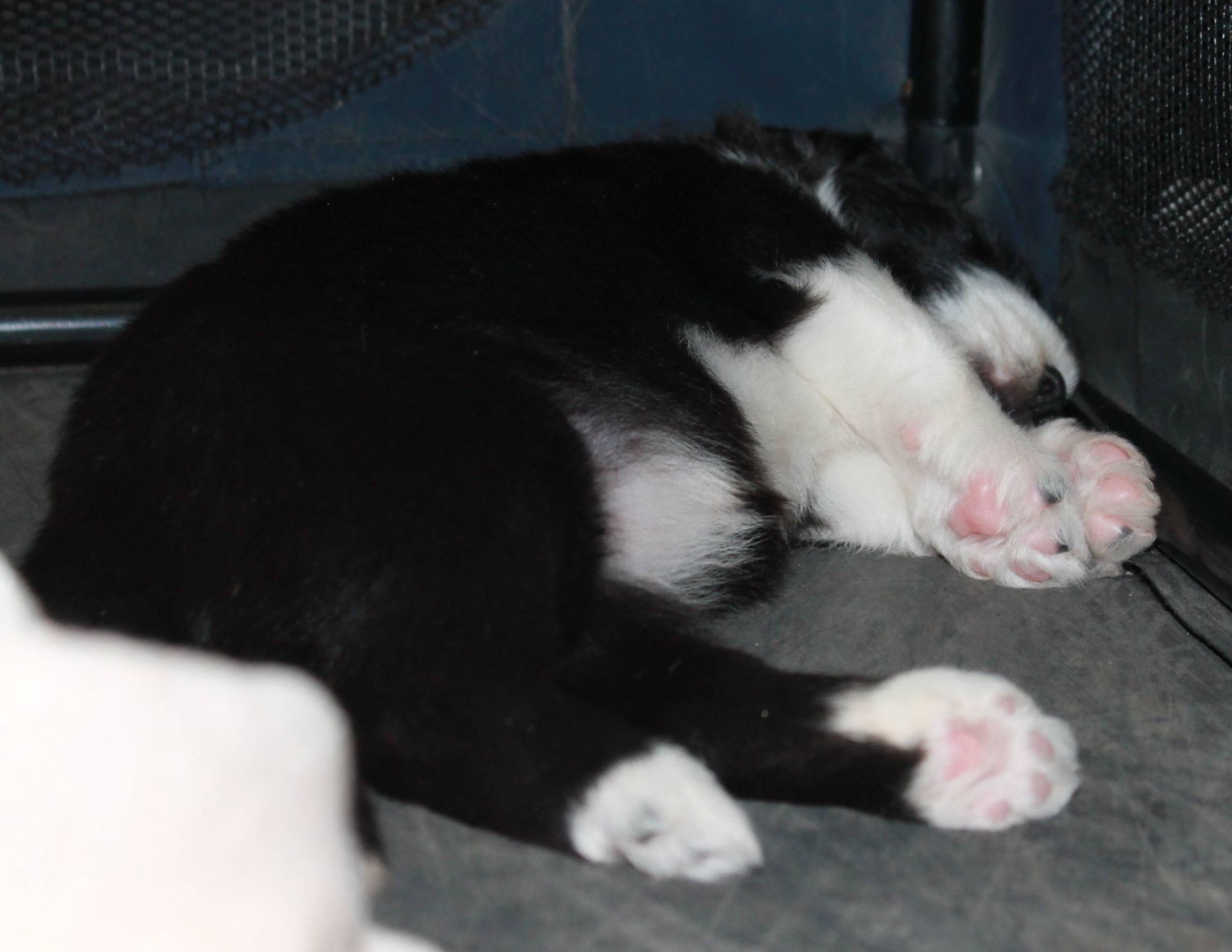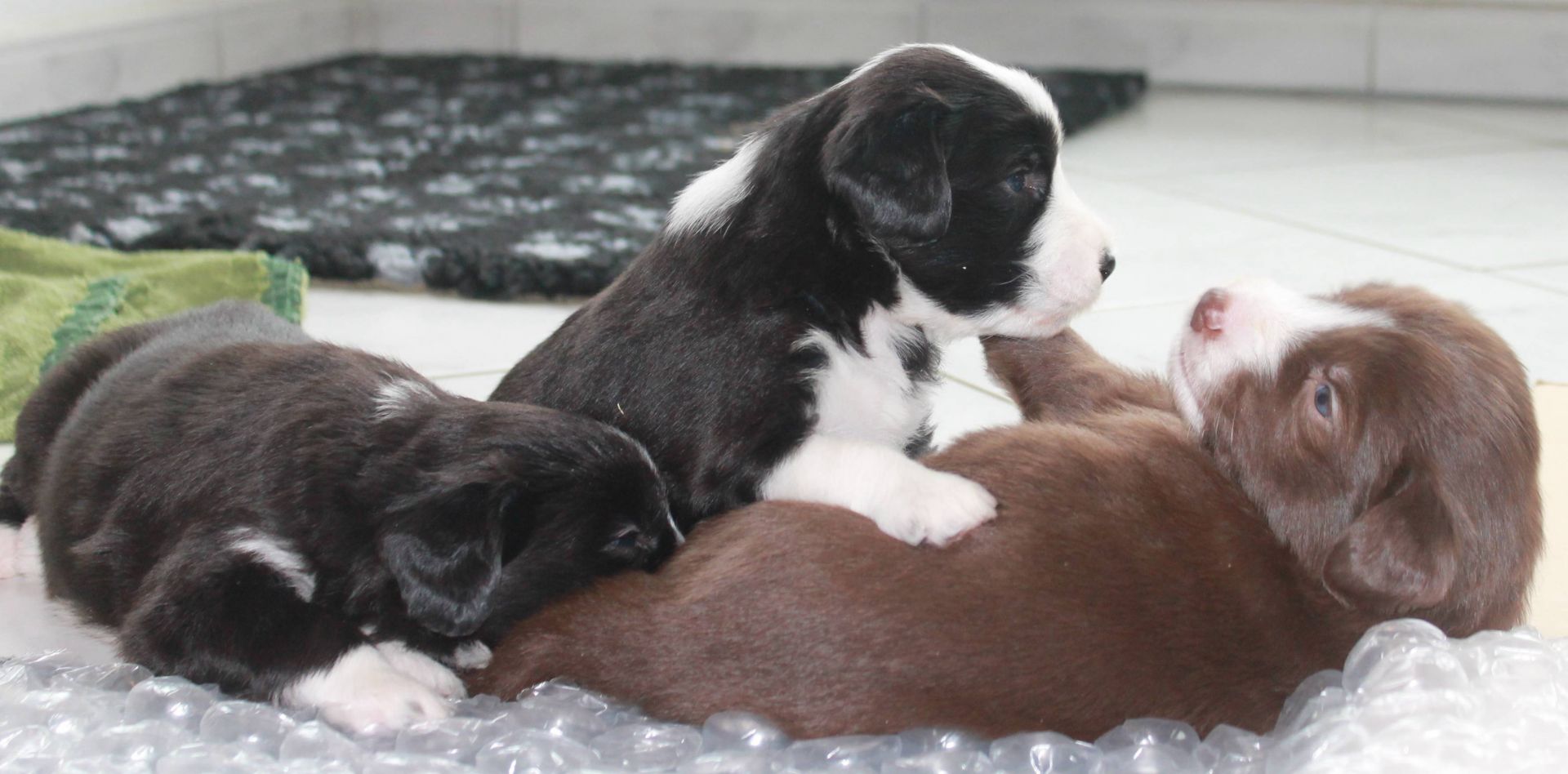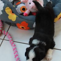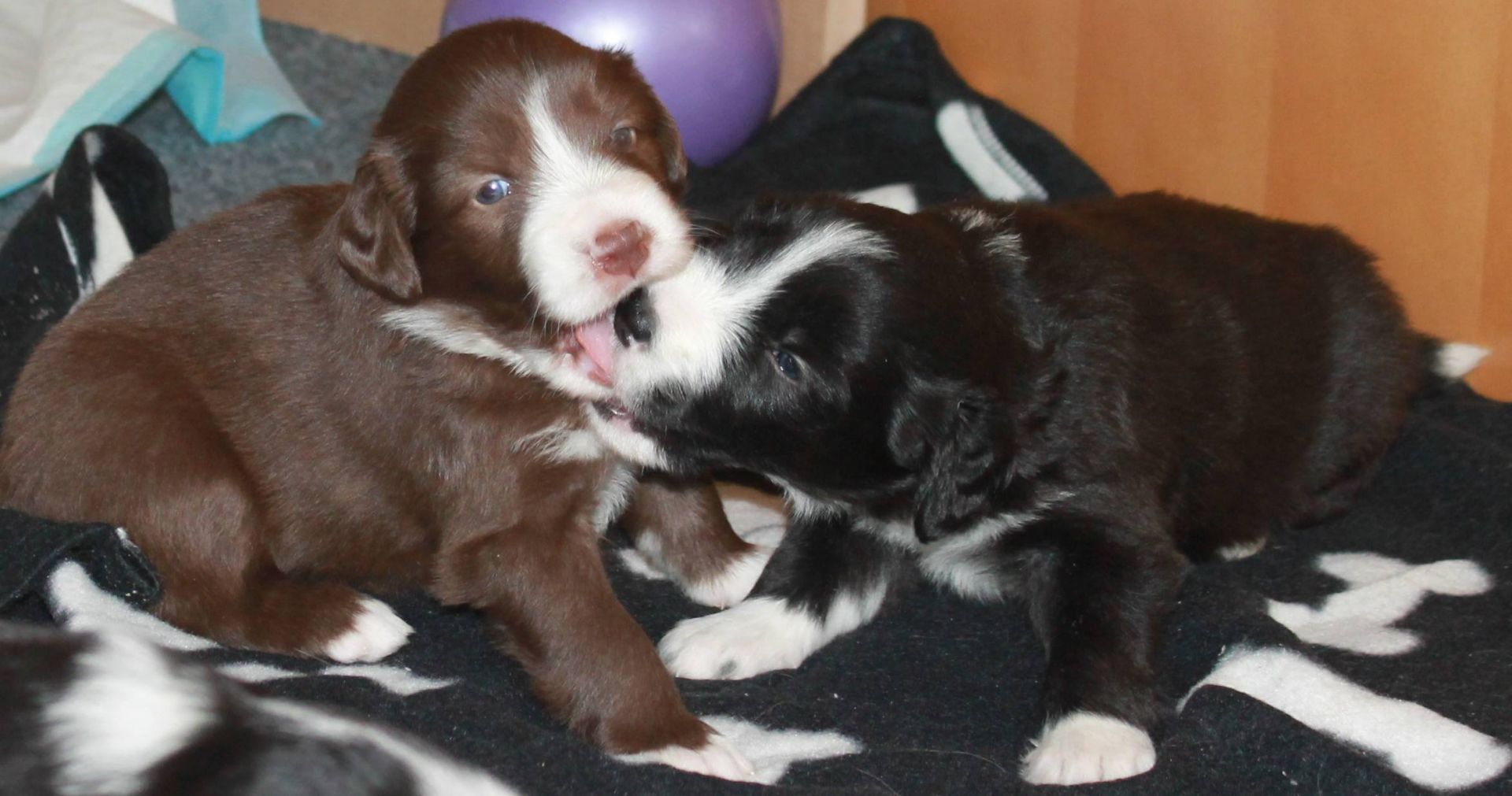 Heute hatten wir nochmal eine Premiere - Easy durfte zum ersten Mal zu den Welpen. Ok, ich musste Pebbles ein bisschen daran erinnern, dass sie nicht die Weltherrschaft hat :D Als das geklärt war, lag Easy im Auslauf und Pebbles draussen und hat ganz entspannt geschlafen. Easy fand die Welpen allerdings ein bissle gruselig, vorallem als sie andocken wollten.