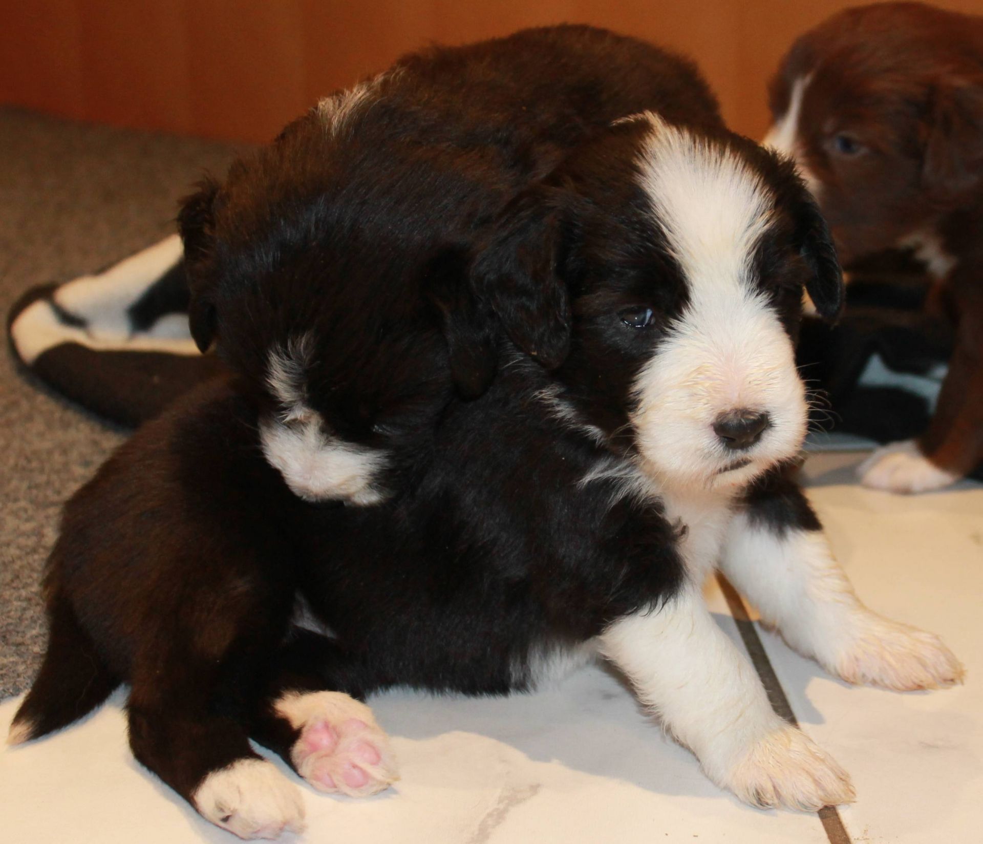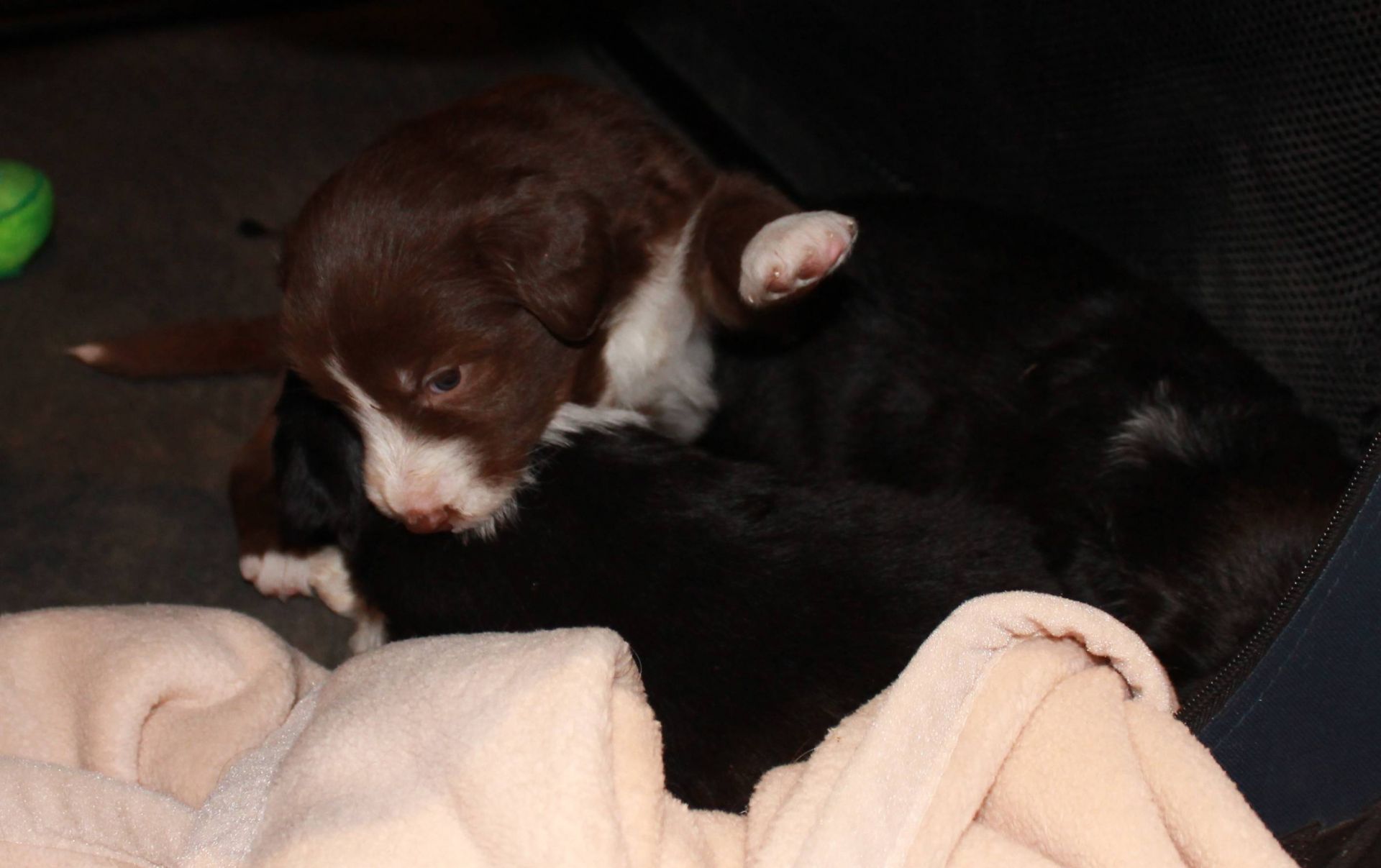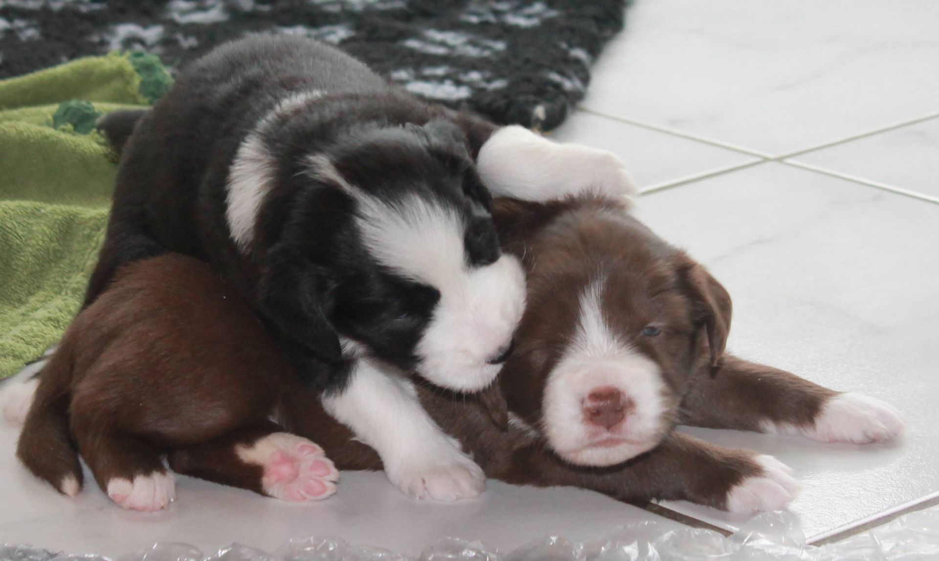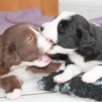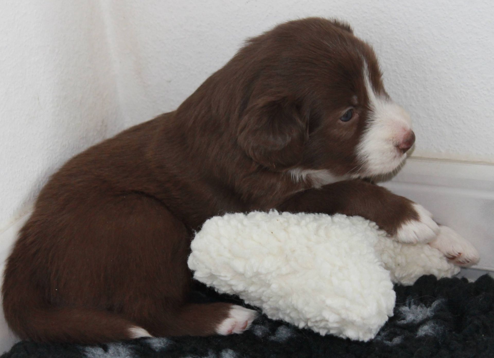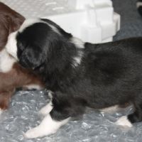 Heute hatten wir nochmal eine Premiere - Easy durfte zum ersten Mal zu den Welpen. Ok, ich musste Pebbles ein bisschen daran erinnern, dass sie nicht die Weltherrschaft hat :D Als das geklärt war, lag Easy im Auslauf und Pebbles draussen und hat ganz entspannt geschlafen. Easy fand die Welpen allerdings ein bissle gruselig, vorallem als sie andocken wollten.