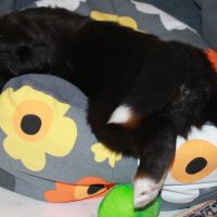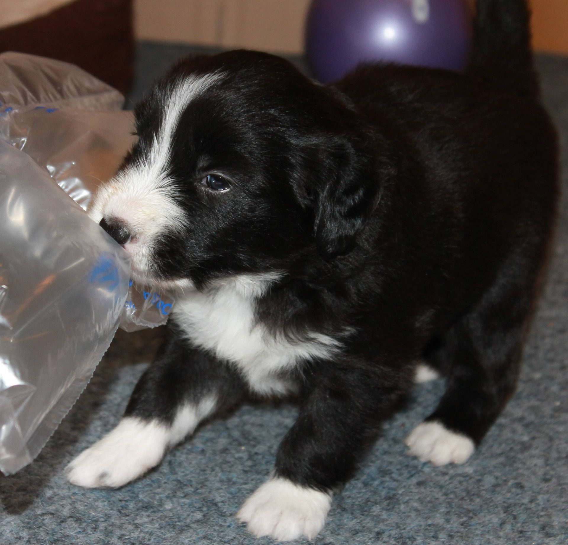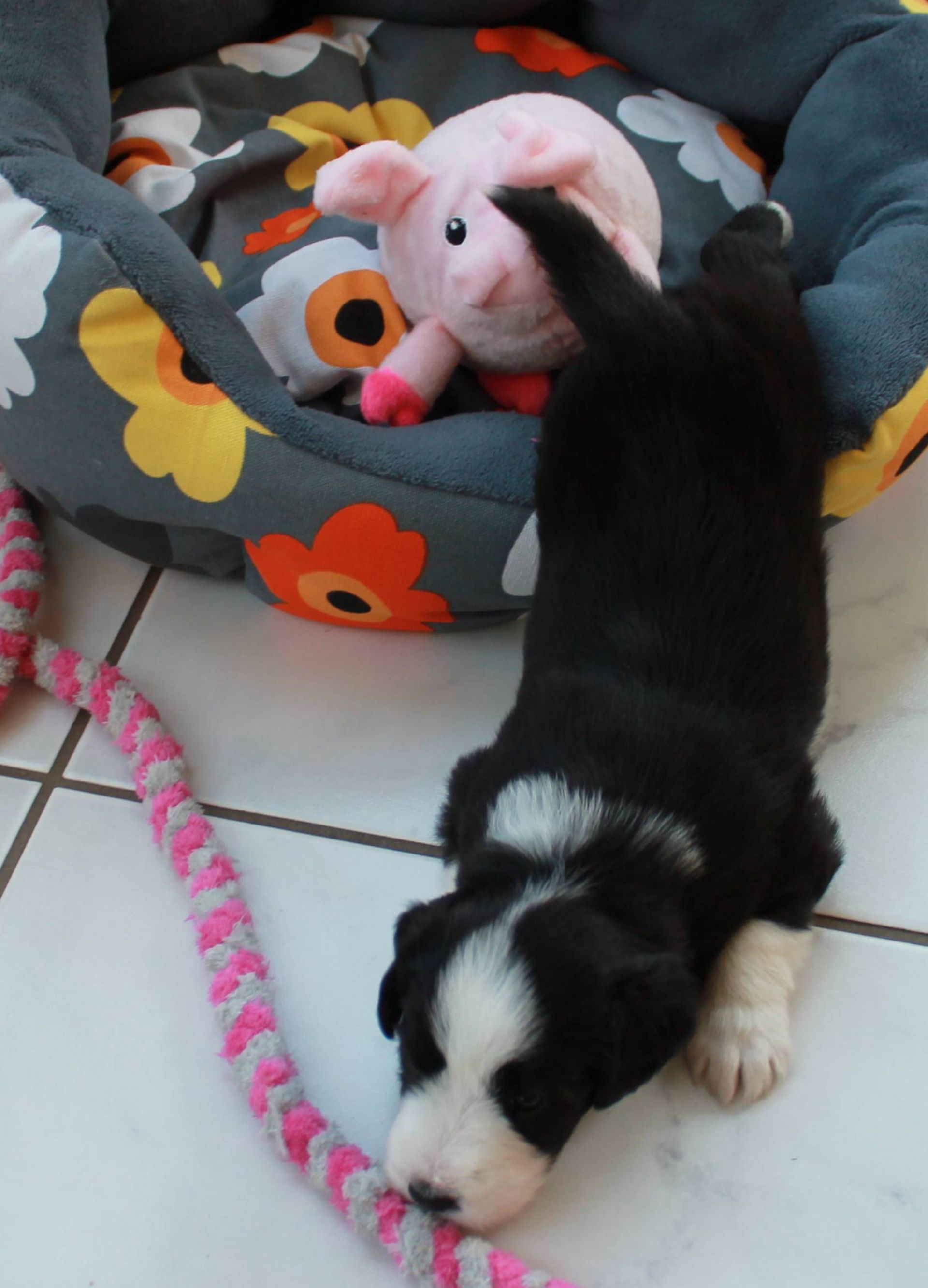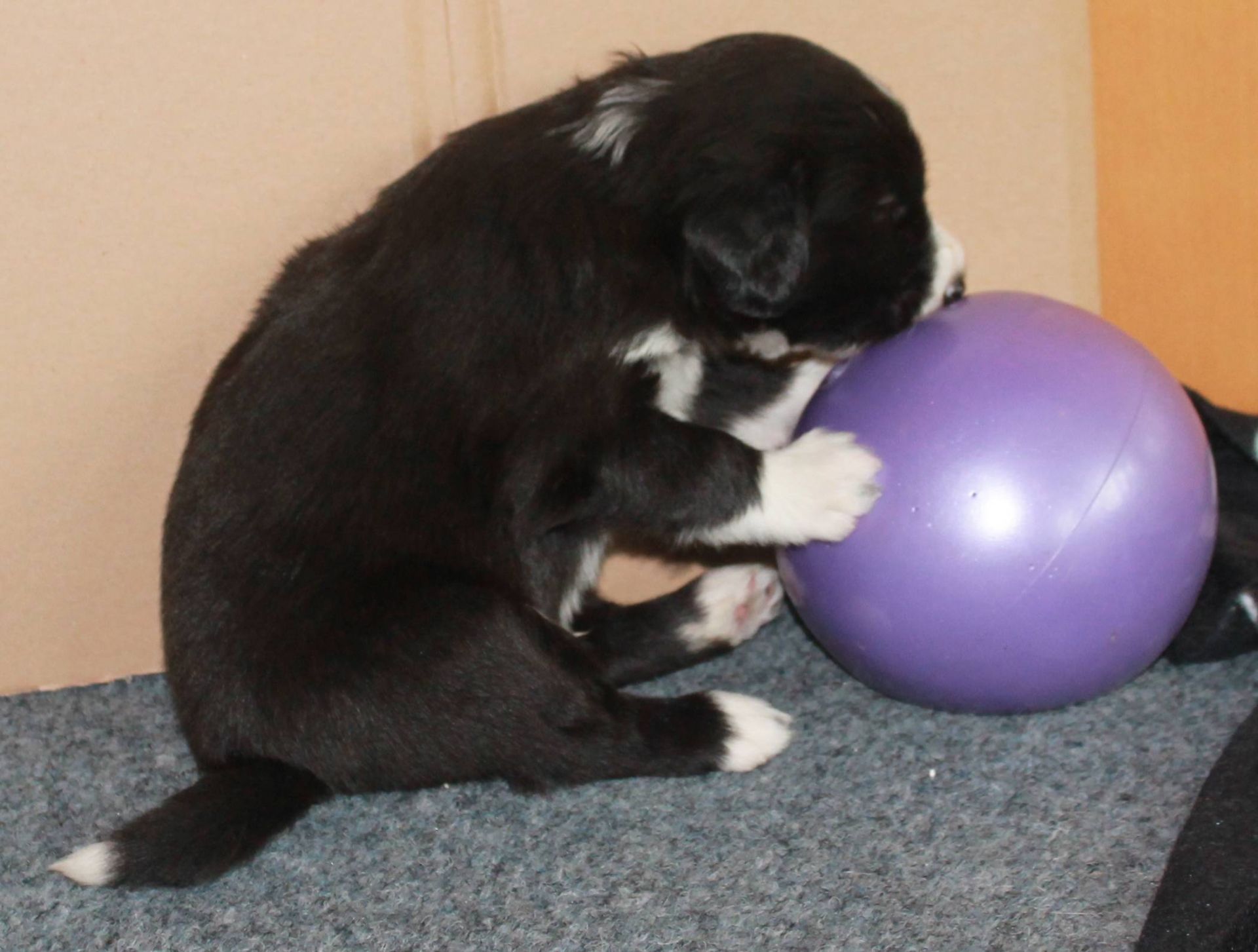 Die Babies werden immer mutiger. Inzwischen haben sie den ganzen Auslauf inspiziert, während sie sich gestern nur auf einer Seite aufgehalten haben. Auch das neue Spielzeug wird begeistert angenommen. Sie haben vor gar nichts Angst. Weder vor der Luftpolsterfolie, die regelmässig knallt, wenn ich aus Versersehen drauf trete noch vor der Geräusche CD, die heute zum ersten Mal gelaufen ist. Gewitter und Silvester kennen sie schon mal :D