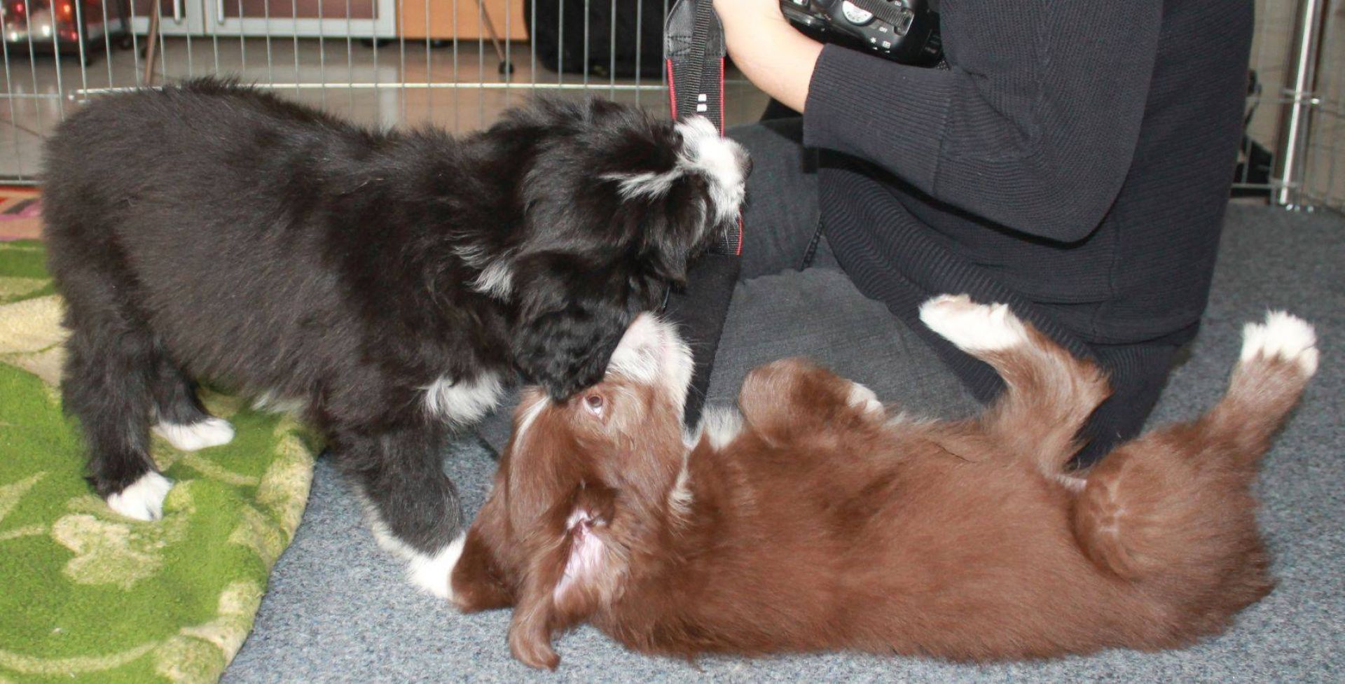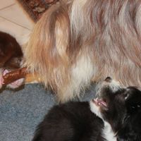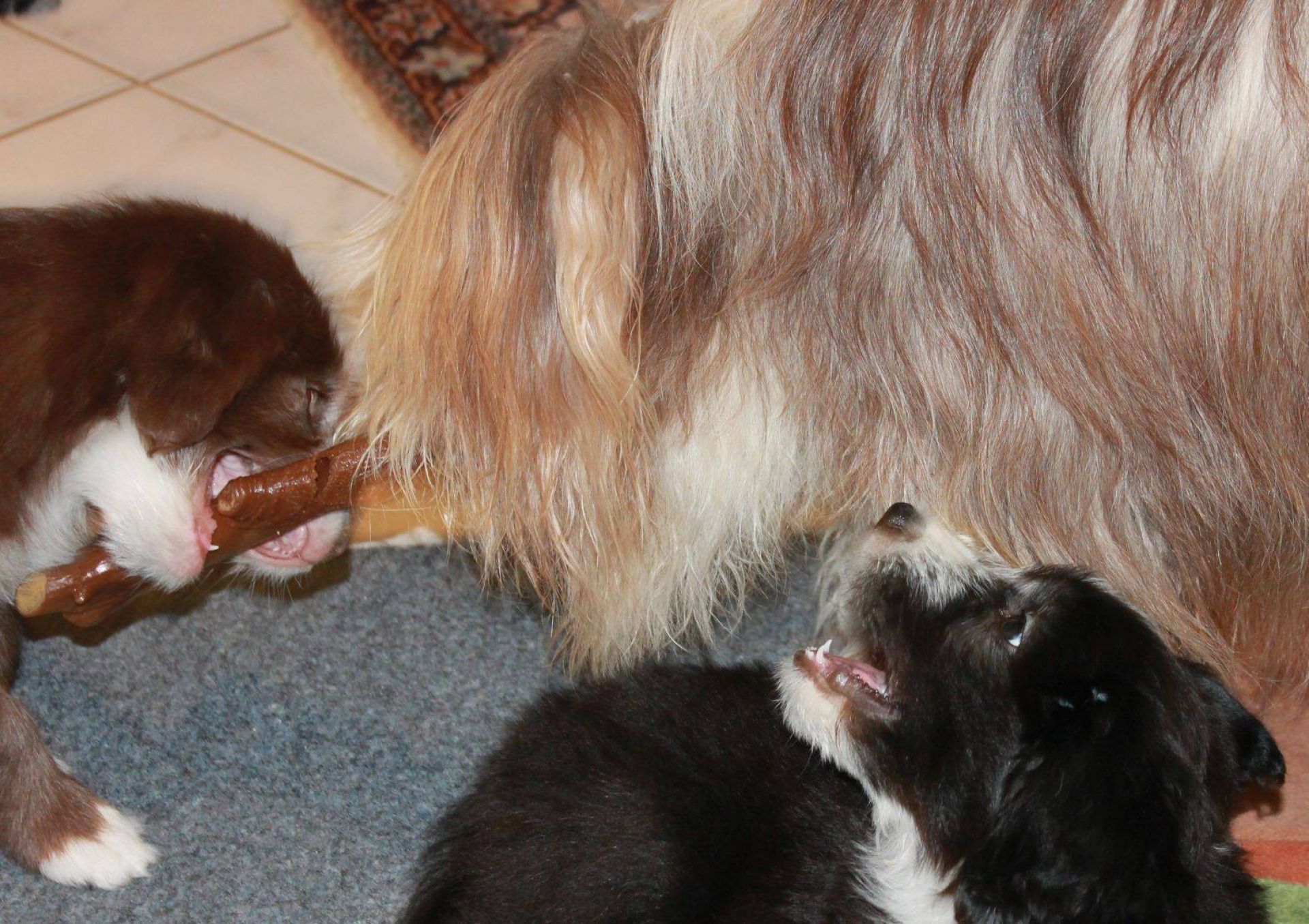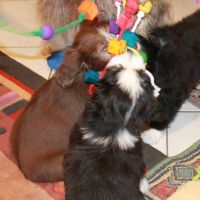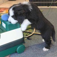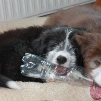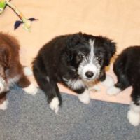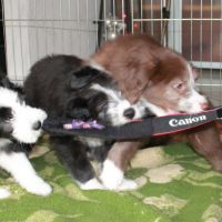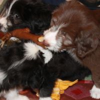 Der Zuchtwart war heute zur Endabnahme da. Pebbles hat einen super Job gemacht. Ok, Angus hat auch einen Großteil dazu beigetragen aber wie das halt so ist - der Vater hält sich aus der Erziehung raus :D Die Welpen sind super sozialisiert, sehr kontaktfreudig, aufgeschlossen, neugierig und ausgeglichen. Sie spielen inclusive der Mama sehr harmonisch und ruhig miteinander. Zudem ist die Beisshemmung schon ziemlich gut augeprägt. Man sieht das übrigens an meinen Händen, die als Übungsobjekt herhalten mussten :-) Jedenfalls bin ich super stolz auf meine coolen Welpen! Eingeclickert sind sie seit gestern auch. Es ist unglaublich, wie schnell sie lernen. Sitz mit Blickkontakt können sie jetzt schon ganz ruhig und ausdauernd.