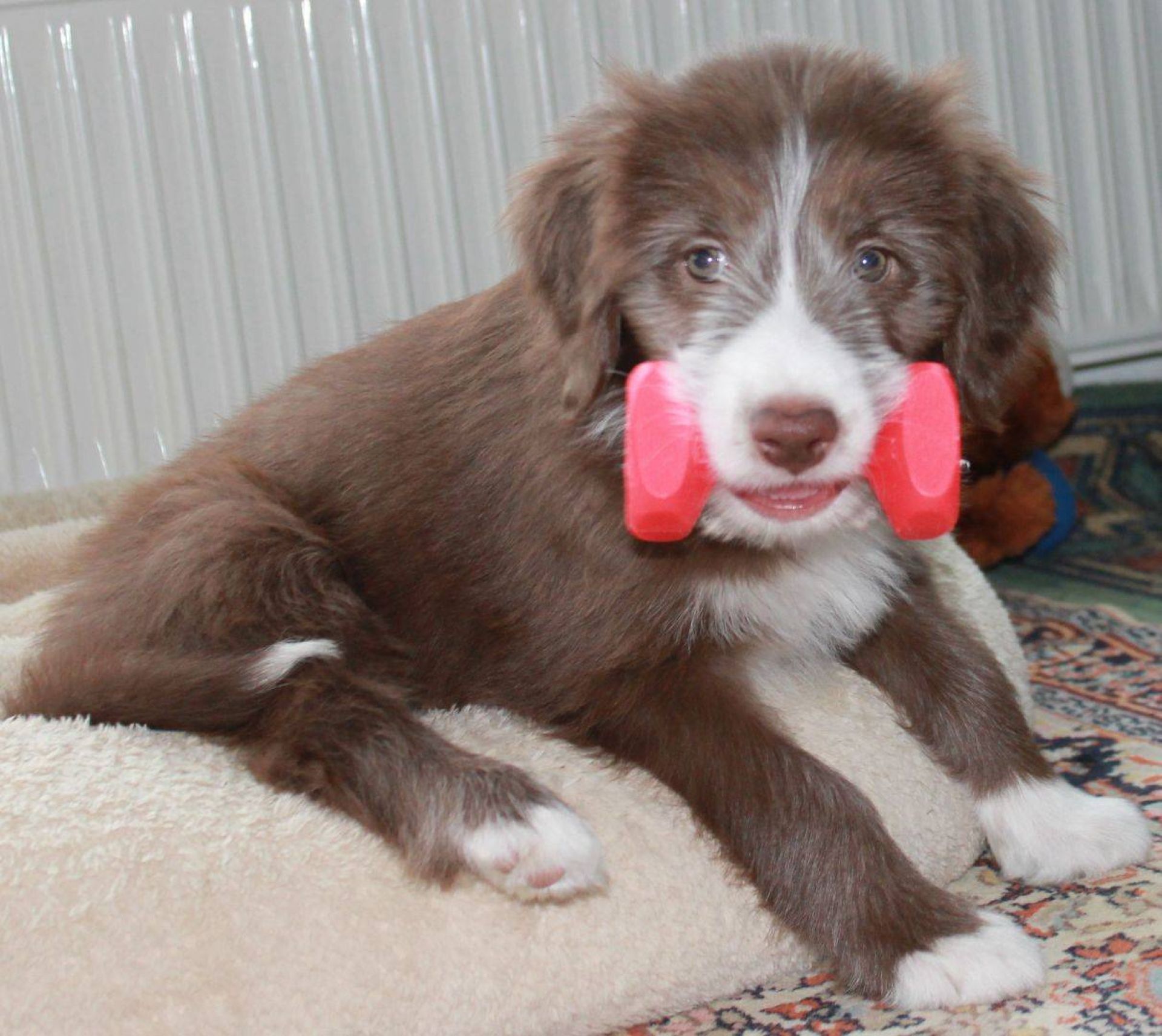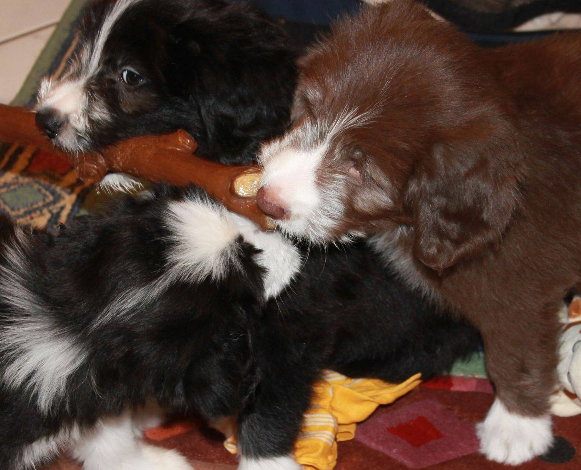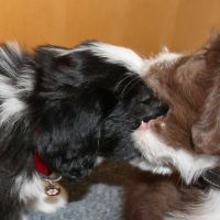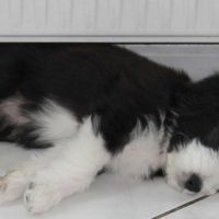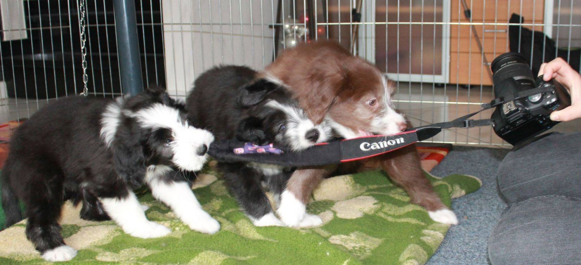 Der Zuchtwart war heute zur Endabnahme da. Pebbles hat einen super Job gemacht. Ok, Angus hat auch einen Großteil dazu beigetragen aber wie das halt so ist - der Vater hält sich aus der Erziehung raus :D Die Welpen sind super sozialisiert, sehr kontaktfreudig, aufgeschlossen, neugierig und ausgeglichen. Sie spielen inclusive der Mama sehr harmonisch und ruhig miteinander. Zudem ist die Beisshemmung schon ziemlich gut augeprägt. Man sieht das übrigens an meinen Händen, die als Übungsobjekt herhalten mussten :-) Jedenfalls bin ich super stolz auf meine coolen Welpen! Eingeclickert sind sie seit gestern auch. Es ist unglaublich, wie schnell sie lernen. Sitz mit Blickkontakt können sie jetzt schon ganz ruhig und ausdauernd.