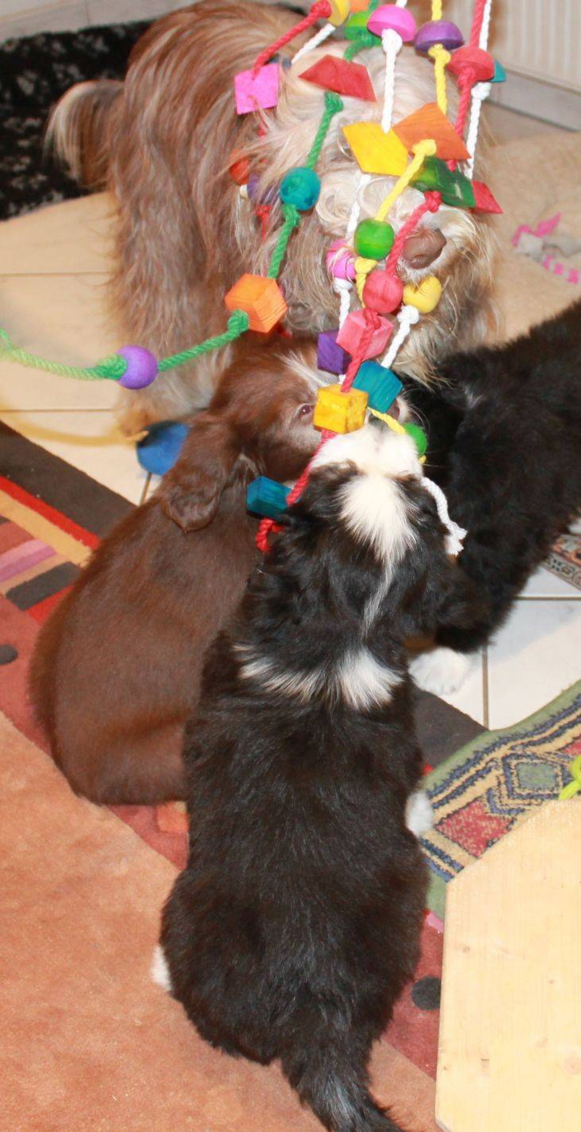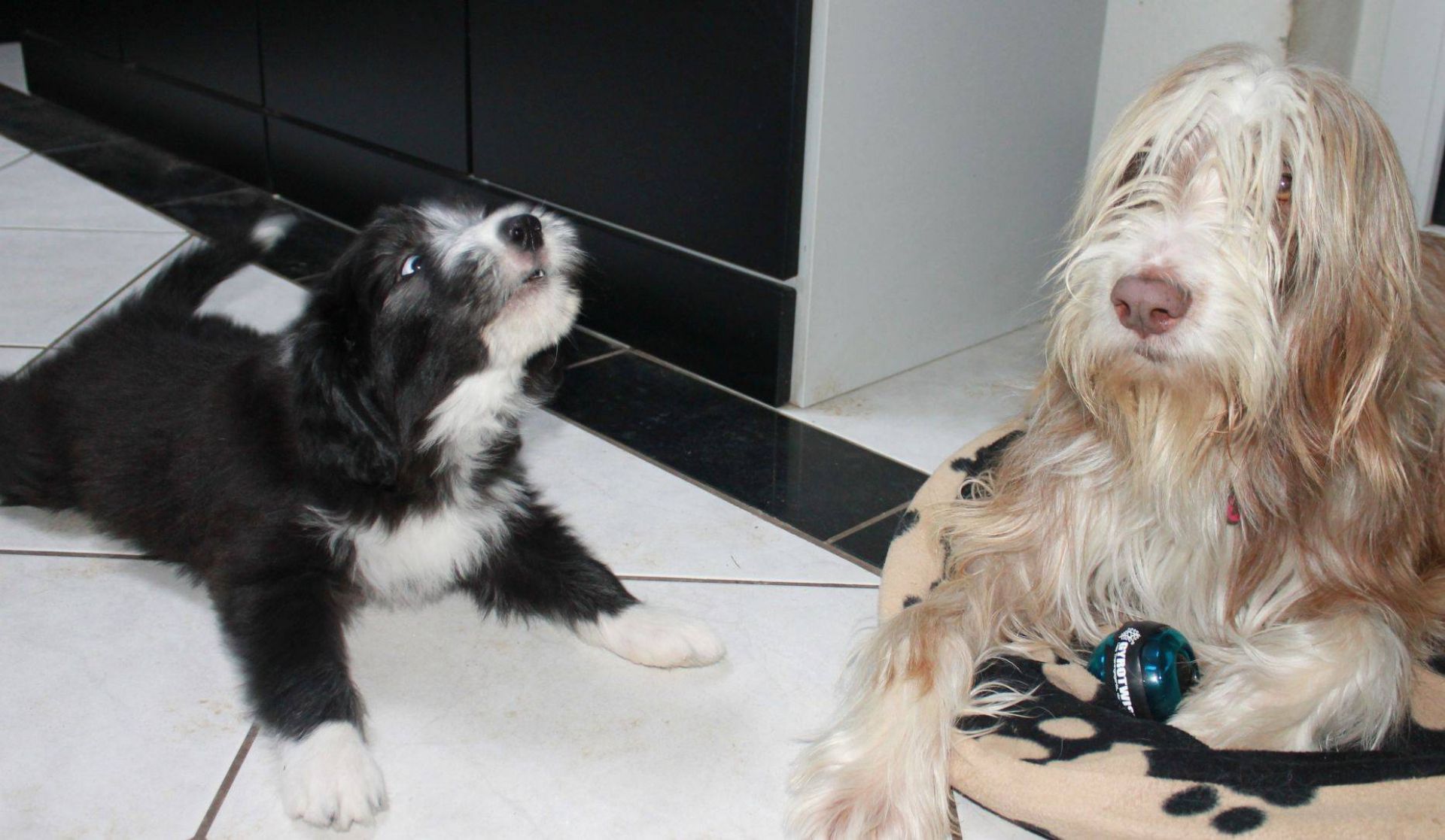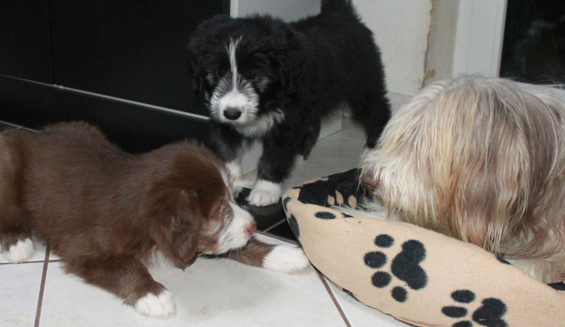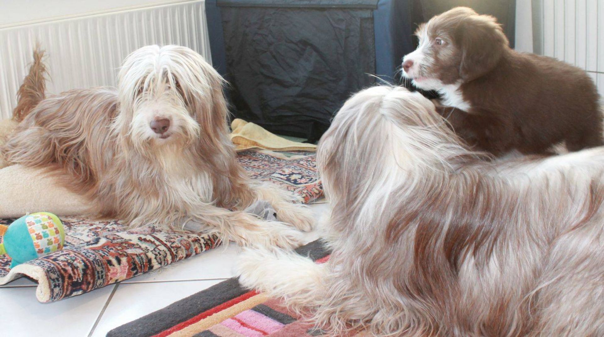 Der Tag der Premieren :-) Die Babies fanden, es wird endlich mal Zeit, dass es schneit. Die Nackenrolle hat sich da sehr gut dazu geeignet. Wenn man mal kräftig dran rumnagt, rieselen ganz viele, kleine, weissen Kügelchen raus. Der Auslauf war ein Winterwonderland :-) Also musste der Sauger her. Den kennen sie ja schon aber noch nie war er bei ihnen drin. Hat sie aber nicht weiter gestört. Zudem sind sie heute genau 8 Wochen alt was heisst, die Impfung stand an. Da sie ja jetzt zusammen über 15 Kilo wiegen, passen sie einfach nicht mehr in den Wäschekorb. Sie durften zum ersten Mal hinten in der Hundebox mitfahren. Die sassen da drin, wie wenn es das Normalste auf der Welt wäre. Auch während der Fahrt hat man keinen Ton von ihnen gehört. Da dies ja ein besonderer Wurf ist, wurden sie auch von einem besonderen Tierarzt geimpft :D Dr. Wieland Beck, bekannt aus "Menschen, Tiere und Doktoren" (das ist der, der in München mit dem Sanka durch die Gegend fährt) hatte Vertretung bei meiner Tierärztin. In der Tierarztpraxis angekommen, waren sie natürlich die Stars schlechthin. Von Berührungsängsten keine Spur. Die ganze Praxis musste erkundschaftet werden. Es sind einfach soooo coole Welpies. Das Impfen und das Chippen haben sie klaglos über sich ergehen lassen. Selbst der Tierarzt war ganz erstaunt. Es sind halt einfach brave Welpis :-)