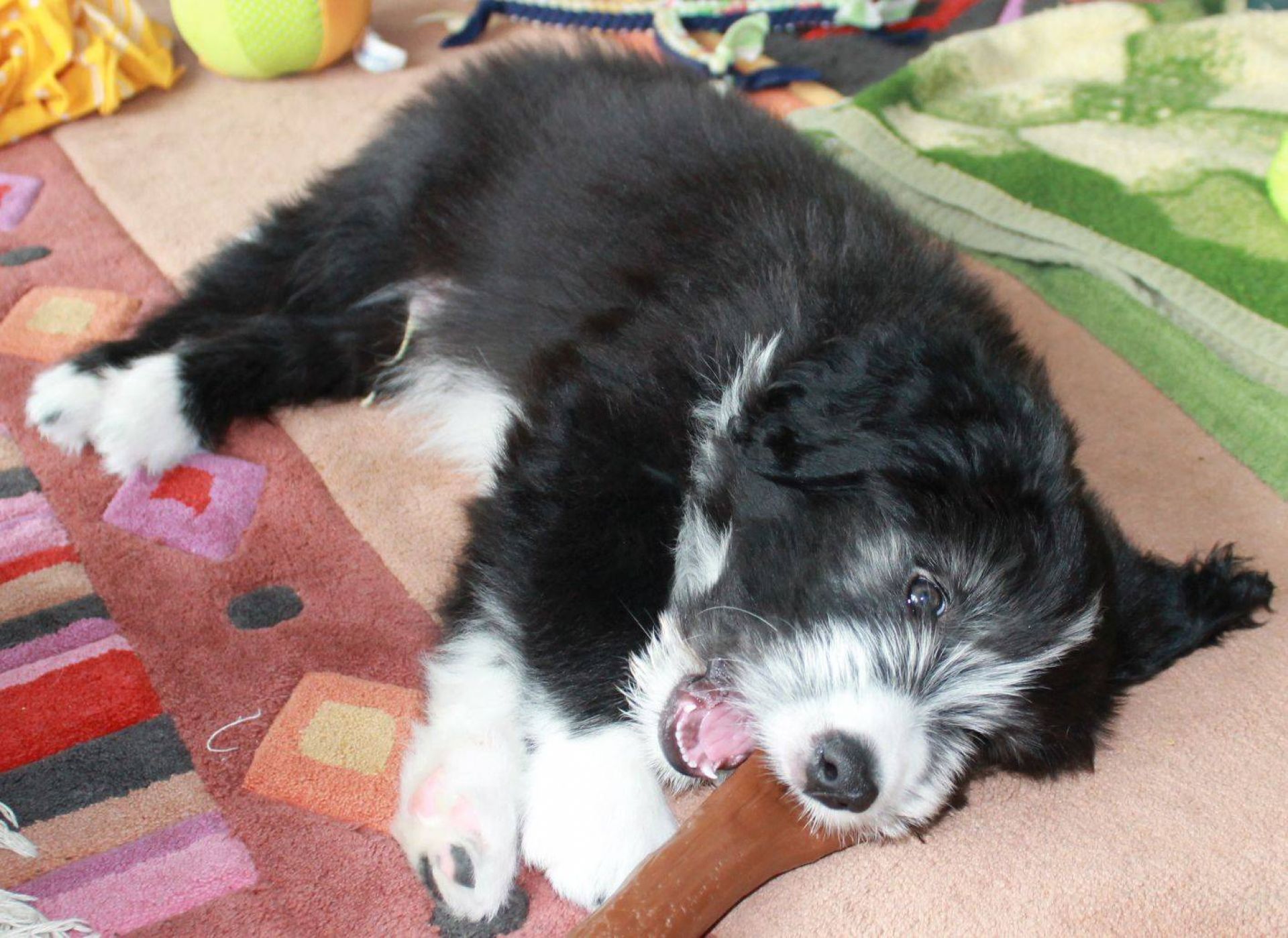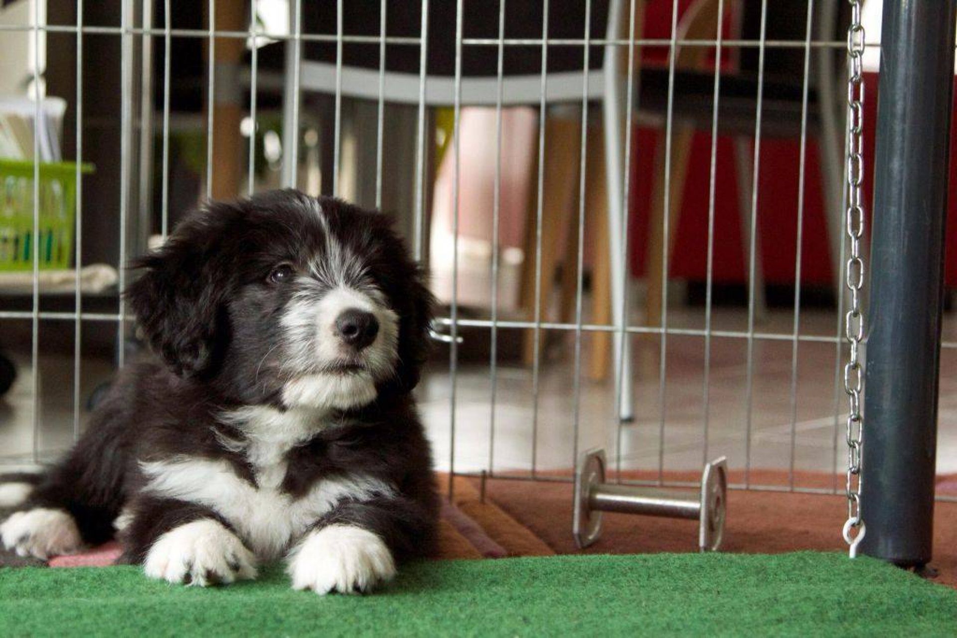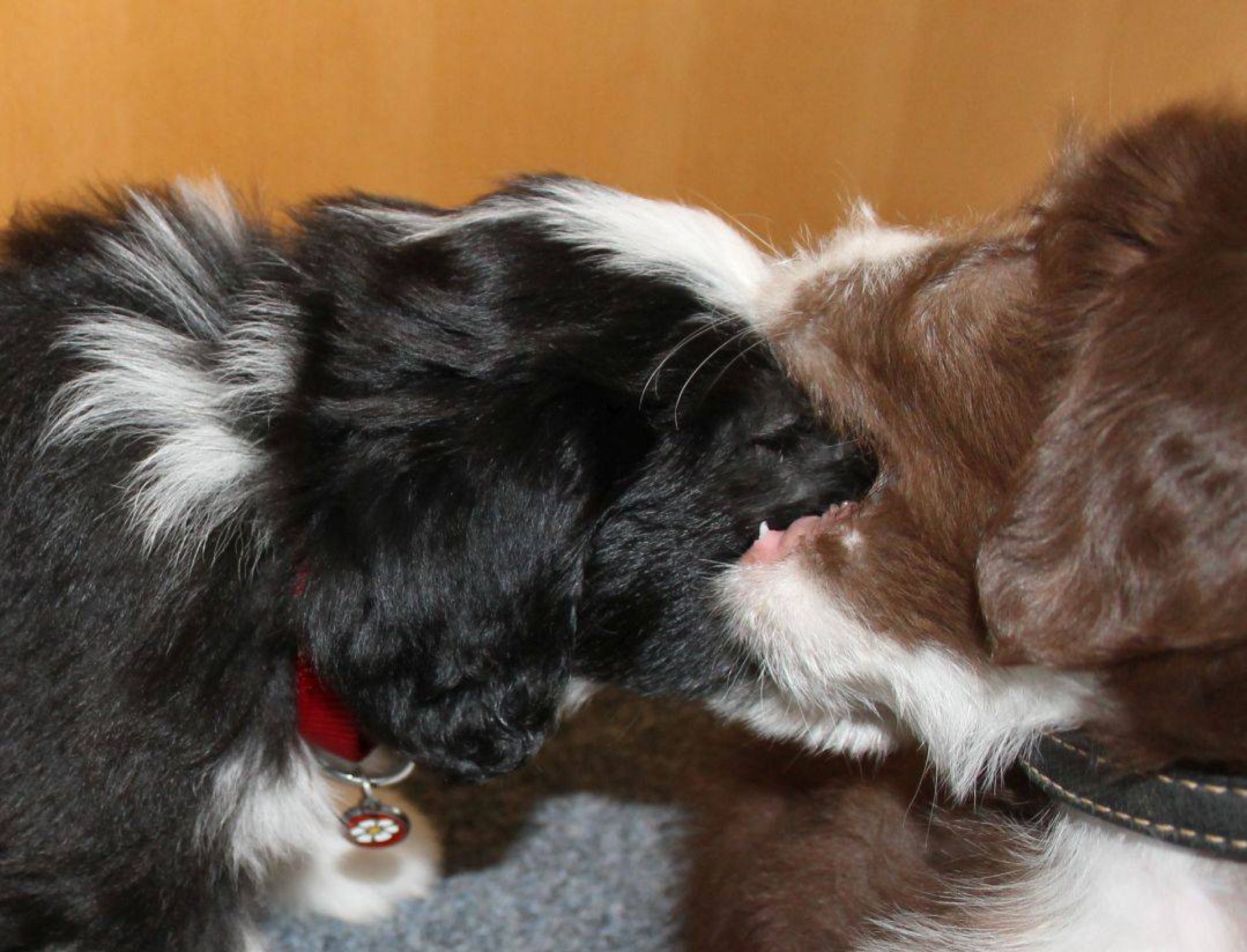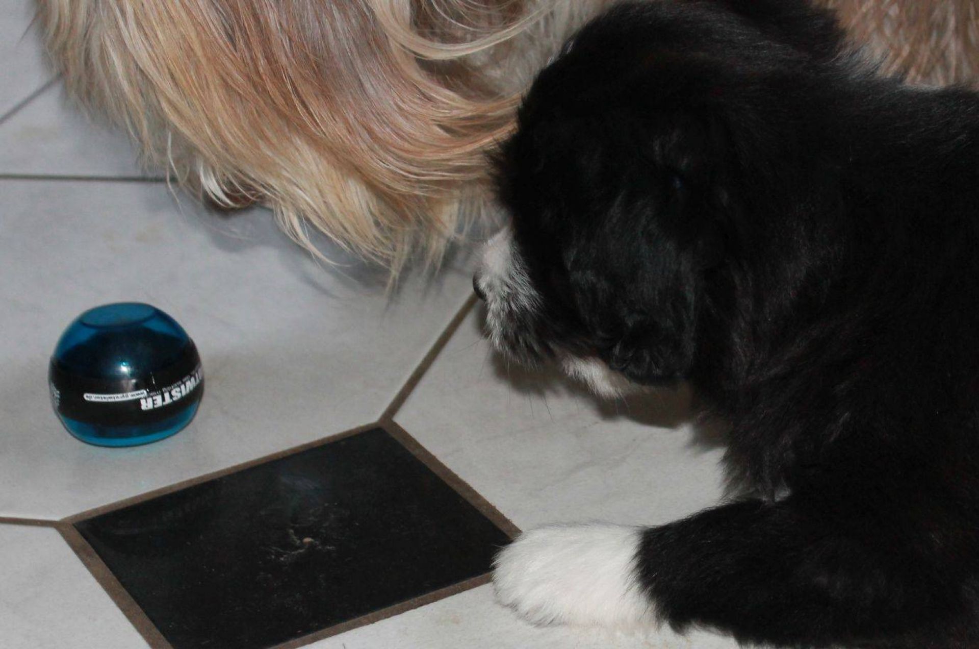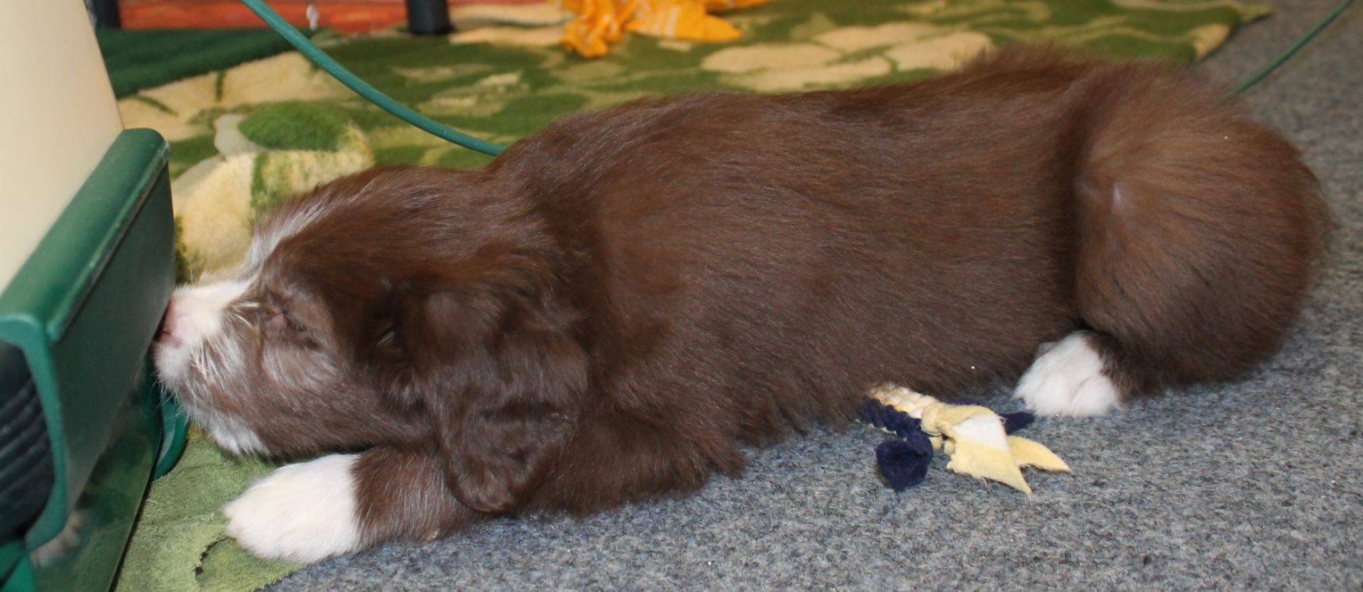 Der Tag der Premieren :-) Die Babies fanden, es wird endlich mal Zeit, dass es schneit. Die Nackenrolle hat sich da sehr gut dazu geeignet. Wenn man mal kräftig dran rumnagt, rieselen ganz viele, kleine, weissen Kügelchen raus. Der Auslauf war ein Winterwonderland :-) Also musste der Sauger her. Den kennen sie ja schon aber noch nie war er bei ihnen drin. Hat sie aber nicht weiter gestört. Zudem sind sie heute genau 8 Wochen alt was heisst, die Impfung stand an. Da sie ja jetzt zusammen über 15 Kilo wiegen, passen sie einfach nicht mehr in den Wäschekorb. Sie durften zum ersten Mal hinten in der Hundebox mitfahren. Die sassen da drin, wie wenn es das Normalste auf der Welt wäre. Auch während der Fahrt hat man keinen Ton von ihnen gehört. Da dies ja ein besonderer Wurf ist, wurden sie auch von einem besonderen Tierarzt geimpft :D Dr. Wieland Beck, bekannt aus "Menschen, Tiere und Doktoren" (das ist der, der in München mit dem Sanka durch die Gegend fährt) hatte Vertretung bei meiner Tierärztin. In der Tierarztpraxis angekommen, waren sie natürlich die Stars schlechthin. Von Berührungsängsten keine Spur. Die ganze Praxis musste erkundschaftet werden. Es sind einfach soooo coole Welpies. Das Impfen und das Chippen haben sie klaglos über sich ergehen lassen. Selbst der Tierarzt war ganz erstaunt. Es sind halt einfach brave Welpis :-)