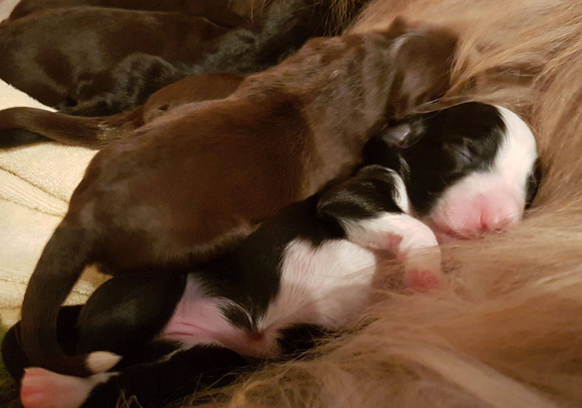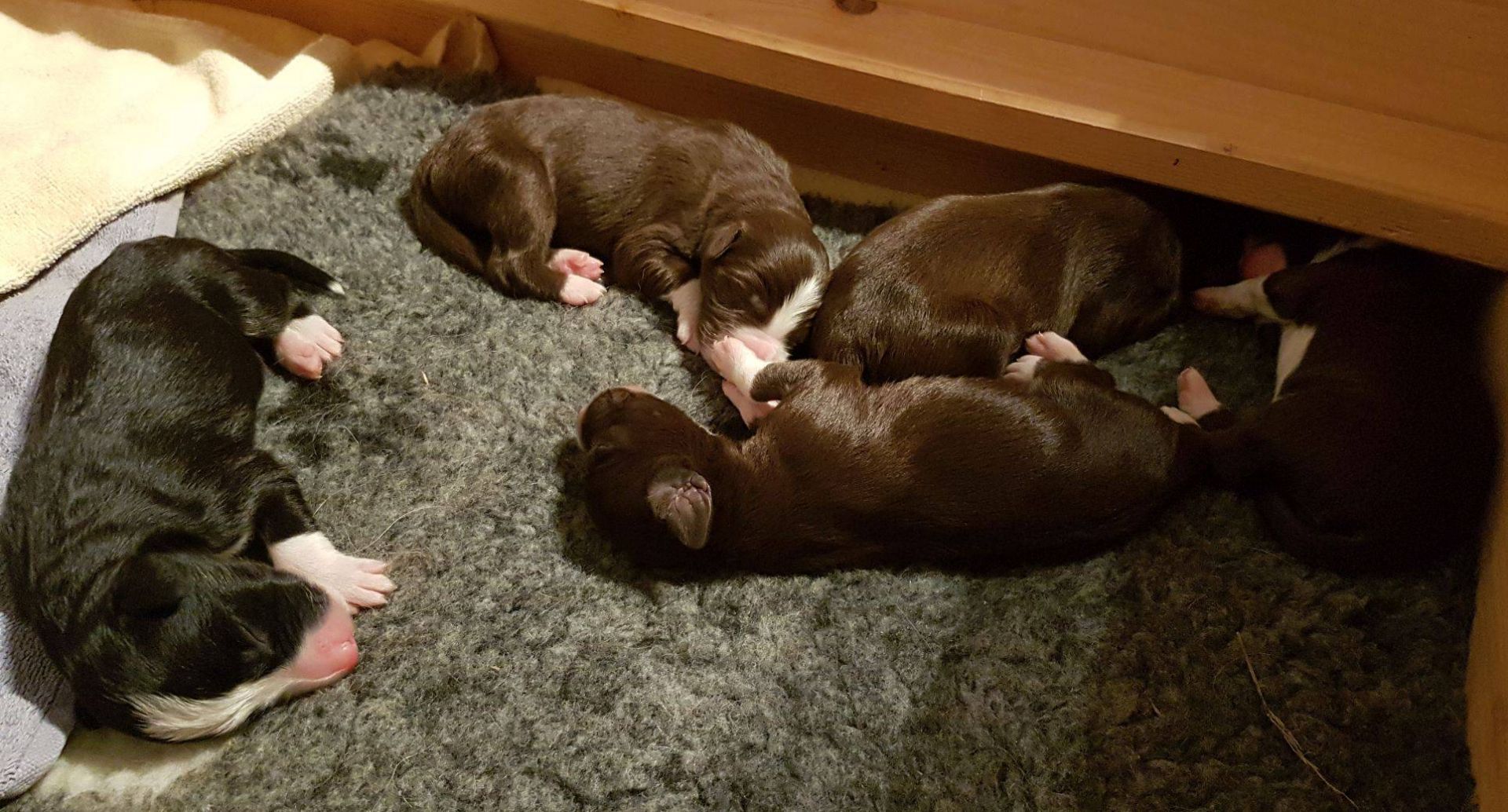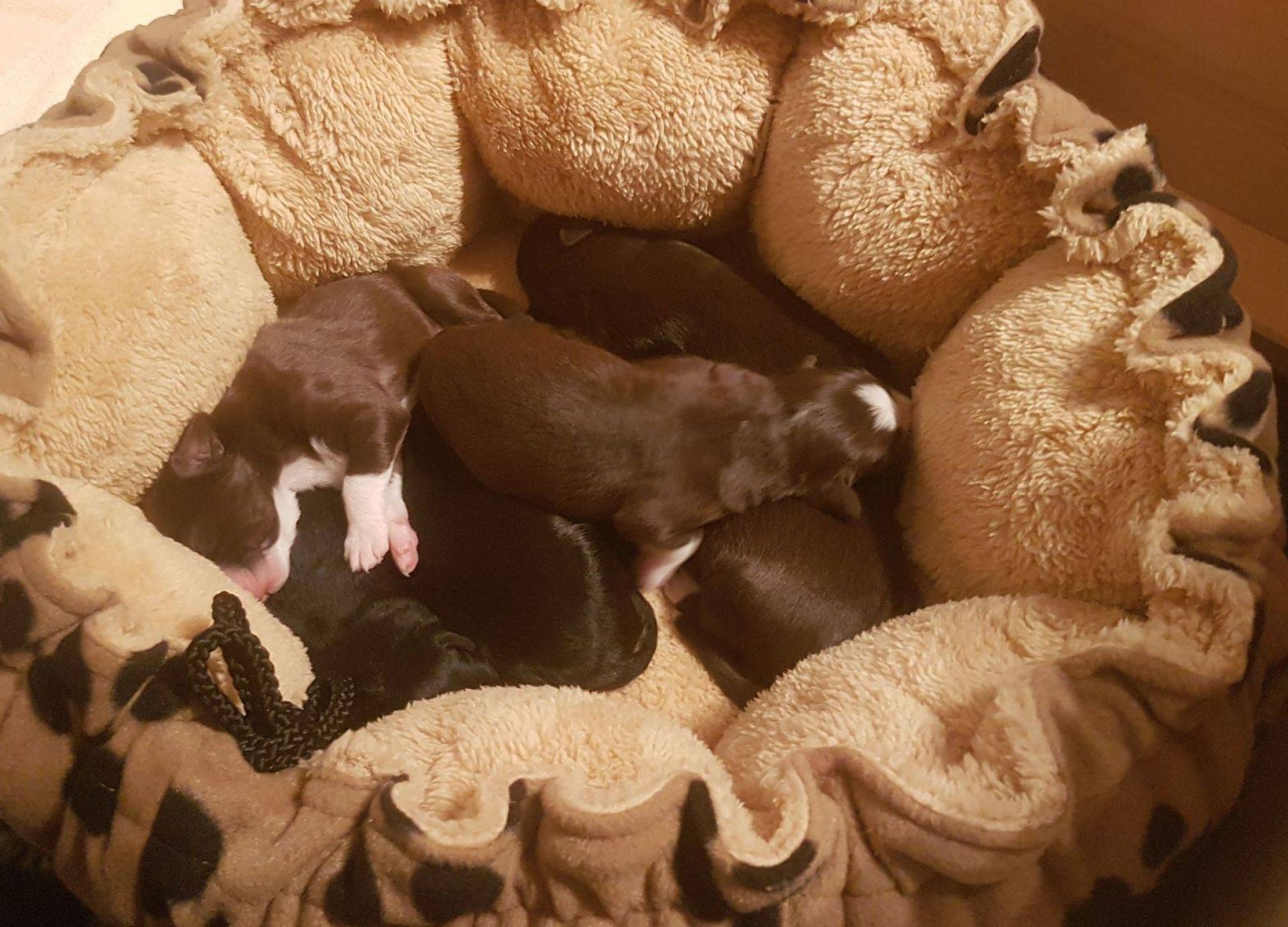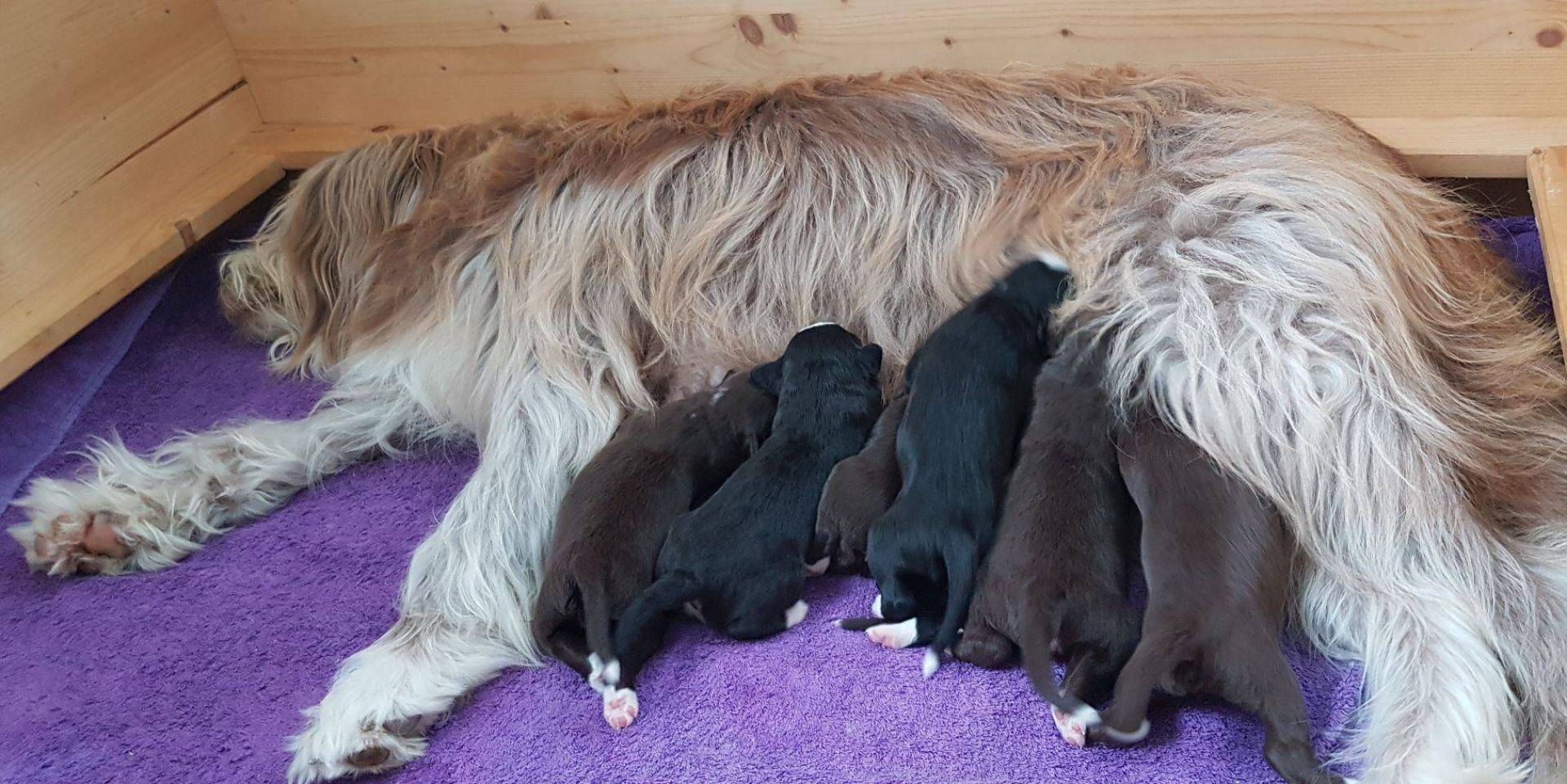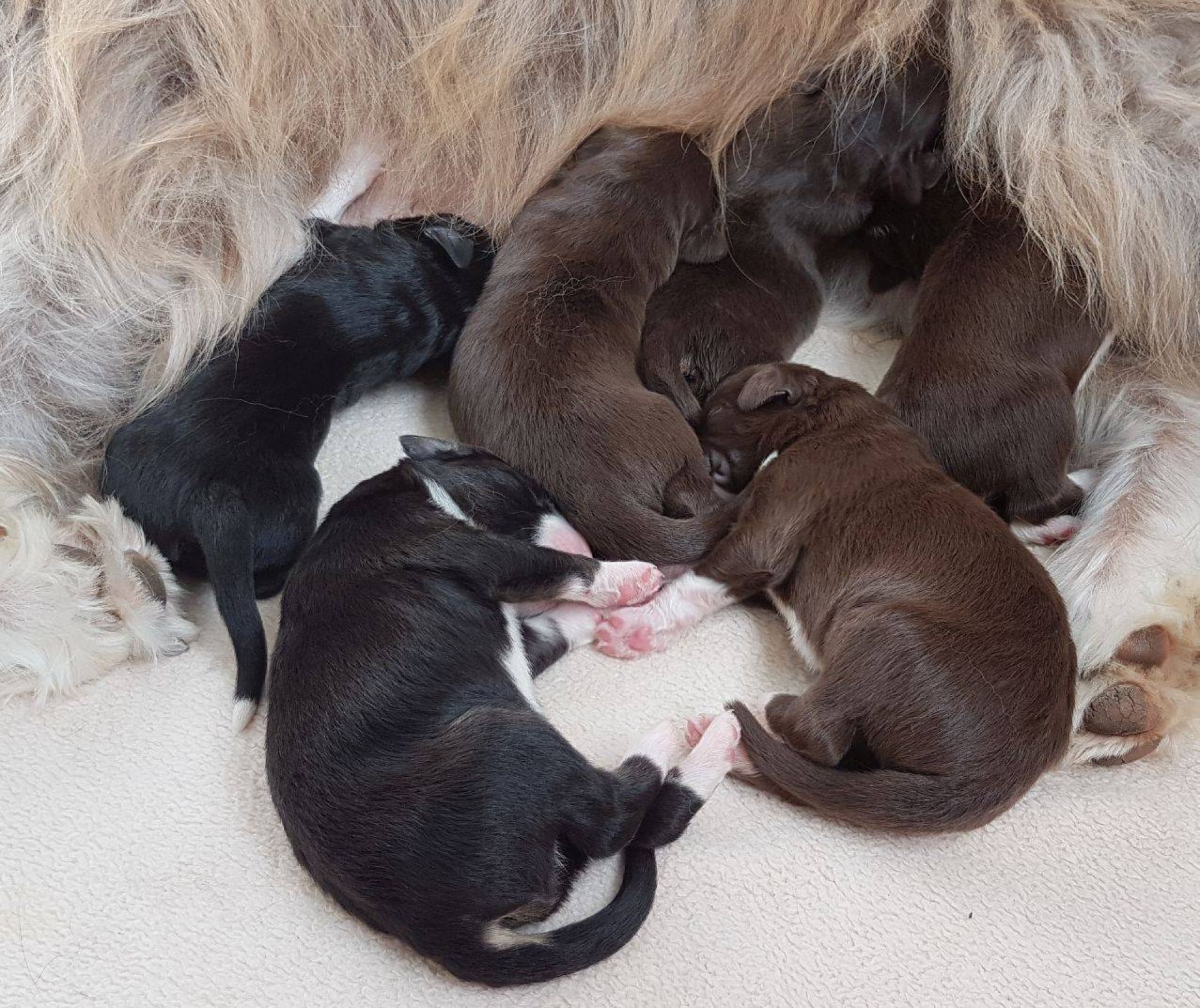 Die Aine ist so eine supercoole Mama, ich kann das kaum in Worte fassen. Die ersten drei Tage hat sie die Wurfbox gar nicht verlassen. Die Welpis waren rund um die Uhr am Trinken, was man an ihren tollen Gewichten sieht. Gestern Nacht lag sie dann plötzlich in meinem Bett, natürlich immer mit einem Auge auf die Box aber sie hat die Welpen jetzt schon alleine gelassen. Wenn sie dann der Meinung war, jetzt müssen die Babies mal wieder was trinken, ist sie rein, hat gefiept und die Welpis kamen quasi auf Pfiff alle angerobbt. Ich könnte da jedesmal dahinschmelzen. Sie legt jetzt schon fest, wann getrunken wird und wann nicht. Die Abstände werden größer. Sie macht das einfach so souverän und sicher, es ist unglaublich.