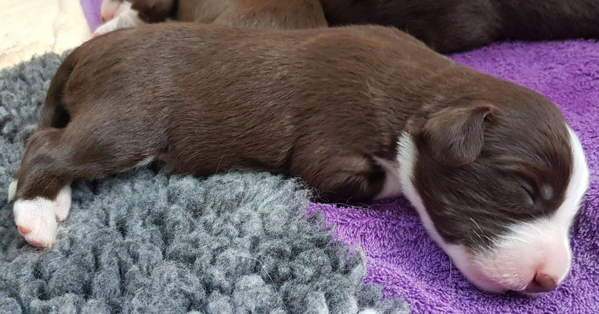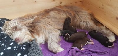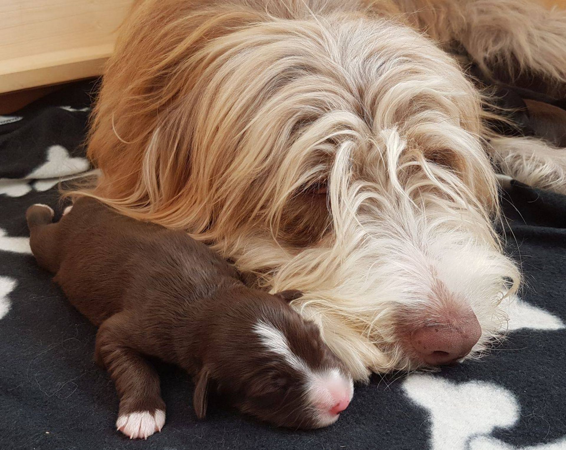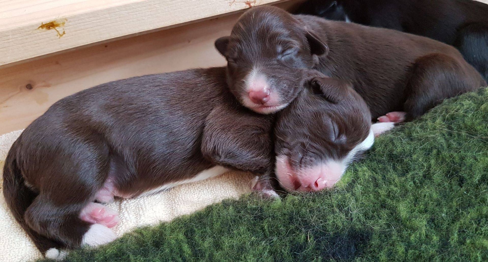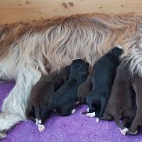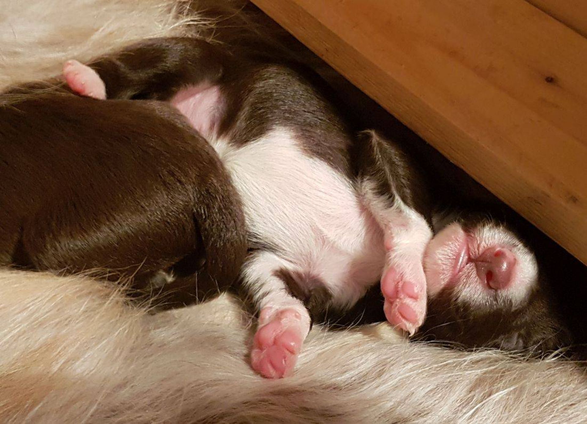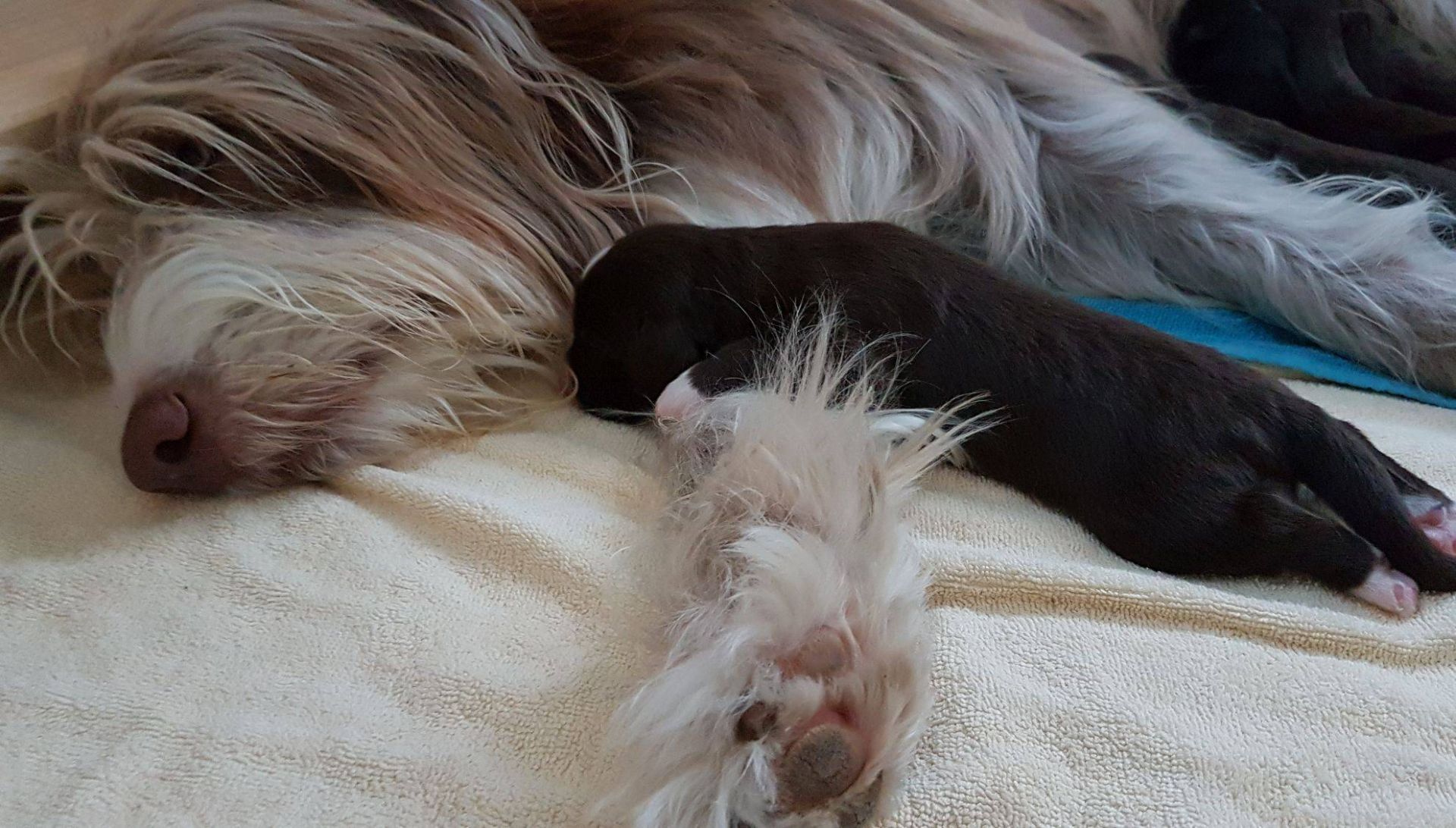 Die Aine ist so eine supercoole Mama, ich kann das kaum in Worte fassen. Die ersten drei Tage hat sie die Wurfbox gar nicht verlassen. Die Welpis waren rund um die Uhr am Trinken, was man an ihren tollen Gewichten sieht. Gestern Nacht lag sie dann plötzlich in meinem Bett, natürlich immer mit einem Auge auf die Box aber sie hat die Welpen jetzt schon alleine gelassen. Wenn sie dann der Meinung war, jetzt müssen die Babies mal wieder was trinken, ist sie rein, hat gefiept und die Welpis kamen quasi auf Pfiff alle angerobbt. Ich könnte da jedesmal dahinschmelzen. Sie legt jetzt schon fest, wann getrunken wird und wann nicht. Die Abstände werden größer. Sie macht das einfach so souverän und sicher, es ist unglaublich.