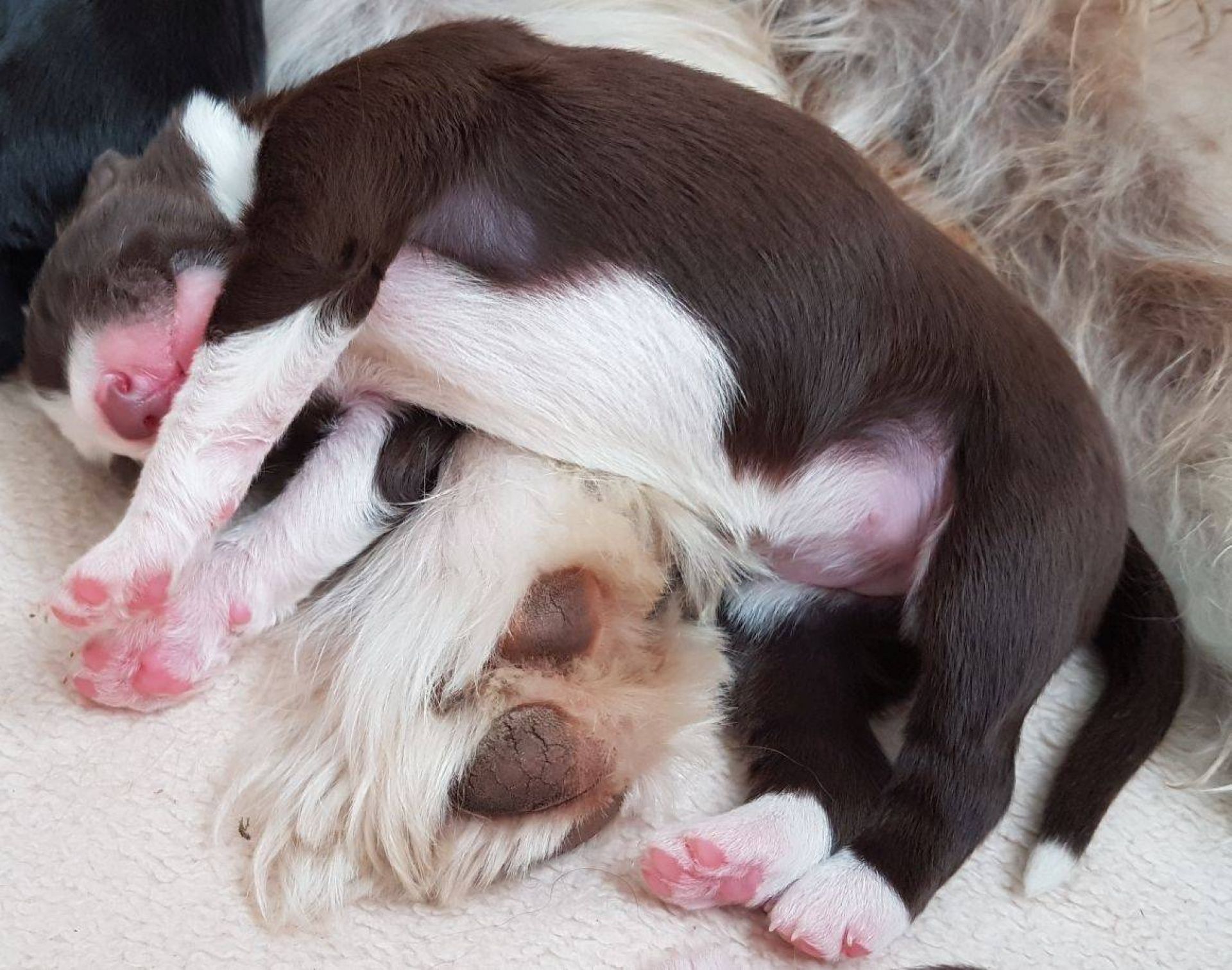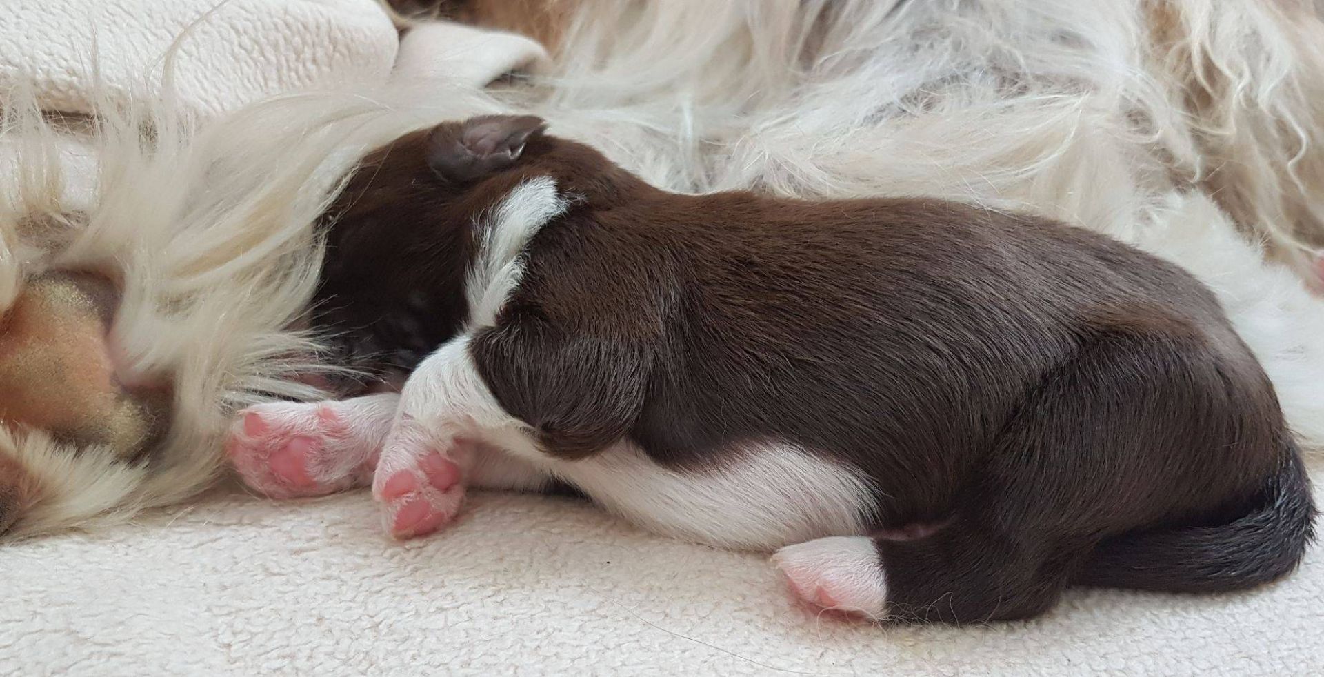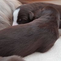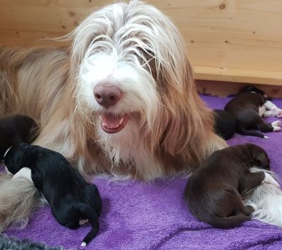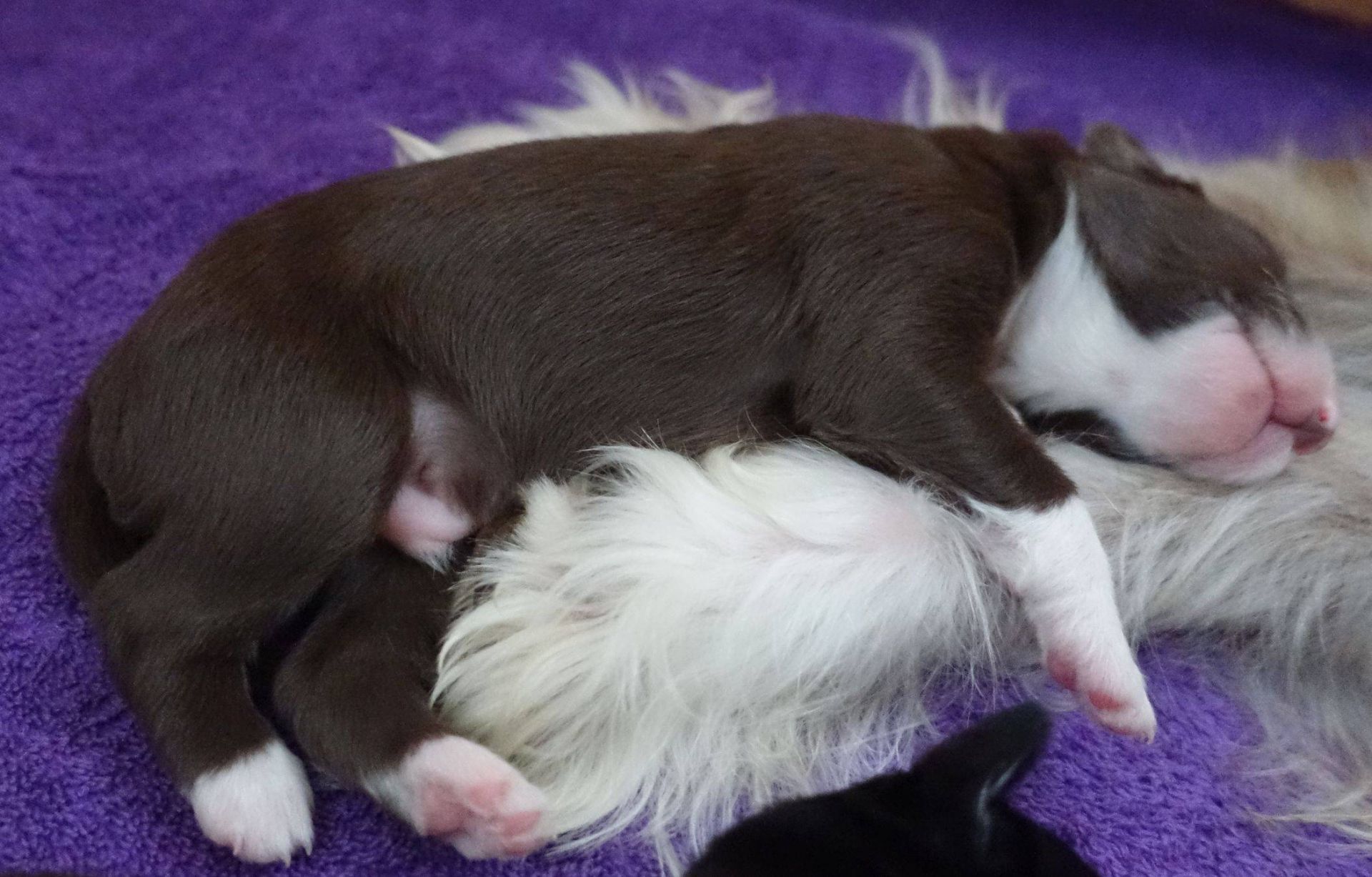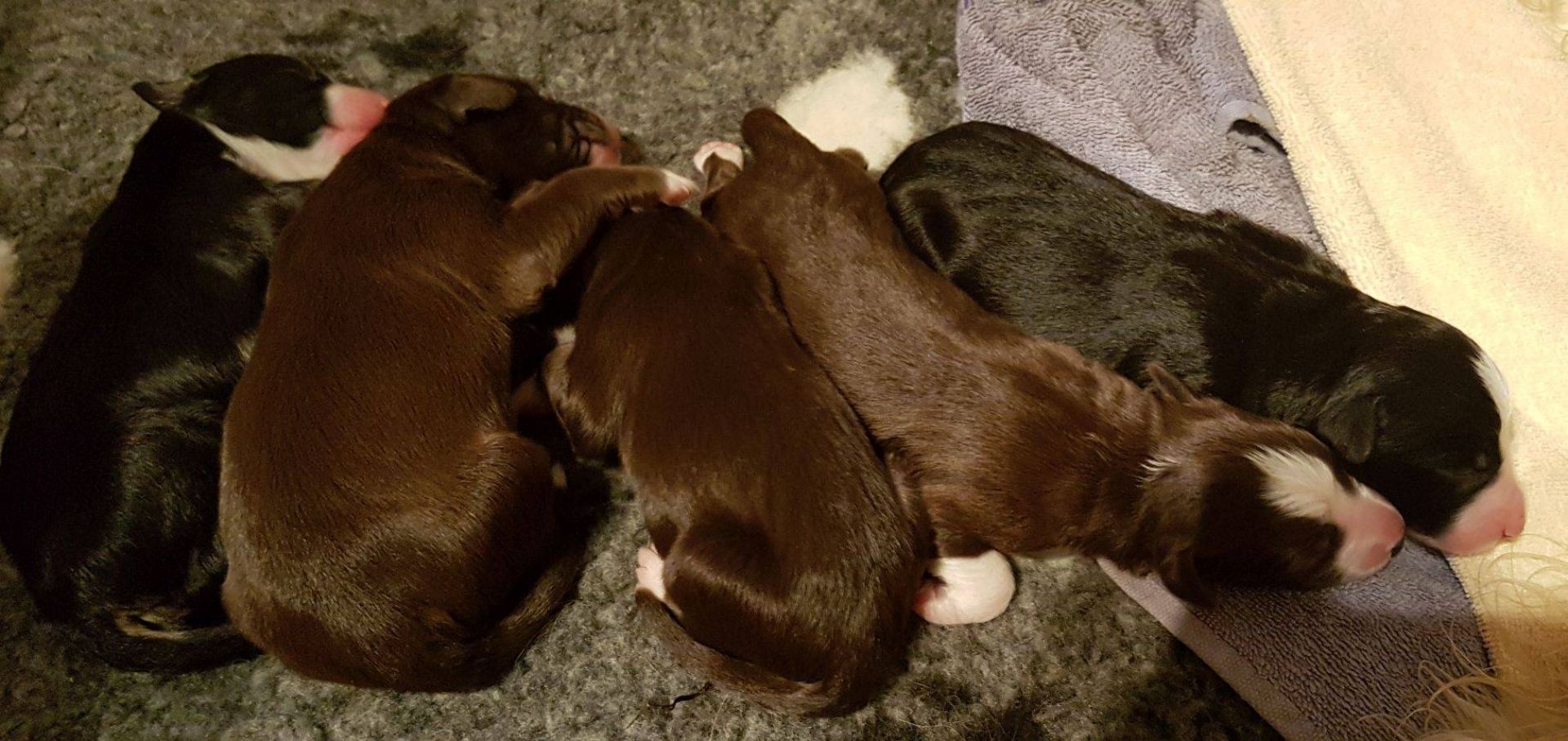 Die Aine ist so eine supercoole Mama, ich kann das kaum in Worte fassen. Die ersten drei Tage hat sie die Wurfbox gar nicht verlassen. Die Welpis waren rund um die Uhr am Trinken, was man an ihren tollen Gewichten sieht. Gestern Nacht lag sie dann plötzlich in meinem Bett, natürlich immer mit einem Auge auf die Box aber sie hat die Welpen jetzt schon alleine gelassen. Wenn sie dann der Meinung war, jetzt müssen die Babies mal wieder was trinken, ist sie rein, hat gefiept und die Welpis kamen quasi auf Pfiff alle angerobbt. Ich könnte da jedesmal dahinschmelzen. Sie legt jetzt schon fest, wann getrunken wird und wann nicht. Die Abstände werden größer. Sie macht das einfach so souverän und sicher, es ist unglaublich.