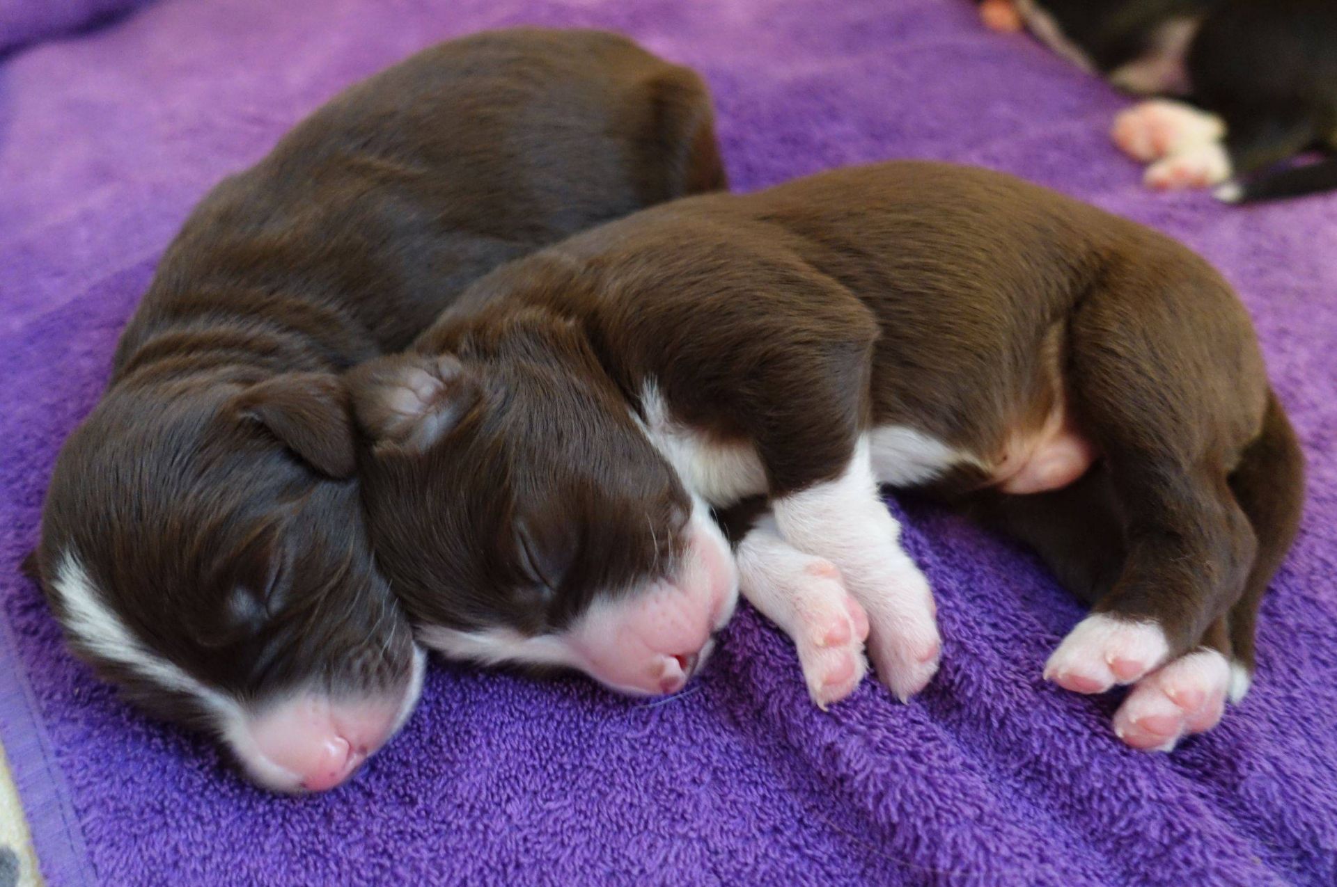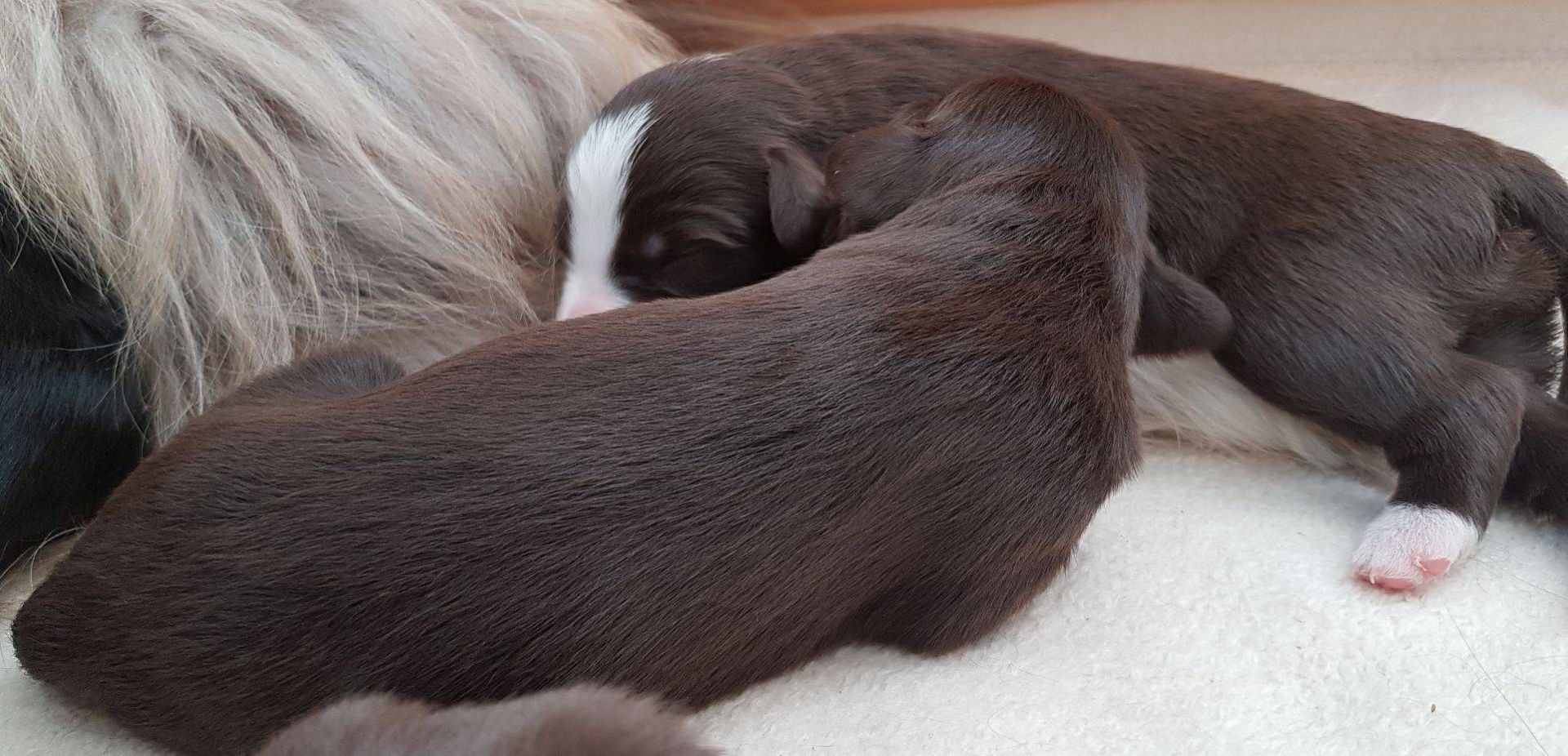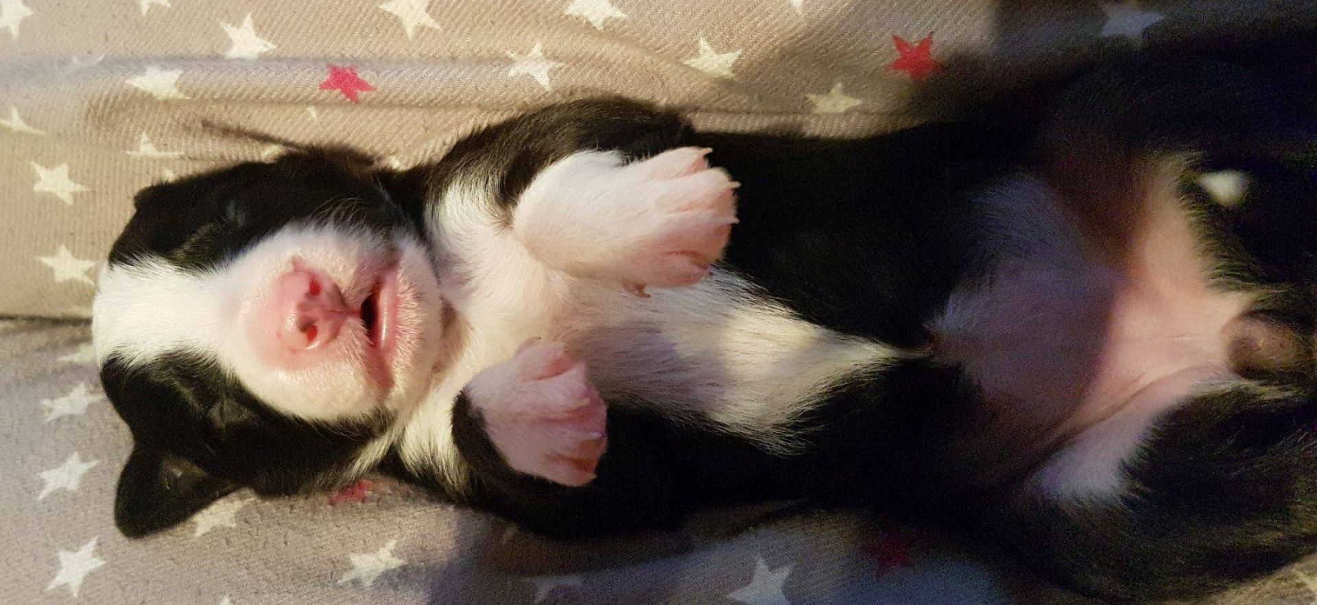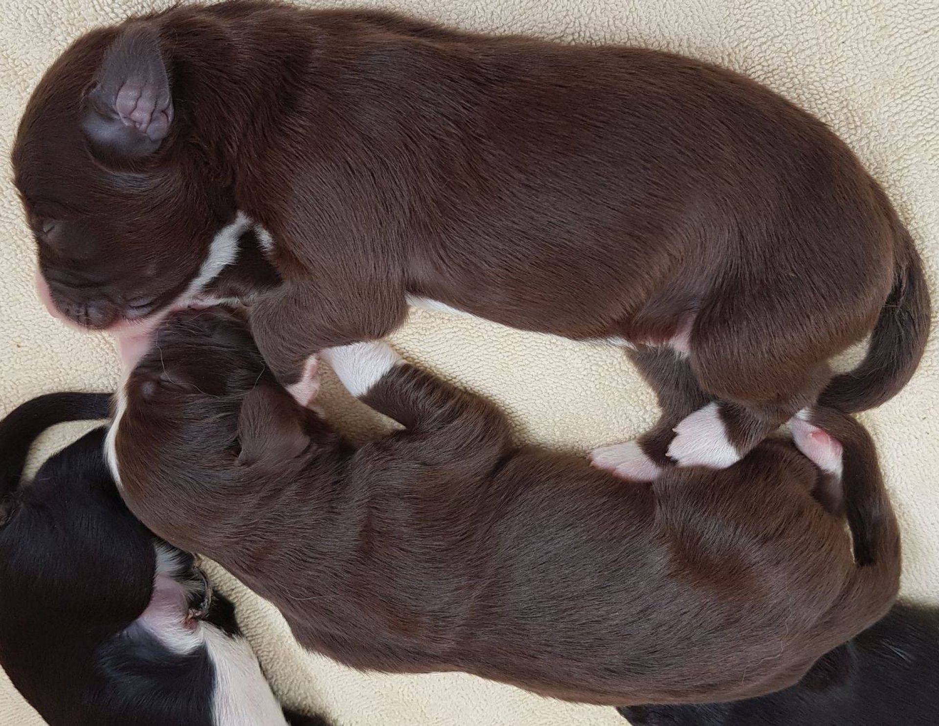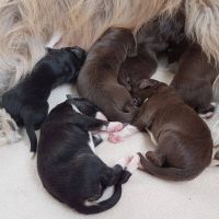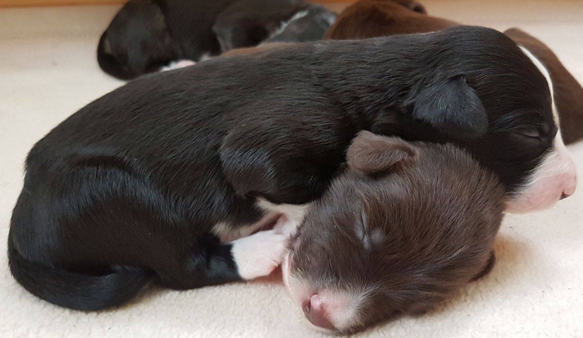 Die Aine ist so eine supercoole Mama, ich kann das kaum in Worte fassen. Die ersten drei Tage hat sie die Wurfbox gar nicht verlassen. Die Welpis waren rund um die Uhr am Trinken, was man an ihren tollen Gewichten sieht. Gestern Nacht lag sie dann plötzlich in meinem Bett, natürlich immer mit einem Auge auf die Box aber sie hat die Welpen jetzt schon alleine gelassen. Wenn sie dann der Meinung war, jetzt müssen die Babies mal wieder was trinken, ist sie rein, hat gefiept und die Welpis kamen quasi auf Pfiff alle angerobbt. Ich könnte da jedesmal dahinschmelzen. Sie legt jetzt schon fest, wann getrunken wird und wann nicht. Die Abstände werden größer. Sie macht das einfach so souverän und sicher, es ist unglaublich.