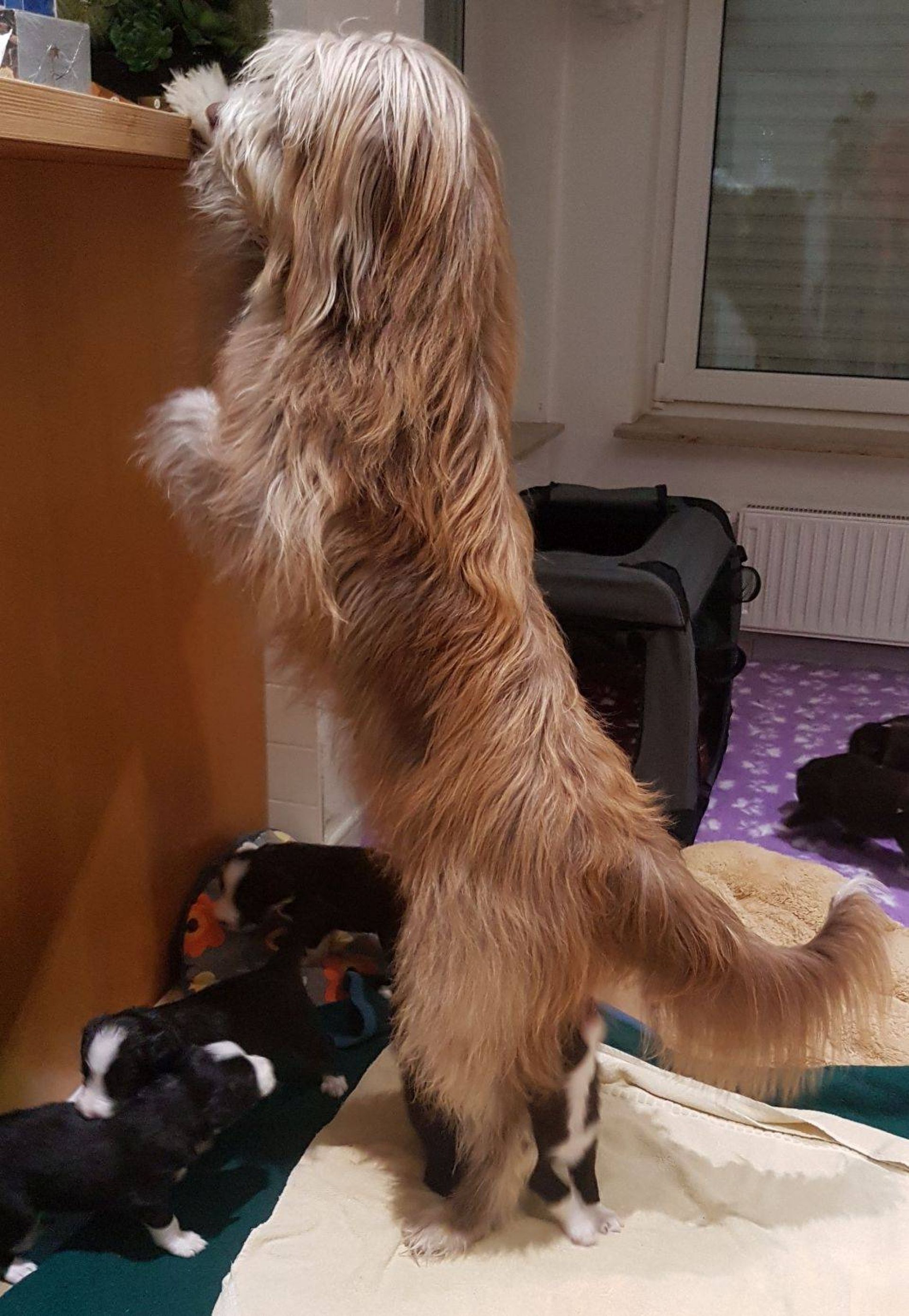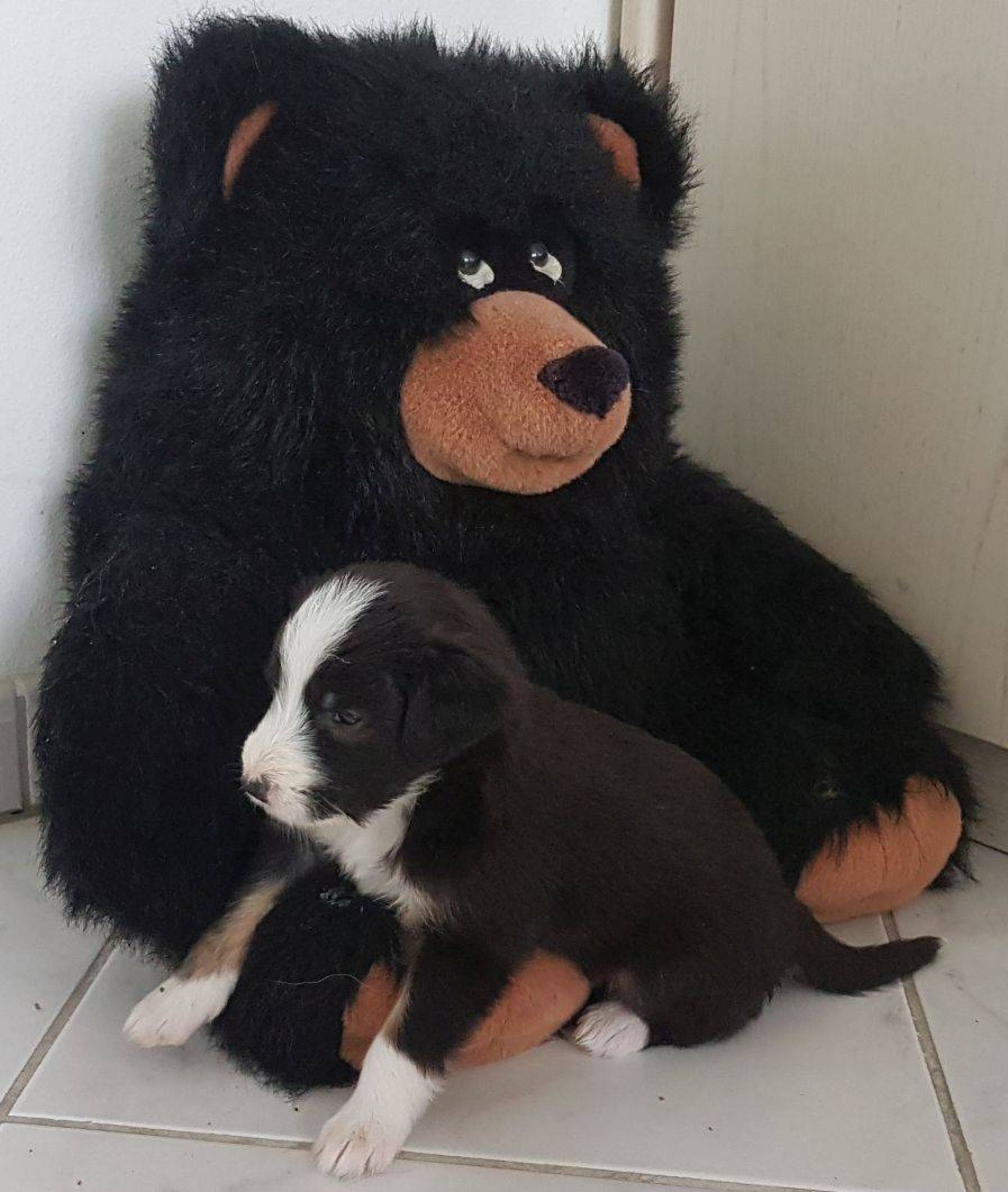 Seit die Mama fast nur noch in der Box liegt, müssen sich die Babies wohl oder übel zu ihr hinbewegen und die sichere Lieblingsecke verlassen :-) Sie sind aber ganz tapfer und mutig und verteilen sich in allen Ecken. Am liebesten aber rund um den Bär.