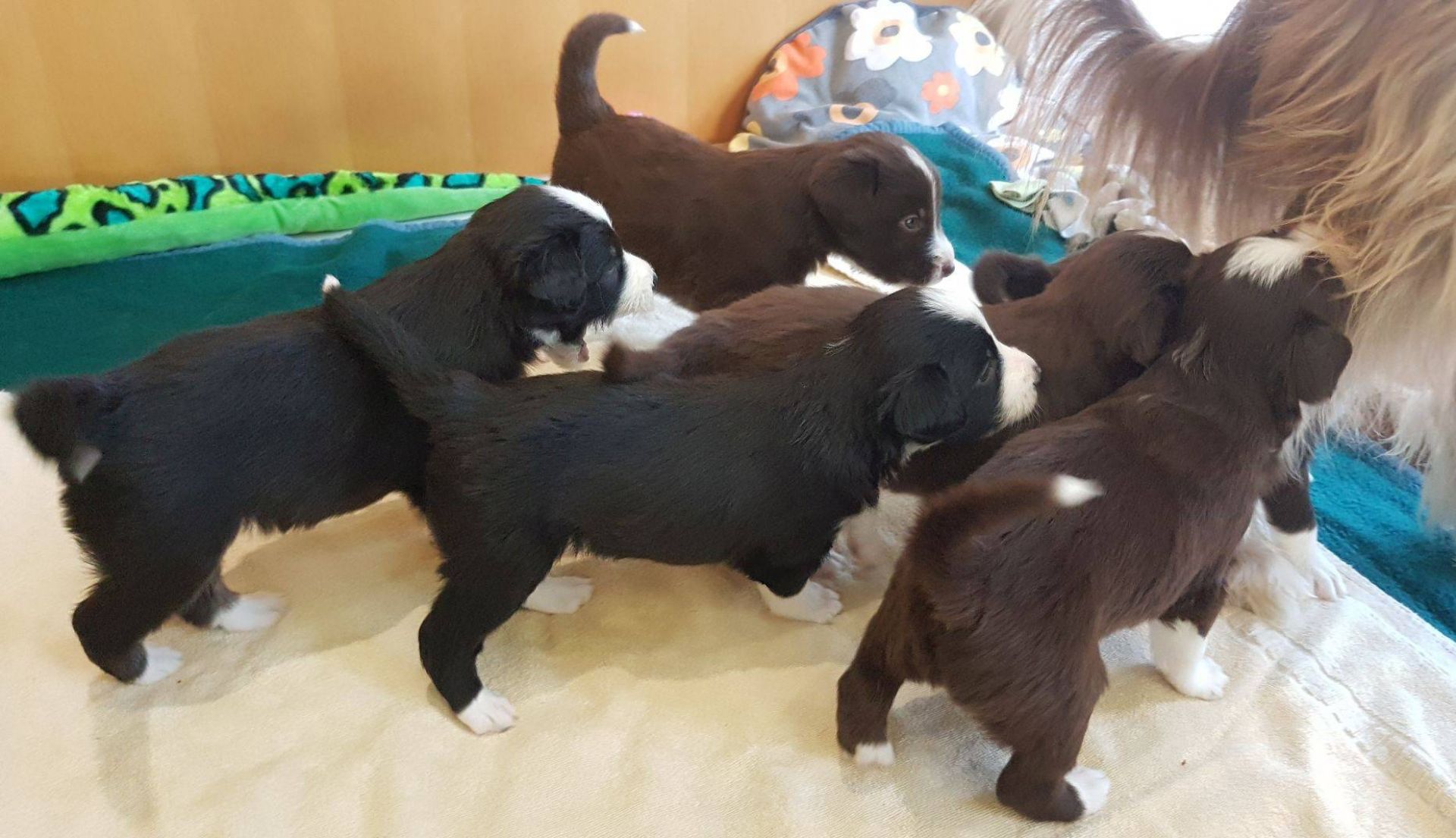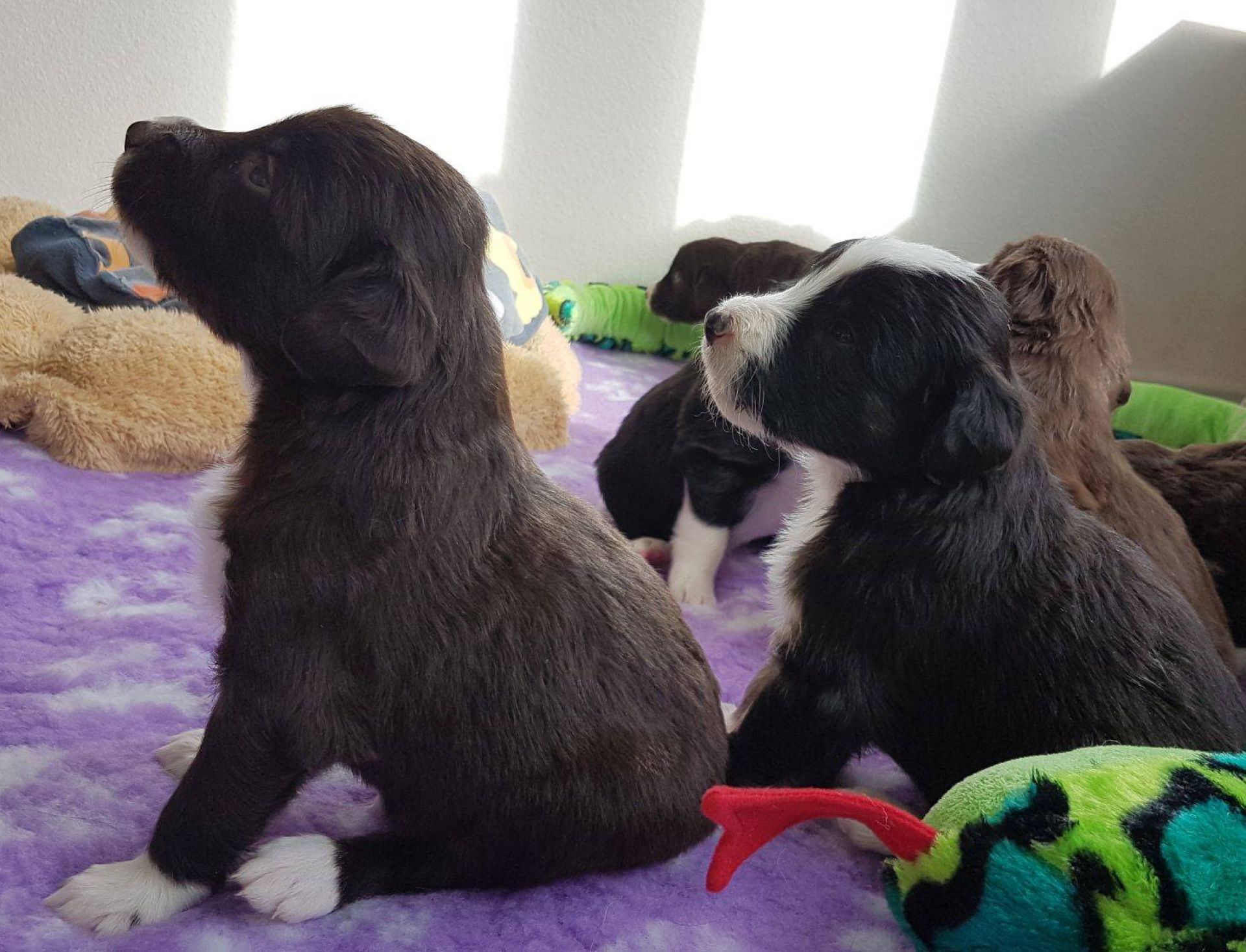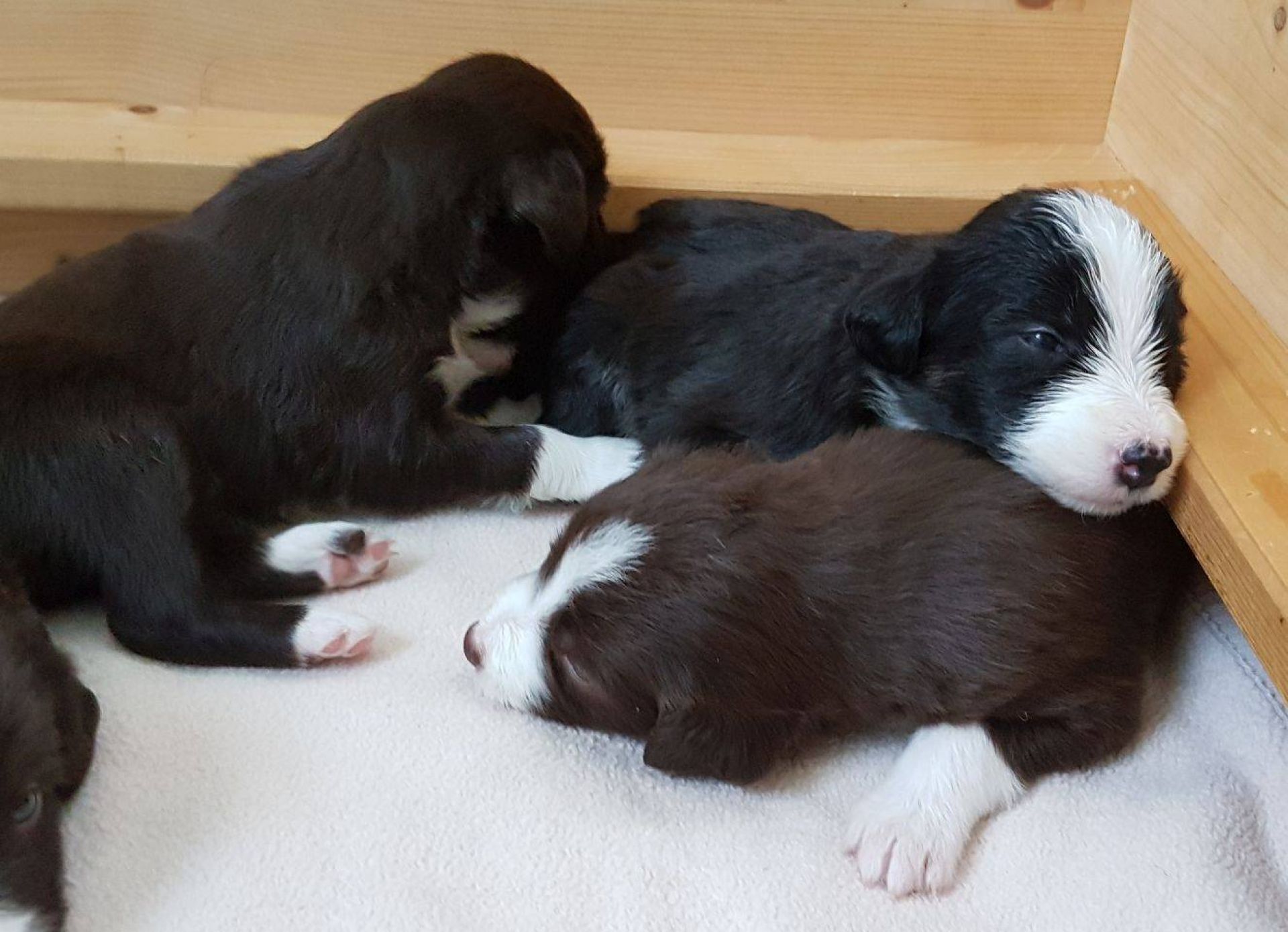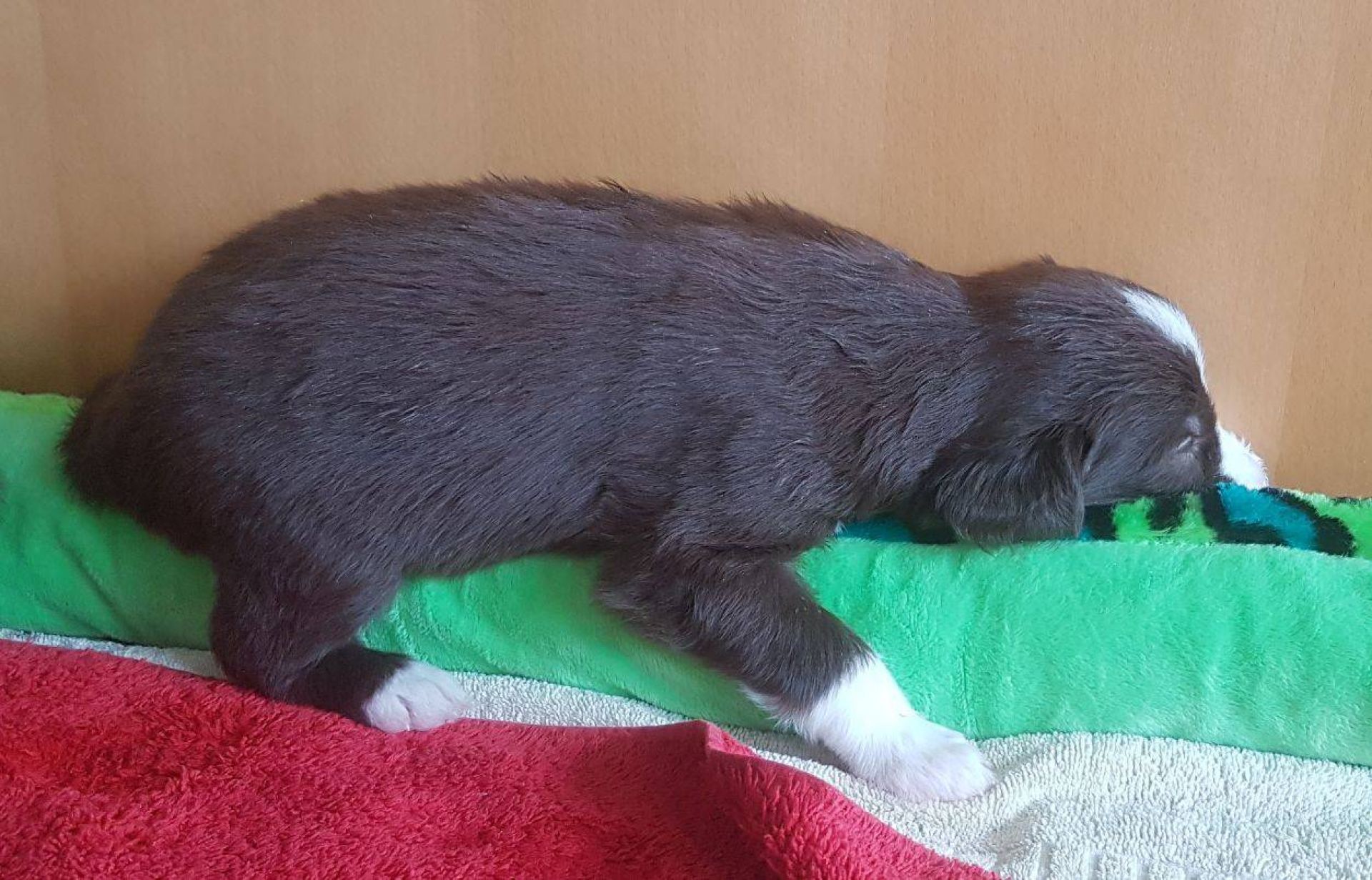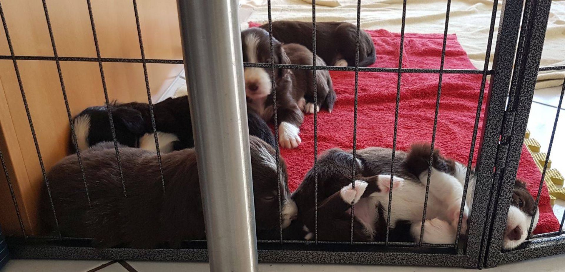 Heute ging es zum ersten Mal in den Auslauf im Esszimmer, den wir zunächst vorsorglich halbiert haben, da er im Vergleich zur Wurfbox riesig ist. Das Geschrei war auch anfänglich sehr groß. Die Nachbarn haben bestimmt gedacht, jetzt haben die auch noch einen Vogel bzw. eher eine Vogelschar. Sie haben in den höchsten Tönen gezwitschert. Auch Aine war kurz überfordert, weil sie am liebsten alle Babies um sich gehabt hätte, die aber alle in eine andere Richtung losgewandert sind. Alle waren dann sehr glücklich als sie sich wieder gefunden haben. Jetzt schlafen sie ganz friedlich. Witzigerweise komplett am anderen Ende als der A-Wurf :-)