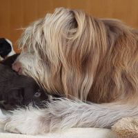 Aine ist der Meinung - Zeit für Erziehung. Es war zu witzig, da schnappt sie sich ein Spieli und legt sich auf ihre Decke. Und wartet... und wartet, bis endlich mal ein Baby vorbeigekommen ist, damit man das auch demonstrieren kann :-) Sie macht das wie alles, sehr sicher, angemessen und fair. Die Babies haben es kapiert. Zur Belohung hat sie dann am Schluss auch mit ihnen gespielt. Ich liebe sie einfach.