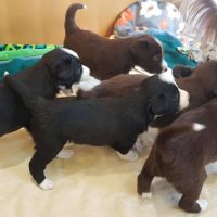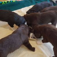 Die erste Fleischmahlzeit. Eigentlich wollte ich ja eine Handfütterund machen, um die Welpis mal langsam an die feste Nahrung ranzuführen. Ich kann sagen - sie können Finger und Fleisch unterscheiden. Die blöden Finger waren nämlich im Weg. Der Napf musste her. Unglaublich! 250 Gramm in Nullkommanix verputzt und ich glaube, zu mehr hätten sie auch nicht nein gesagt. Der Nachtisch bei Mama war dann aber auch ok.