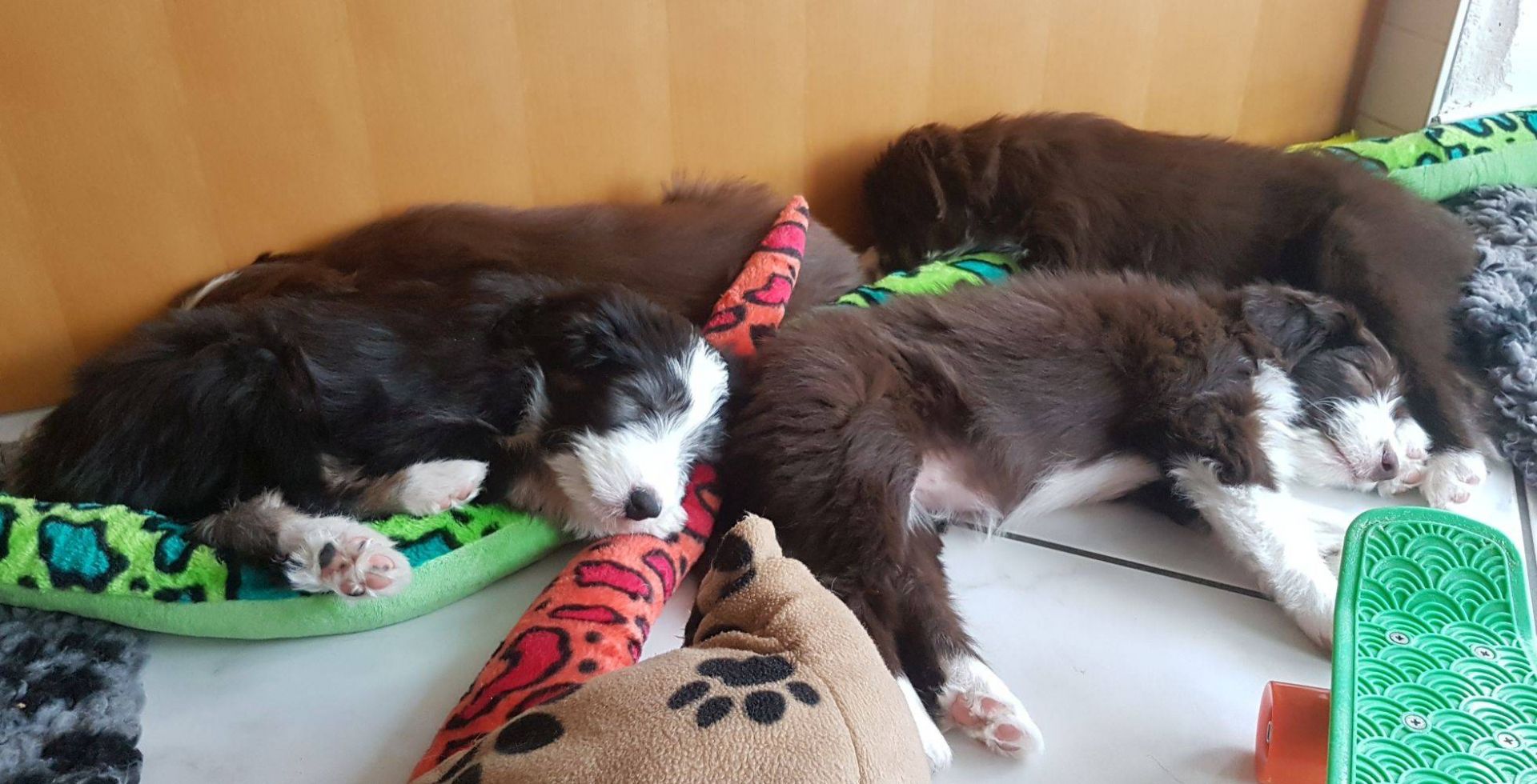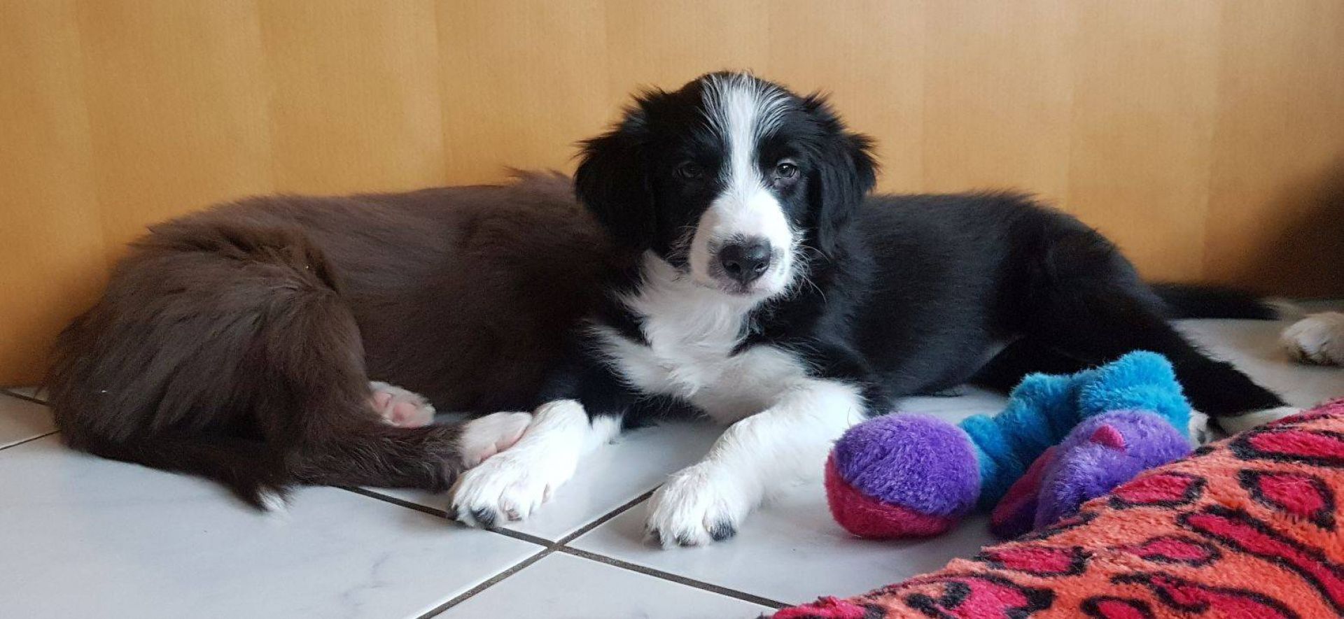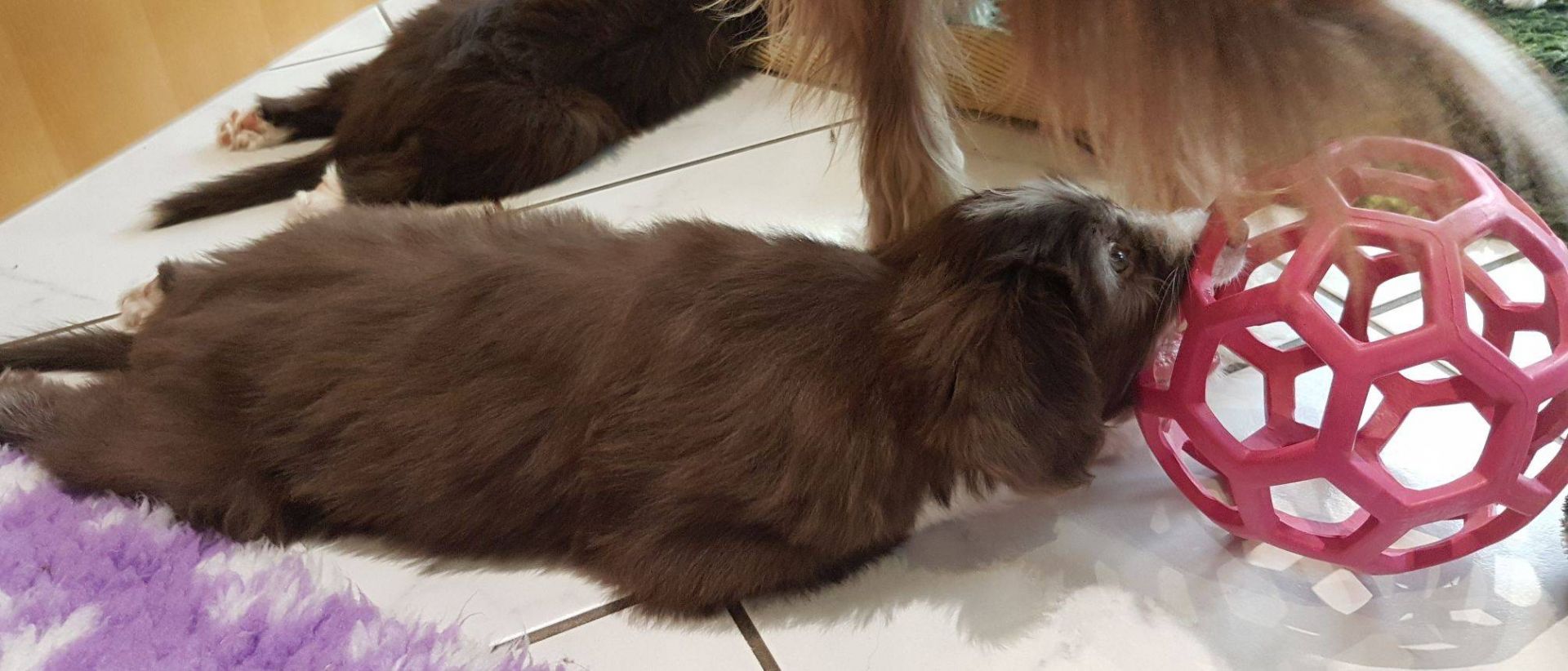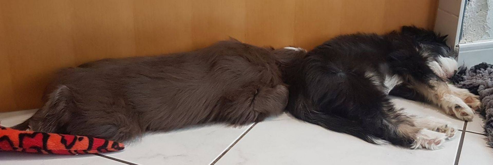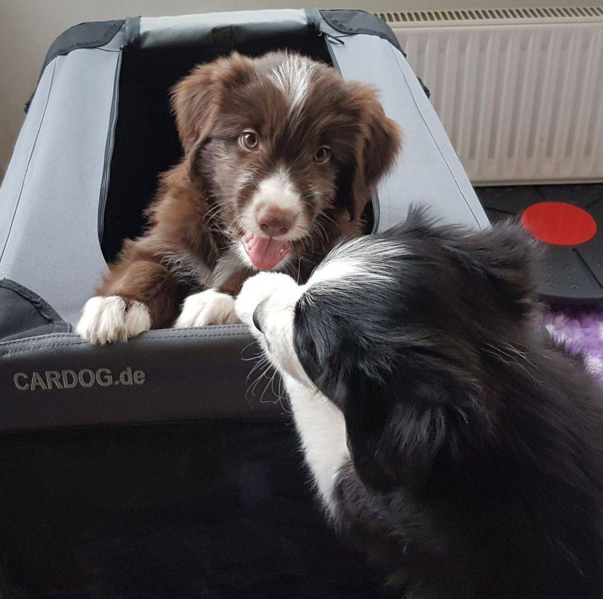 Heute habe ich leider nur ein Foto. Die Babies gingen auf ihre erste große Fahrt - zum Tierarzt. Super haben sie das gemeistert. Saßen ganz entspannt mit Aine in der Box und keiner hat gejammert. Auch beim Tierarzt waren sie so brav. Haben nebenher die Leckerlis gefressen, während sie geimpft und gechippt wurden. Kein Mucks war zu hören. Und jetzt tobt wieder der Bär. Weder das Impfen noch das Autofahren haben sie groß beeindruckt.