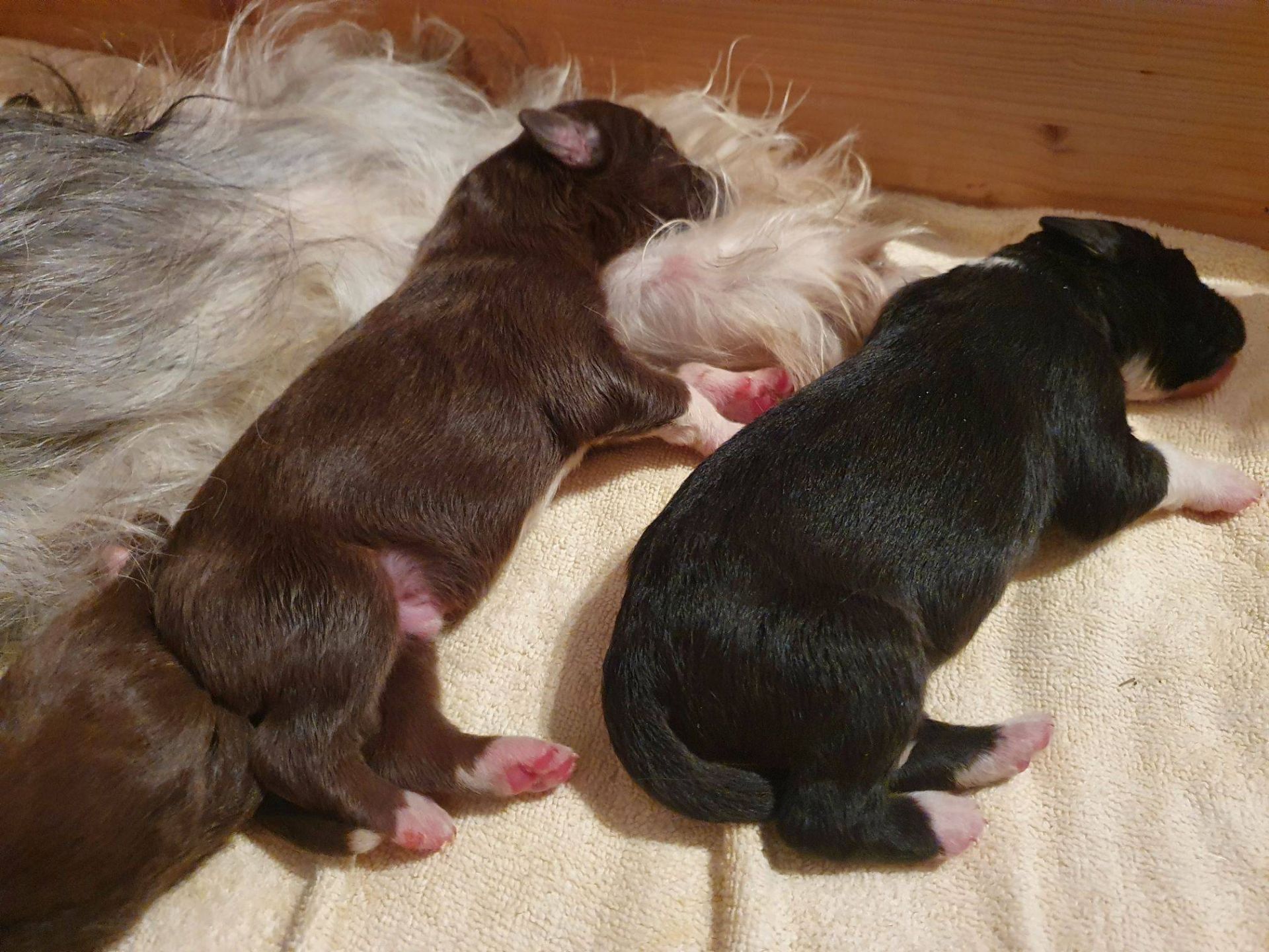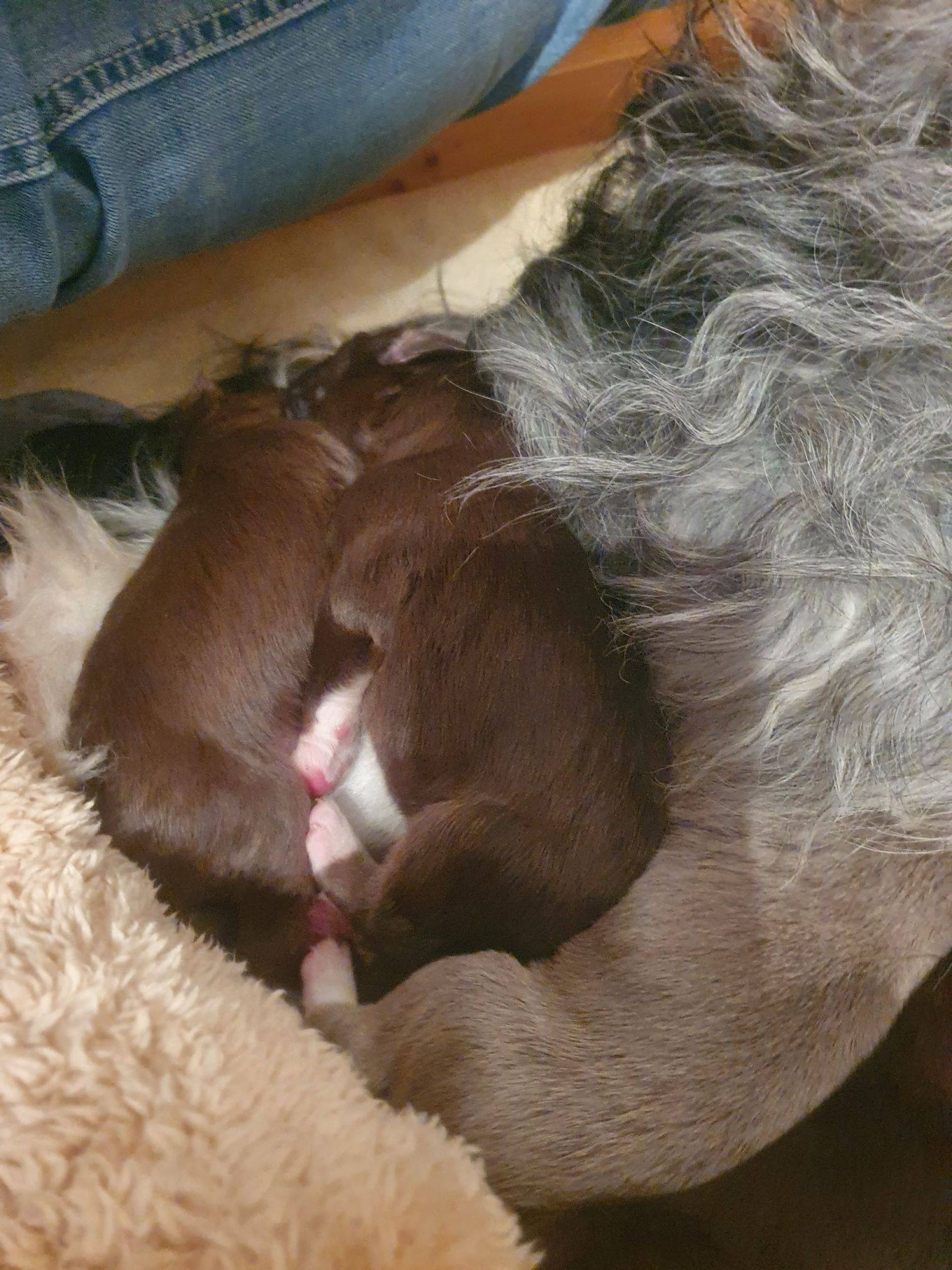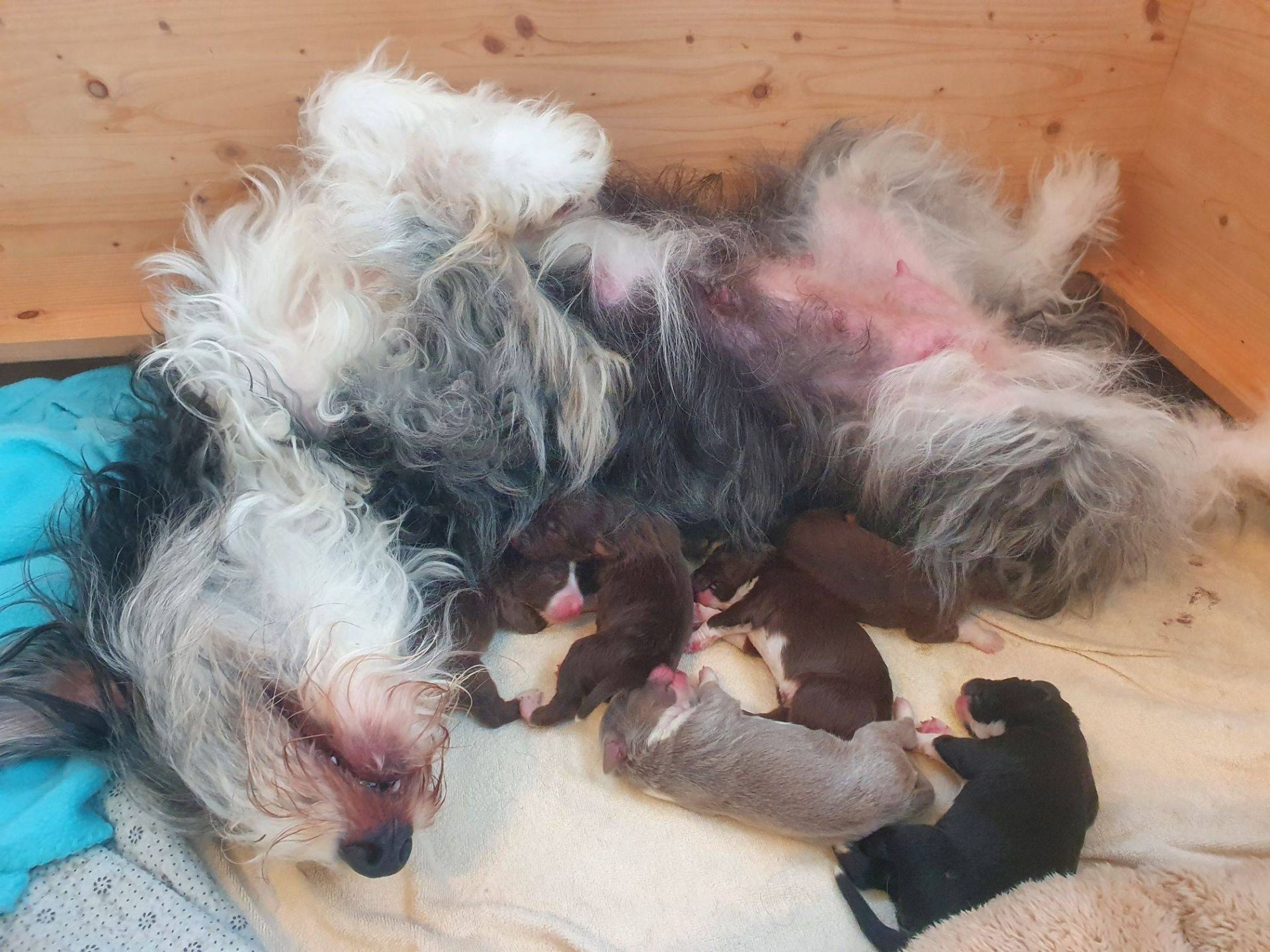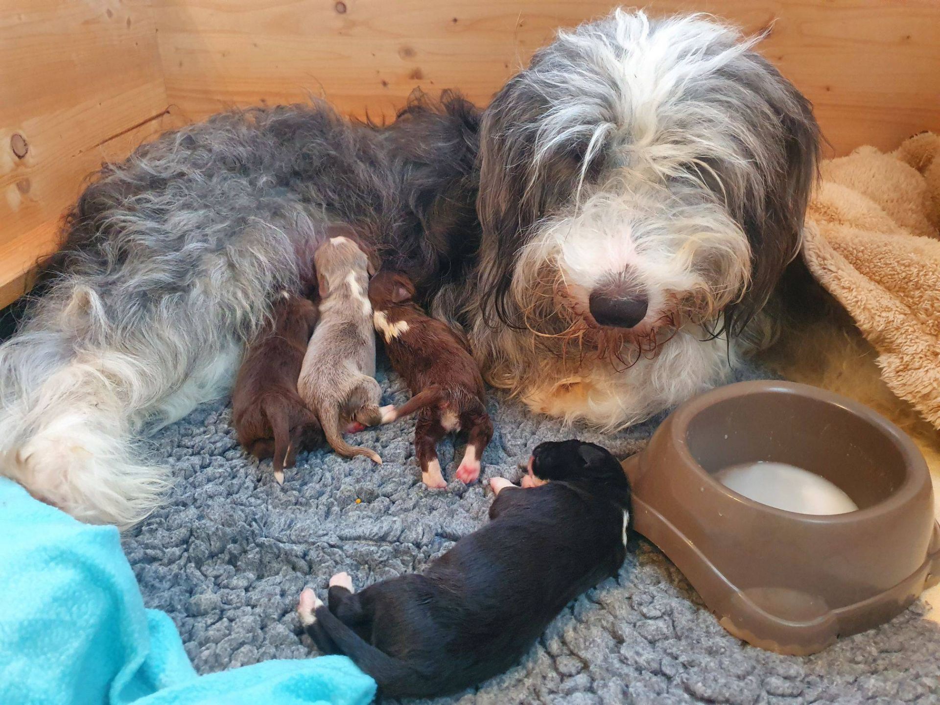 Die ersten drei Tage waren die Hölle. Zu der Trauer um die kleine Minimaus kam noch die Sorge, dass die anderen Welpen kaum bis gar nicht zugenommen haben. Ein Rüde hat sogar abgenommen. Blaze war völlig durch den Wind, hat die Welpen immer wieder an sich rangeschoben, sie zum Säugen animiert, sie durch die Gegend getragen, was mich schier wahnsinnig gemacht hat. Die Welpen haben ihr bestes gegeben. Gesaugt, getreten aber es kam nur leider keine Milch, egal wie sehr sie sich angestrengt haben. Sie habe so viel Energie verbraucht, dass der Rüde nochmal 30 Gramm abgenommen hat. Meine Nerven lagen blank. Wir hatten Welpenmilch da aber die Welpen wollten keine Flasche. Meine letzte Rettung war Sabine, eine gute Freundin, die selber auch züchtet und schon Welpen mit der Flasche gefüttert hat. Sie kam mit ihrem ganzen Equipment, Sterilisator, Warmhaltebehälter und zig verschiedene Flaschen. Einmal gezeigt, wie es geht ist es wirklich einfach und durch die Gerätschaften geht es auch schnell. Das hat zumindest mal meine Nerven beruhigt. Muttermilch wäre jedoch eindeutig besser. Die Tierärzte wussten keinen Rat ausser immer wieder die Welpen anlegen. Das stimmt ja auch aber nach einem Tag, sollte die Milch dann schon einschießen. Da kam mir dann meine Schwester zur Hilfe, die sich erinnert hat, dass Wärme bei ihr geholfen hat. Also Blaze warm abgeduscht und das Gesäuge massiert und siehe da, die Milch lief. Wir haben das noch dreimal vor jedem Säugen wiederholt, jetzt ist das Gesäuge ausgebildet. Zudem bekommt sie zu ihrer Ziegenmilch noch Fencheltee, Karotten, Haferflocken und Eier. Alles milchbildende Lebensmittel. Inzwischen bin ich echt Experte. Nach 72 fast ohne Schlaf, ist jetzt ein bisschen Ruhe eingekehrt.