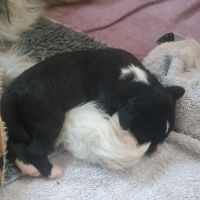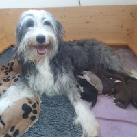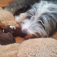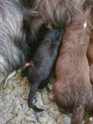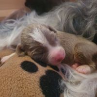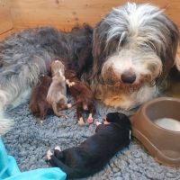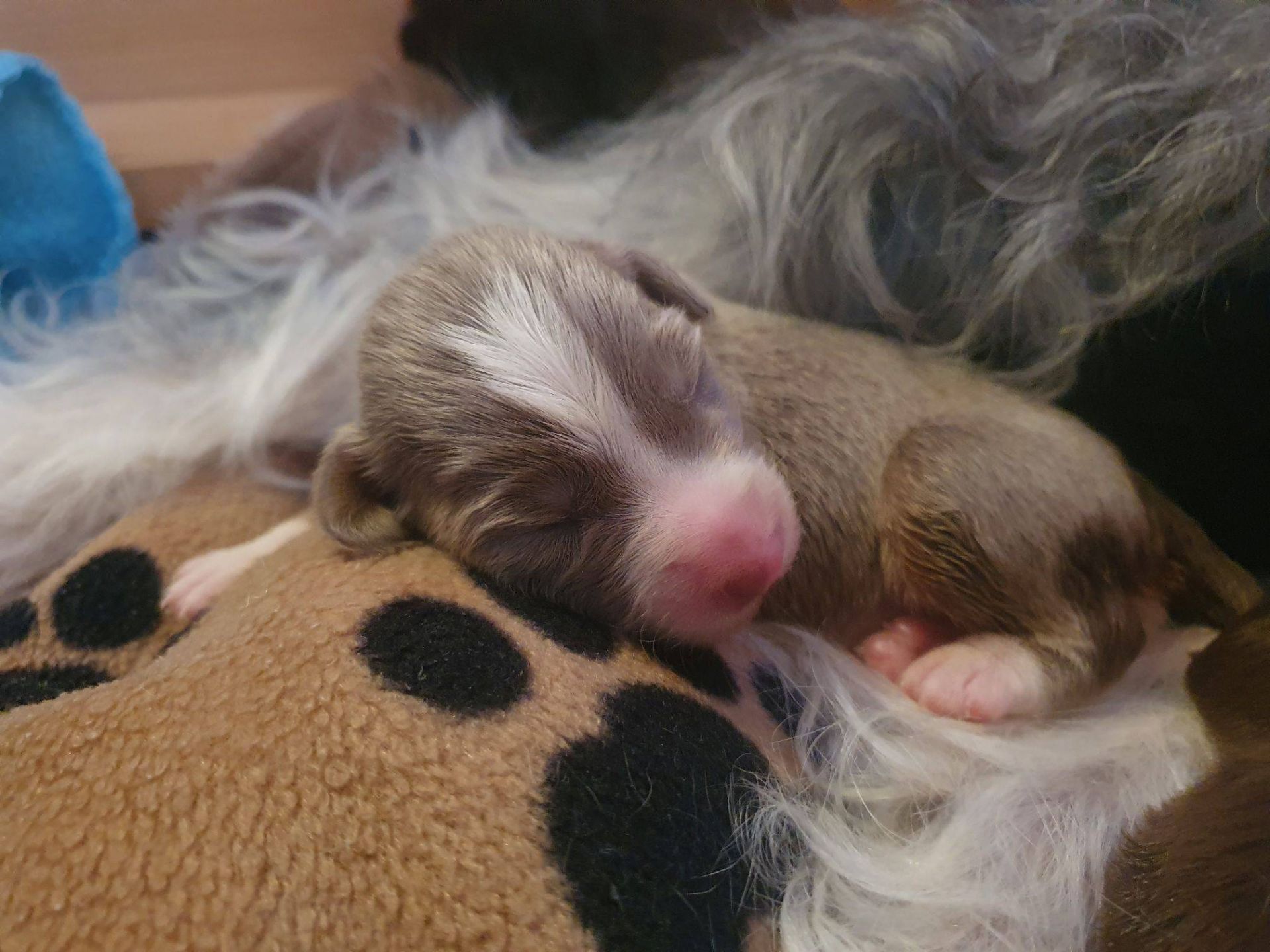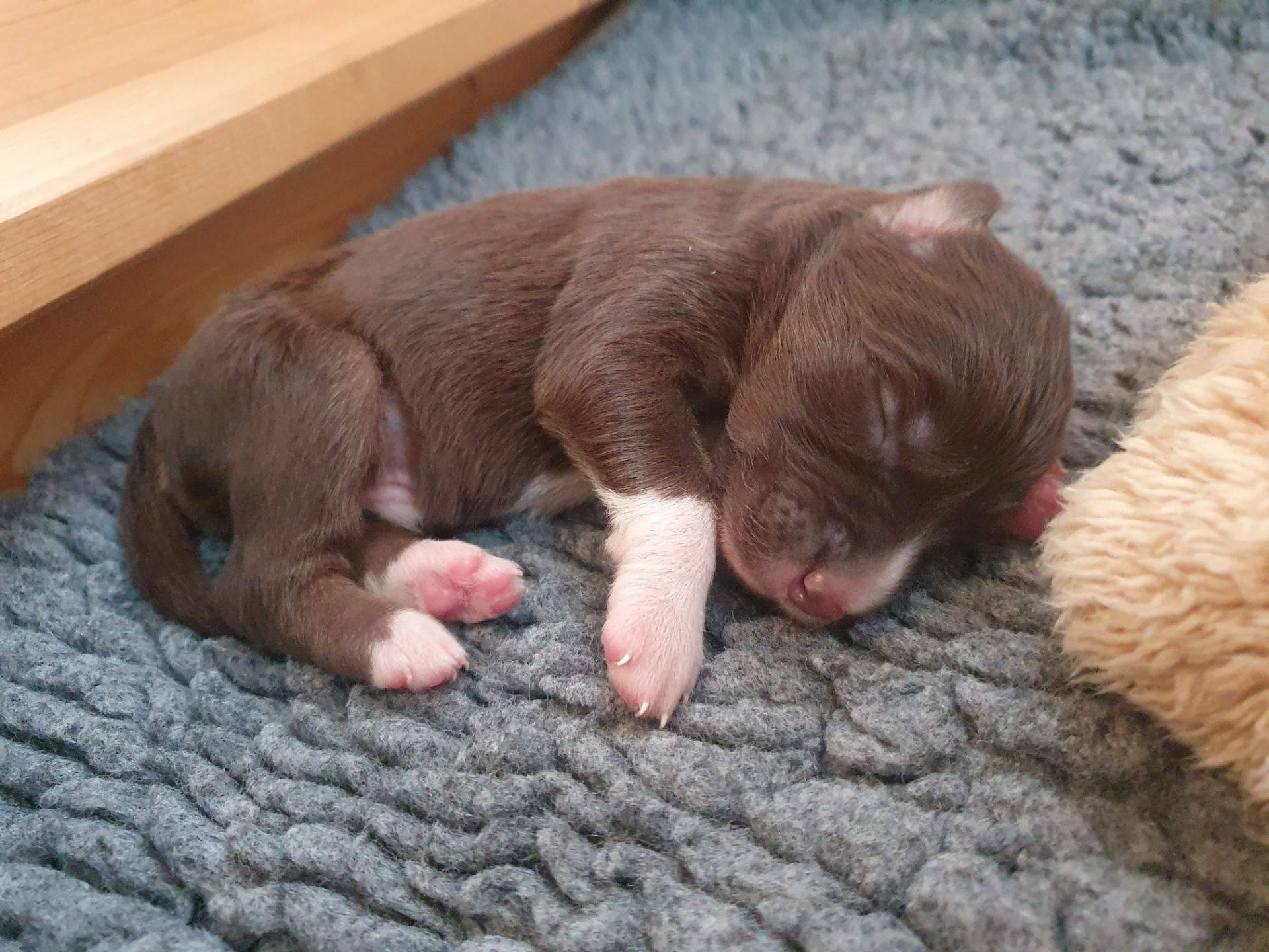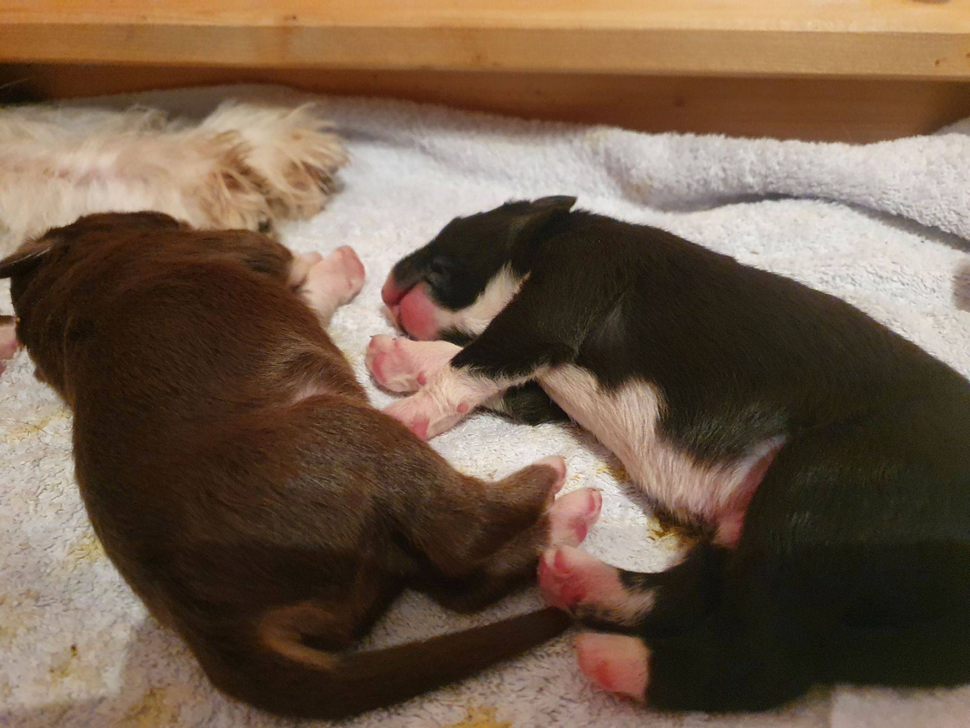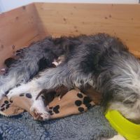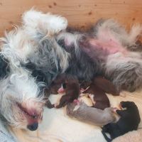 Die ersten drei Tage waren die Hölle. Zu der Trauer um die kleine Minimaus kam noch die Sorge, dass die anderen Welpen kaum bis gar nicht zugenommen haben. Ein Rüde hat sogar abgenommen. Blaze war völlig durch den Wind, hat die Welpen immer wieder an sich rangeschoben, sie zum Säugen animiert, sie durch die Gegend getragen, was mich schier wahnsinnig gemacht hat. Die Welpen haben ihr bestes gegeben. Gesaugt, getreten aber es kam nur leider keine Milch, egal wie sehr sie sich angestrengt haben. Sie habe so viel Energie verbraucht, dass der Rüde nochmal 30 Gramm abgenommen hat. Meine Nerven lagen blank. Wir hatten Welpenmilch da aber die Welpen wollten keine Flasche. Meine letzte Rettung war Sabine, eine gute Freundin, die selber auch züchtet und schon Welpen mit der Flasche gefüttert hat. Sie kam mit ihrem ganzen Equipment, Sterilisator, Warmhaltebehälter und zig verschiedene Flaschen. Einmal gezeigt, wie es geht ist es wirklich einfach und durch die Gerätschaften geht es auch schnell. Das hat zumindest mal meine Nerven beruhigt. Muttermilch wäre jedoch eindeutig besser. Die Tierärzte wussten keinen Rat ausser immer wieder die Welpen anlegen. Das stimmt ja auch aber nach einem Tag, sollte die Milch dann schon einschießen. Da kam mir dann meine Schwester zur Hilfe, die sich erinnert hat, dass Wärme bei ihr geholfen hat. Also Blaze warm abgeduscht und das Gesäuge massiert und siehe da, die Milch lief. Wir haben das noch dreimal vor jedem Säugen wiederholt, jetzt ist das Gesäuge ausgebildet. Zudem bekommt sie zu ihrer Ziegenmilch noch Fencheltee, Karotten, Haferflocken und Eier. Alles milchbildende Lebensmittel. Inzwischen bin ich echt Experte. Nach 72 fast ohne Schlaf, ist jetzt ein bisschen Ruhe eingekehrt.