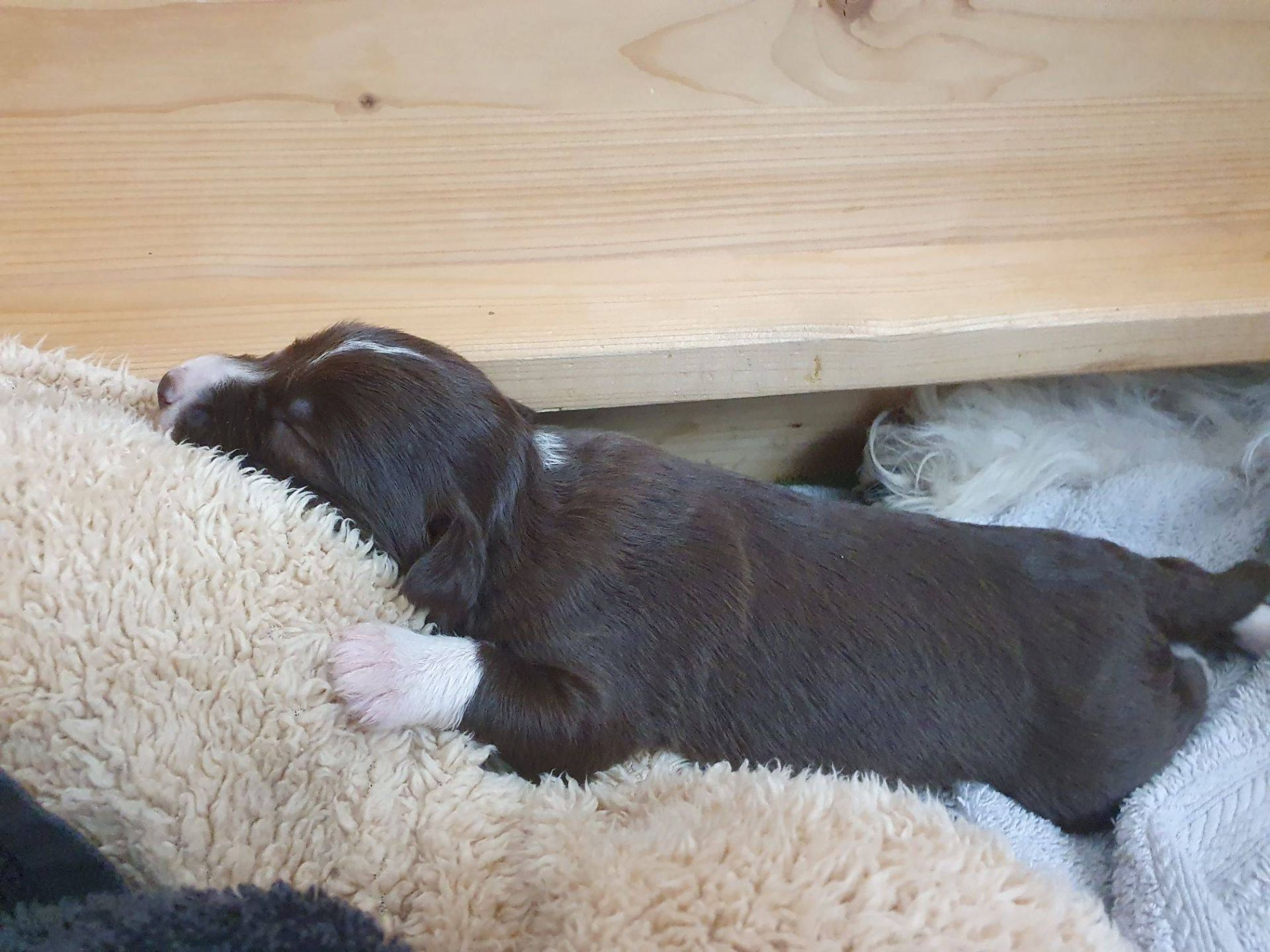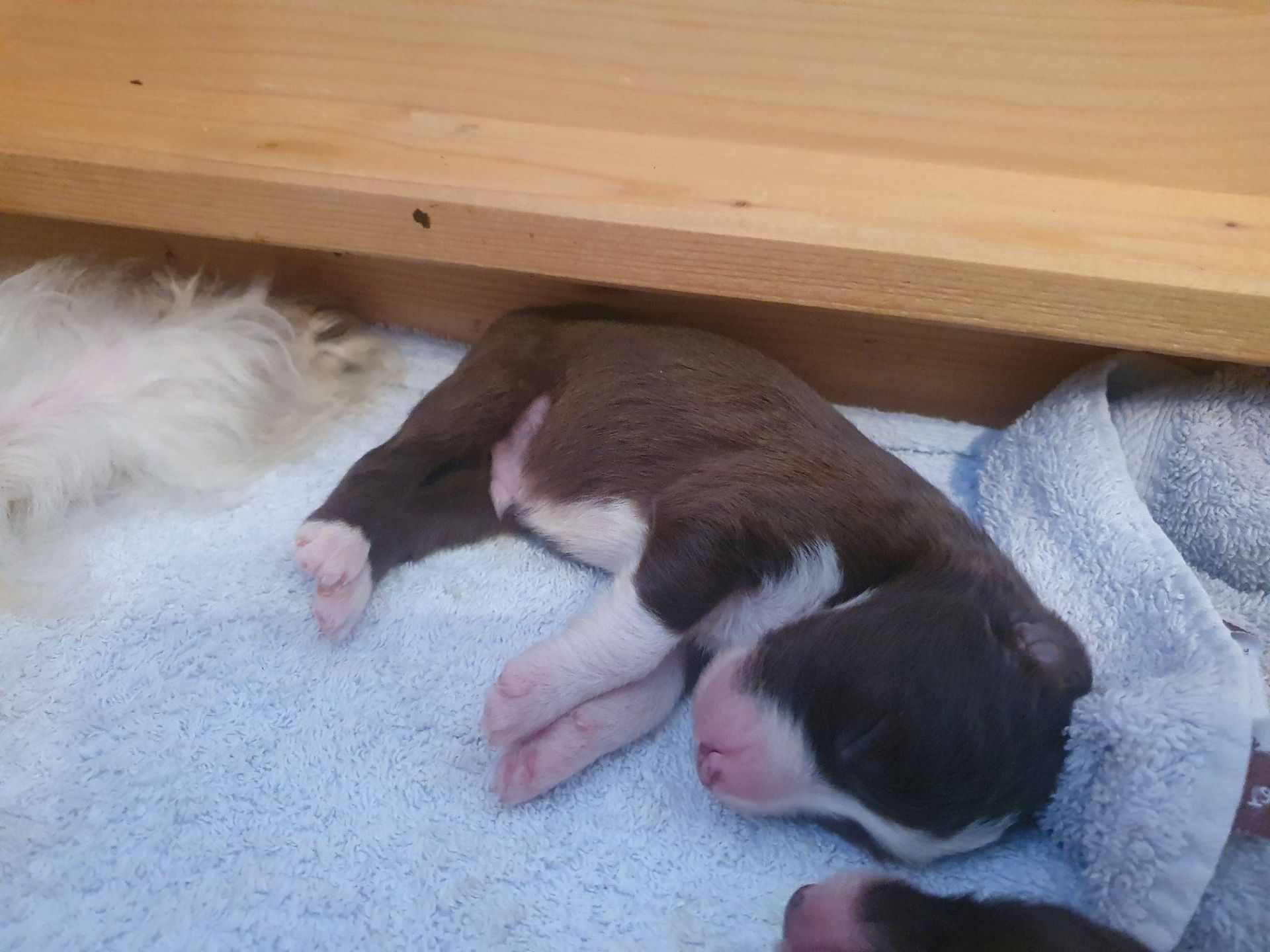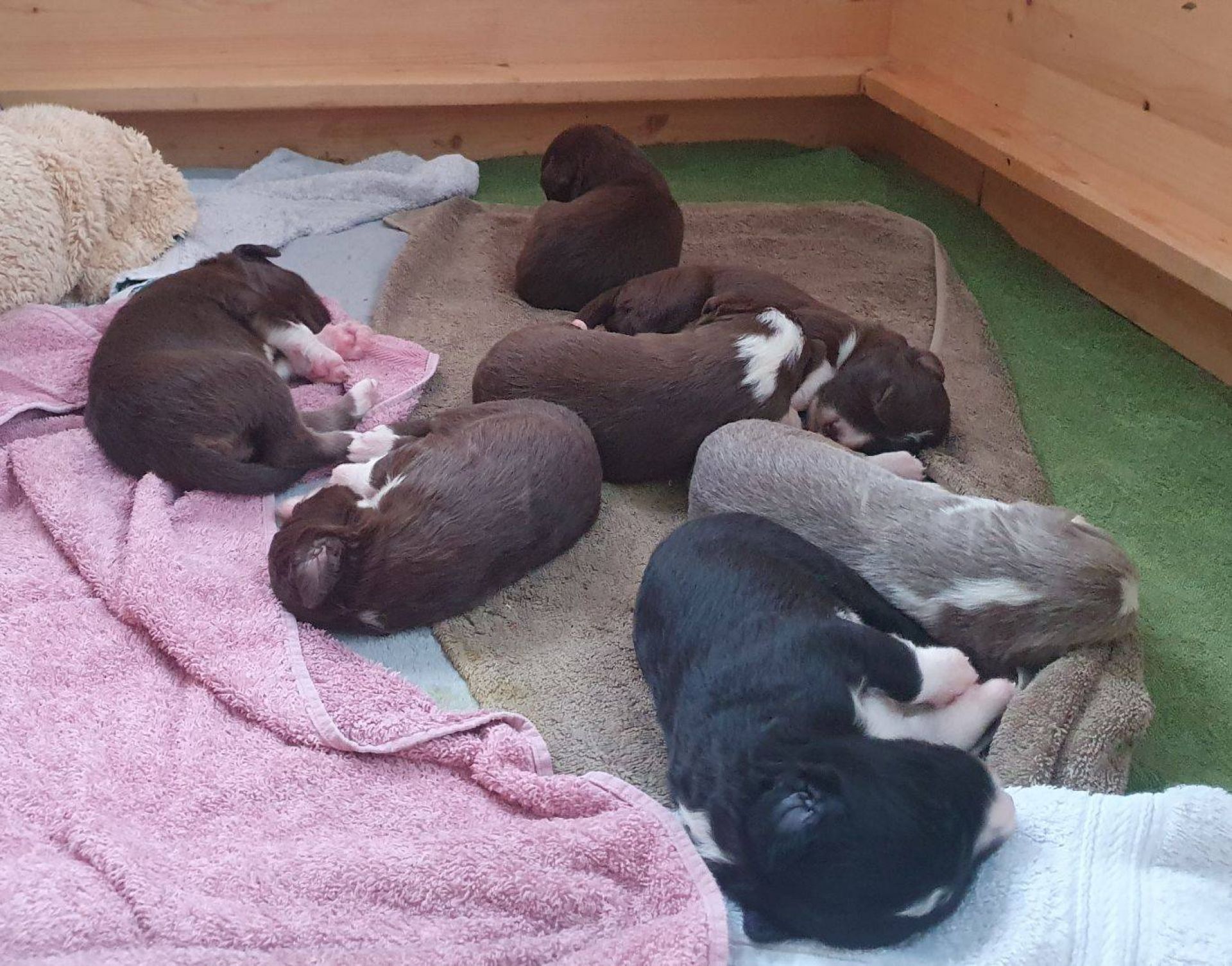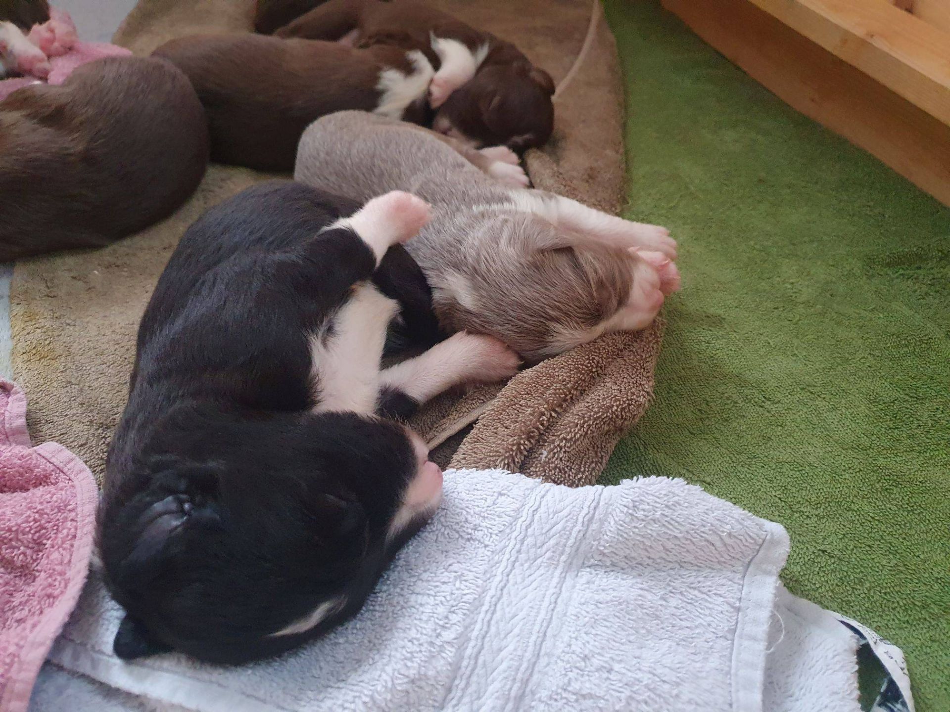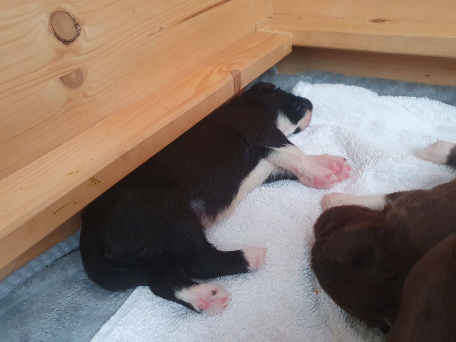 So lieb, verkuschelt, chillig, sanft und brav die Welpis sind, so energisch und rabiat werden sie, wenn es ums Trinken geht. Die arme Blaze bekommt Knutschflecken und wird ausgesaugt. Kein Wunder, dass sie nur noch zum Säugen und Putzen reingeht. Nuckeln gibt es momentan nicht. Sie schläft lieber vor der Wurfbox.