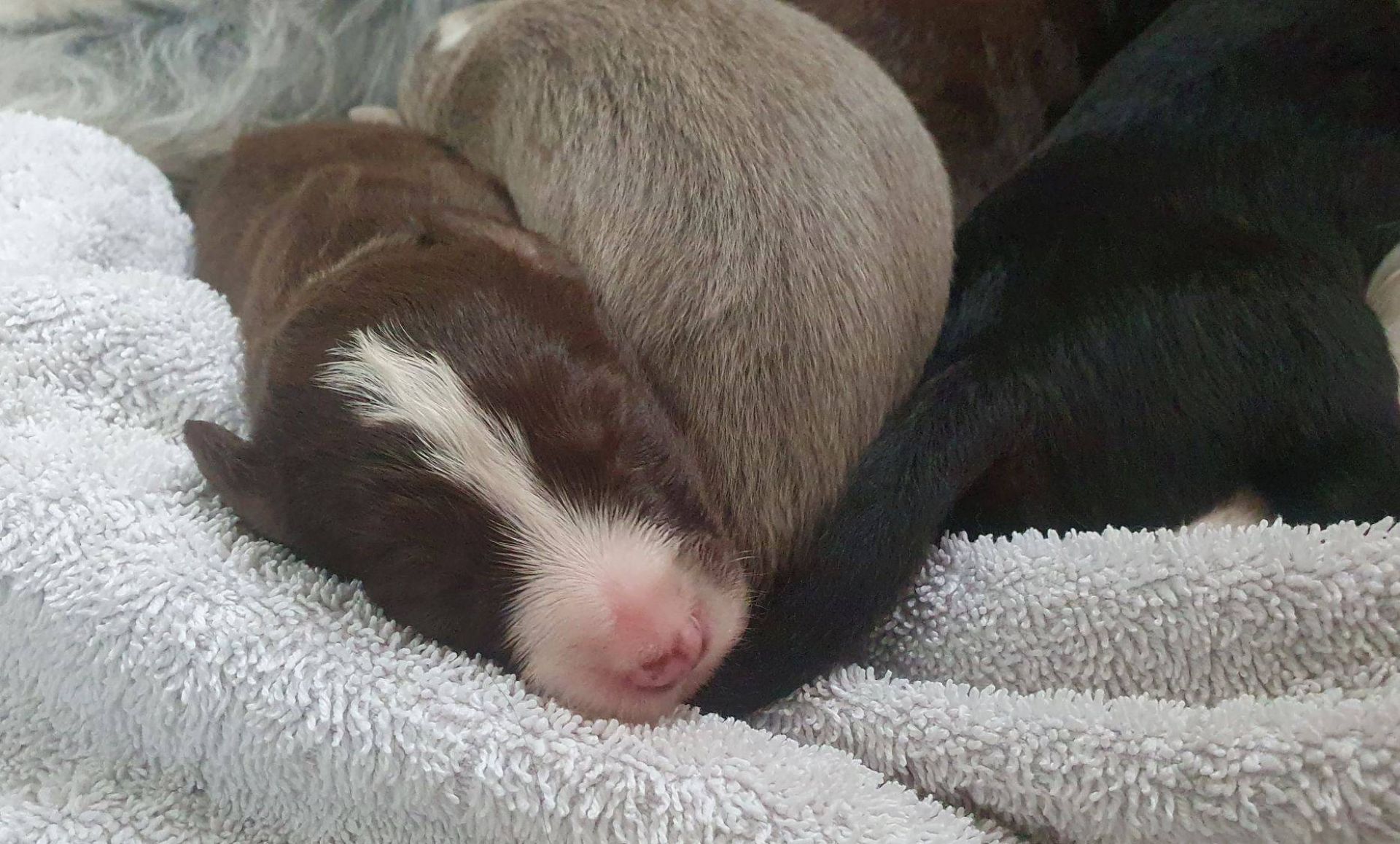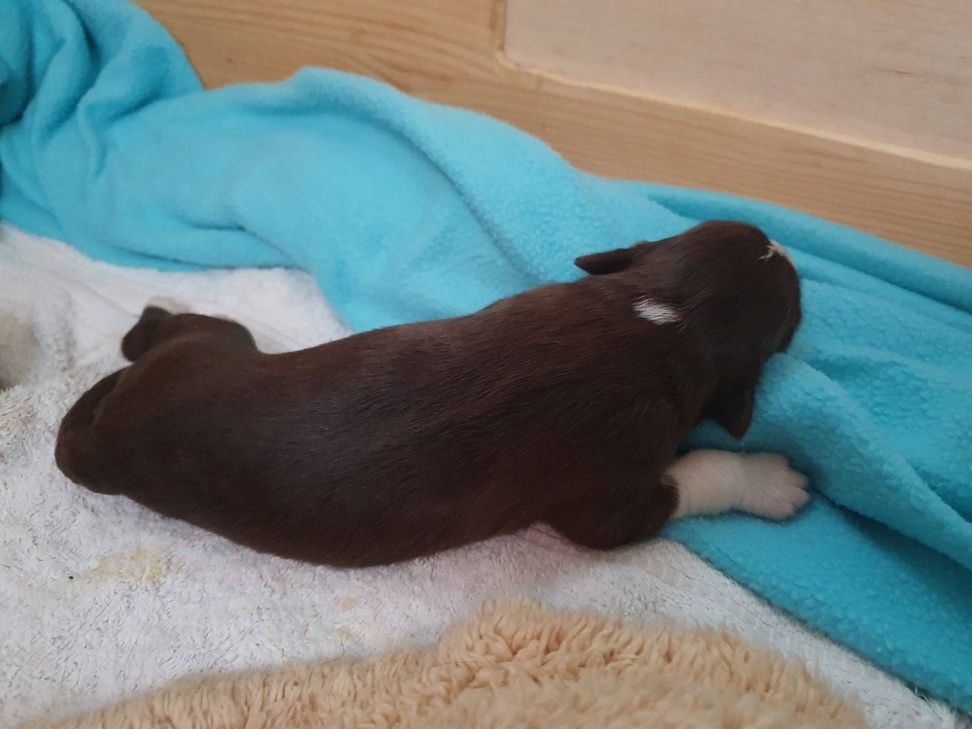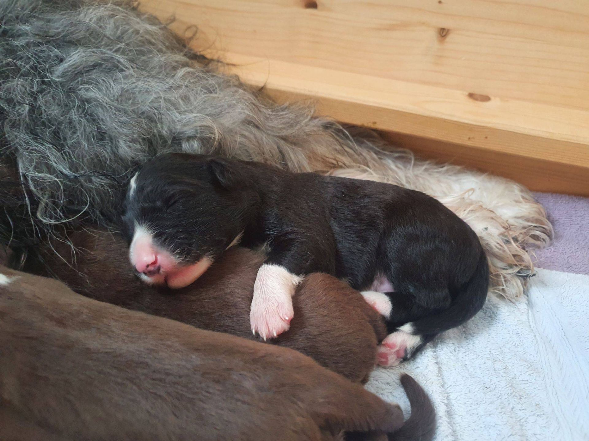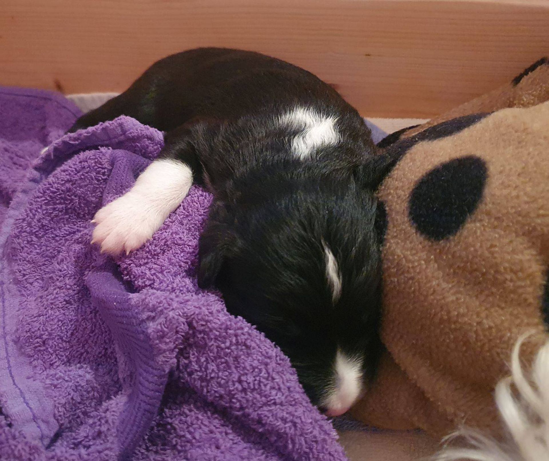 So lieb, verkuschelt, chillig, sanft und brav die Welpis sind, so energisch und rabiat werden sie, wenn es ums Trinken geht. Die arme Blaze bekommt Knutschflecken und wird ausgesaugt. Kein Wunder, dass sie nur noch zum Säugen und Putzen reingeht. Nuckeln gibt es momentan nicht. Sie schläft lieber vor der Wurfbox.