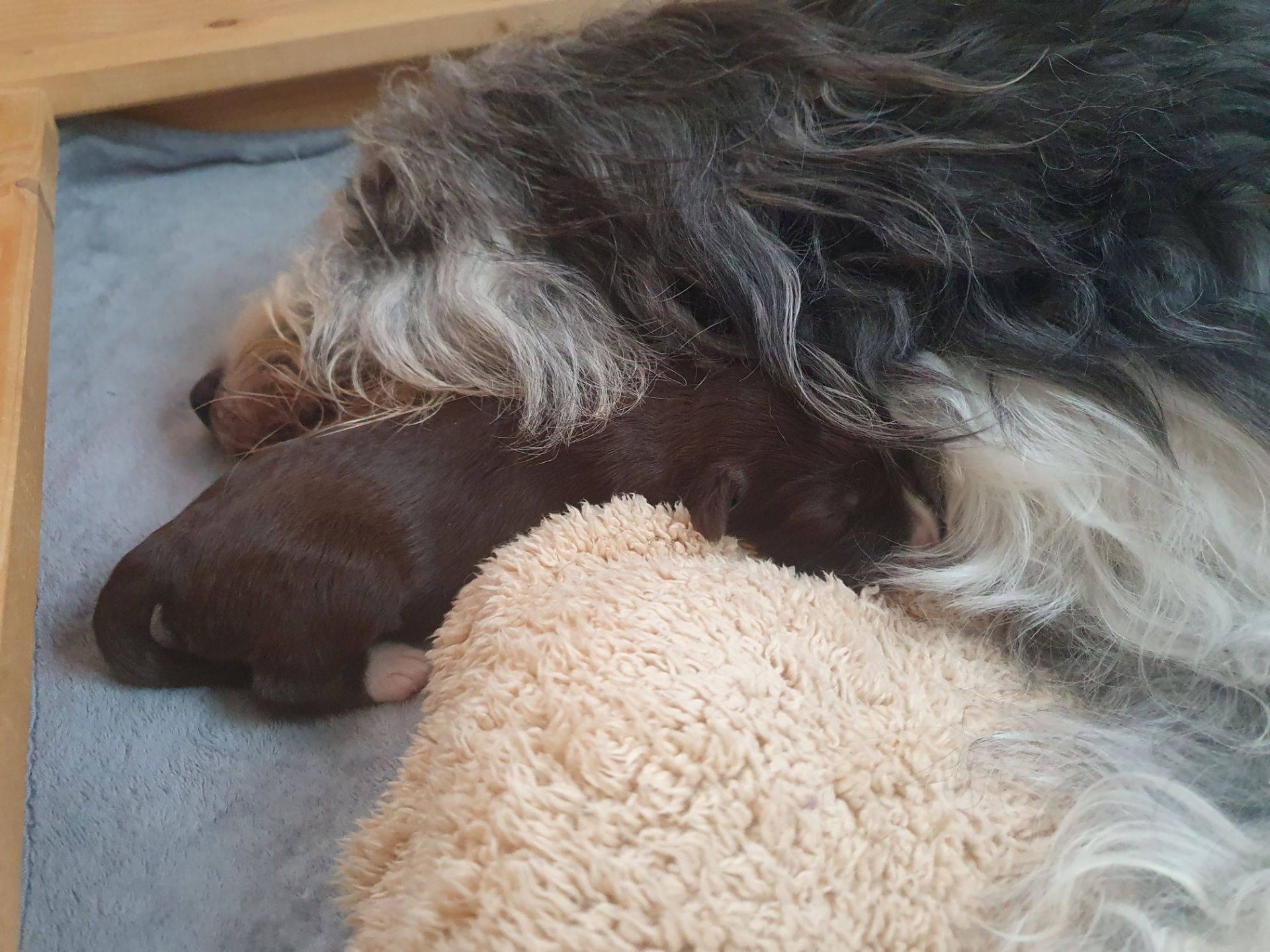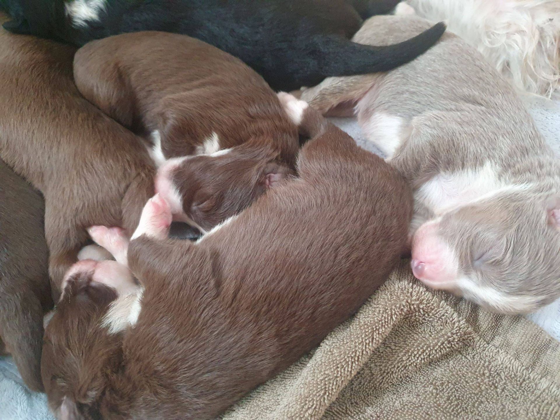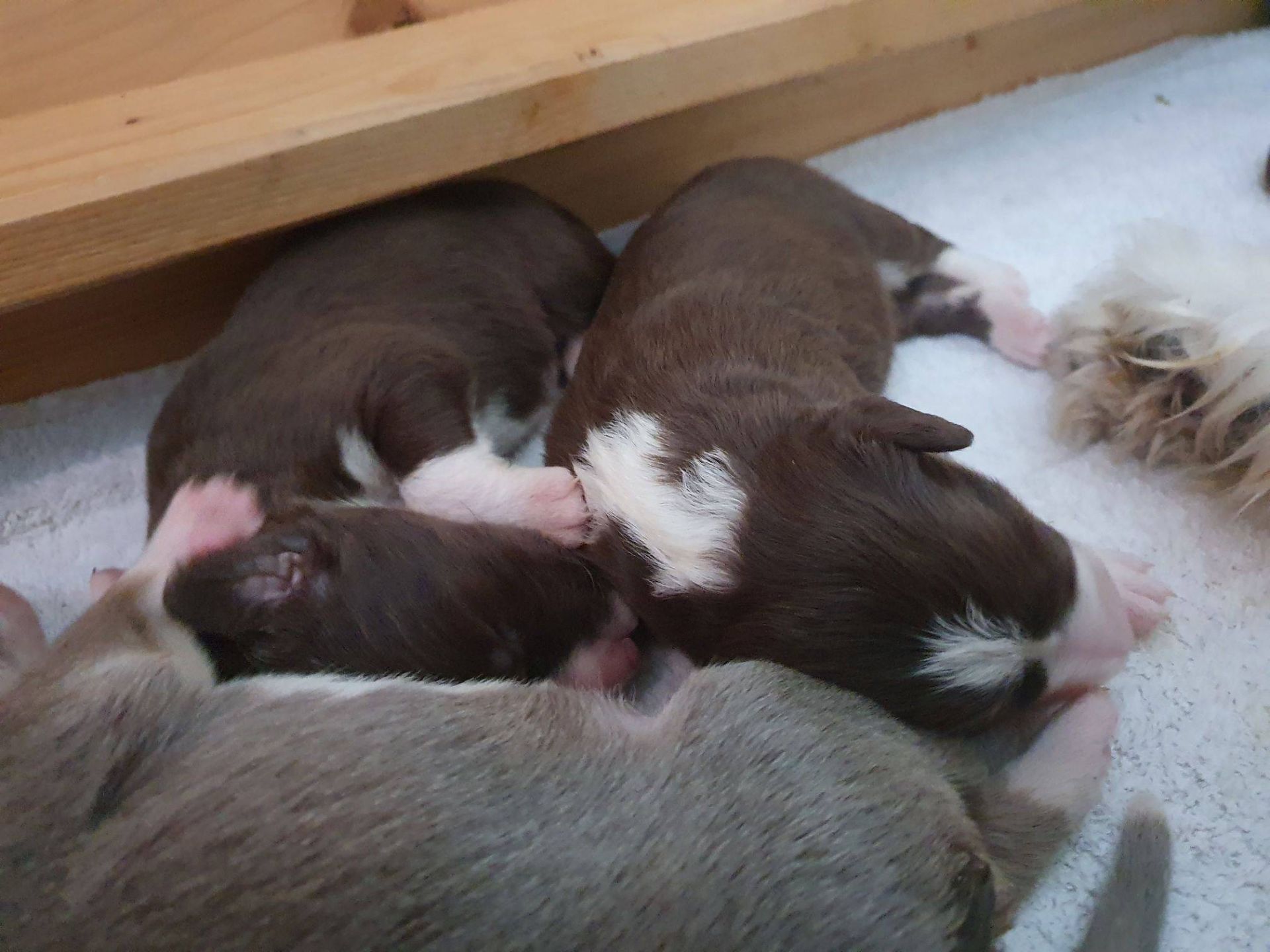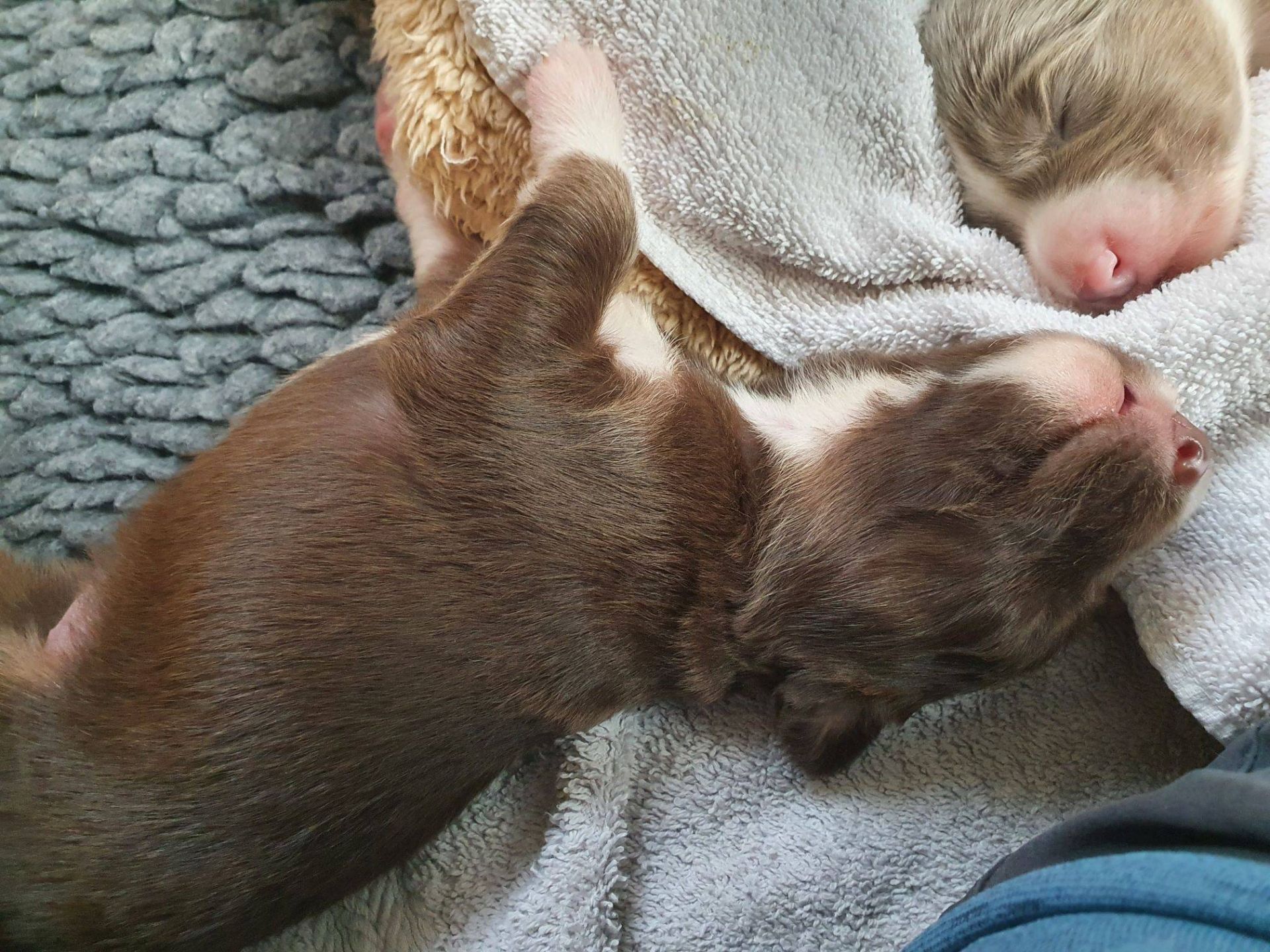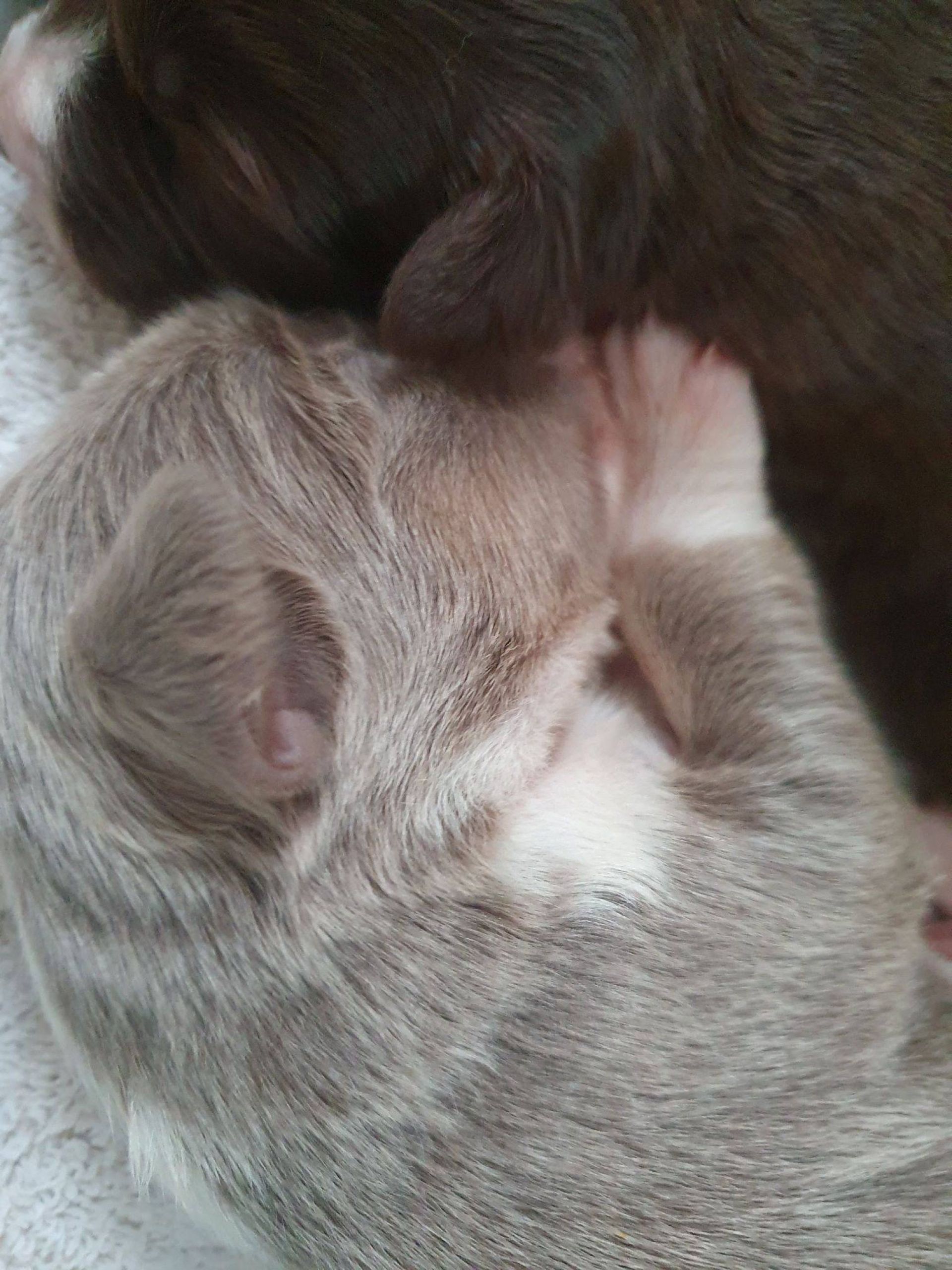 So lieb, verkuschelt, chillig, sanft und brav die Welpis sind, so energisch und rabiat werden sie, wenn es ums Trinken geht. Die arme Blaze bekommt Knutschflecken und wird ausgesaugt. Kein Wunder, dass sie nur noch zum Säugen und Putzen reingeht. Nuckeln gibt es momentan nicht. Sie schläft lieber vor der Wurfbox.