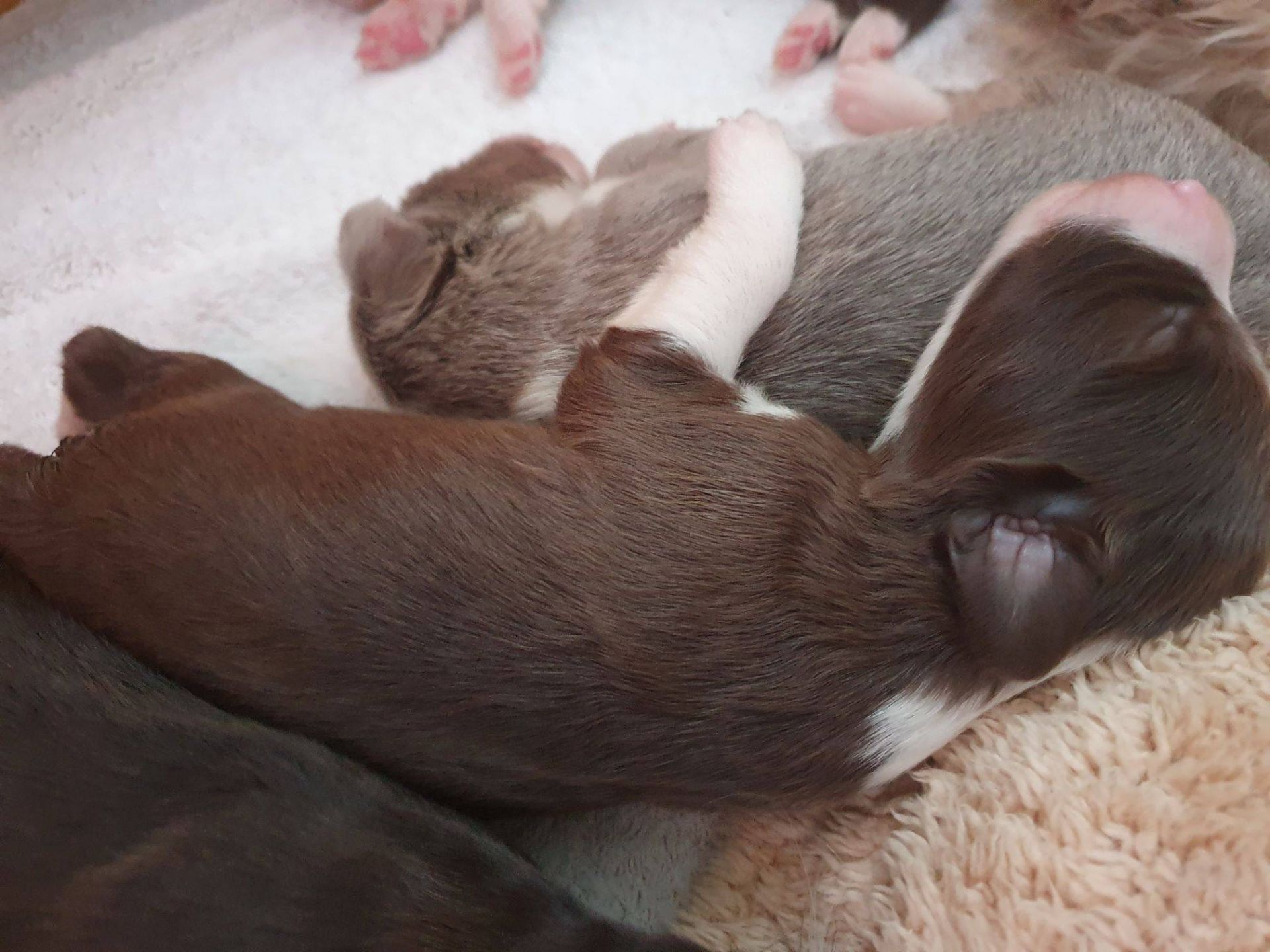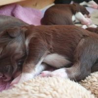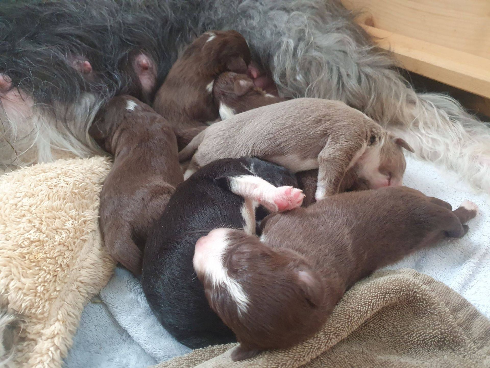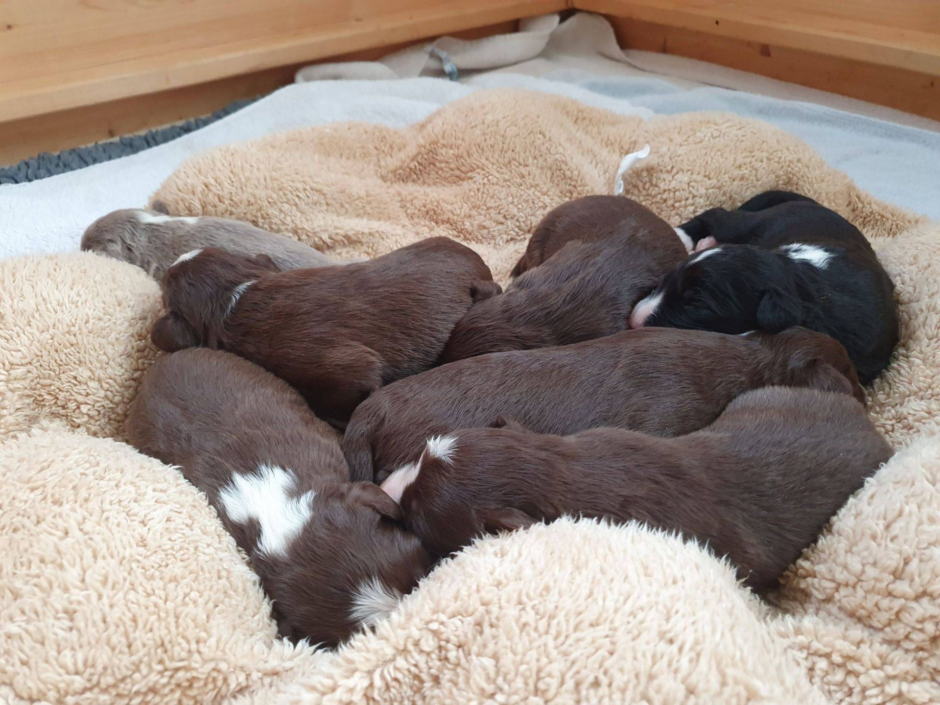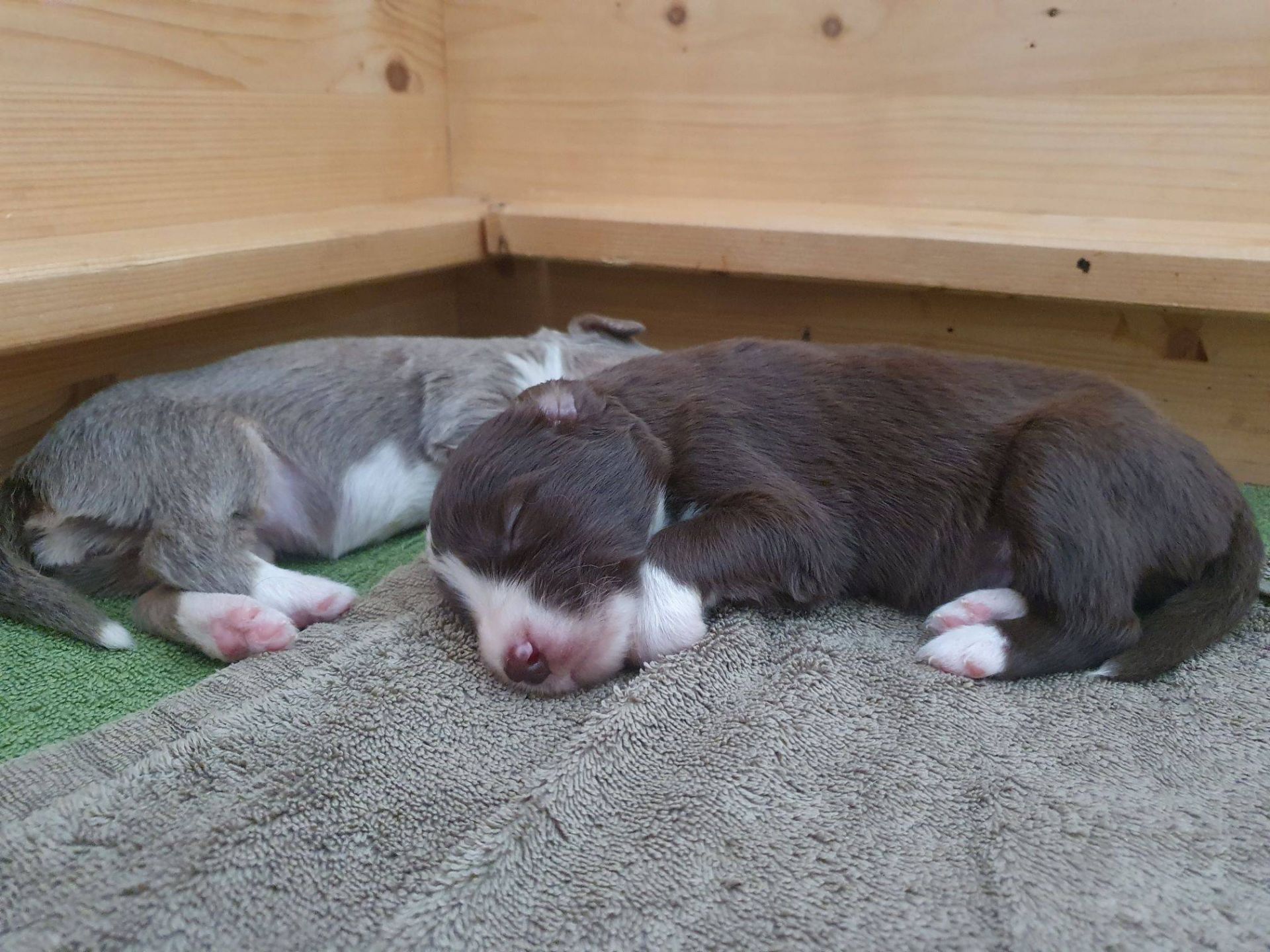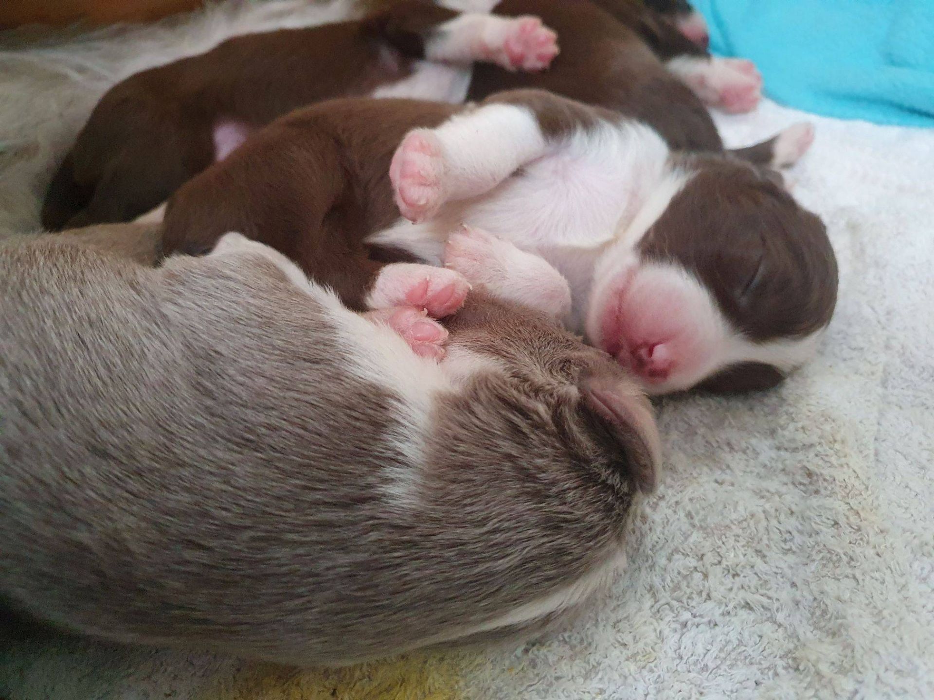 So lieb, verkuschelt, chillig, sanft und brav die Welpis sind, so energisch und rabiat werden sie, wenn es ums Trinken geht. Die arme Blaze bekommt Knutschflecken und wird ausgesaugt. Kein Wunder, dass sie nur noch zum Säugen und Putzen reingeht. Nuckeln gibt es momentan nicht. Sie schläft lieber vor der Wurfbox.