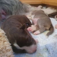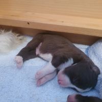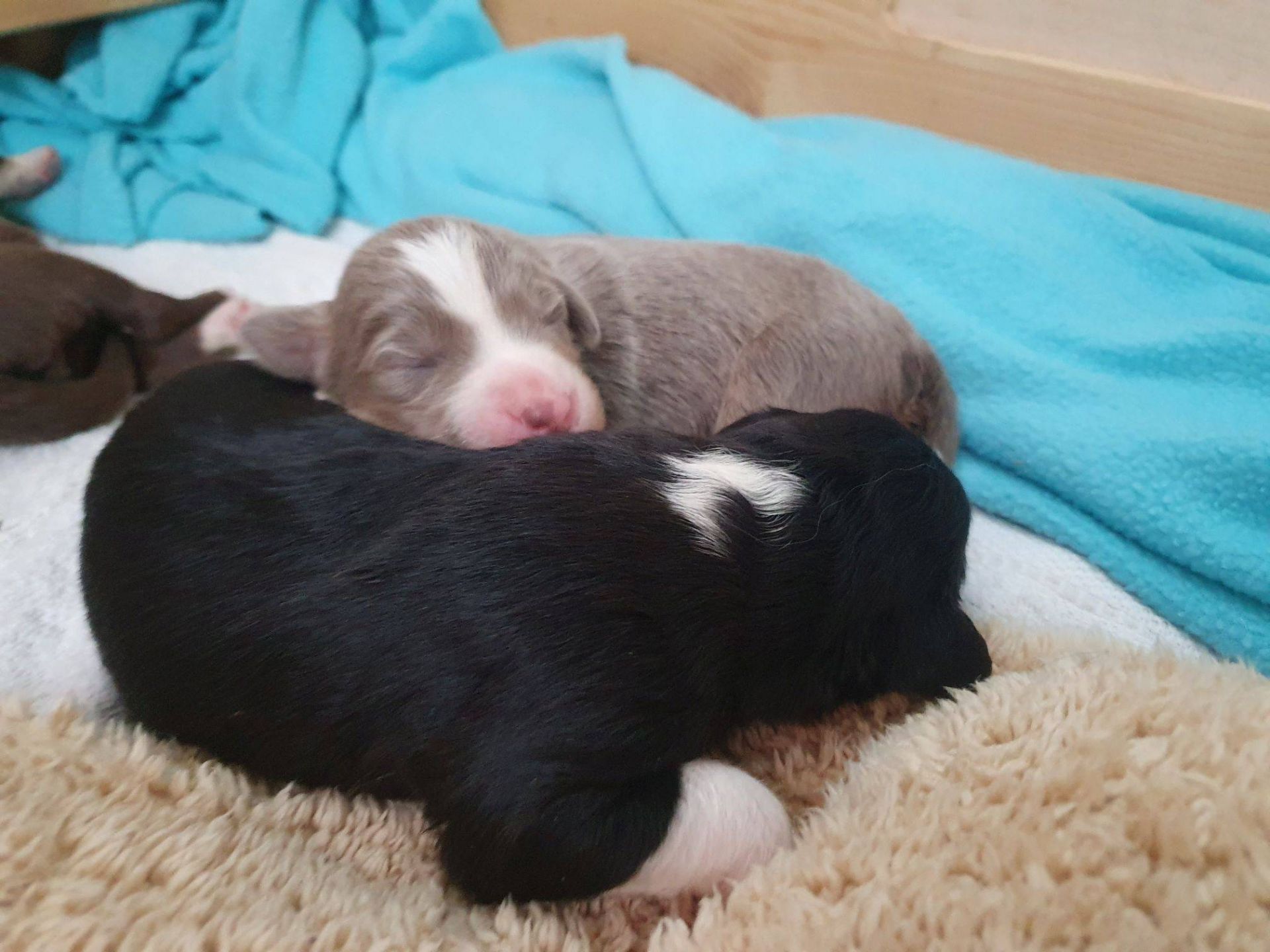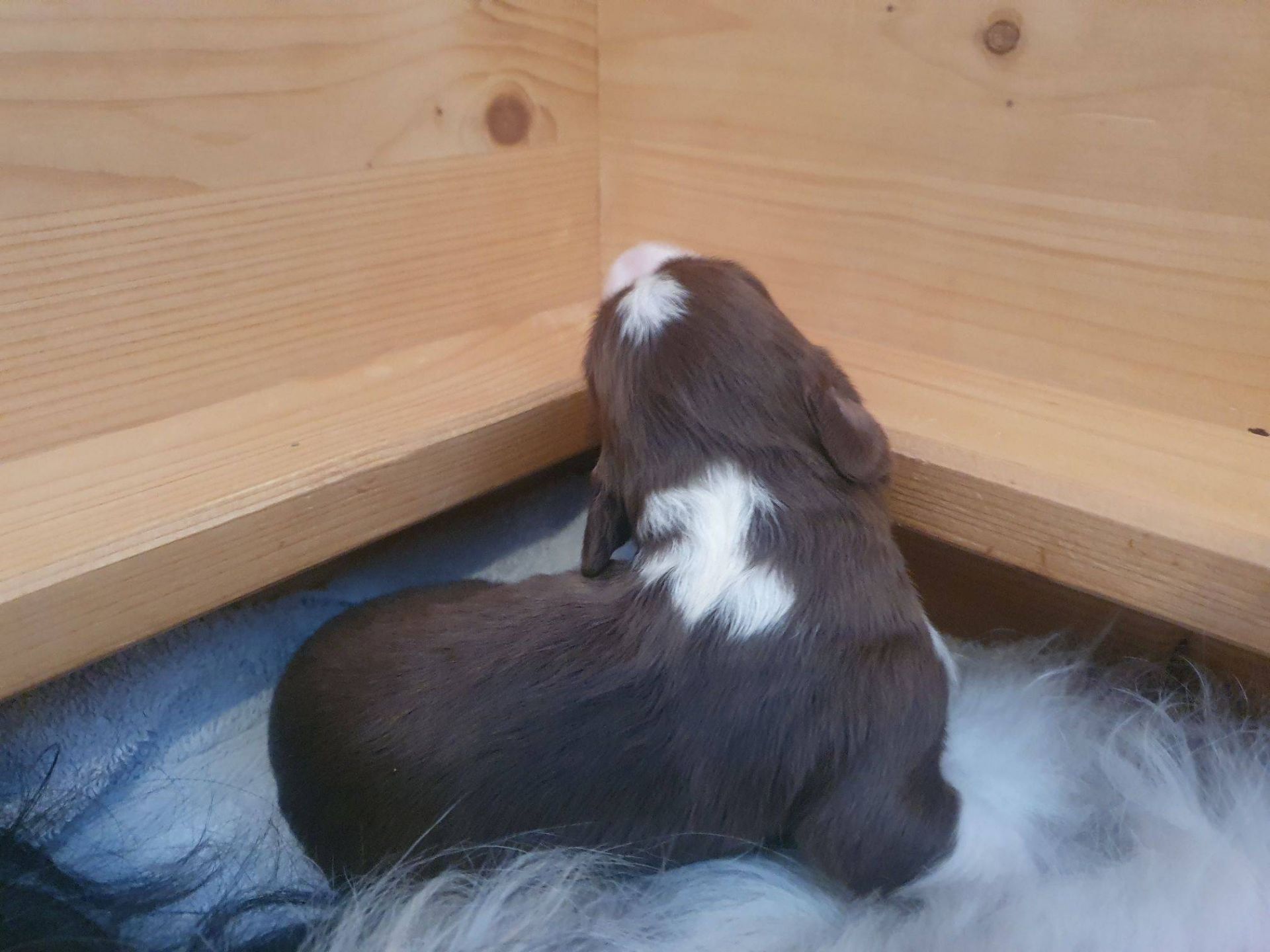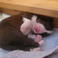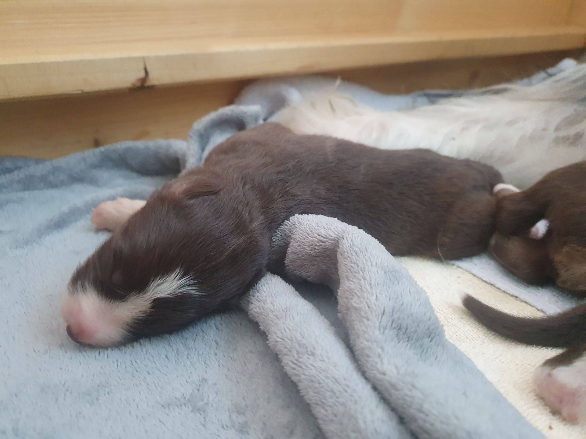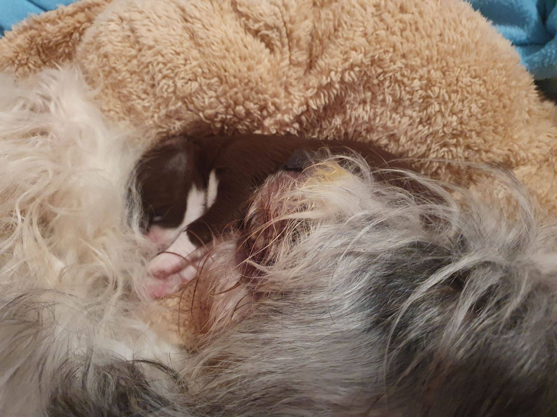 So lieb, verkuschelt, chillig, sanft und brav die Welpis sind, so energisch und rabiat werden sie, wenn es ums Trinken geht. Die arme Blaze bekommt Knutschflecken und wird ausgesaugt. Kein Wunder, dass sie nur noch zum Säugen und Putzen reingeht. Nuckeln gibt es momentan nicht. Sie schläft lieber vor der Wurfbox.