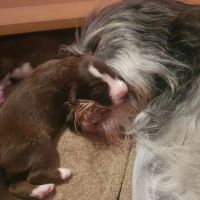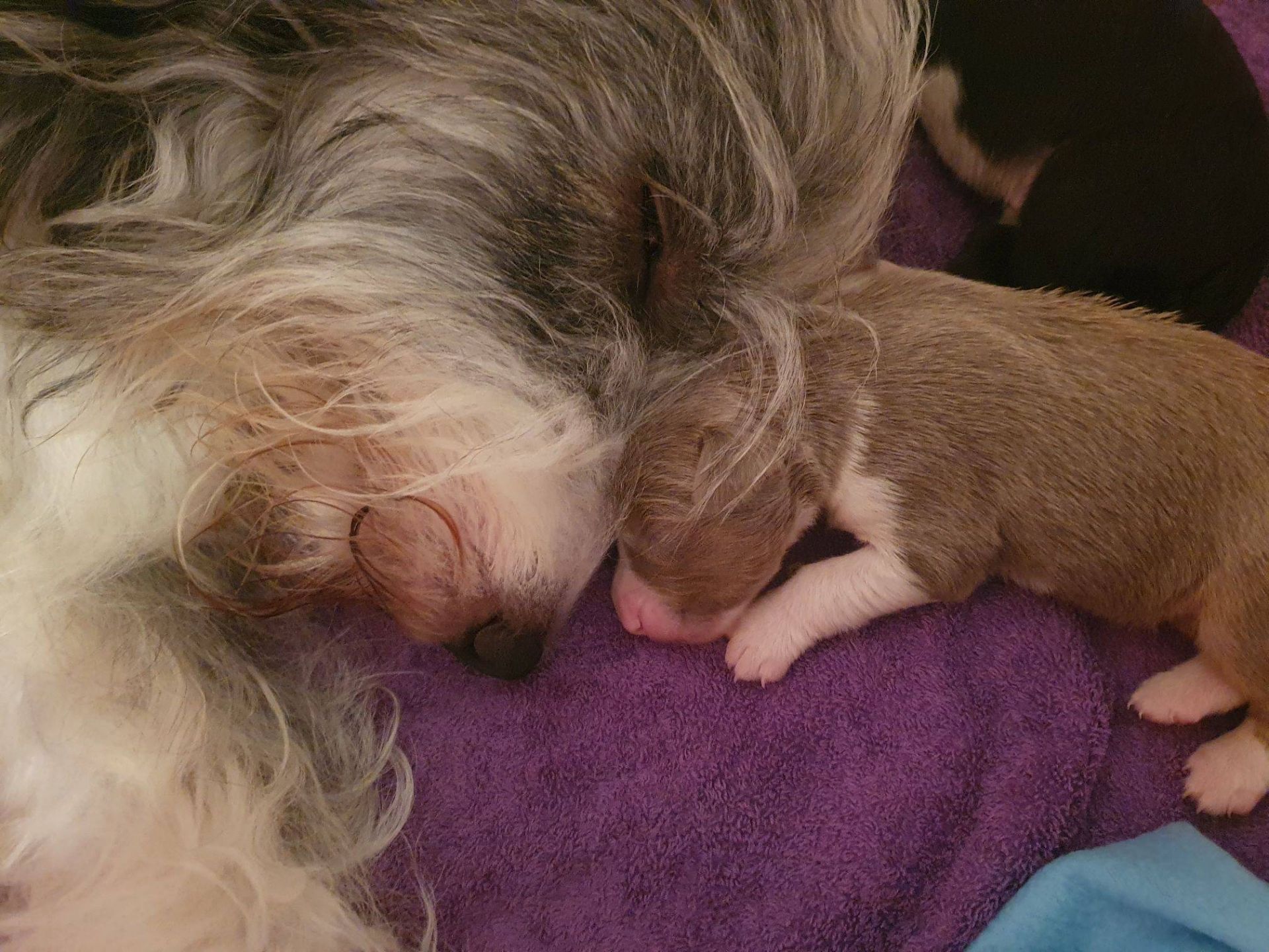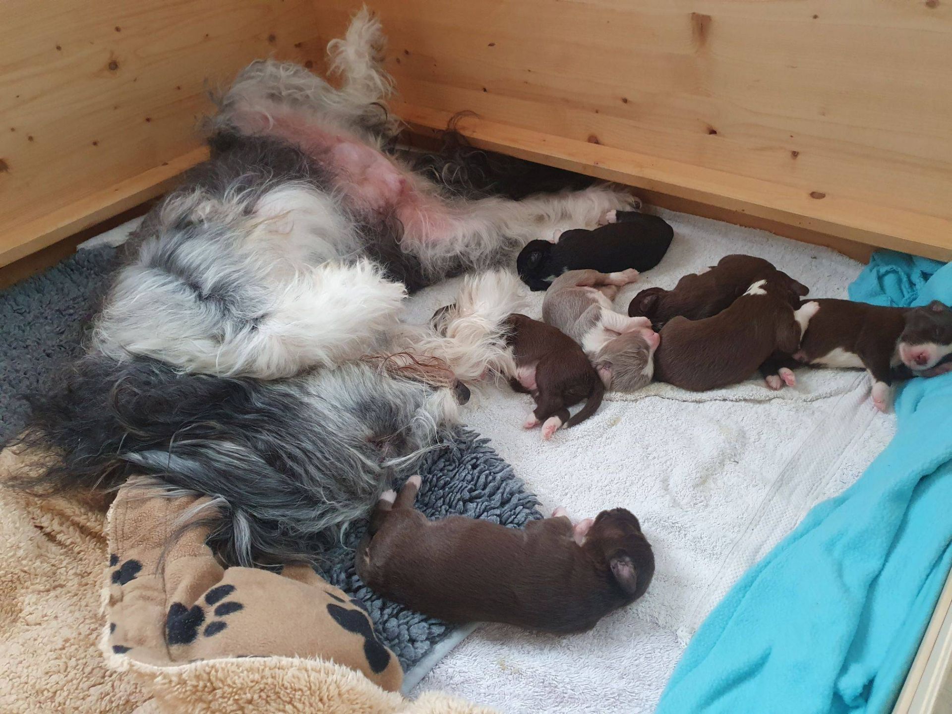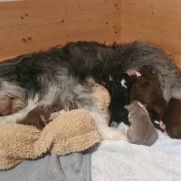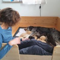 Blaze liebt es, bei ihren Babies zu liegen. Und wenn sie nur bei ihnen schläft. Hauptsache sie sind um sie rum. Aber auch die Babies liegen immer bei ihr oder zusammengeknüllt auf einem Haufen. Eine richtige Eineit. Alle sehr verkuschelt und auf Körperkontakt aus. Blaze geht aber auch wieder mit zu den Rudelspaziergängen und geniesst auch das.