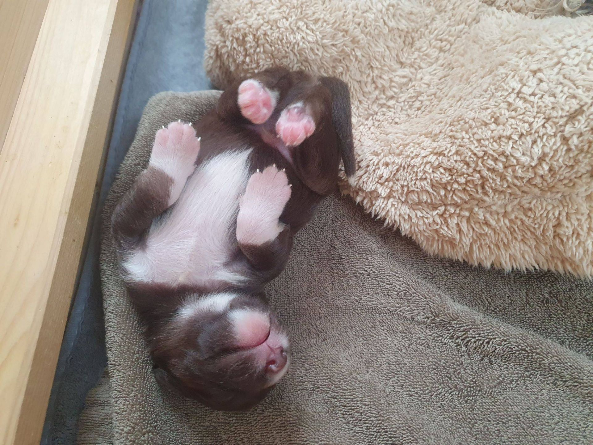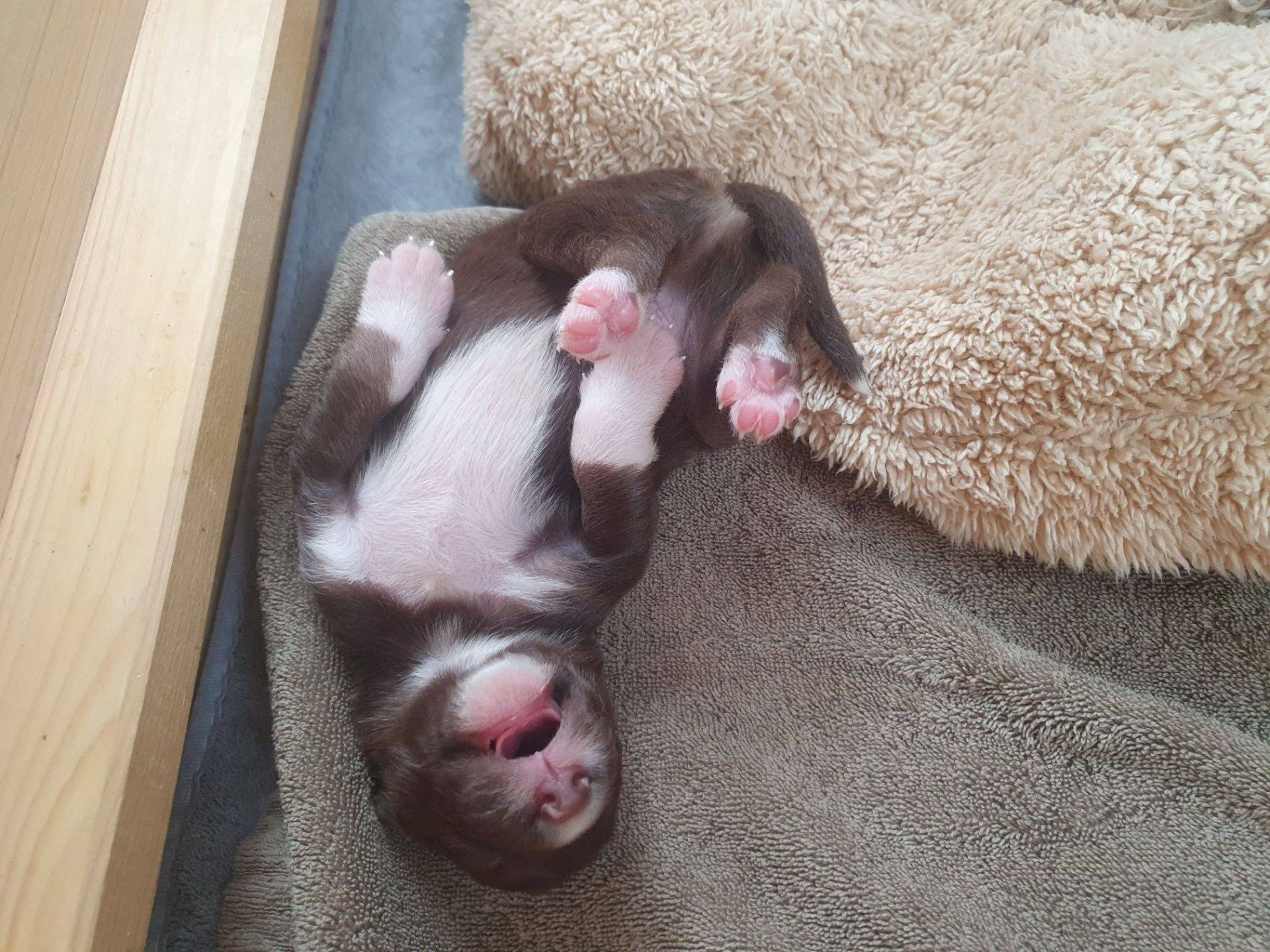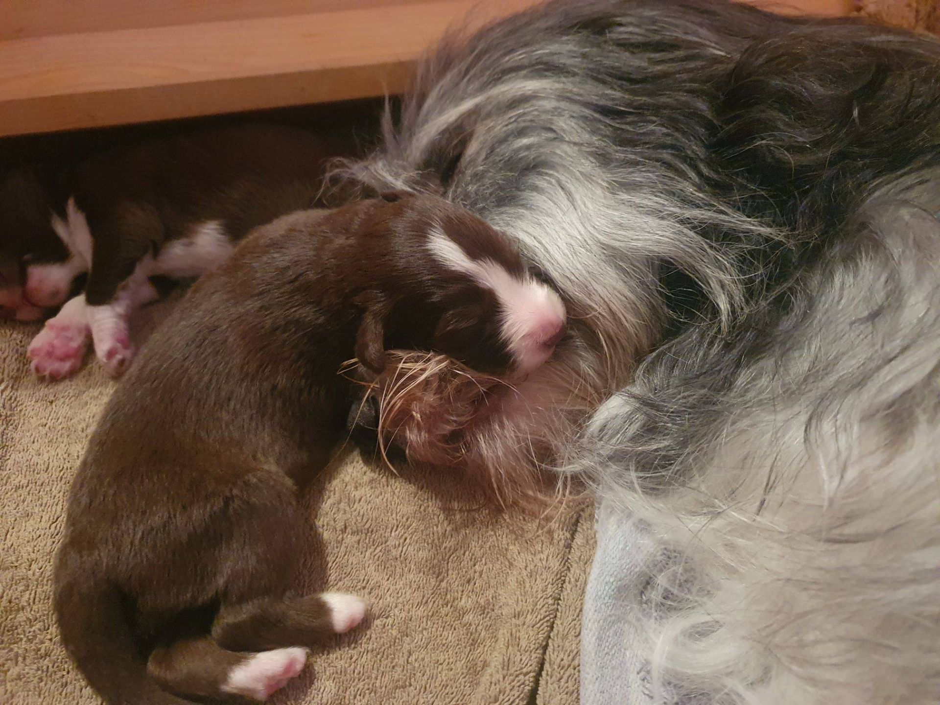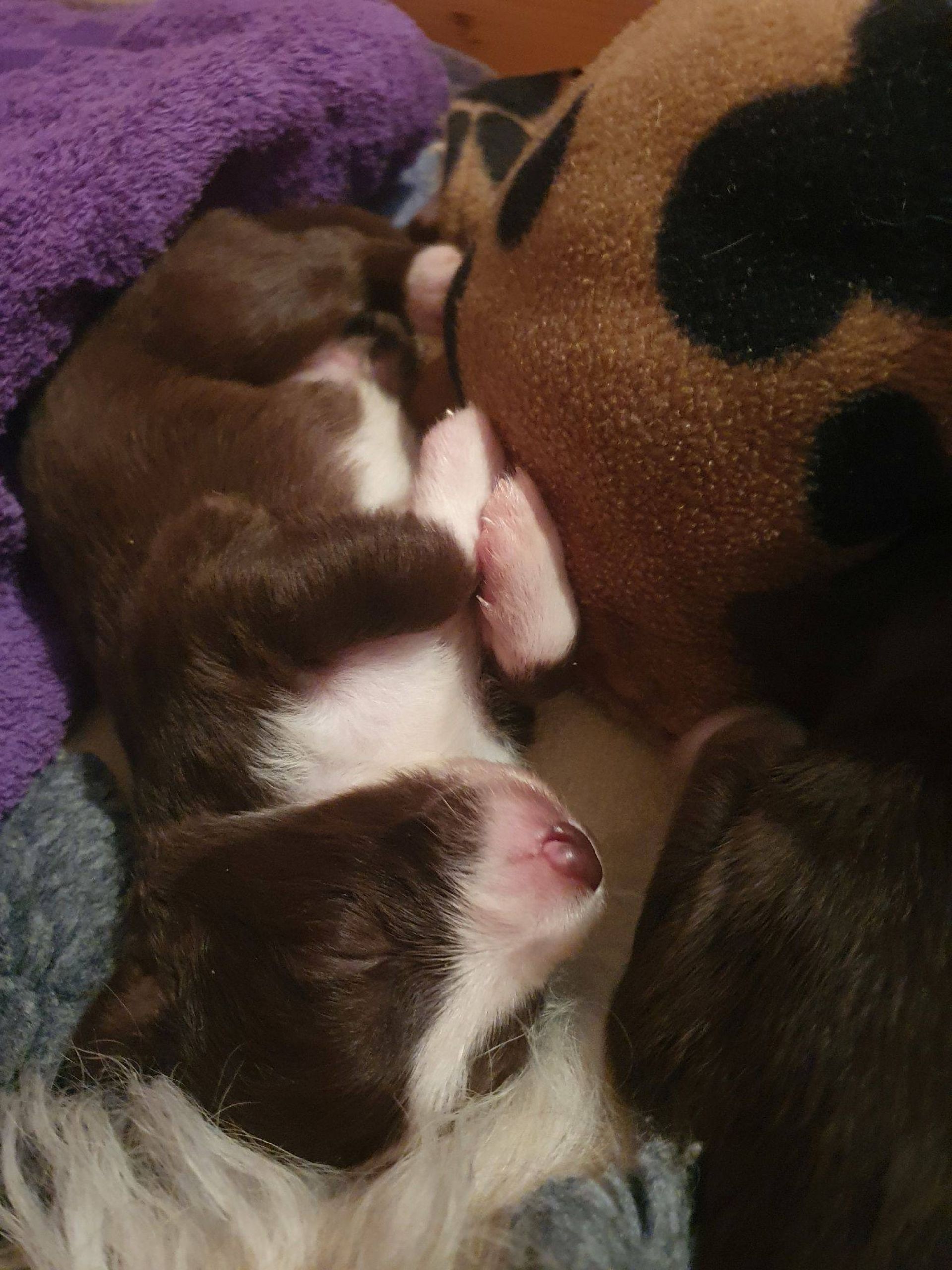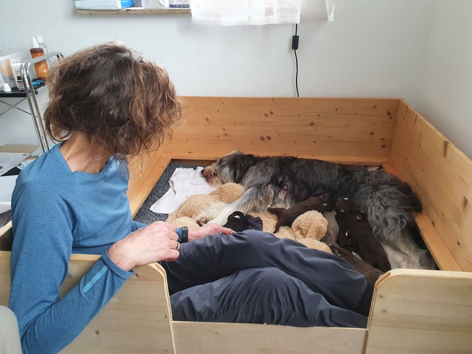 Blaze hält ihren 2-Stundenrythmus bei, liegt jetzt aber nach dem Säugen und Putzen außerhalb der Wurfbox. Tagsüber geht sie wieder mit ins Büro, dann erinnere ich sie, dass es wieder Zeit für die Babies ist. Nachts ist es andersrum, da weckt sie mich :-) Man kann die Uhr danach stellen.