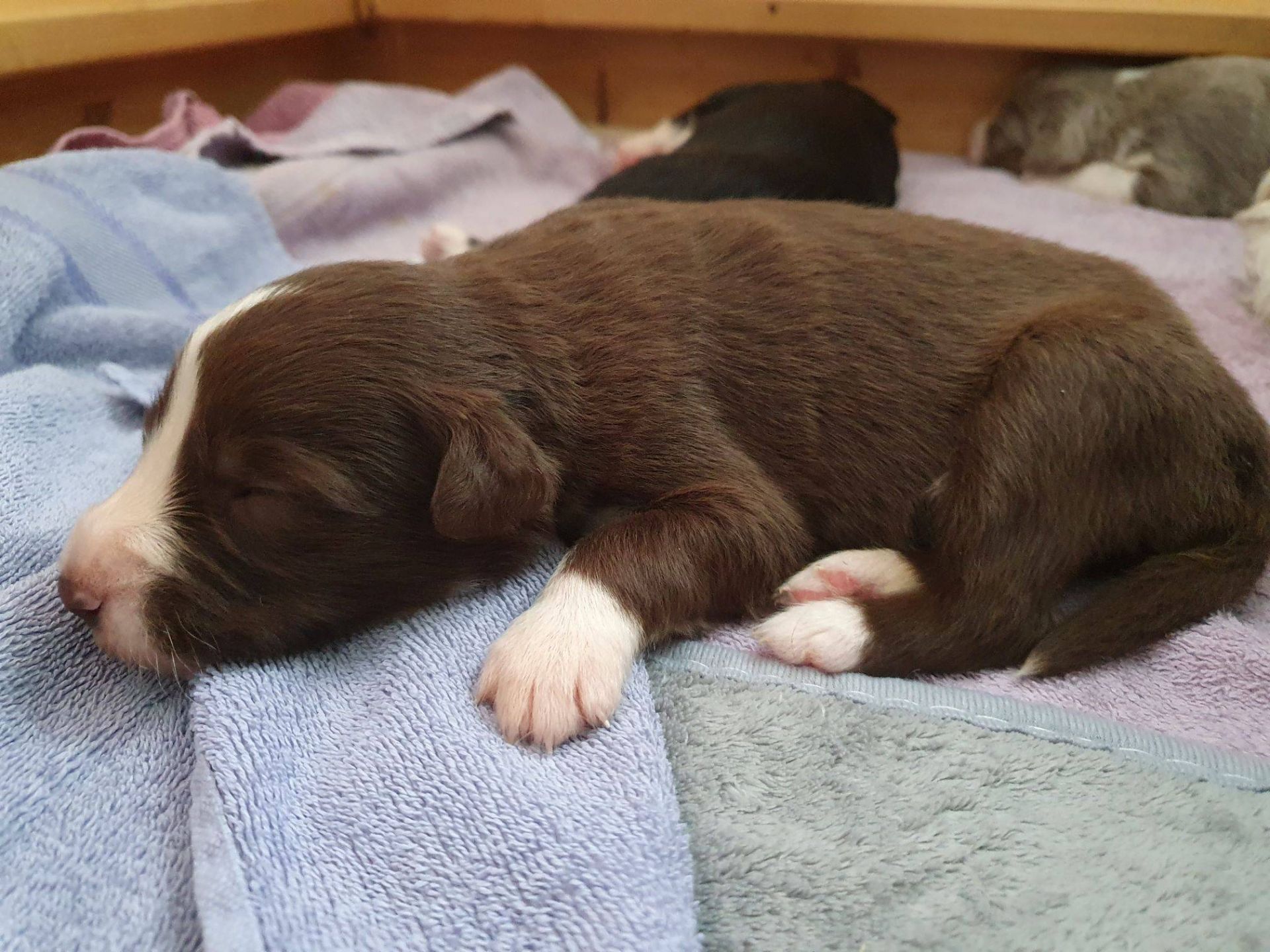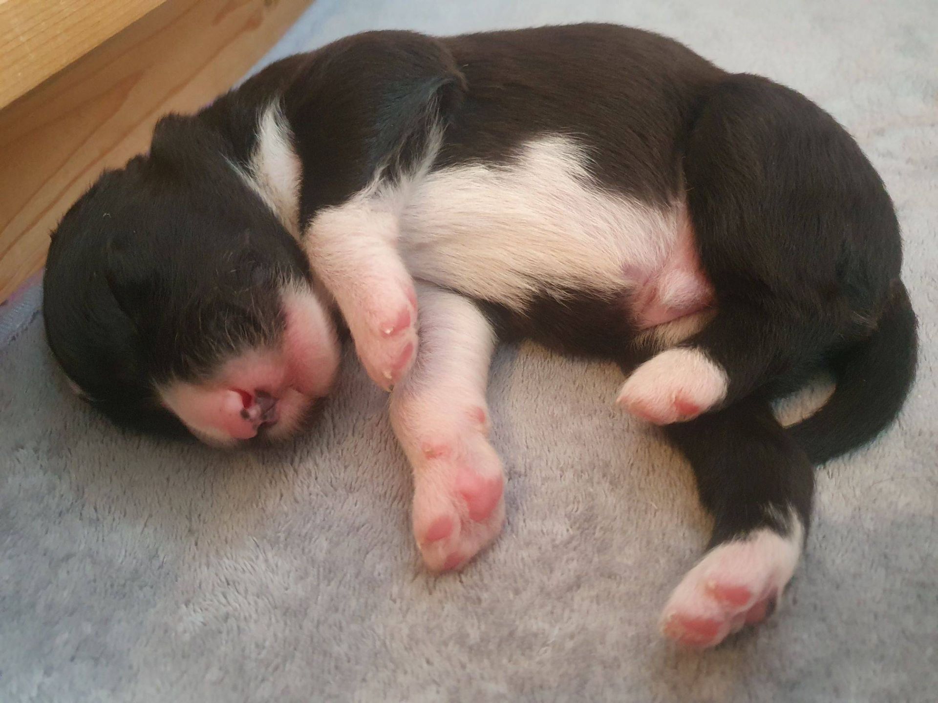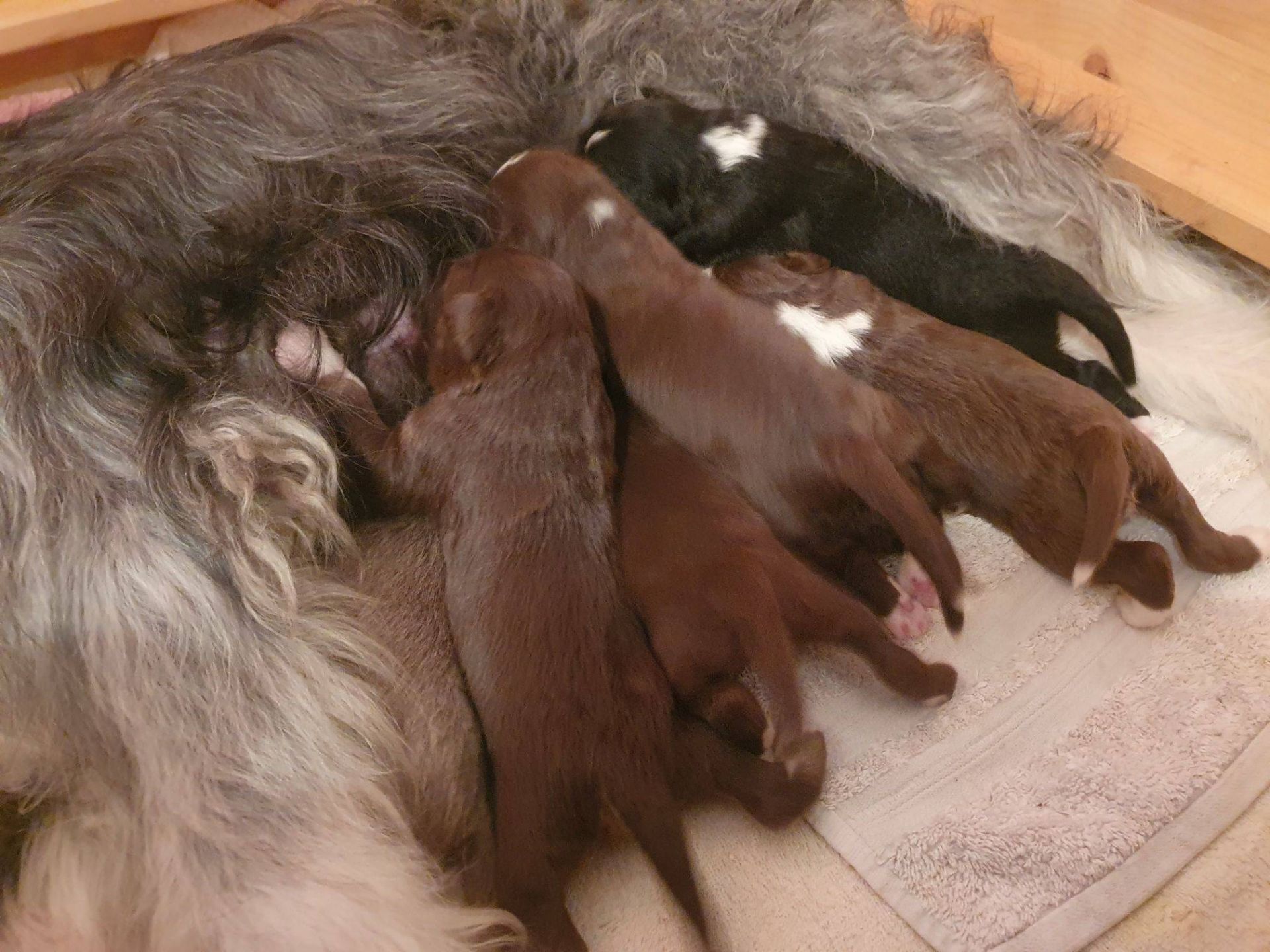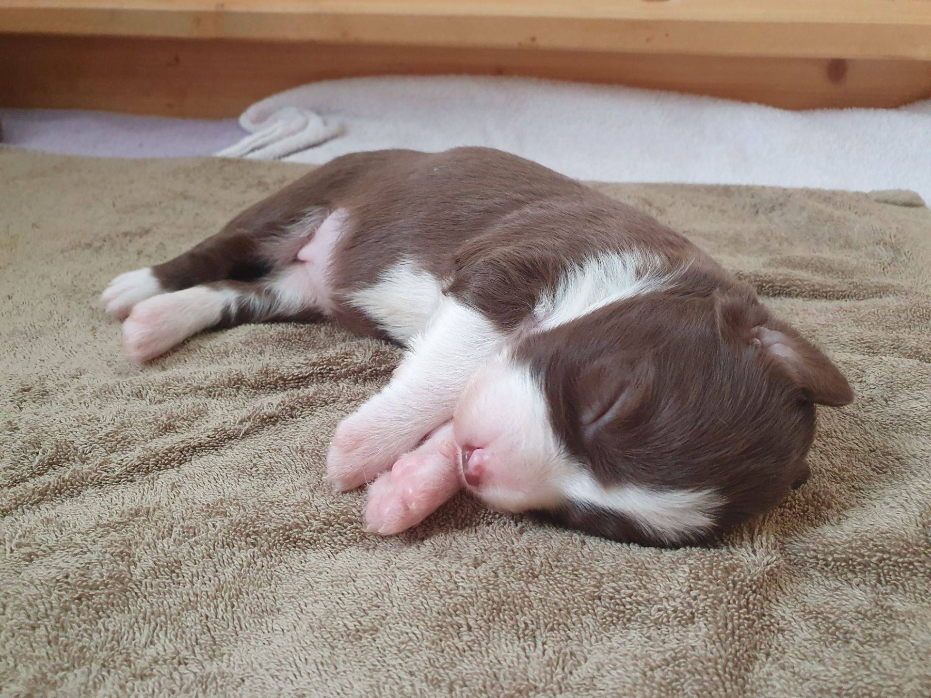 Blaze hält ihren 2-Stundenrythmus bei, liegt jetzt aber nach dem Säugen und Putzen außerhalb der Wurfbox. Tagsüber geht sie wieder mit ins Büro, dann erinnere ich sie, dass es wieder Zeit für die Babies ist. Nachts ist es andersrum, da weckt sie mich :-) Man kann die Uhr danach stellen.