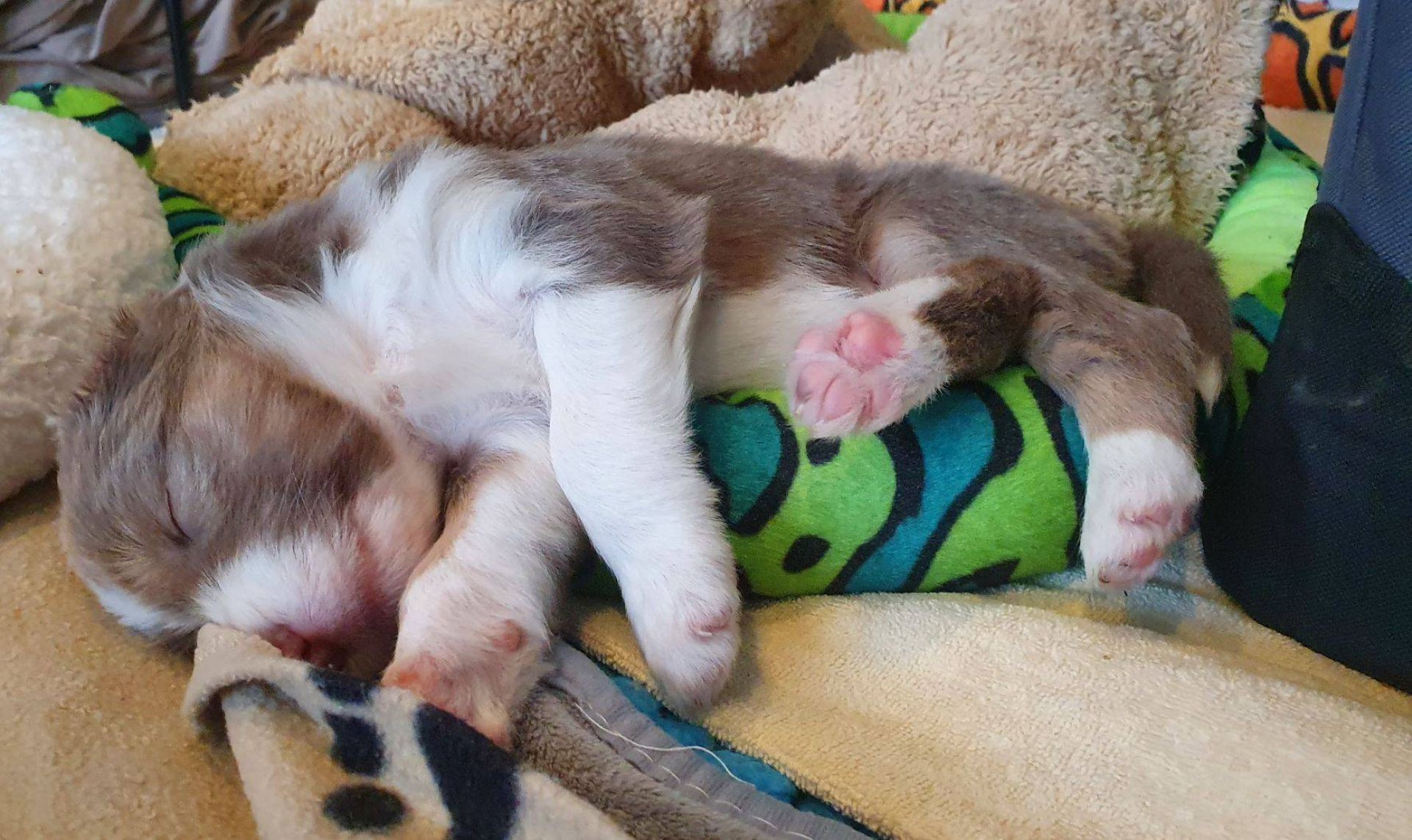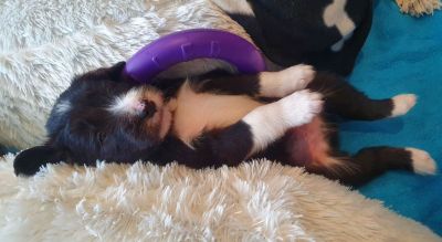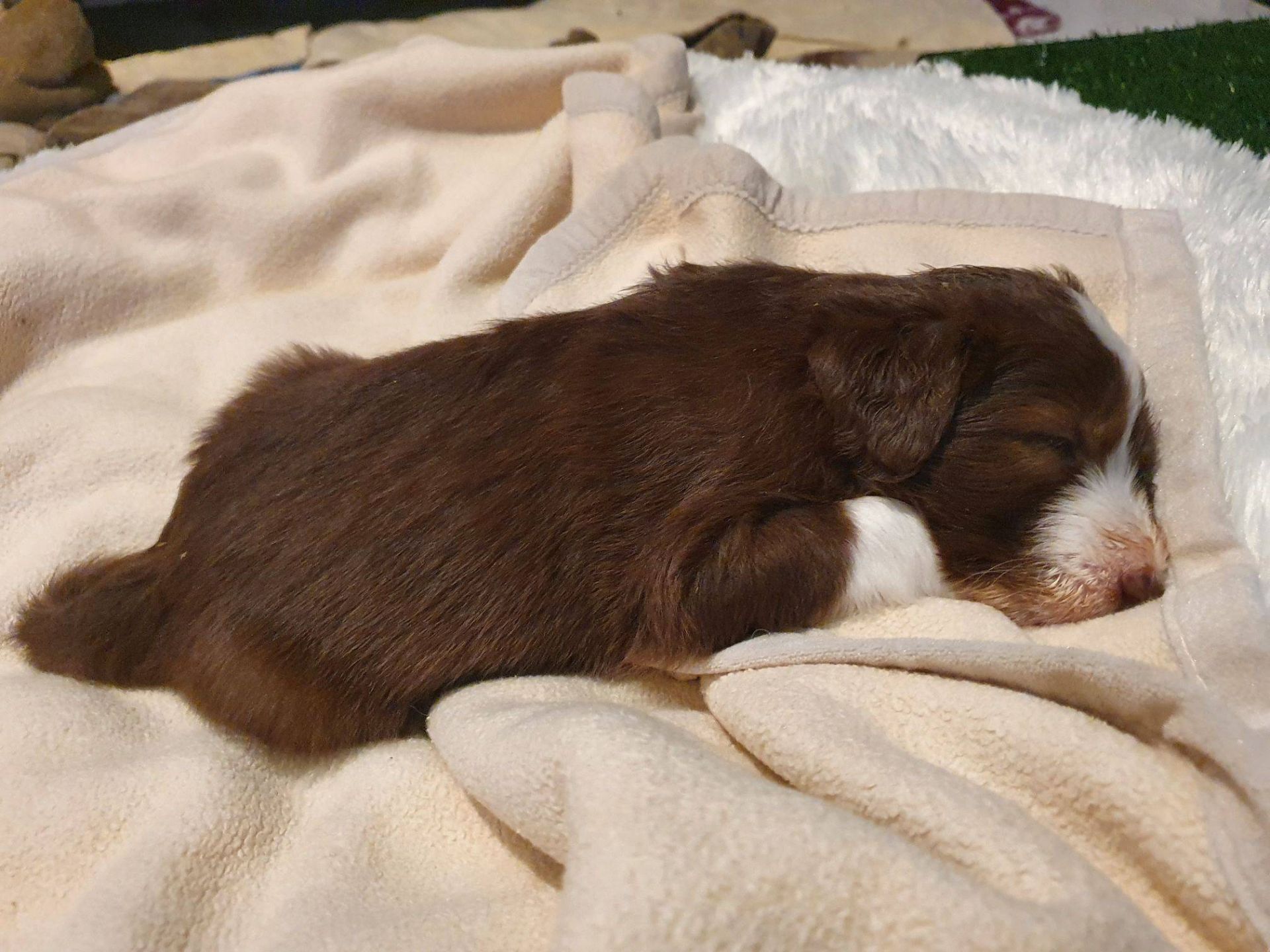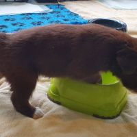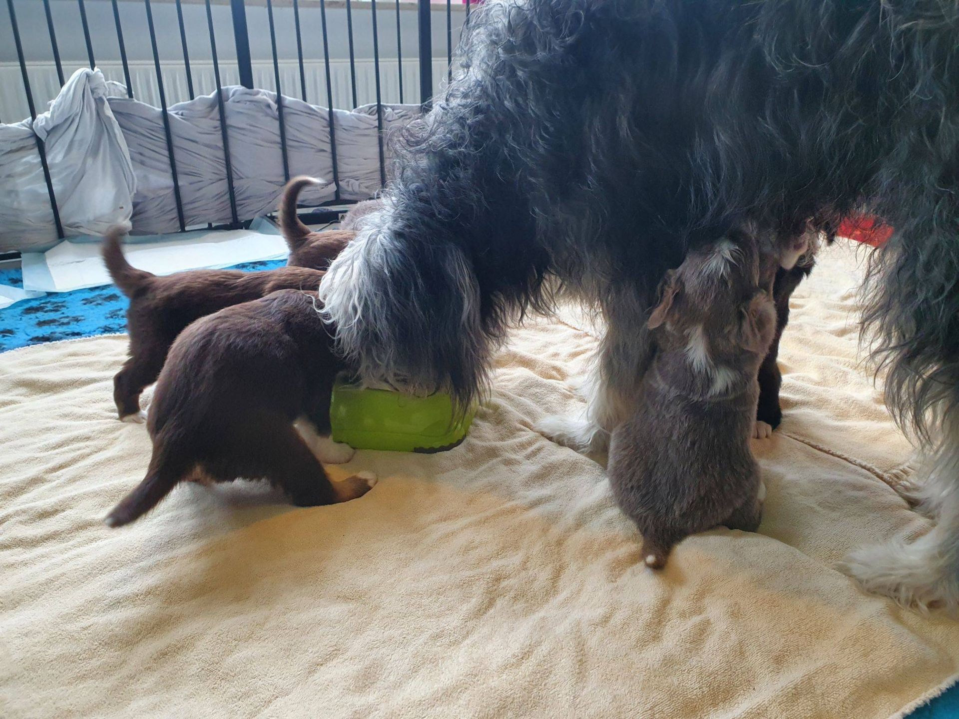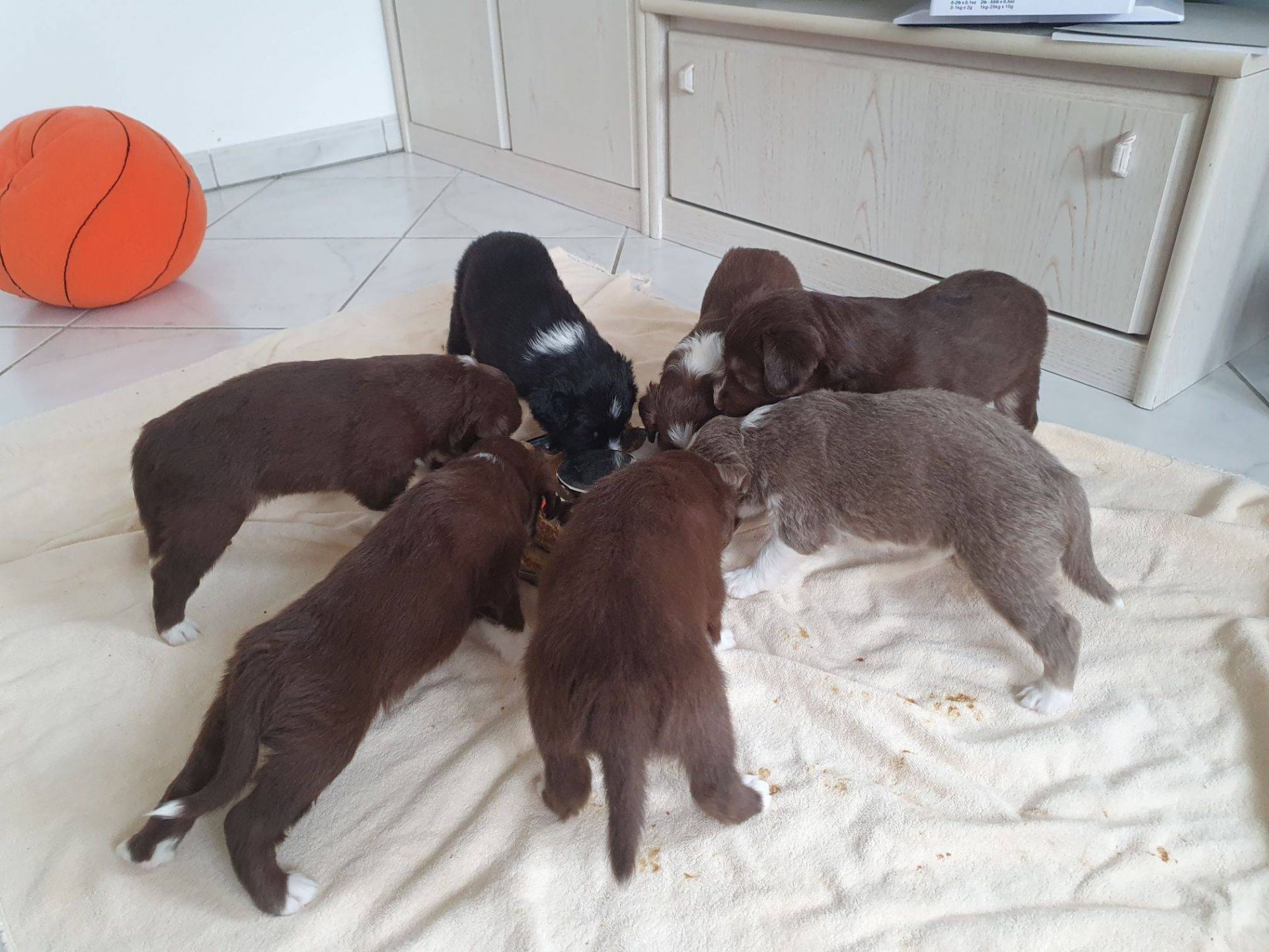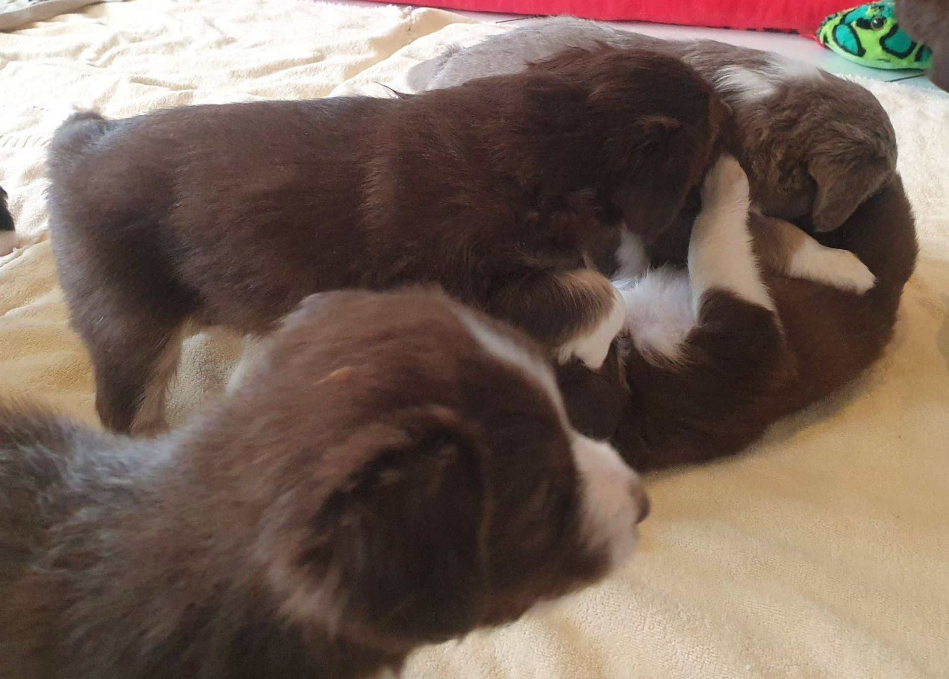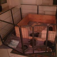 Die Babies schlafen nach wie vor im Welpenzimmer. Da Blaze nachts nicht mehr säugt, bekommen sie ihre letzte Mahlzeit gegen 21:30 Uhr mit anschließendem Nachtisch bei der Mama. Kurz darauf fallen sie in den Tiefschlaf. Wir tragen sie dann unter den wachsamen Augen der Mama in ihre Welpenkiste. So gewöhnen sie sich schon an einen Rhytmus und schlafen tatsächlich bis 06:00 Uhr morgens durch. Und ich kann in Ruhe das Schlachtfeld im Auslauf putzen :-)