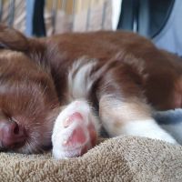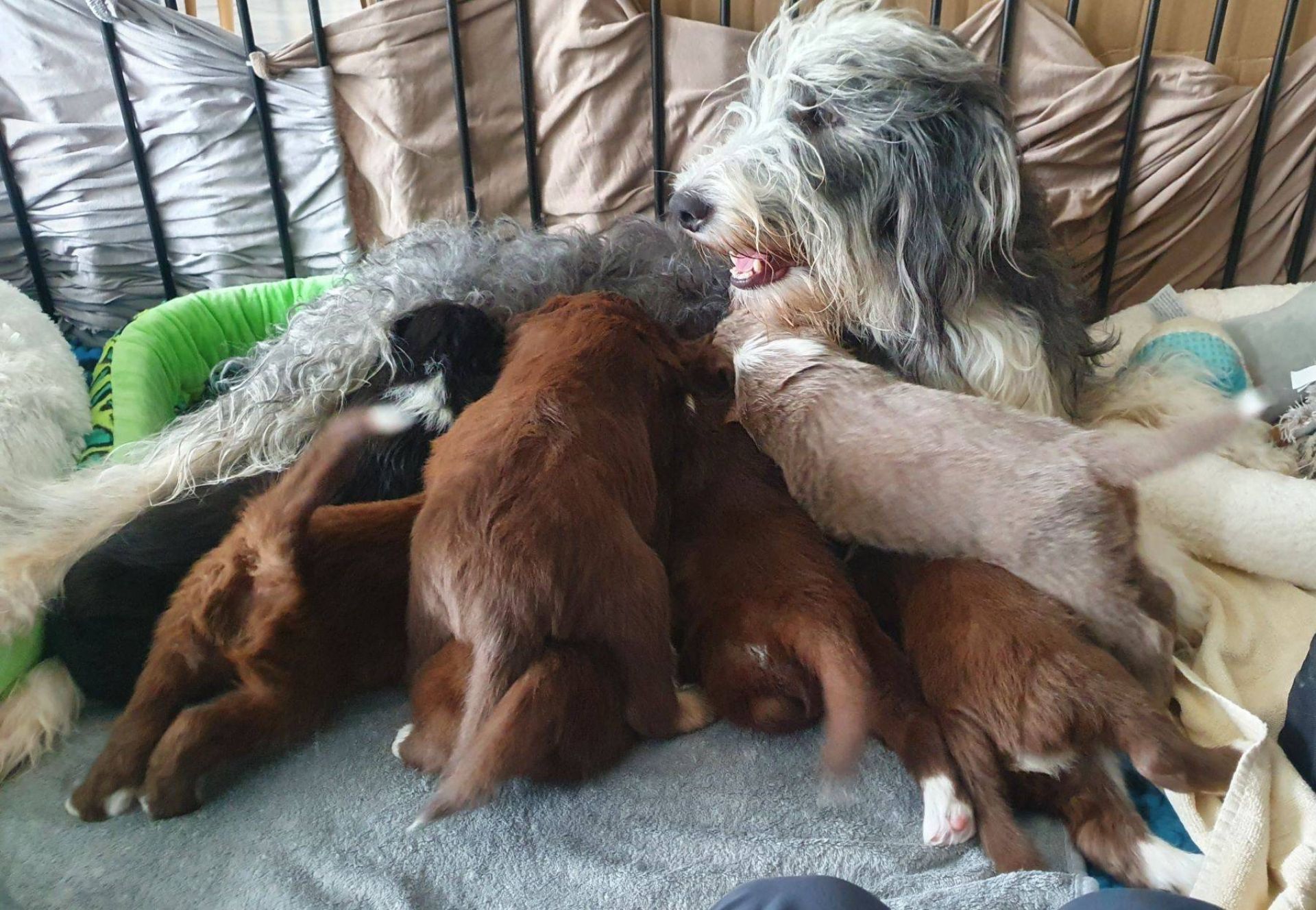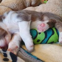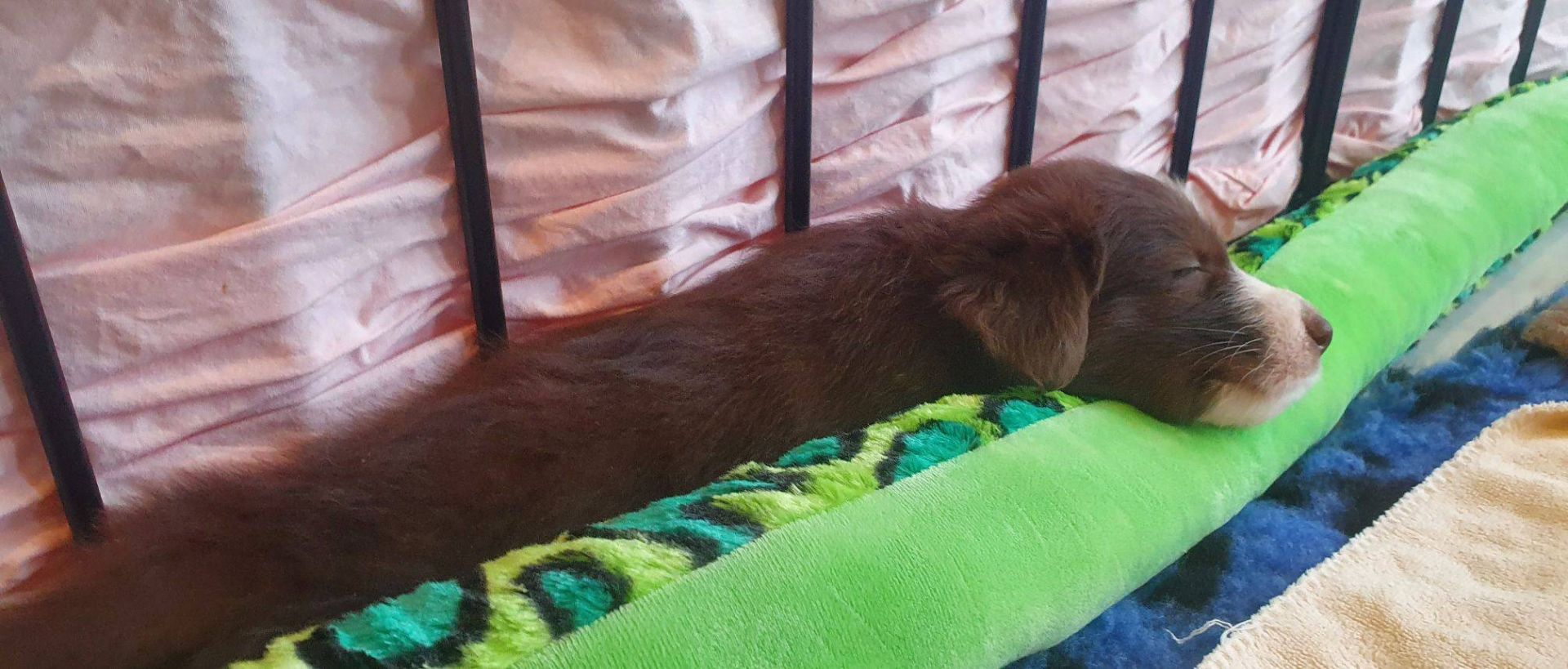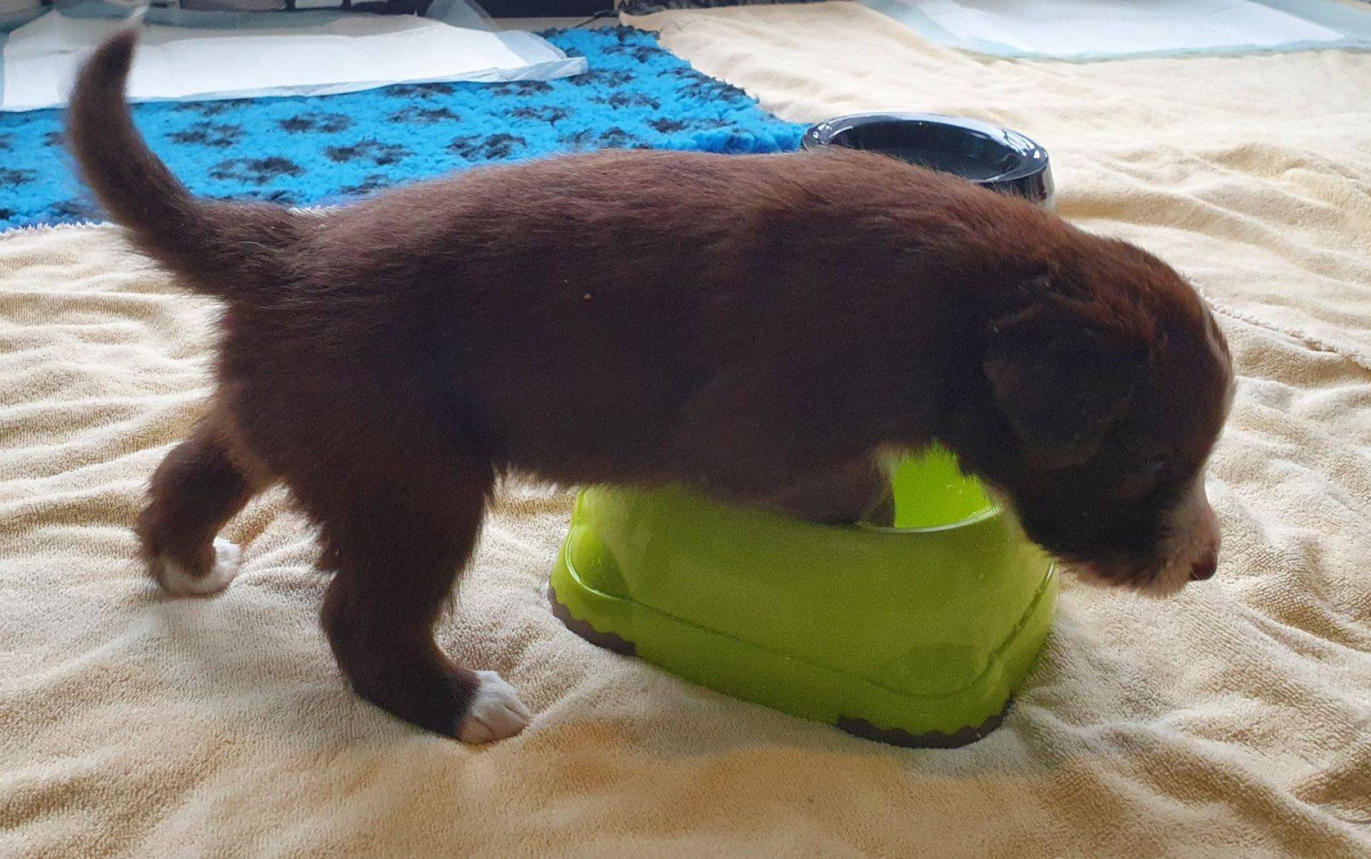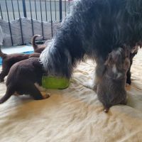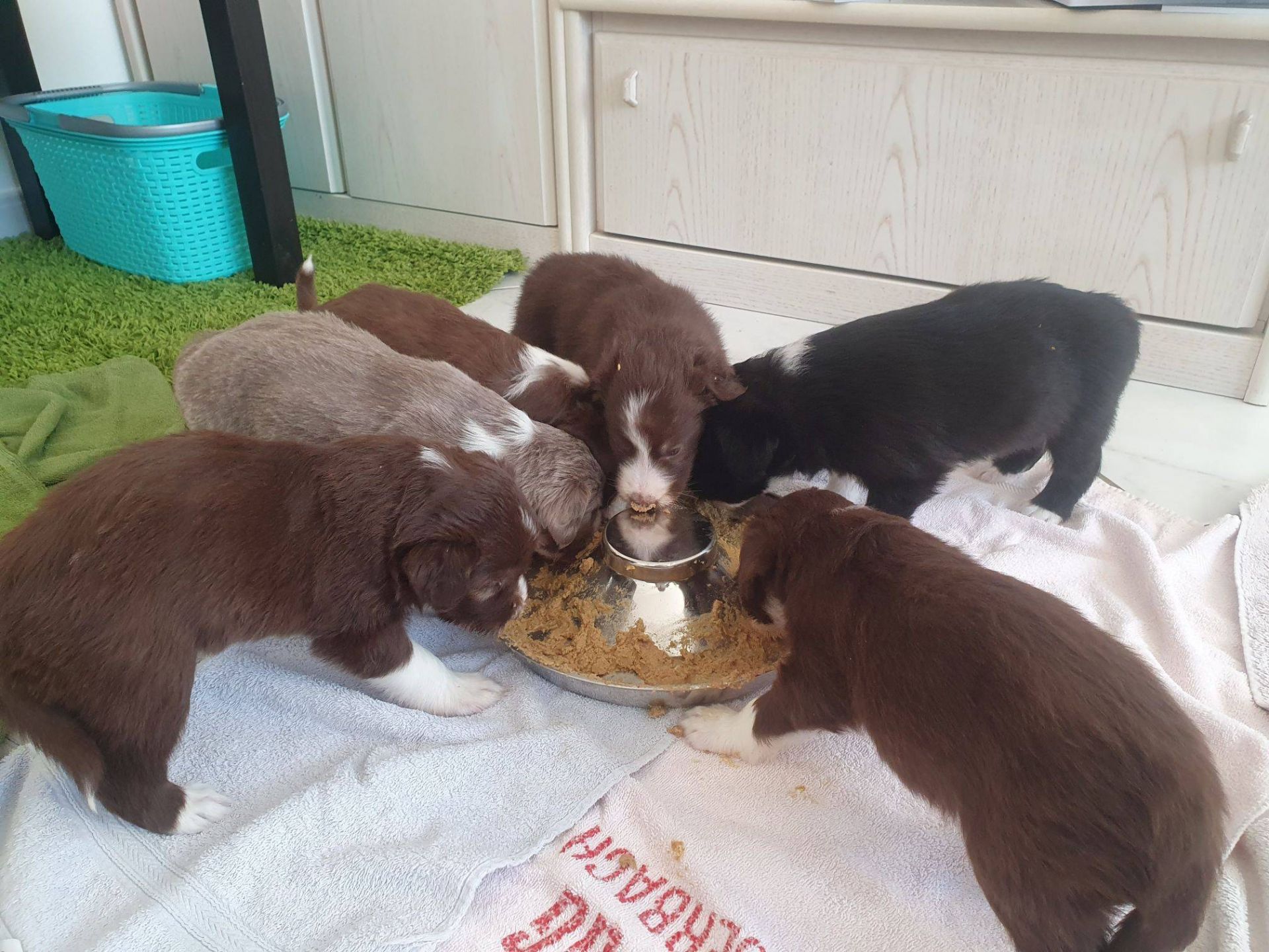 Die Babies schlafen nach wie vor im Welpenzimmer. Da Blaze nachts nicht mehr säugt, bekommen sie ihre letzte Mahlzeit gegen 21:30 Uhr mit anschließendem Nachtisch bei der Mama. Kurz darauf fallen sie in den Tiefschlaf. Wir tragen sie dann unter den wachsamen Augen der Mama in ihre Welpenkiste. So gewöhnen sie sich schon an einen Rhytmus und schlafen tatsächlich bis 06:00 Uhr morgens durch. Und ich kann in Ruhe das Schlachtfeld im Auslauf putzen :-)