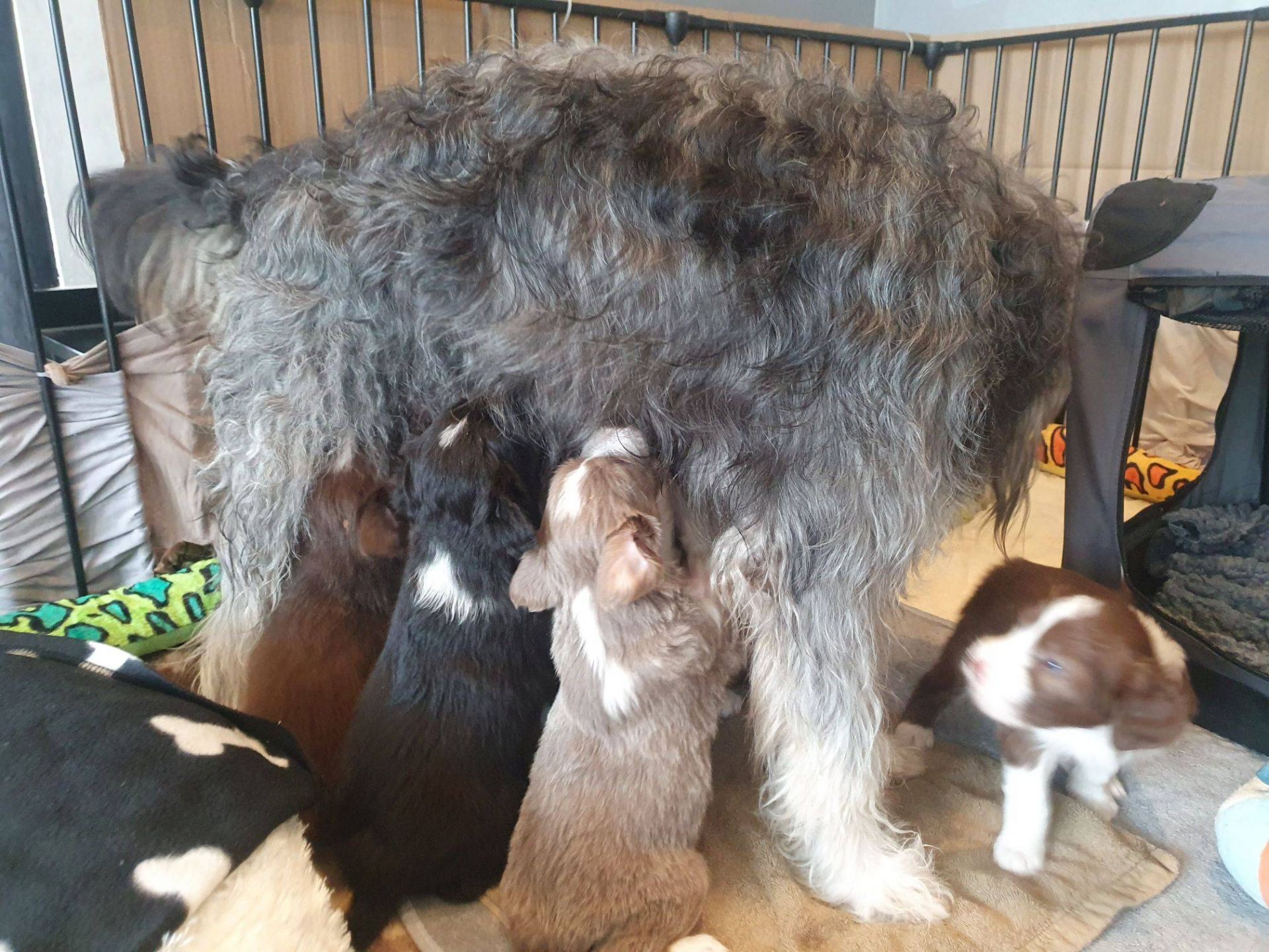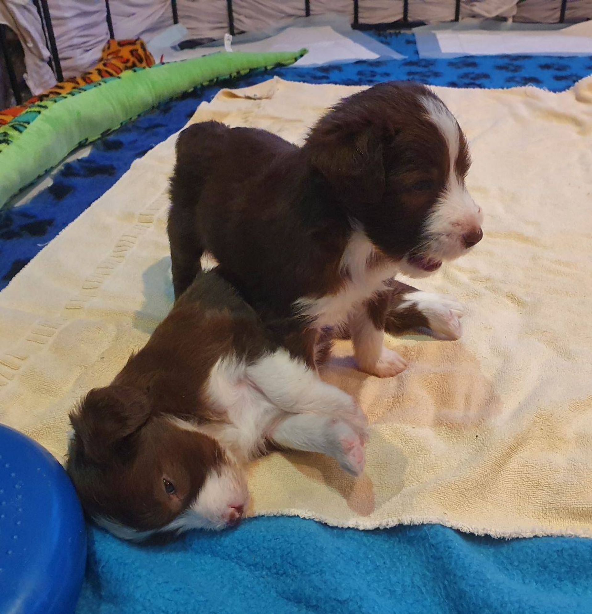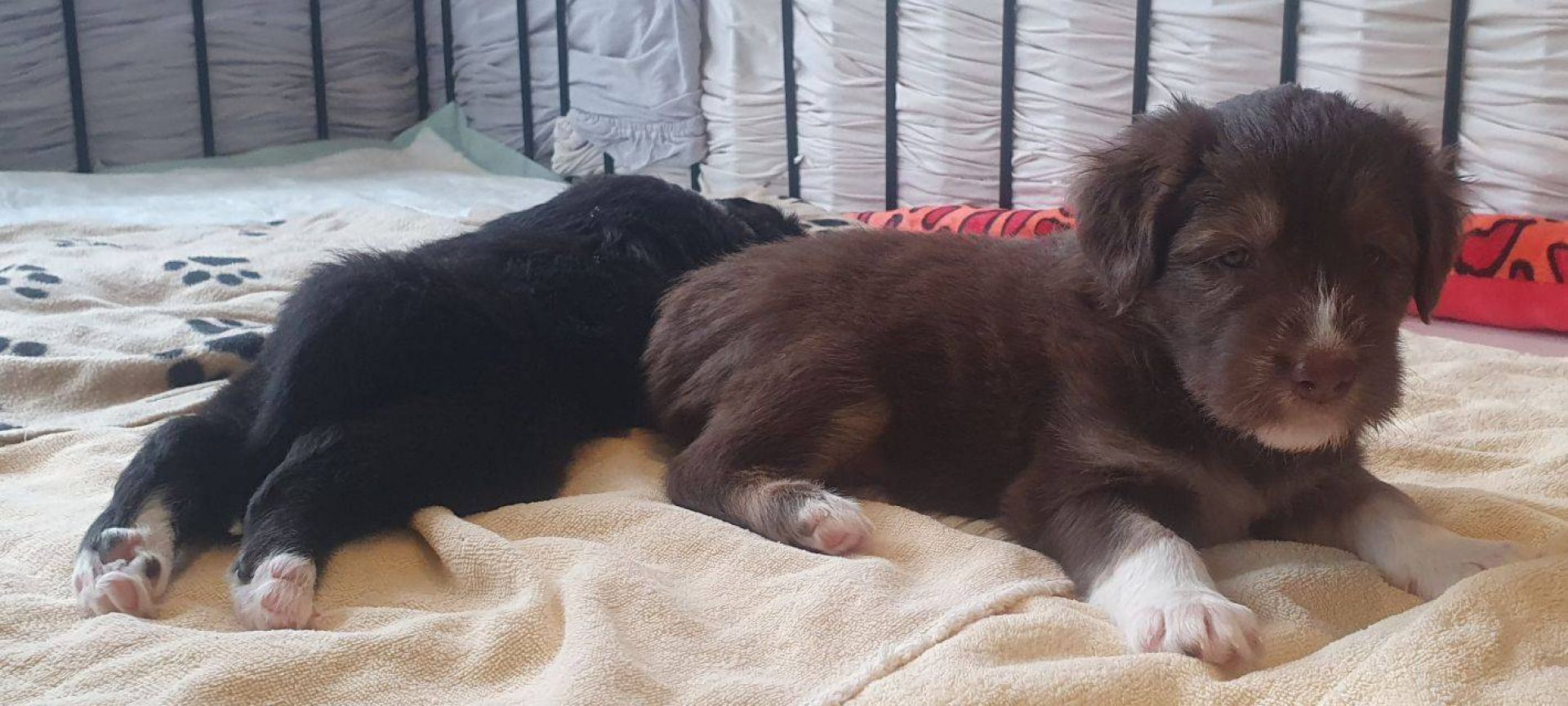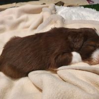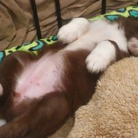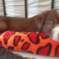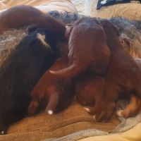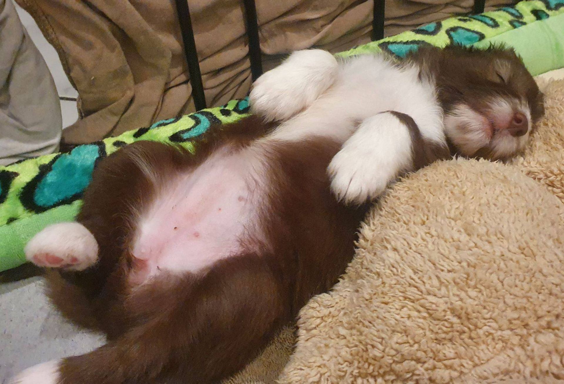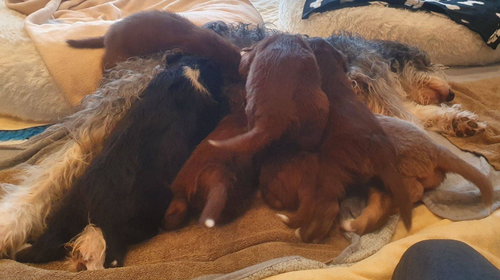 Die Babies schlafen nach wie vor im Welpenzimmer. Da Blaze nachts nicht mehr säugt, bekommen sie ihre letzte Mahlzeit gegen 21:30 Uhr mit anschließendem Nachtisch bei der Mama. Kurz darauf fallen sie in den Tiefschlaf. Wir tragen sie dann unter den wachsamen Augen der Mama in ihre Welpenkiste. So gewöhnen sie sich schon an einen Rhytmus und schlafen tatsächlich bis 06:00 Uhr morgens durch. Und ich kann in Ruhe das Schlachtfeld im Auslauf putzen :-)