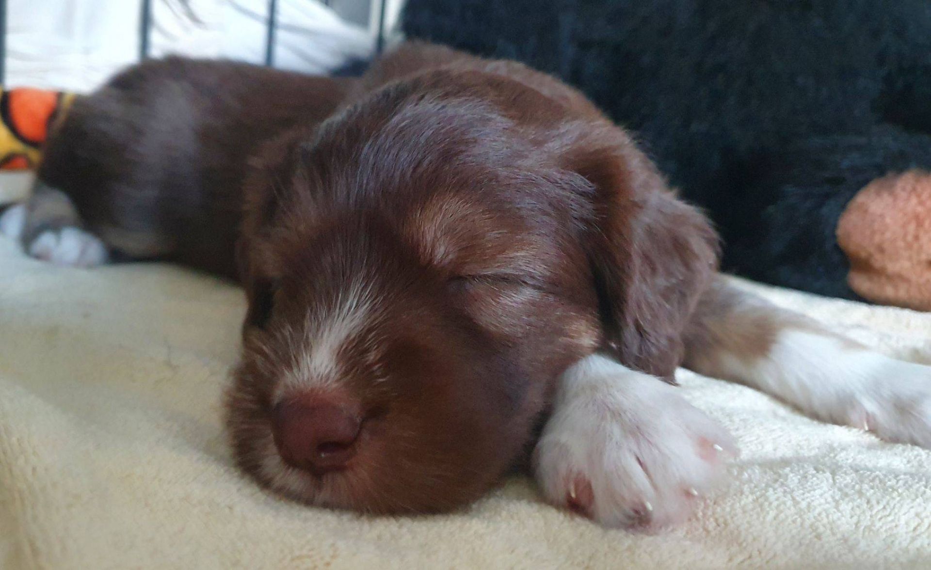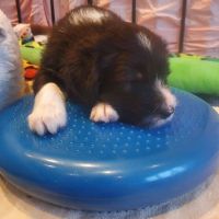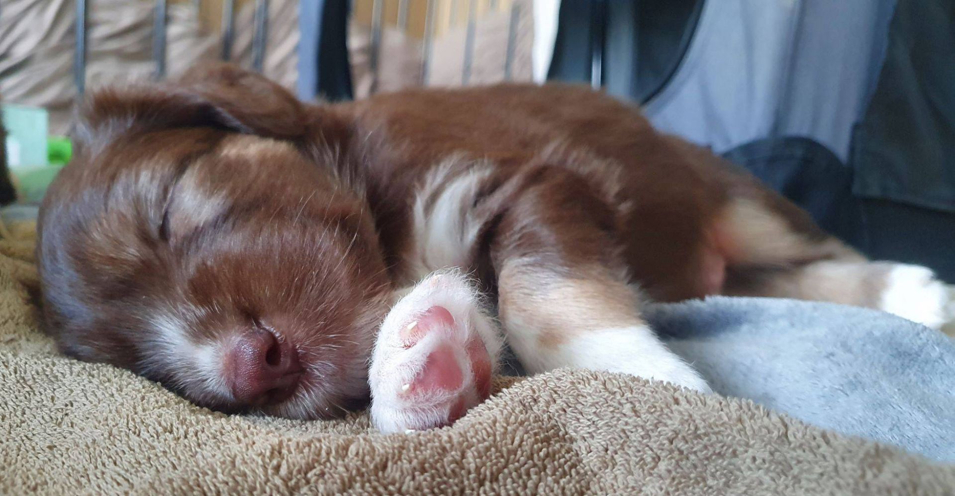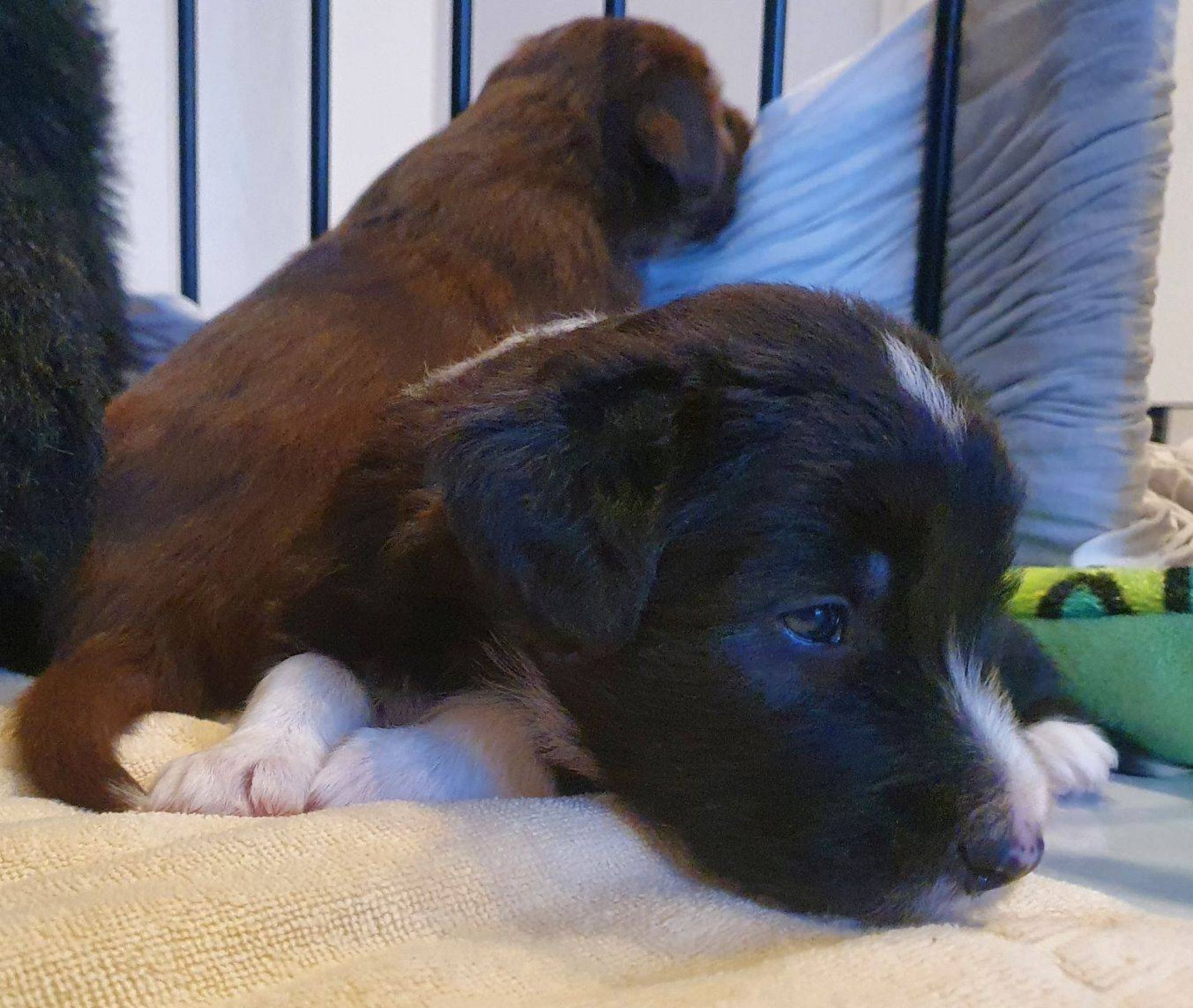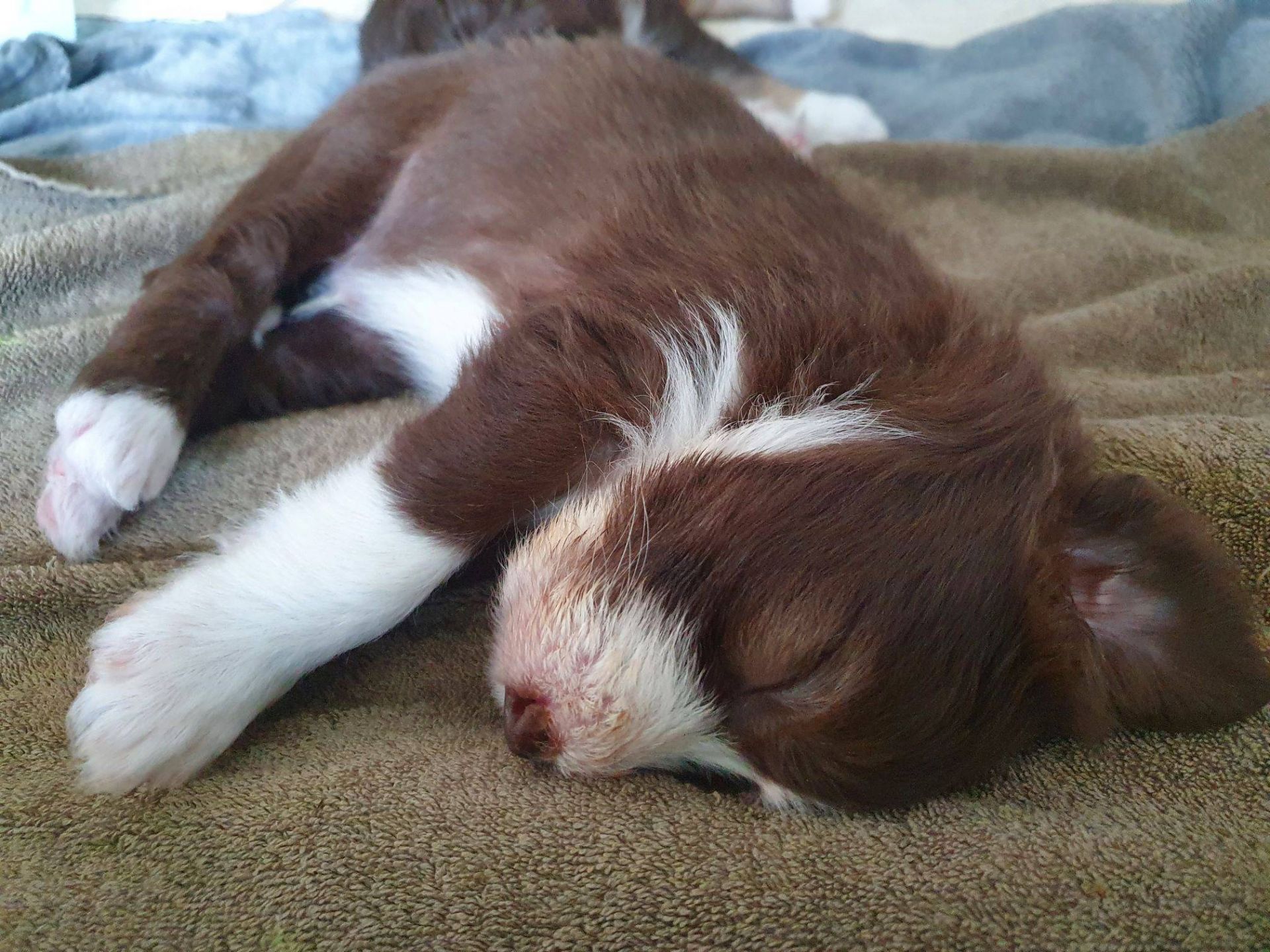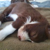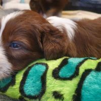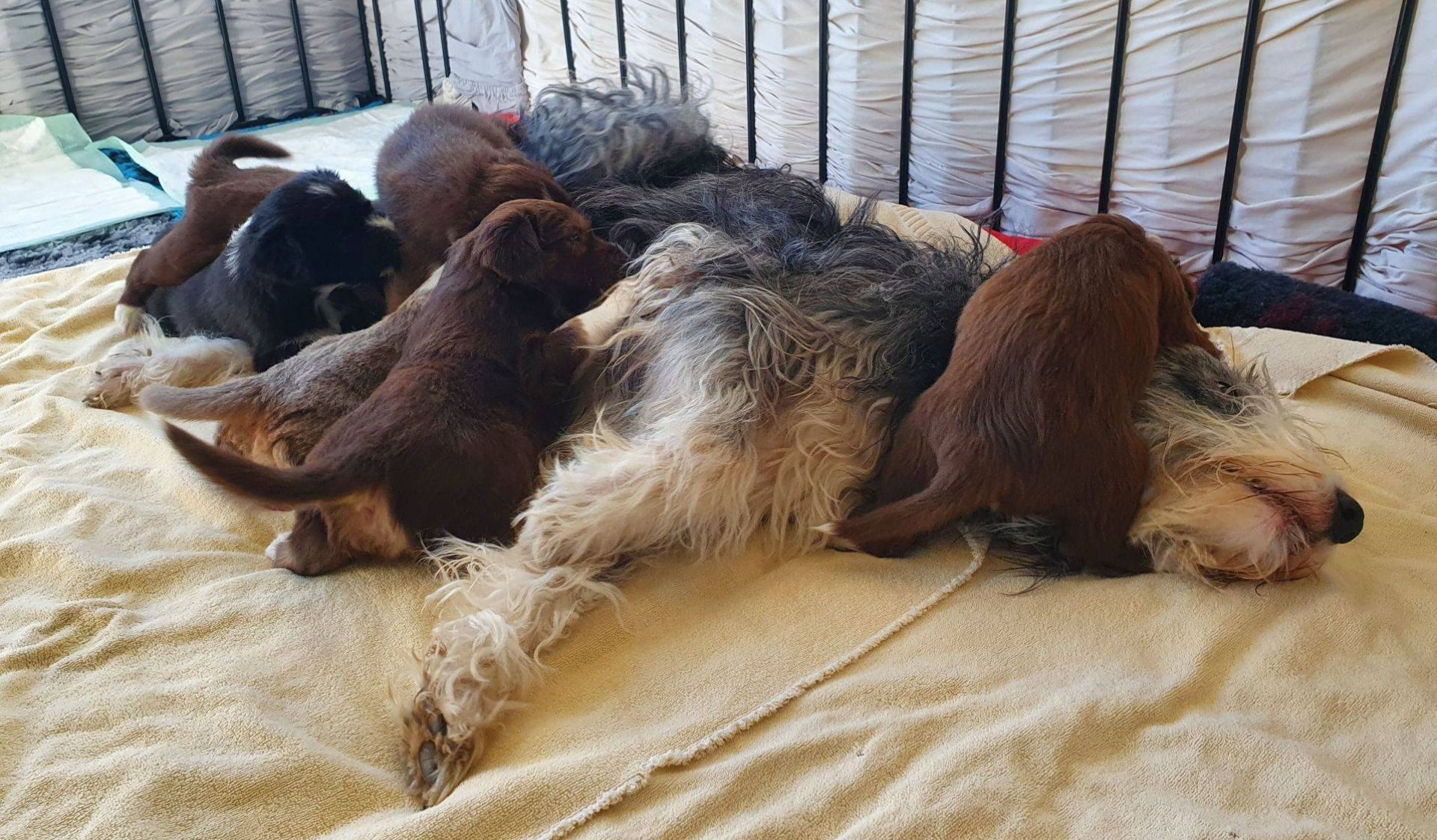 Die Babies schlafen nach wie vor im Welpenzimmer. Da Blaze nachts nicht mehr säugt, bekommen sie ihre letzte Mahlzeit gegen 21:30 Uhr mit anschließendem Nachtisch bei der Mama. Kurz darauf fallen sie in den Tiefschlaf. Wir tragen sie dann unter den wachsamen Augen der Mama in ihre Welpenkiste. So gewöhnen sie sich schon an einen Rhytmus und schlafen tatsächlich bis 06:00 Uhr morgens durch. Und ich kann in Ruhe das Schlachtfeld im Auslauf putzen :-)