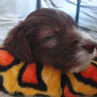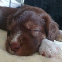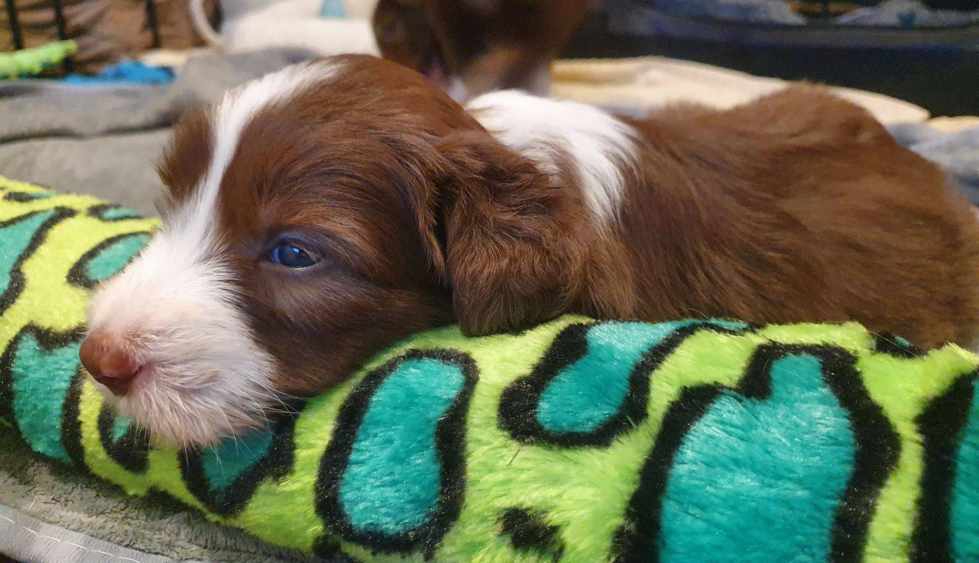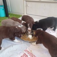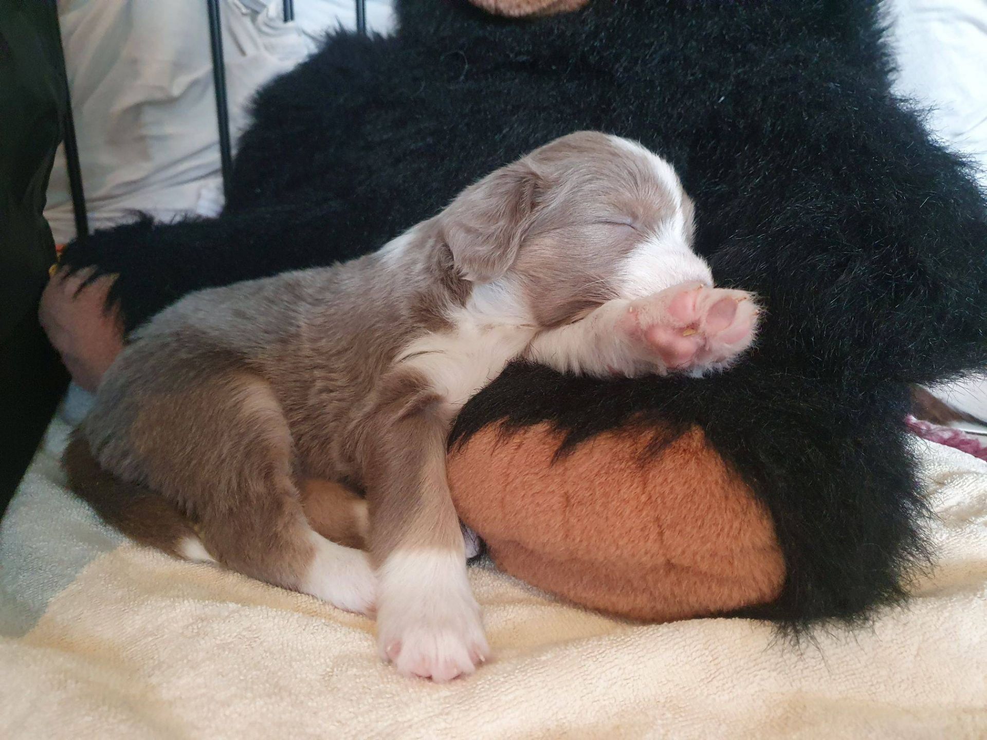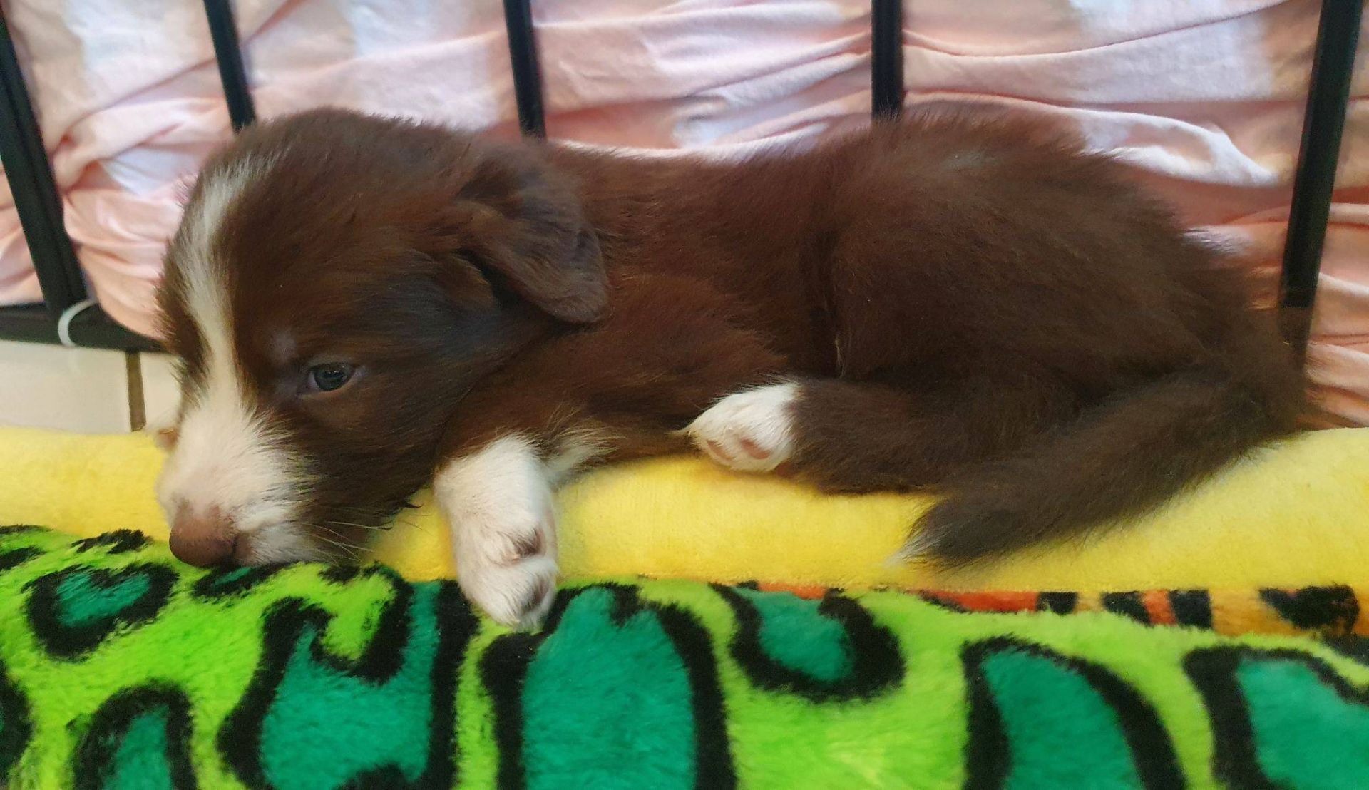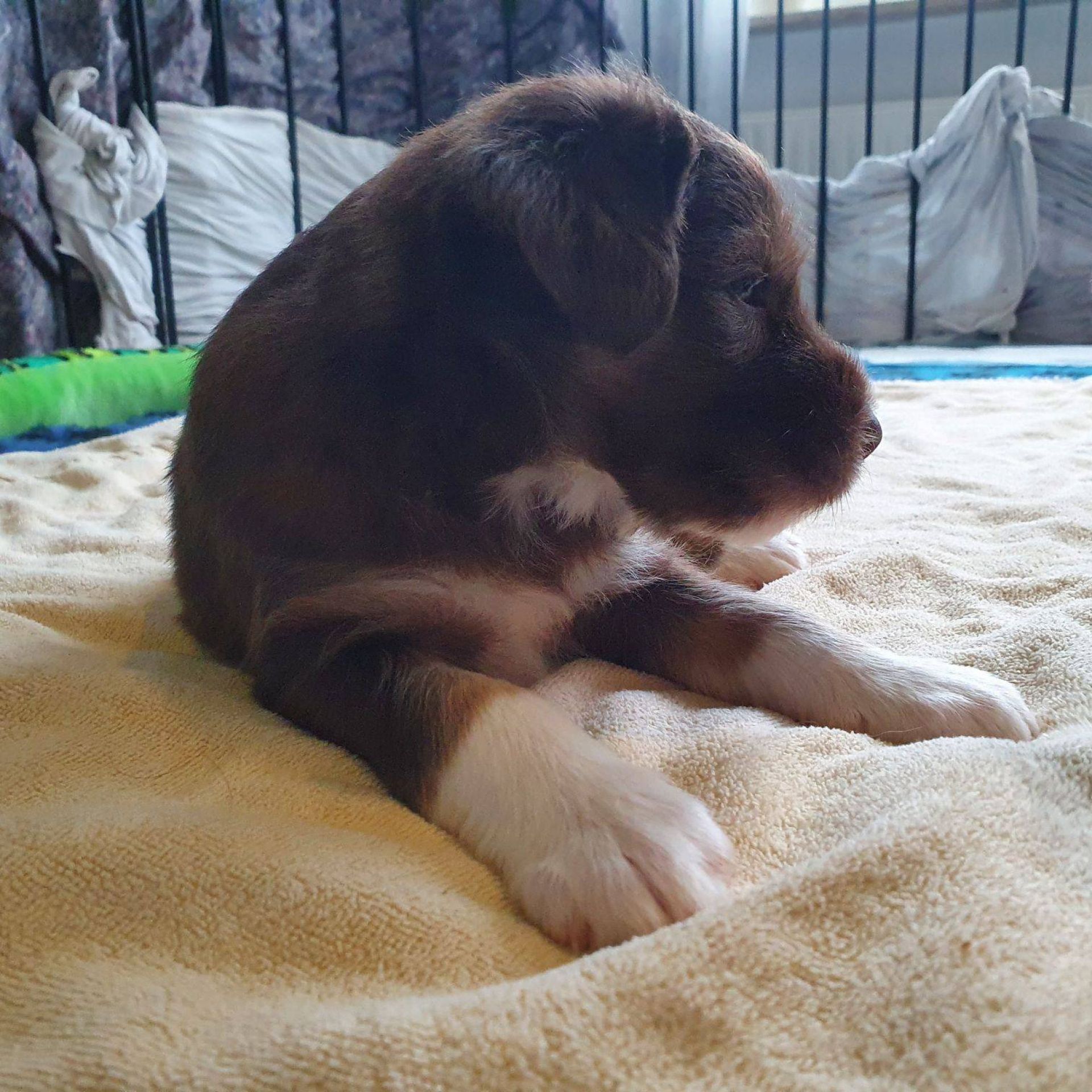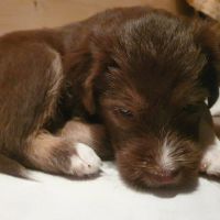 Die Babies schlafen nach wie vor im Welpenzimmer. Da Blaze nachts nicht mehr säugt, bekommen sie ihre letzte Mahlzeit gegen 21:30 Uhr mit anschließendem Nachtisch bei der Mama. Kurz darauf fallen sie in den Tiefschlaf. Wir tragen sie dann unter den wachsamen Augen der Mama in ihre Welpenkiste. So gewöhnen sie sich schon an einen Rhytmus und schlafen tatsächlich bis 06:00 Uhr morgens durch. Und ich kann in Ruhe das Schlachtfeld im Auslauf putzen :-)