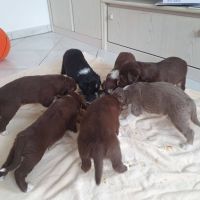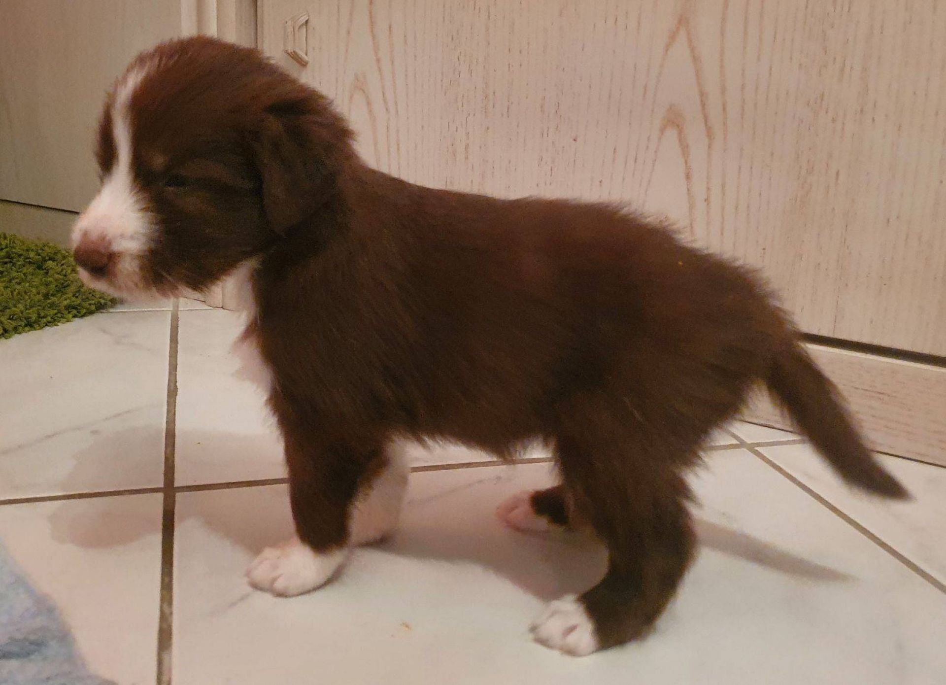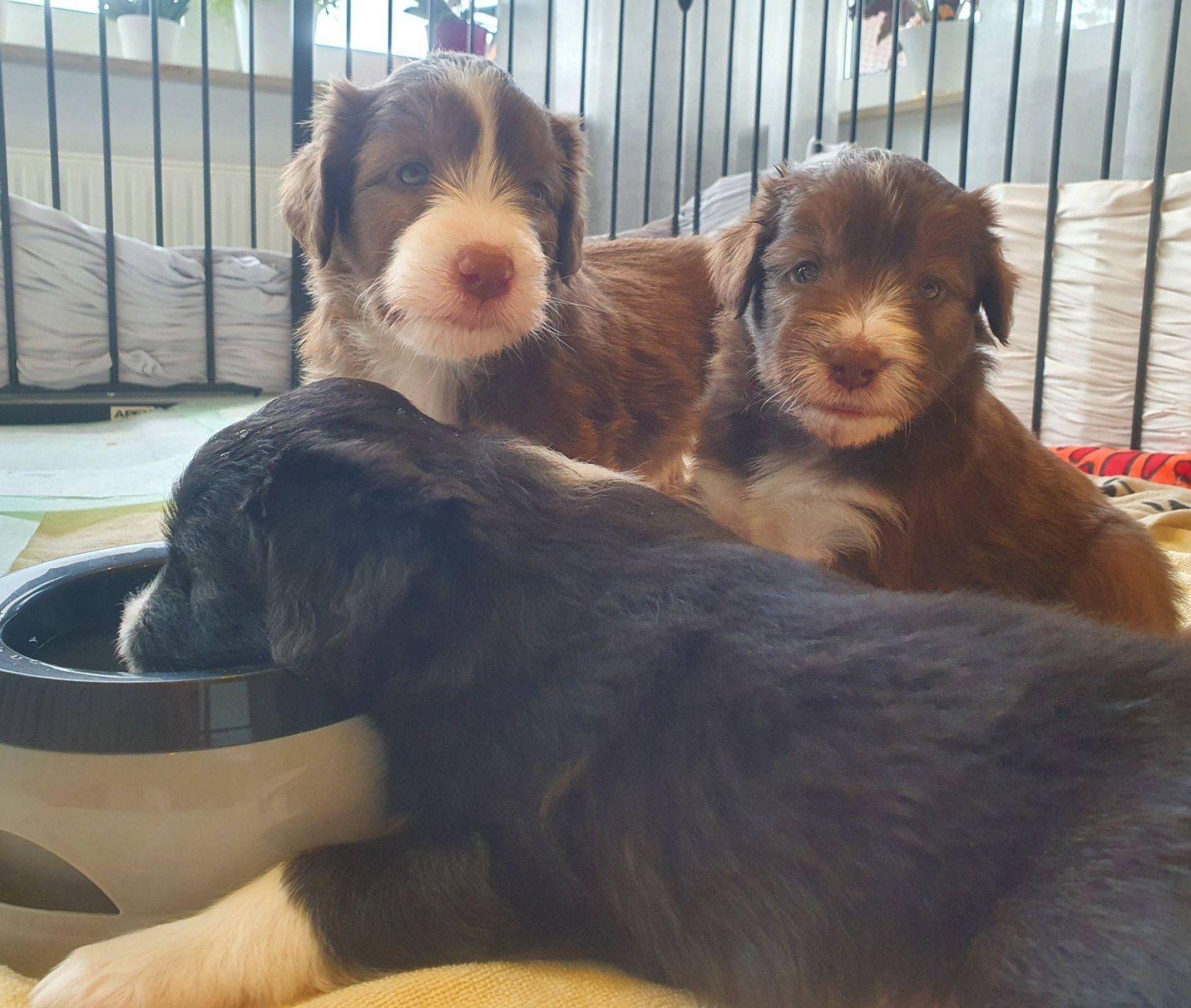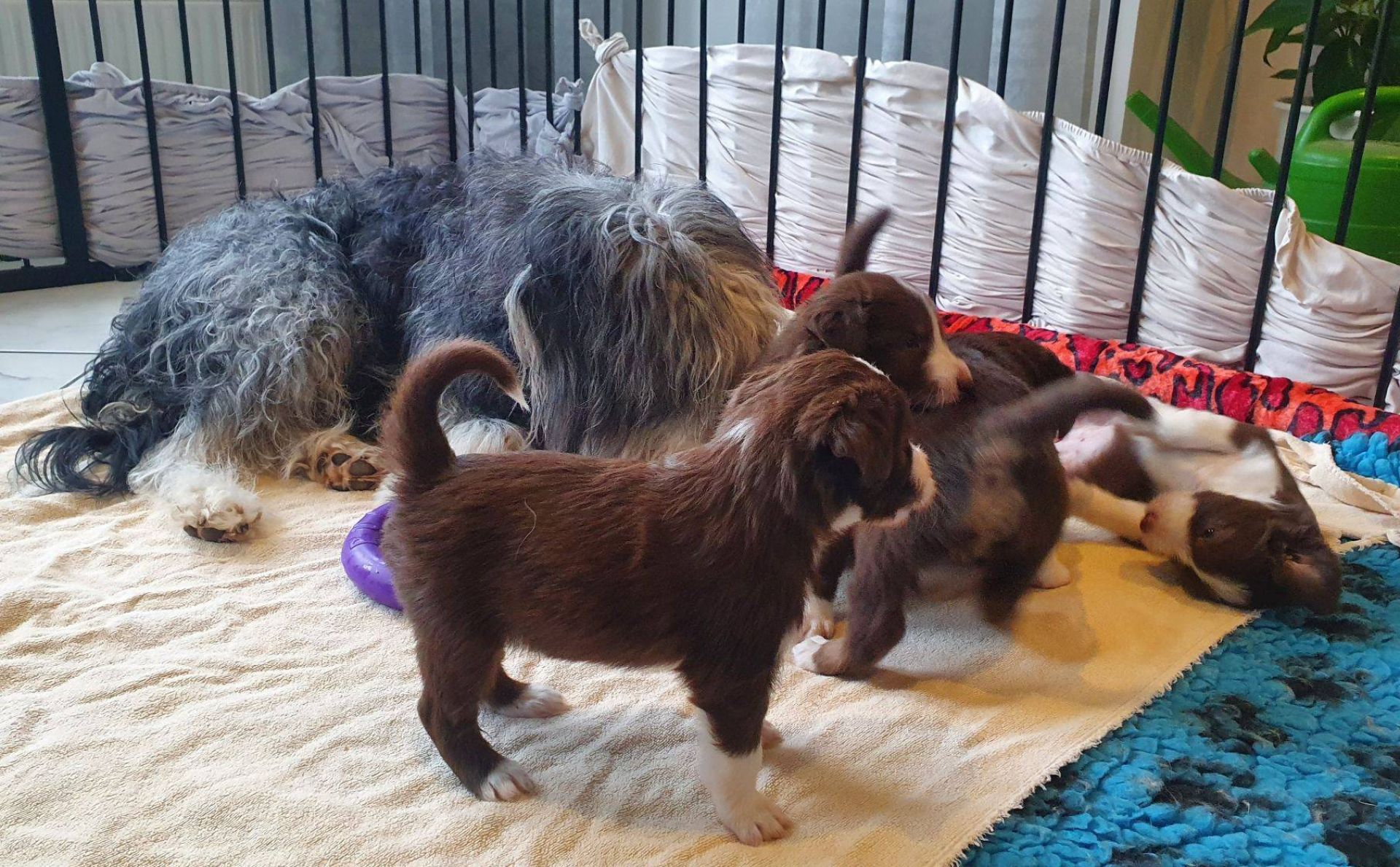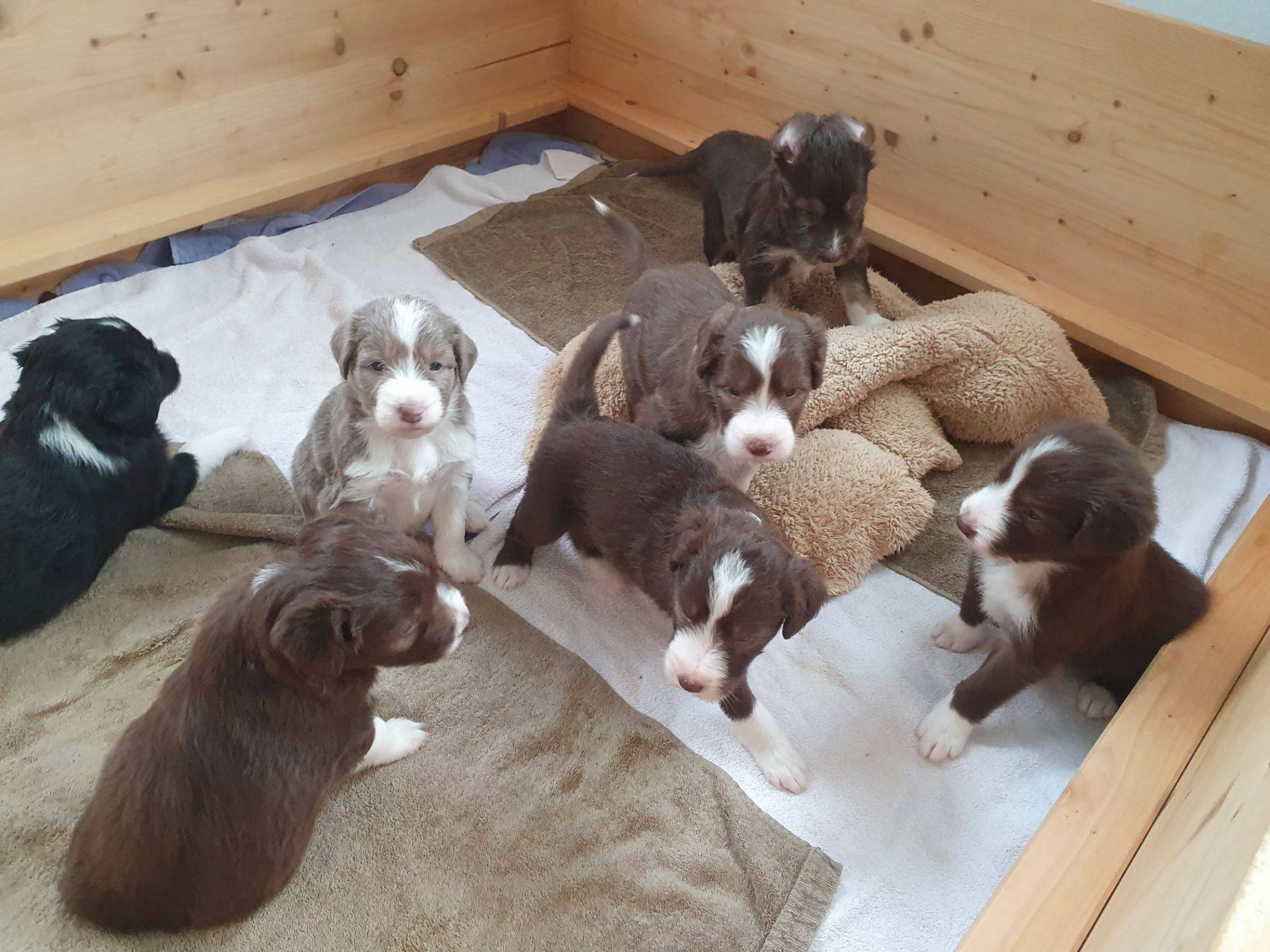 Die Babies haben ihre erste Schritte aus dem Welpenzimmer in den Auslauf gewagt. Seither haben wir sie rübergetragen. Sie blieben erst mal skeptisch an der Türe stehen, haben sich dann aber so nach und nach getraut. Das ist aber auch eine lange Strecke.