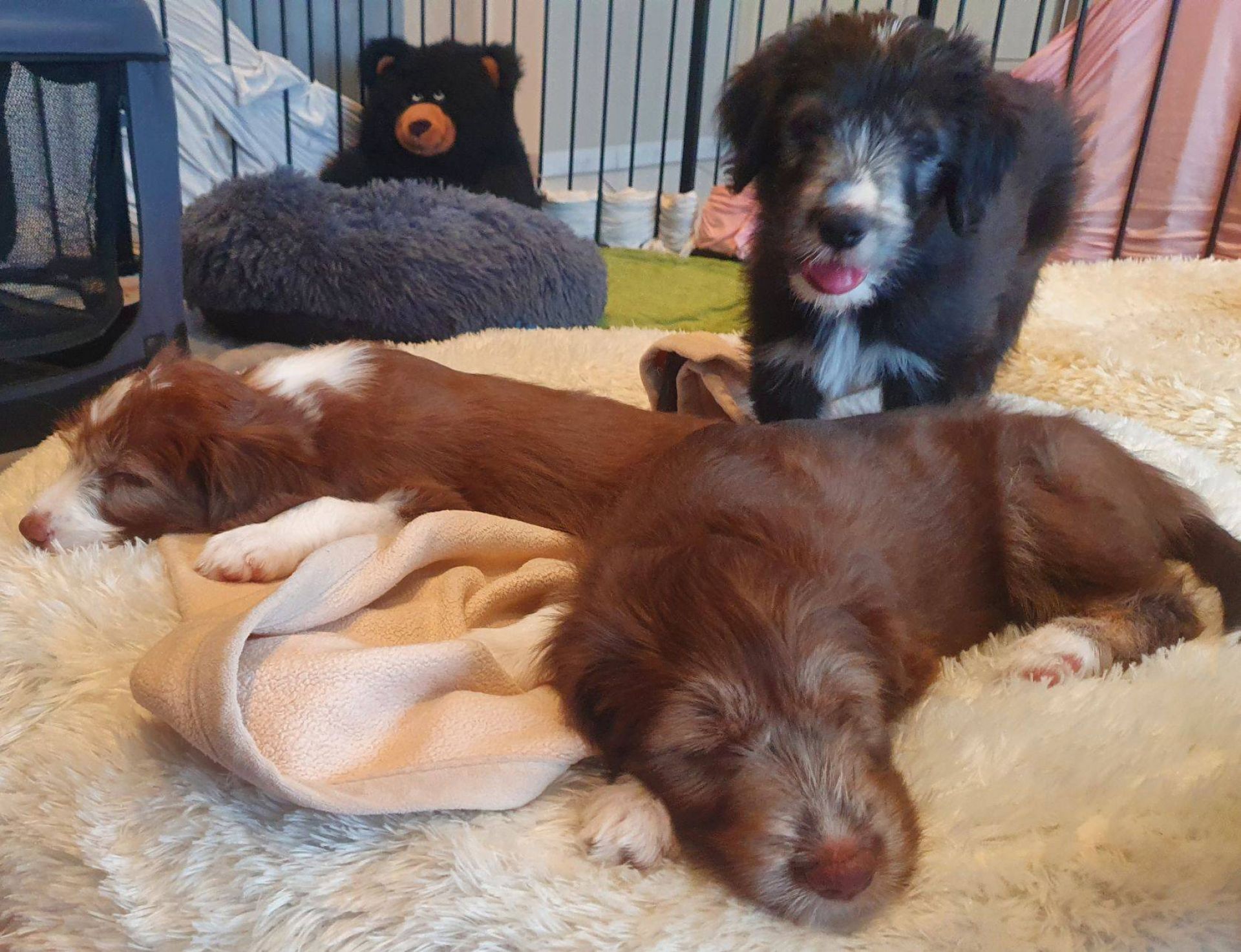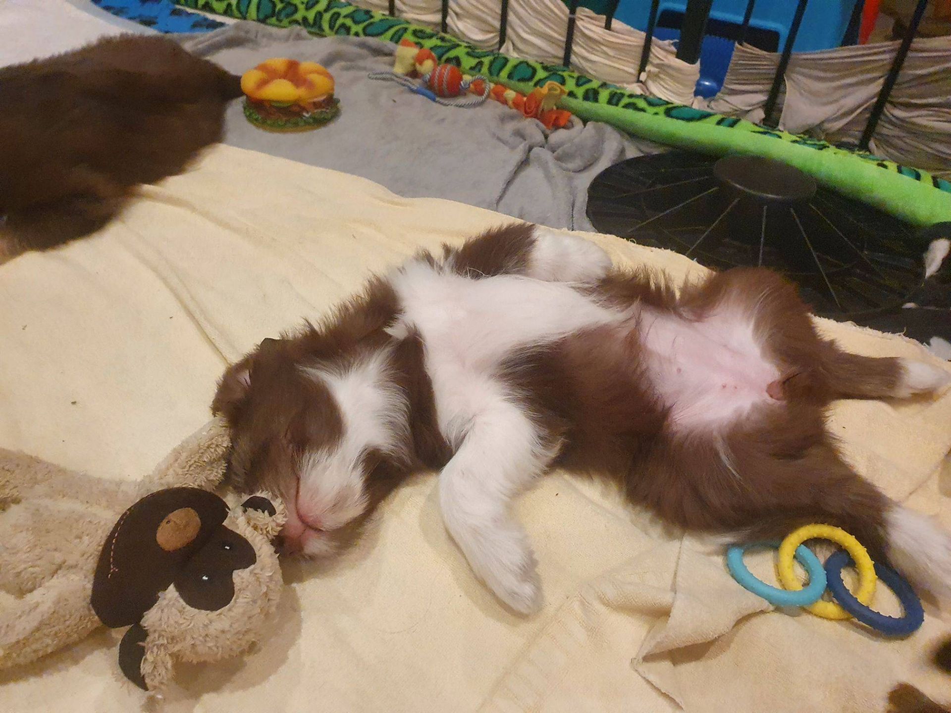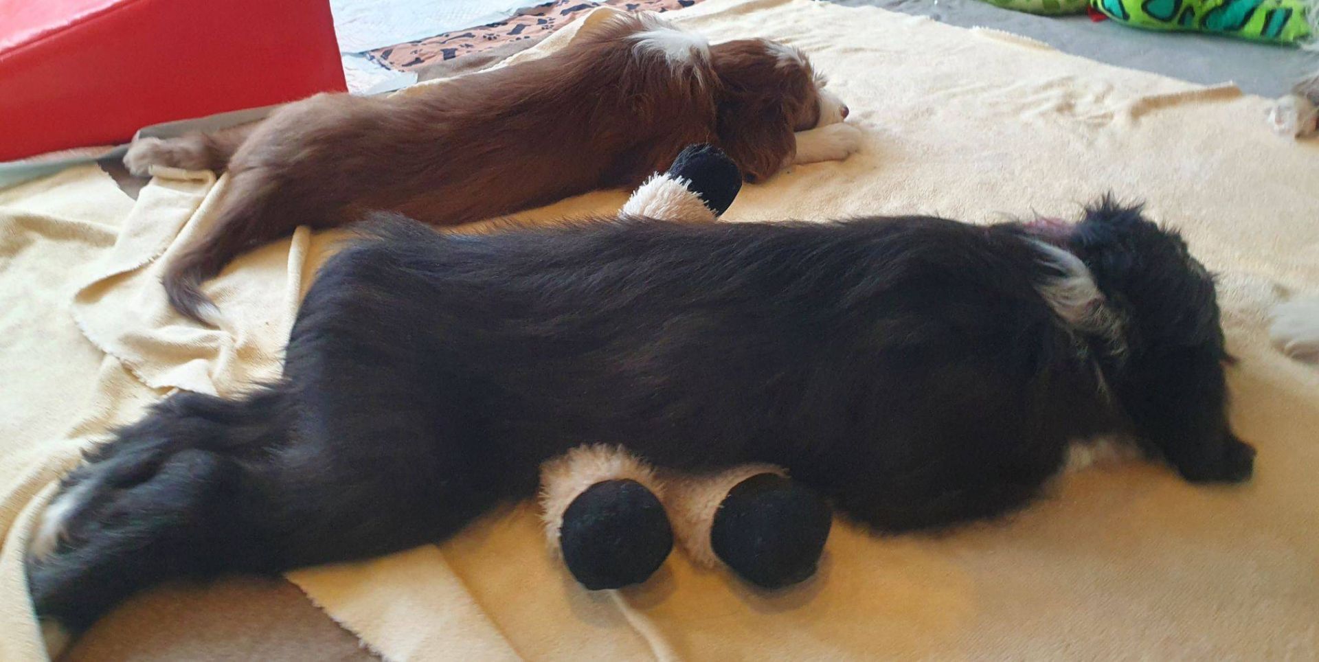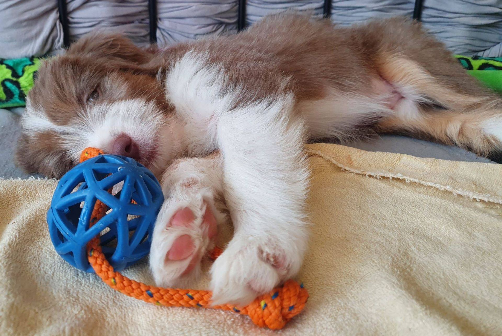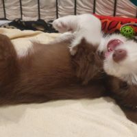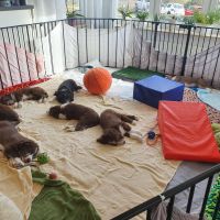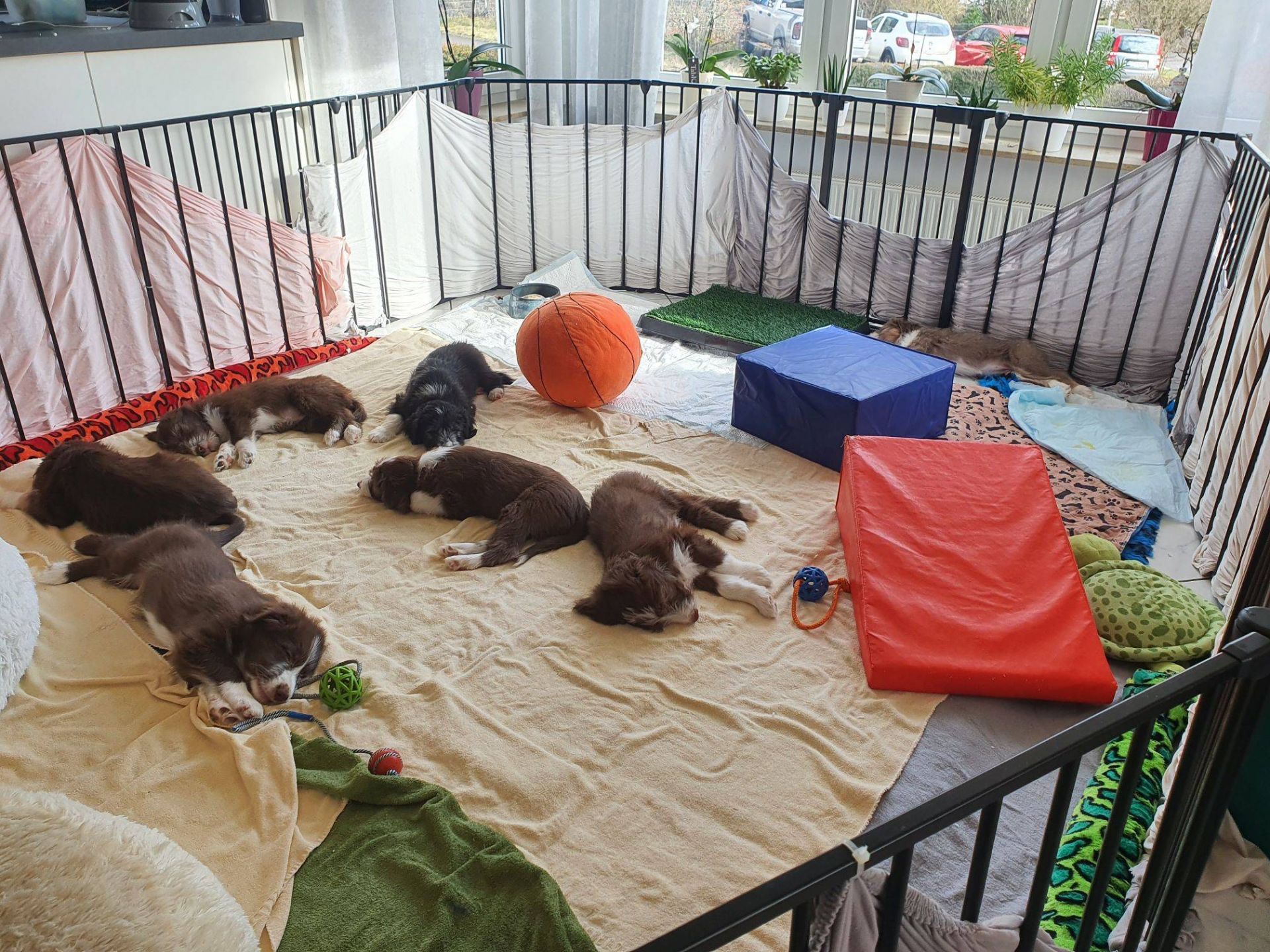 Anders erging es den Welpen. Es war so krass, ihr sicheres Gefüge wurde auseinander gerissen. Sie waren so ein eingespieltes Team, dass ihnen jetzt wirklich was fehlt. Sie haben den ganzen Tag fast nur geschlafen und waren irgendwie niedergeschlagen, dabei hat Blaze ihr bestes gegeben, um sie zum Spielen zu animieren. Aber keine Chance, heute Abend gab es keine Party mehr. Normalerweise drehen sie da nochmal richtig auf. Sie müssen sich erst daran gewöhnen, dass sie nur noch zu 5. sind. Nach jedem gegangenen Welpen hatten sie wohl Angst, wir verlassen sie auch noch. Sobald ich nur aus dem Auslauf raus bin, sind sie alle hinterher und haben gejammert. Es war wirklich herzzerreissend. Da konnt ich gar nicht anders als sie in den Arm nehmen und kuscheln. Sie haben sich dann auch beruhigt.