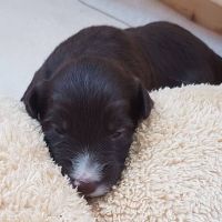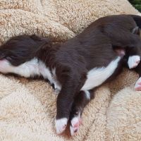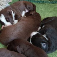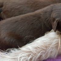 Es wird langsam wirklich zu eng an Mama´s Milchbar, zumal es Aine den Welpis auch nicht wirklich leicht macht. Sie könnte sich ja auf die Seite legen aber das wäre zu einfach - die sollen arbeiten für ihr Essen :-) Welpis sind ja aber auch nicht dumm... die Stellungen werden einfach ausgelagert. Kopfüber trinken geht schließlich auch :-) Danach verfallen sie alle in die Fressnarkose. Bis auf Hündin Nummer 2. Die brauch ewig, bis ihr schließlich ein Plätzchen genehm ist. Es wird gemotzt, geschimpft und geschrien - Aine lässt das völlig kalt. Sie guckt mich an, wie wenn sie sagen wollte, "ich kann´s auch nicht ändern" :-) Erinnert mich sehr an ihre Oma...