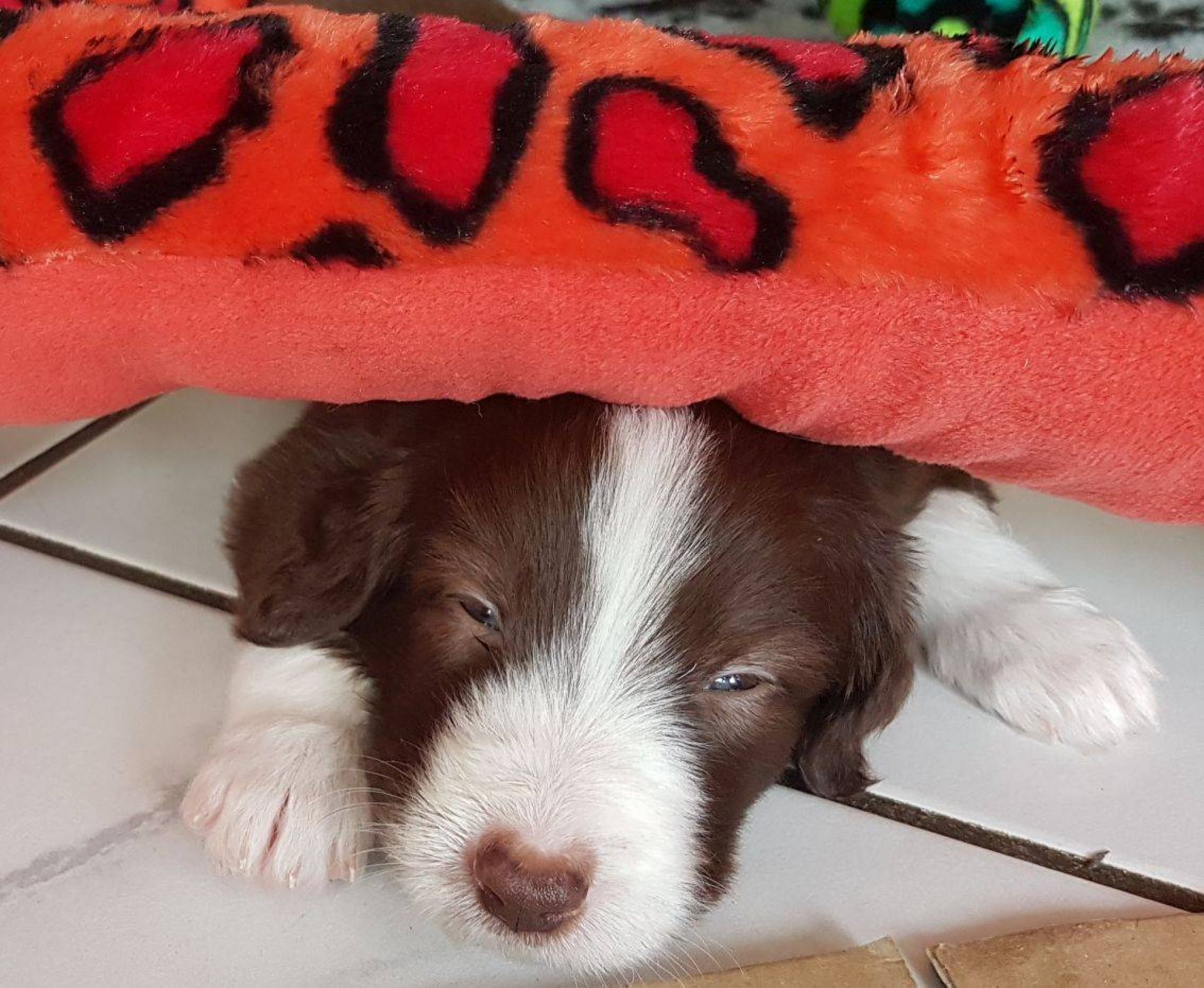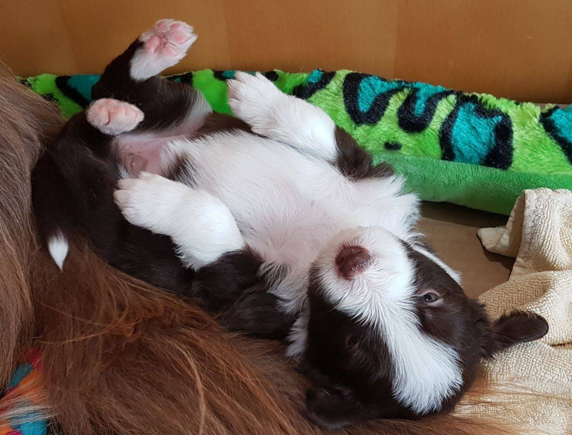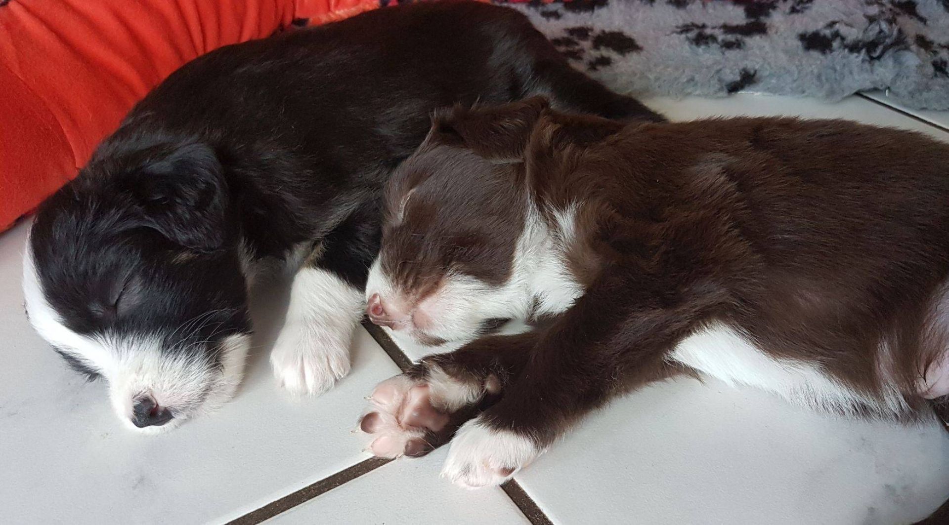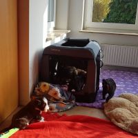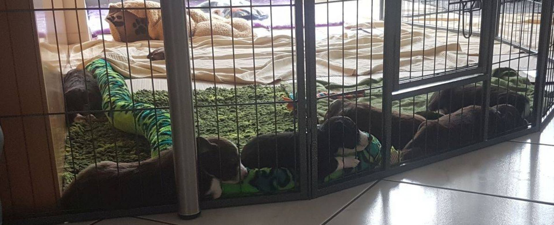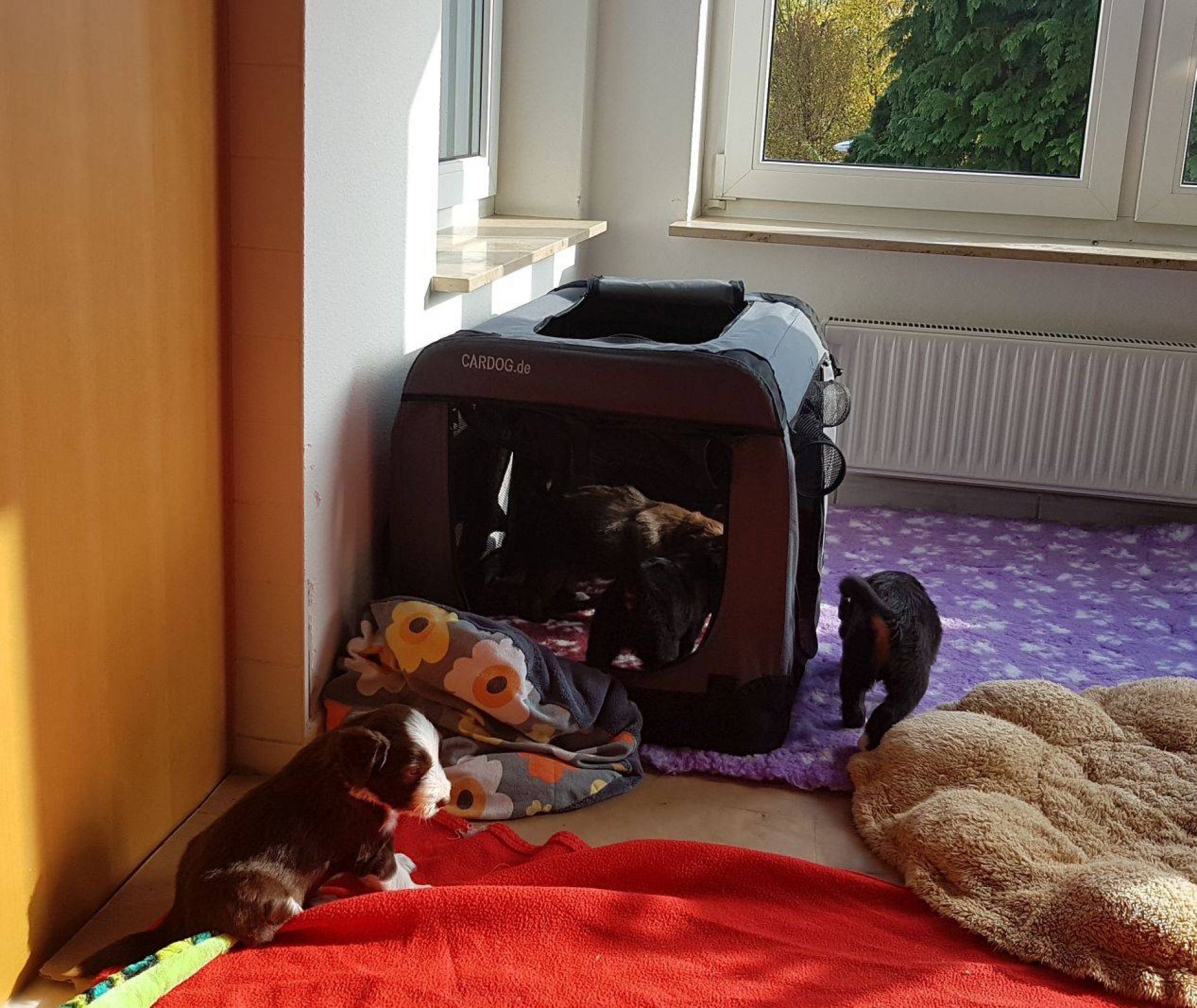 Heute ging es zum ersten Mal in den Auslauf im Esszimmer, den wir zunächst vorsorglich halbiert haben, da er im Vergleich zur Wurfbox riesig ist. Das Geschrei war auch anfänglich sehr groß. Die Nachbarn haben bestimmt gedacht, jetzt haben die auch noch einen Vogel bzw. eher eine Vogelschar. Sie haben in den höchsten Tönen gezwitschert. Auch Aine war kurz überfordert, weil sie am liebsten alle Babies um sich gehabt hätte, die aber alle in eine andere Richtung losgewandert sind. Alle waren dann sehr glücklich als sie sich wieder gefunden haben. Jetzt schlafen sie ganz friedlich. Witzigerweise komplett am anderen Ende als der A-Wurf :-)