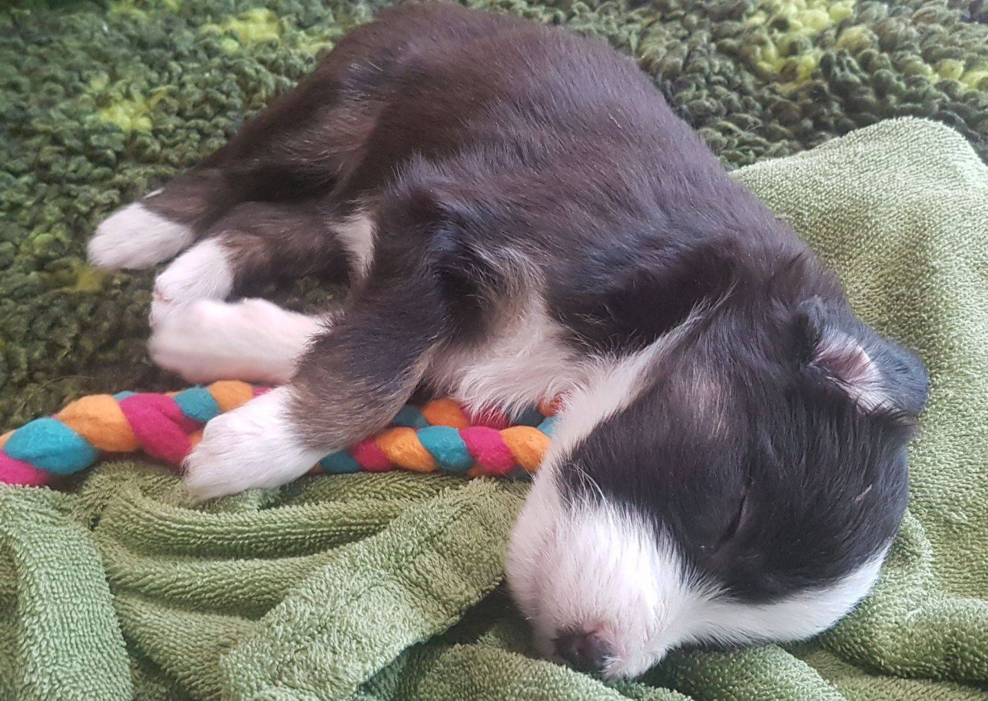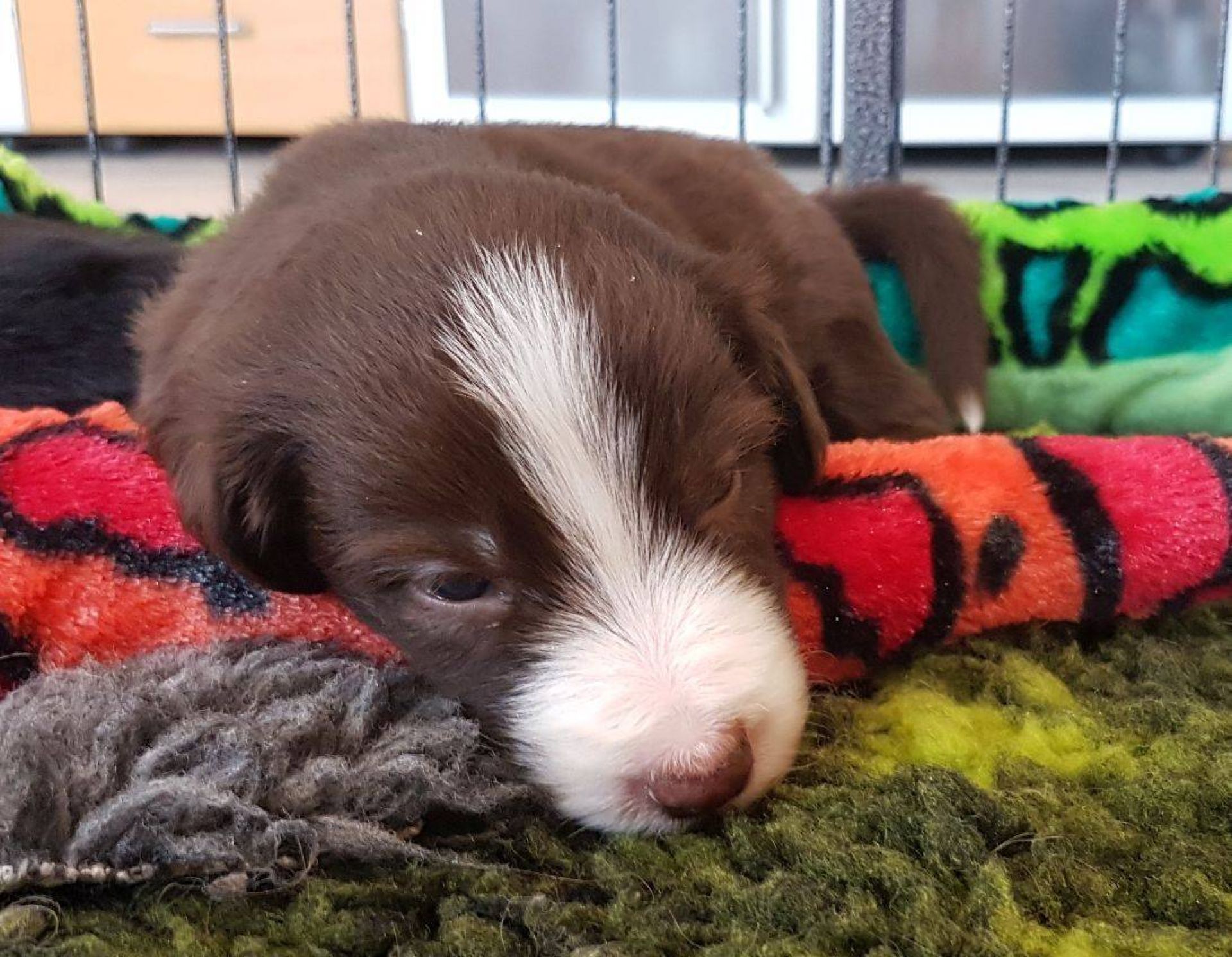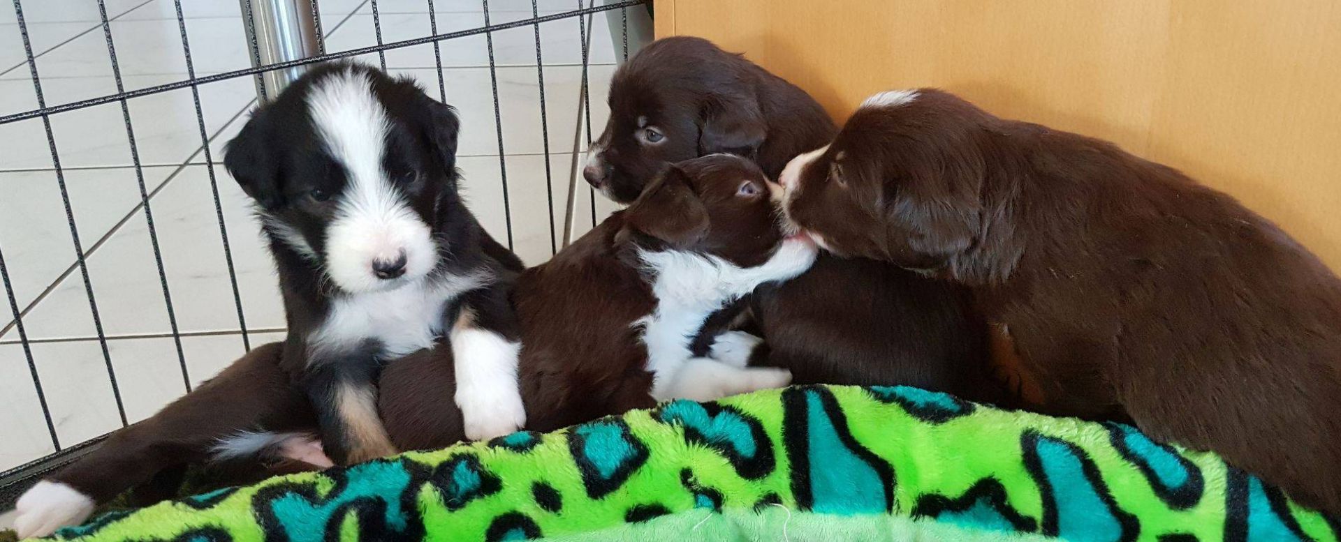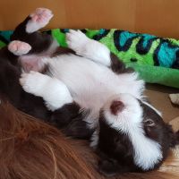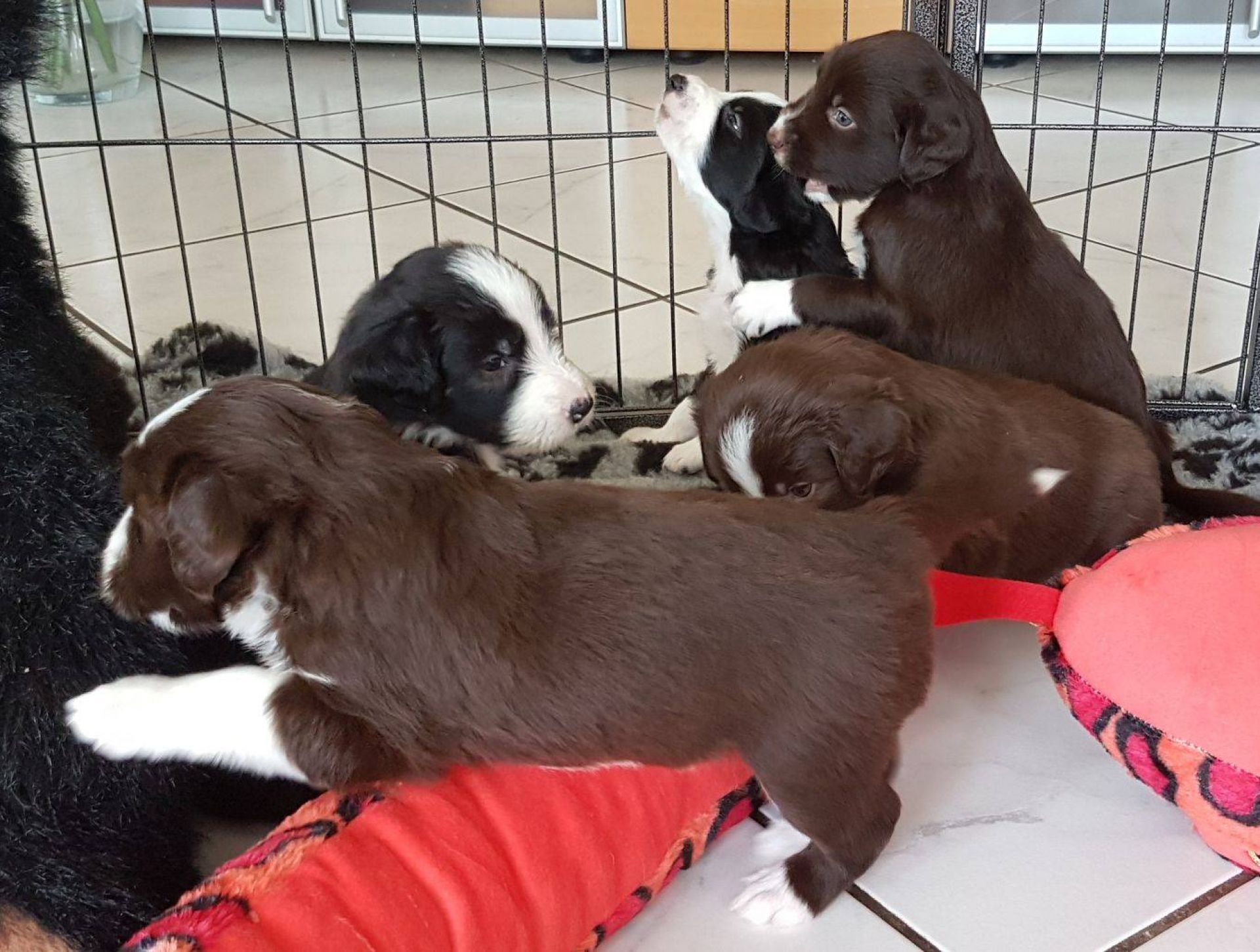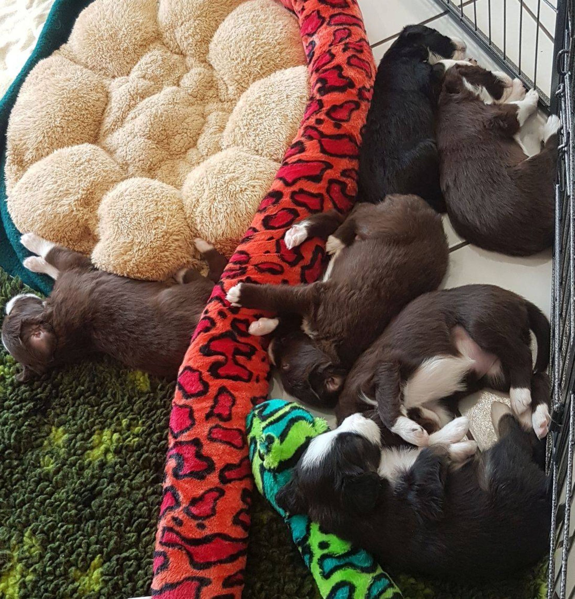 Heute ging es zum ersten Mal in den Auslauf im Esszimmer, den wir zunächst vorsorglich halbiert haben, da er im Vergleich zur Wurfbox riesig ist. Das Geschrei war auch anfänglich sehr groß. Die Nachbarn haben bestimmt gedacht, jetzt haben die auch noch einen Vogel bzw. eher eine Vogelschar. Sie haben in den höchsten Tönen gezwitschert. Auch Aine war kurz überfordert, weil sie am liebsten alle Babies um sich gehabt hätte, die aber alle in eine andere Richtung losgewandert sind. Alle waren dann sehr glücklich als sie sich wieder gefunden haben. Jetzt schlafen sie ganz friedlich. Witzigerweise komplett am anderen Ende als der A-Wurf :-)