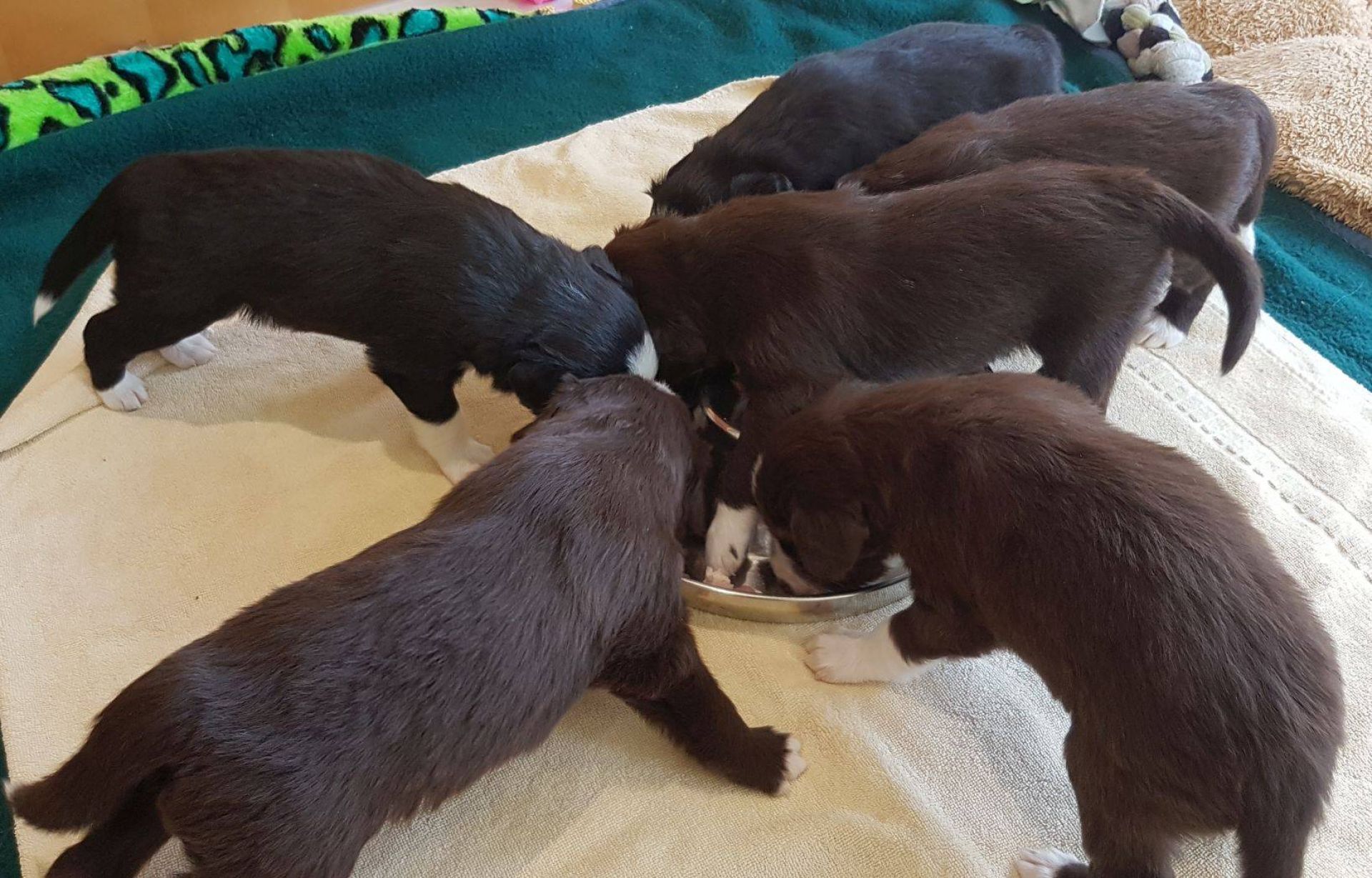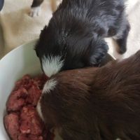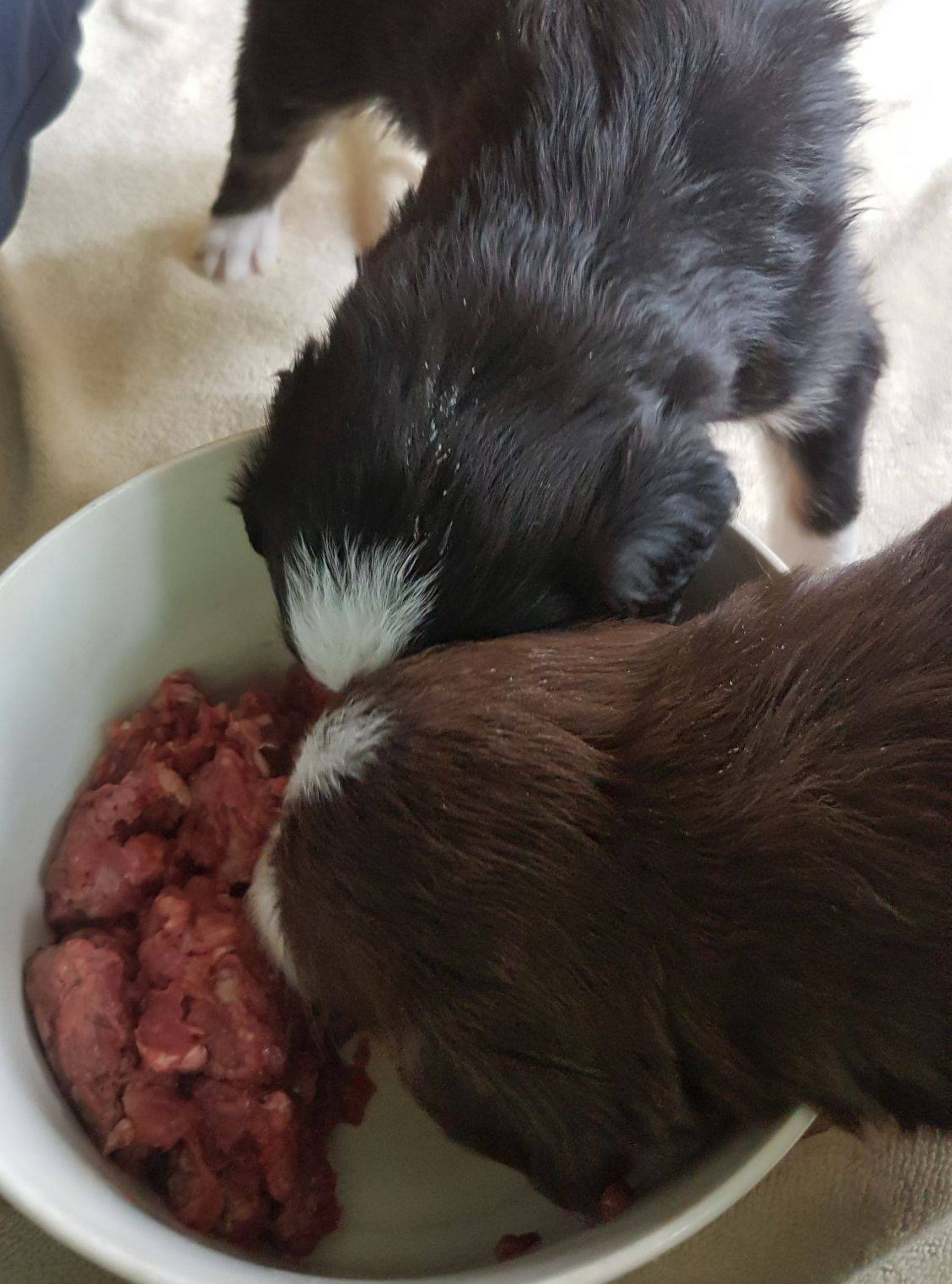 Die erste Fleischmahlzeit. Eigentlich wollte ich ja eine Handfütterund machen, um die Welpis mal langsam an die feste Nahrung ranzuführen. Ich kann sagen - sie können Finger und Fleisch unterscheiden. Die blöden Finger waren nämlich im Weg. Der Napf musste her. Unglaublich! 250 Gramm in Nullkommanix verputzt und ich glaube, zu mehr hätten sie auch nicht nein gesagt. Der Nachtisch bei Mama war dann aber auch ok.