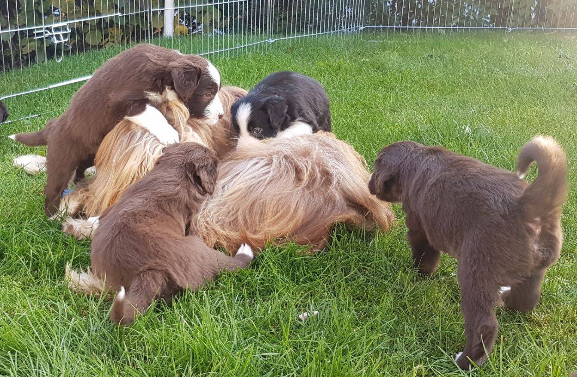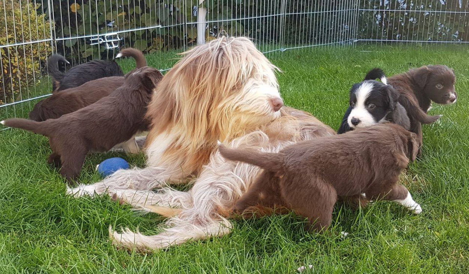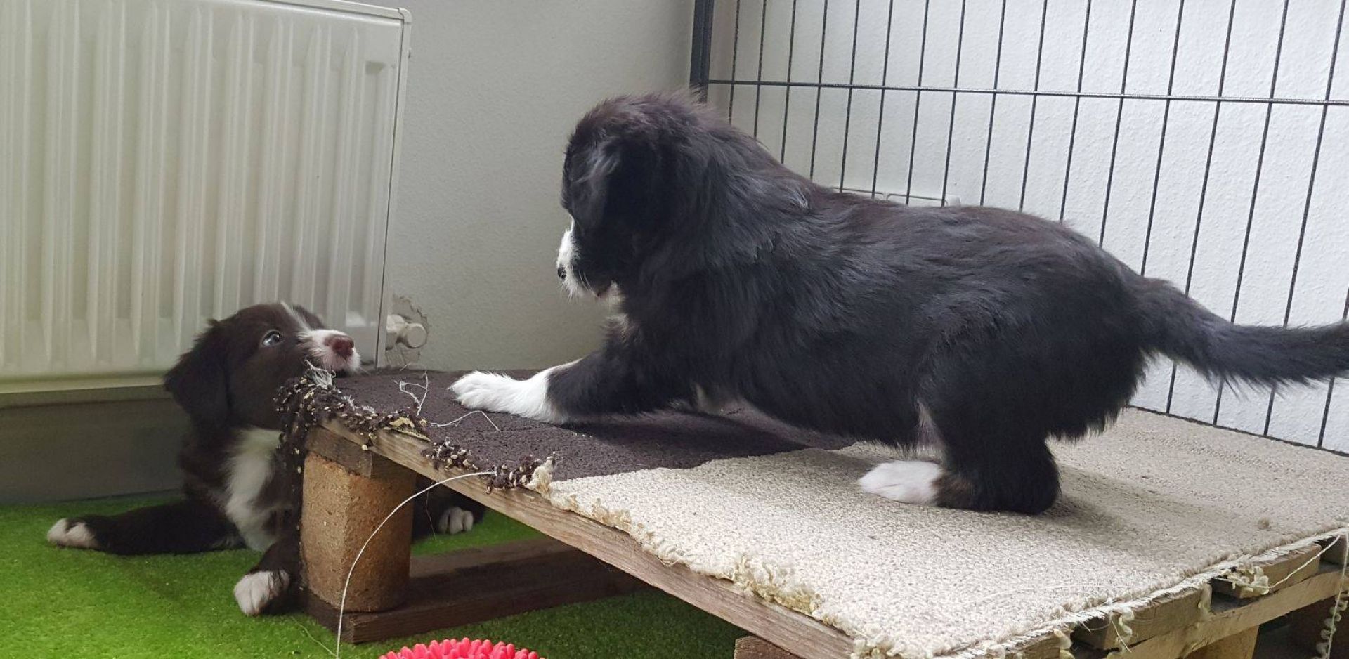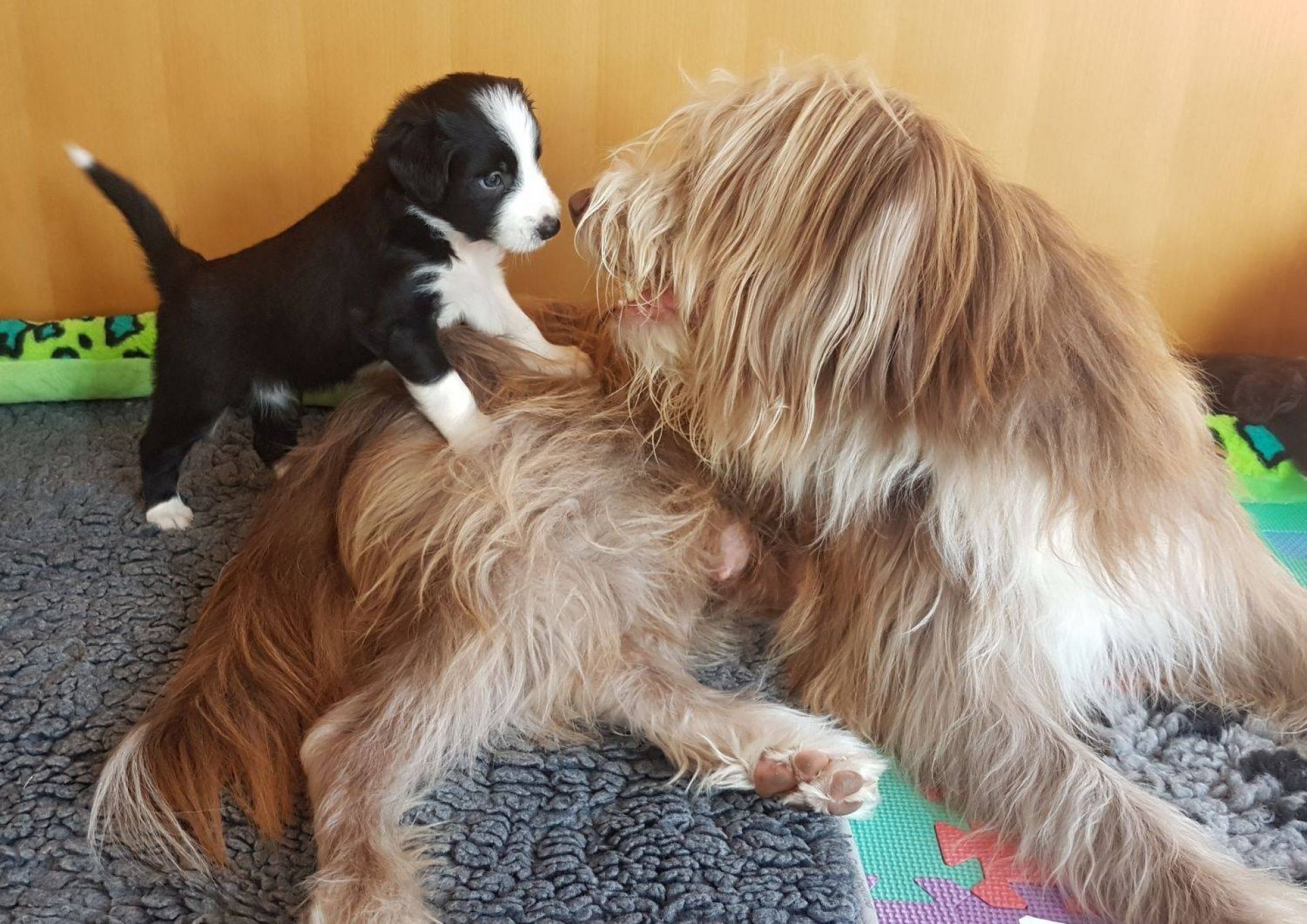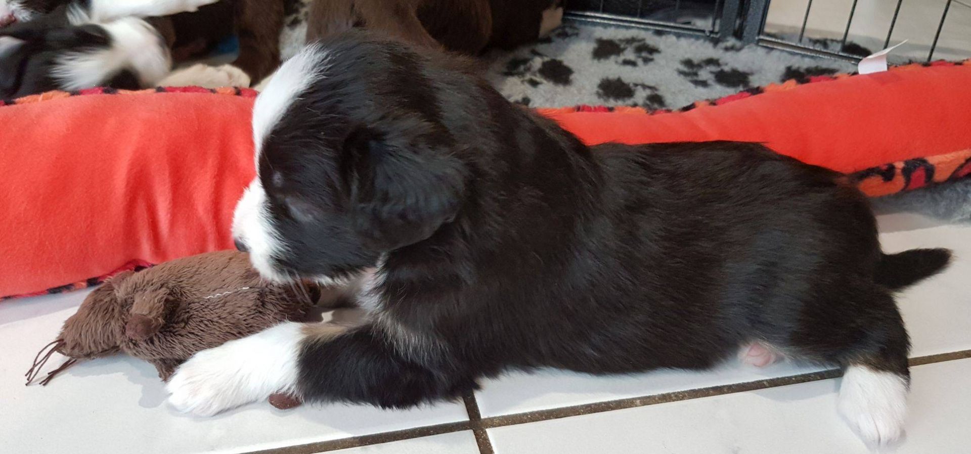 Die Babies werden ins Spielen eingeführt. Wobei sie das ja untereinander echt gut können. Die Mama zeigt ihnen aber, dass es dabei auch Regeln gibt. Sie fängt an und beendet es auch und das zeigt sie ihnen auch deutlich. Plötzlich ist nämlich das Spieli nicht mehr zur freien Verfügung sondern Aine beansprucht es für sich. Es ist wirklich spannend, wie unterschiedlich sich die Welpis aus der Situation heraus manövrieren.