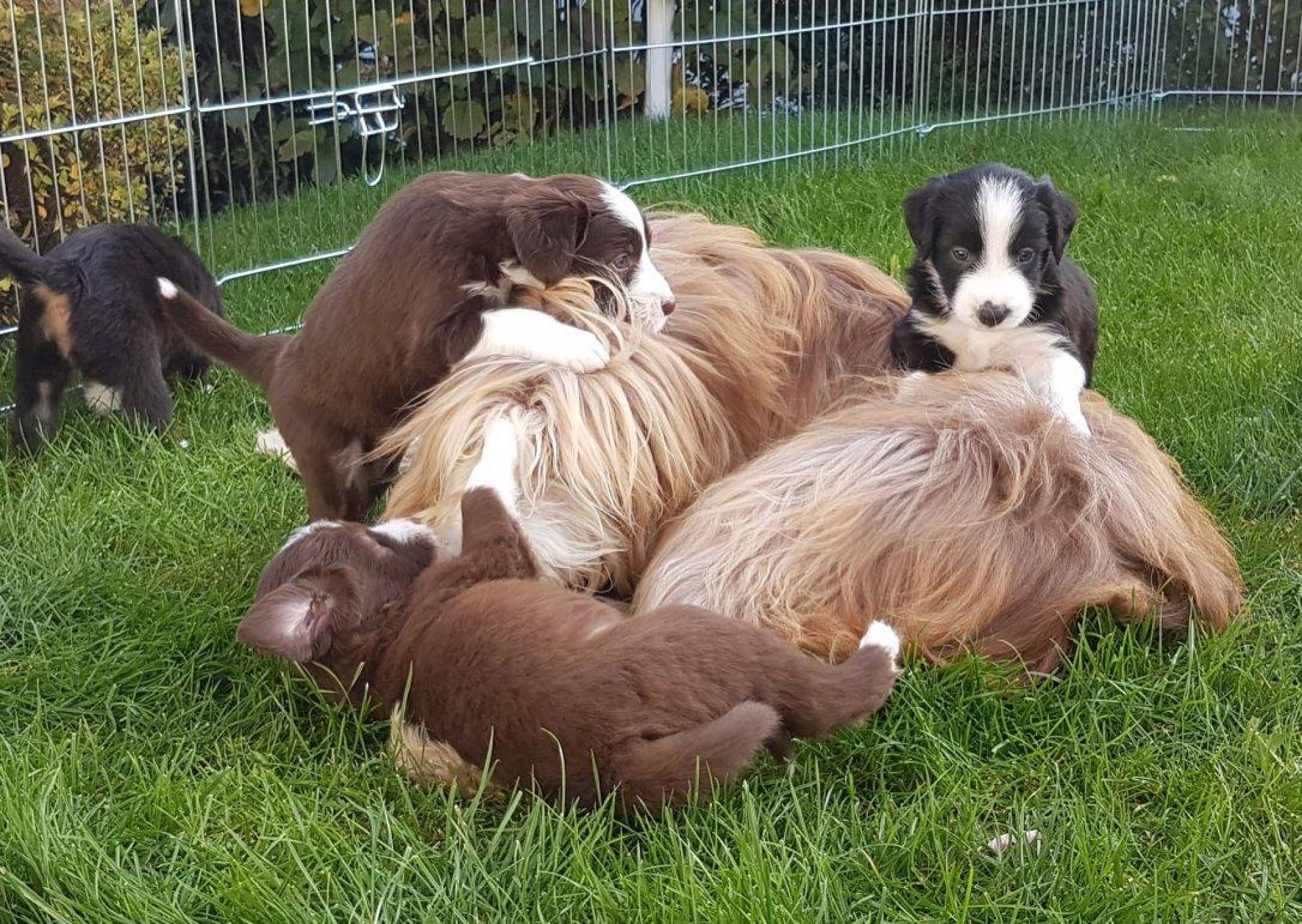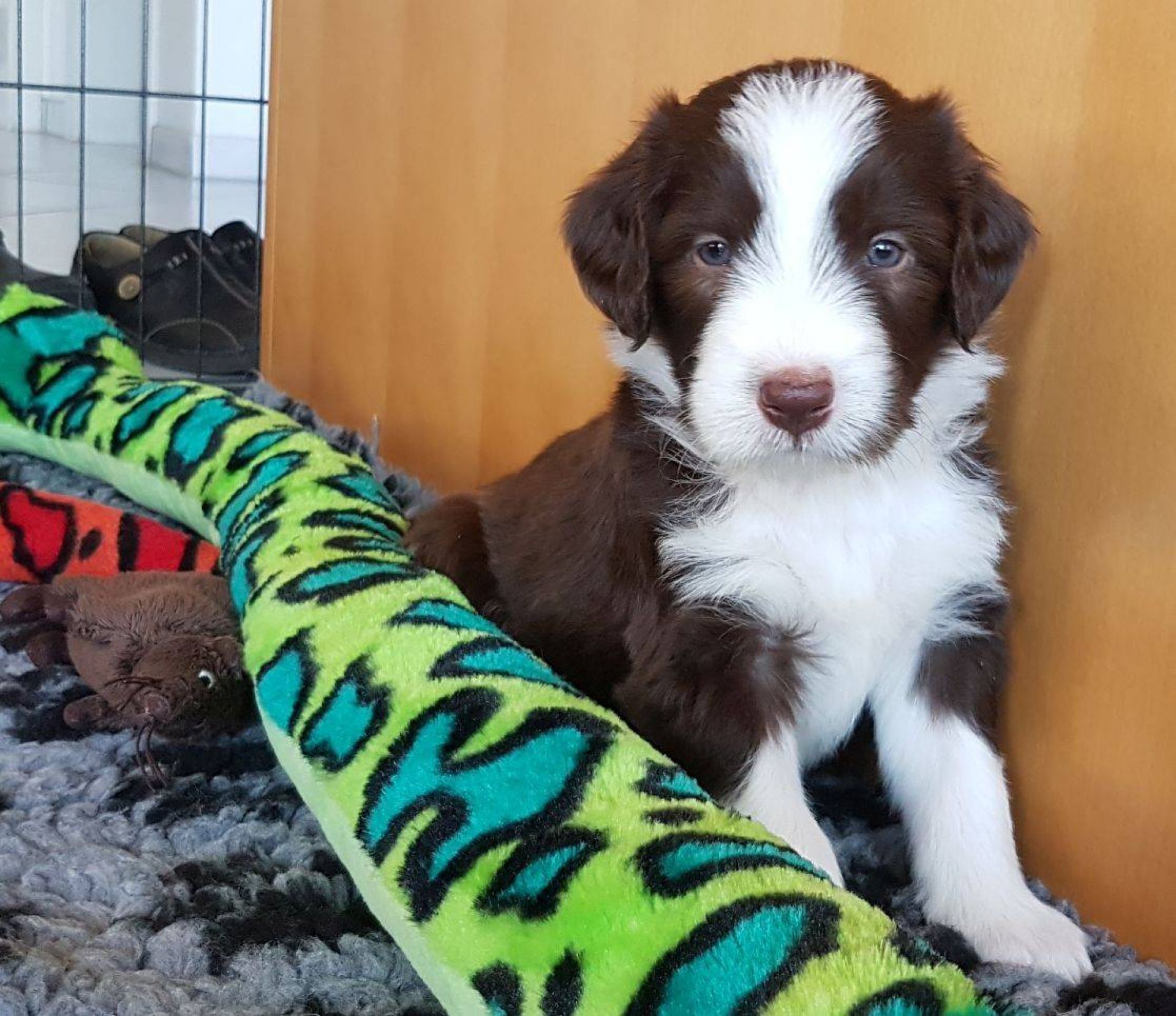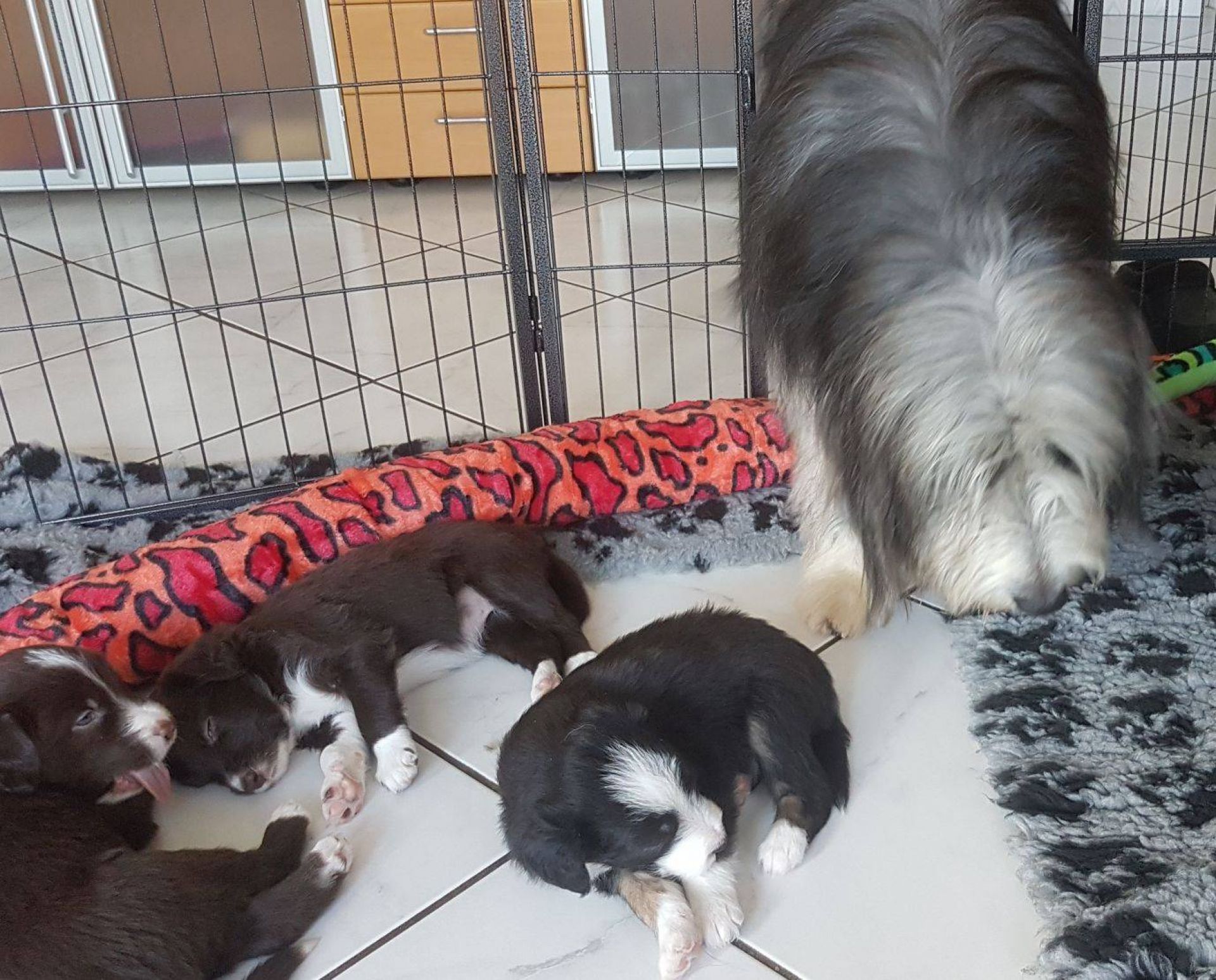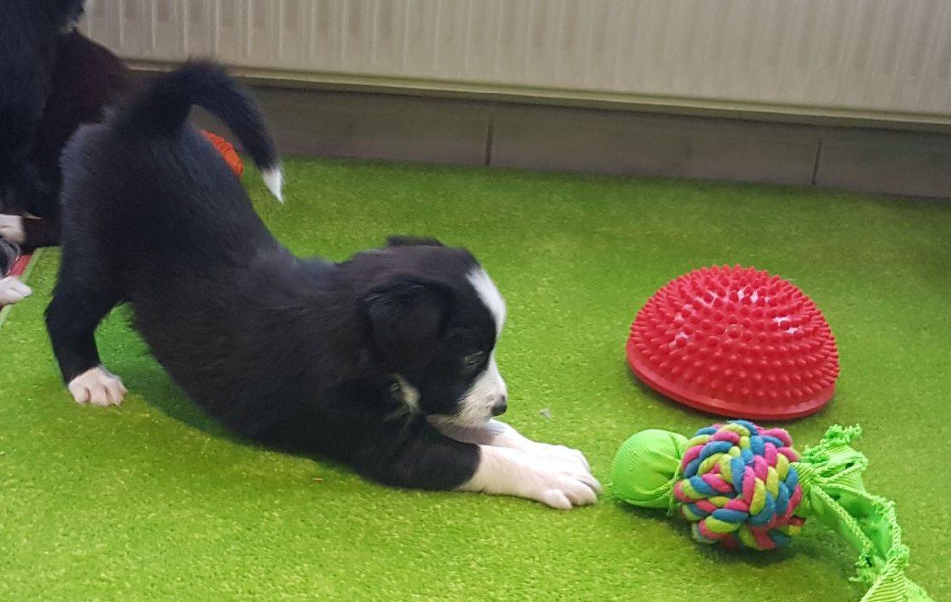 Die Babies werden ins Spielen eingeführt. Wobei sie das ja untereinander echt gut können. Die Mama zeigt ihnen aber, dass es dabei auch Regeln gibt. Sie fängt an und beendet es auch und das zeigt sie ihnen auch deutlich. Plötzlich ist nämlich das Spieli nicht mehr zur freien Verfügung sondern Aine beansprucht es für sich. Es ist wirklich spannend, wie unterschiedlich sich die Welpis aus der Situation heraus manövrieren.