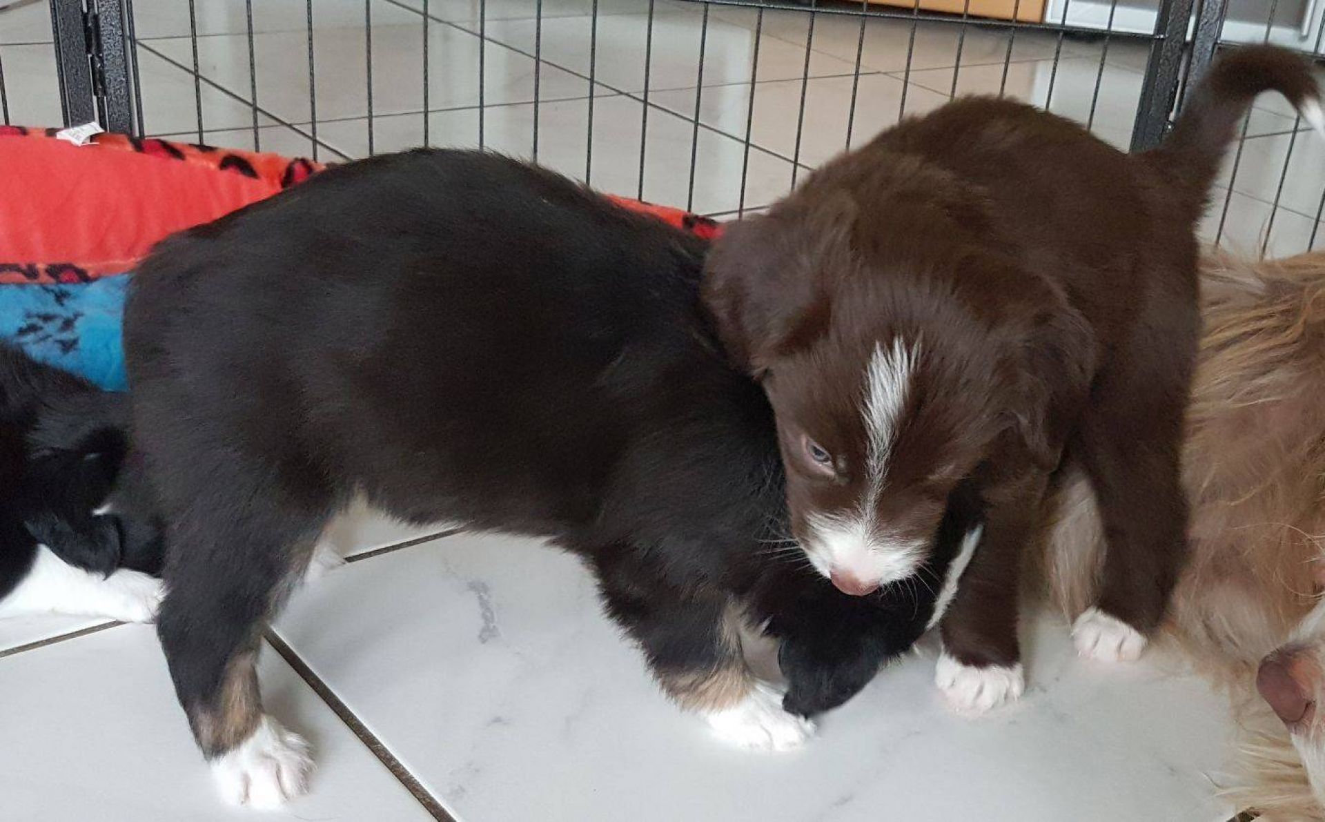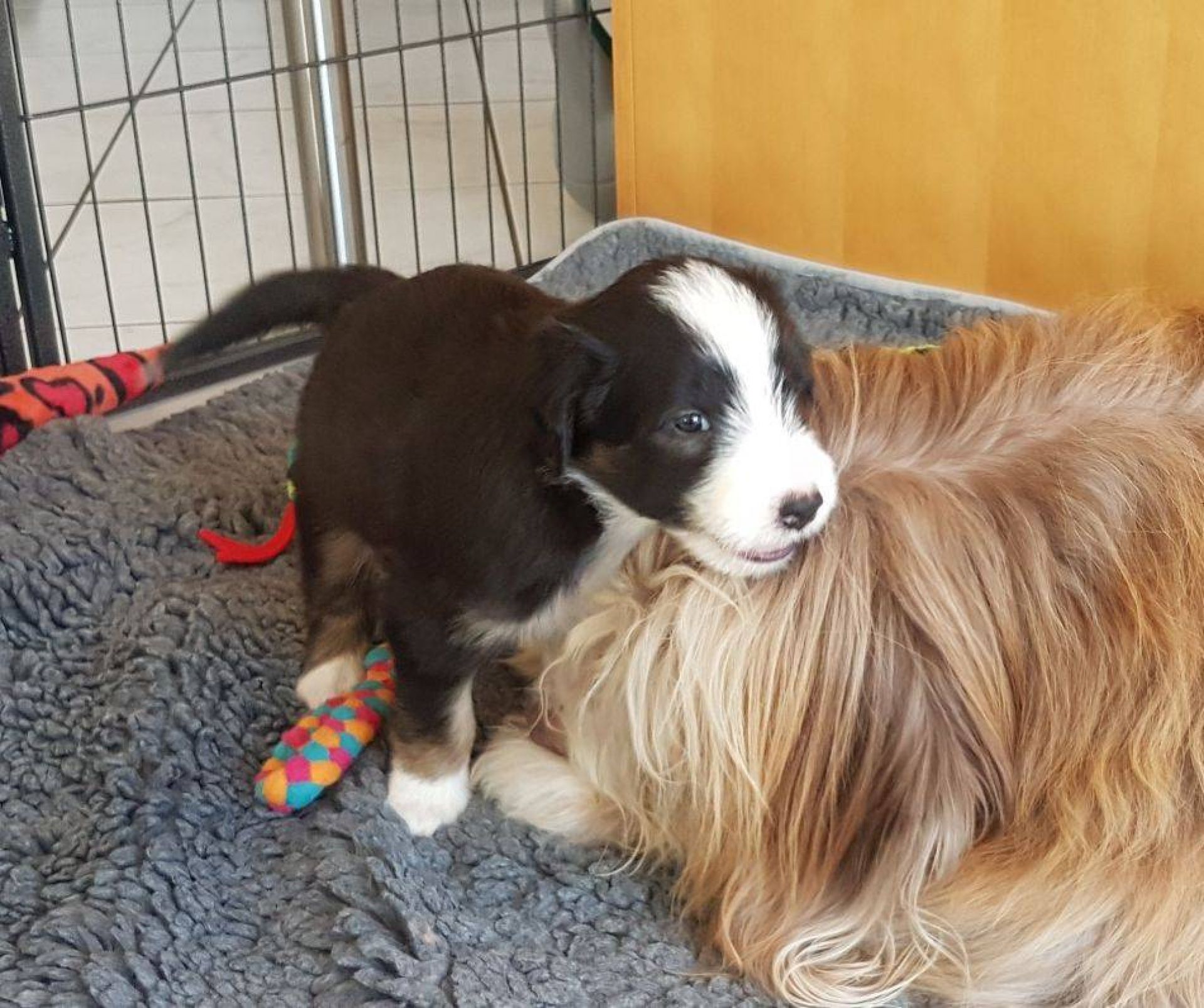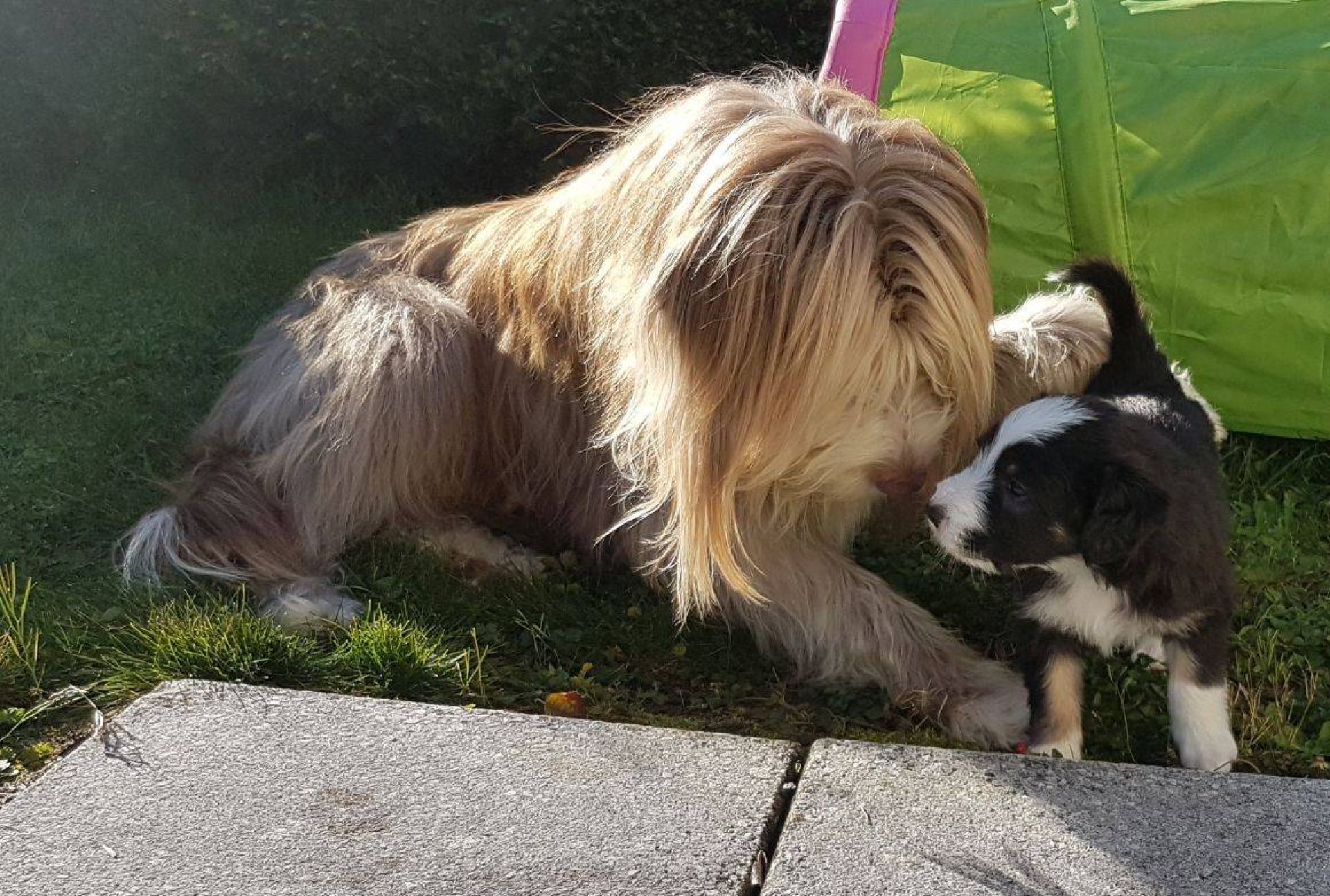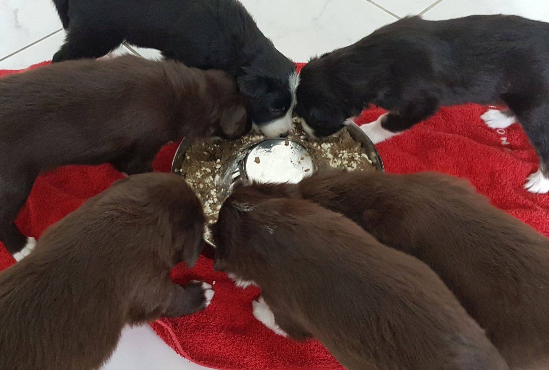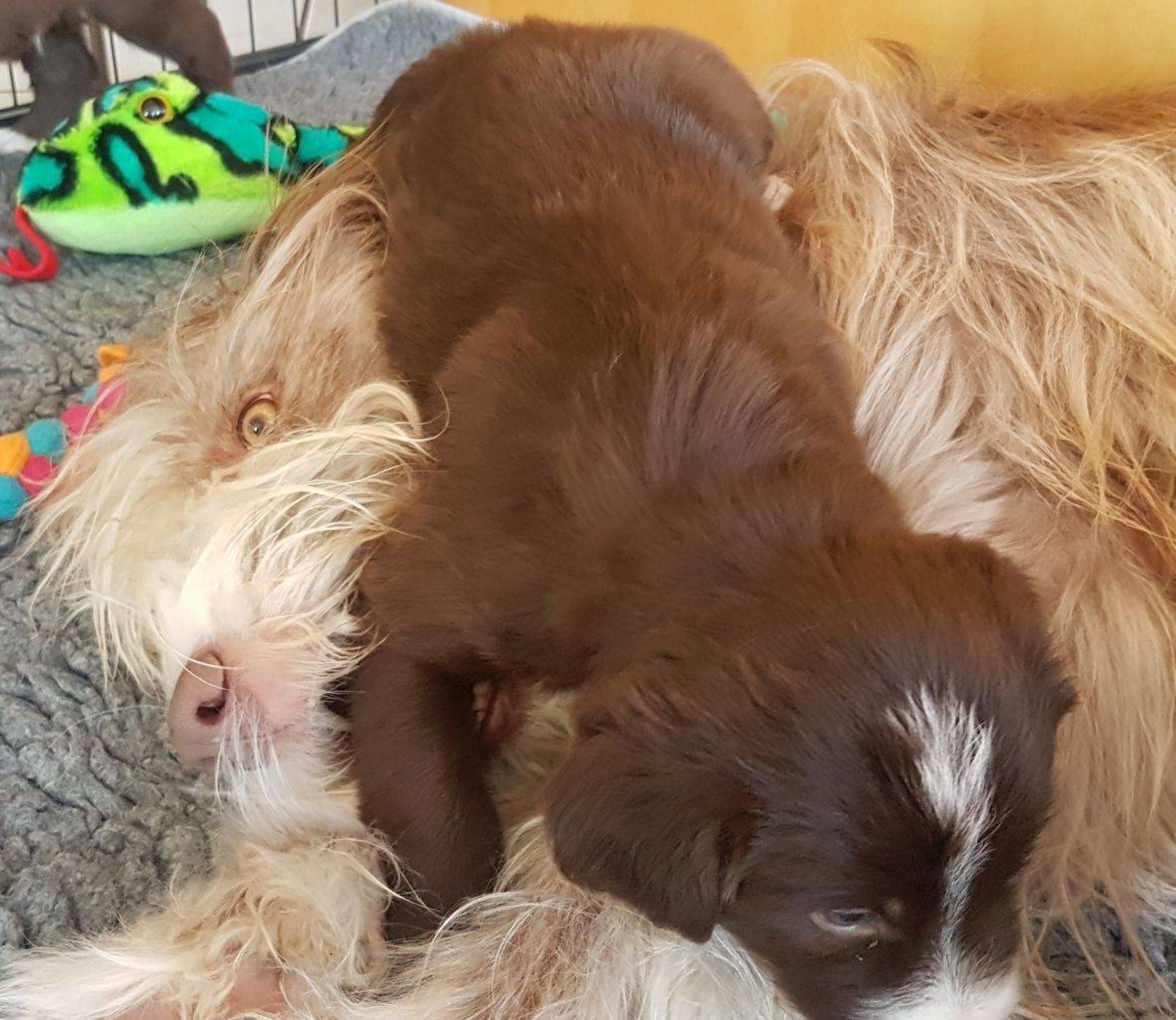 Die Babies werden ins Spielen eingeführt. Wobei sie das ja untereinander echt gut können. Die Mama zeigt ihnen aber, dass es dabei auch Regeln gibt. Sie fängt an und beendet es auch und das zeigt sie ihnen auch deutlich. Plötzlich ist nämlich das Spieli nicht mehr zur freien Verfügung sondern Aine beansprucht es für sich. Es ist wirklich spannend, wie unterschiedlich sich die Welpis aus der Situation heraus manövrieren.