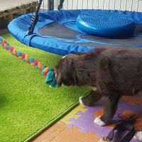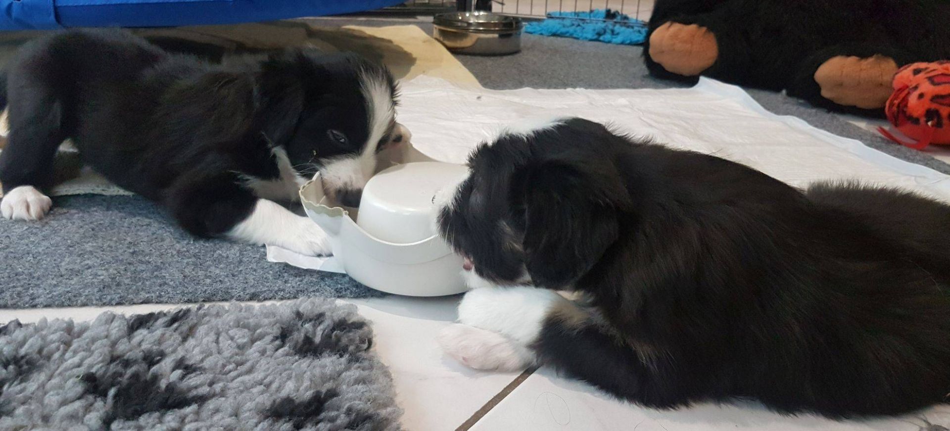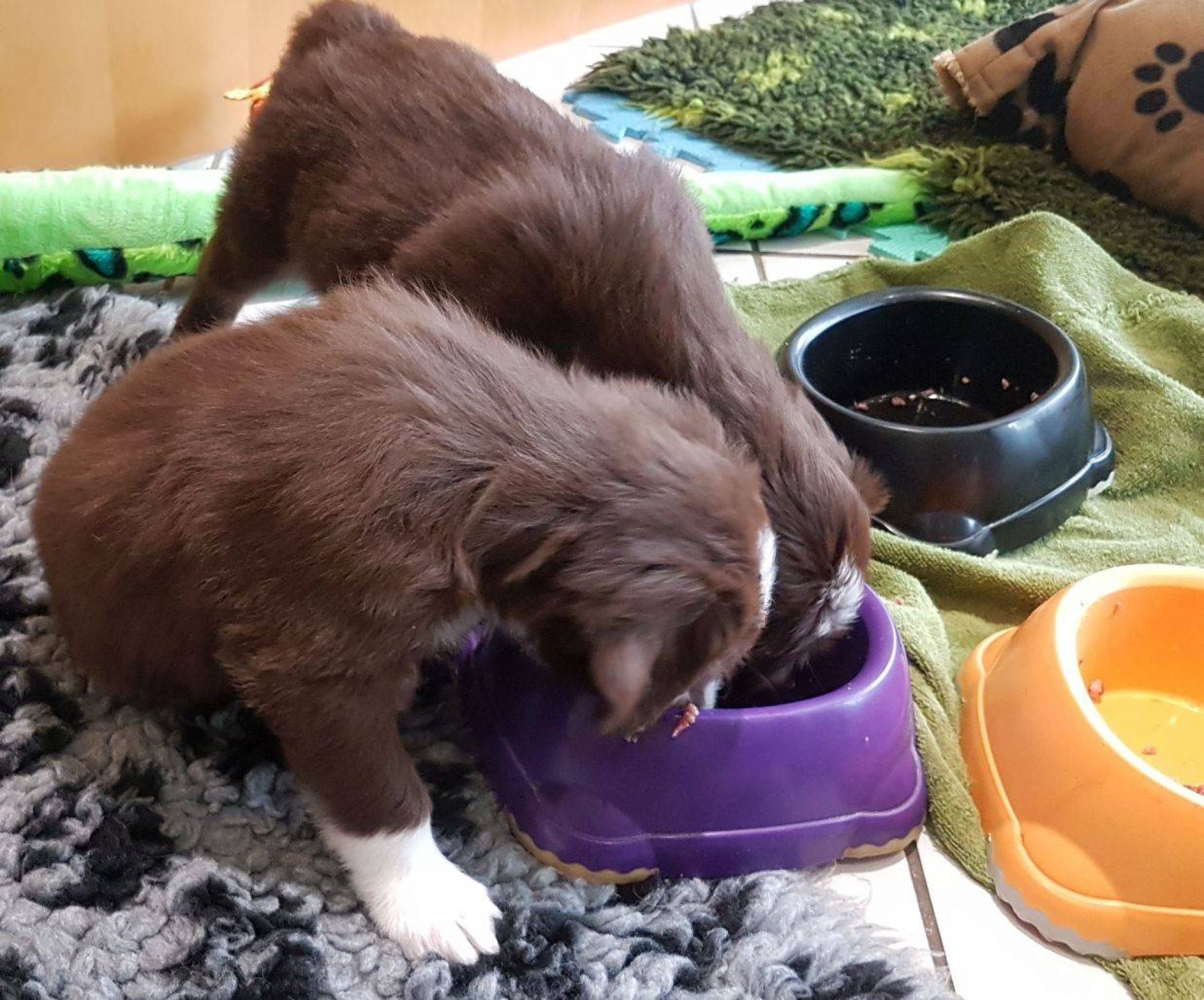 18 kg passen so langsam nicht mehr um den Ring. Aber sie sind so mega anständig. Es wird nicht gerangelt oder gekämpt, sondern zwei warten bis ein Platz frei wird. Deshalb gab es heute das erste Mal Essen aus dem Napf. Ganz gesittet und paarweise, wie wenn sie noch nie was anderes gemacht hätten. Danach wurde der Napf recycelt und musste als Spielzeug herhalten. Je lauter es gescheppert hat, um so besser :-)