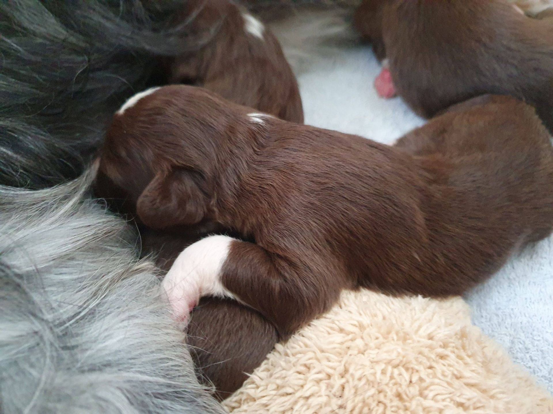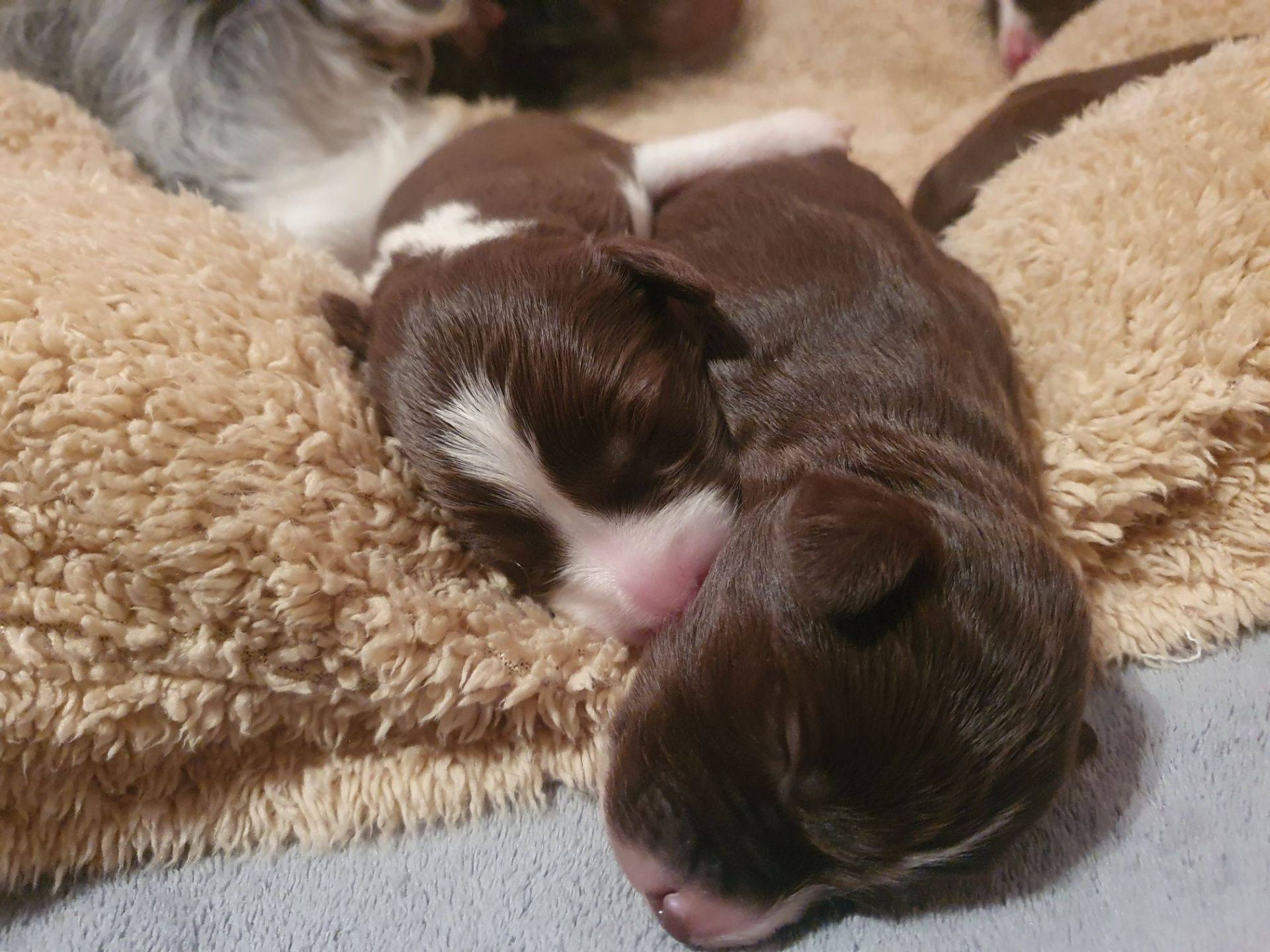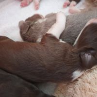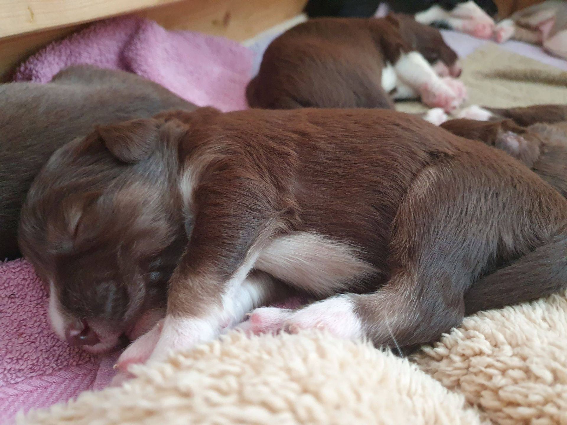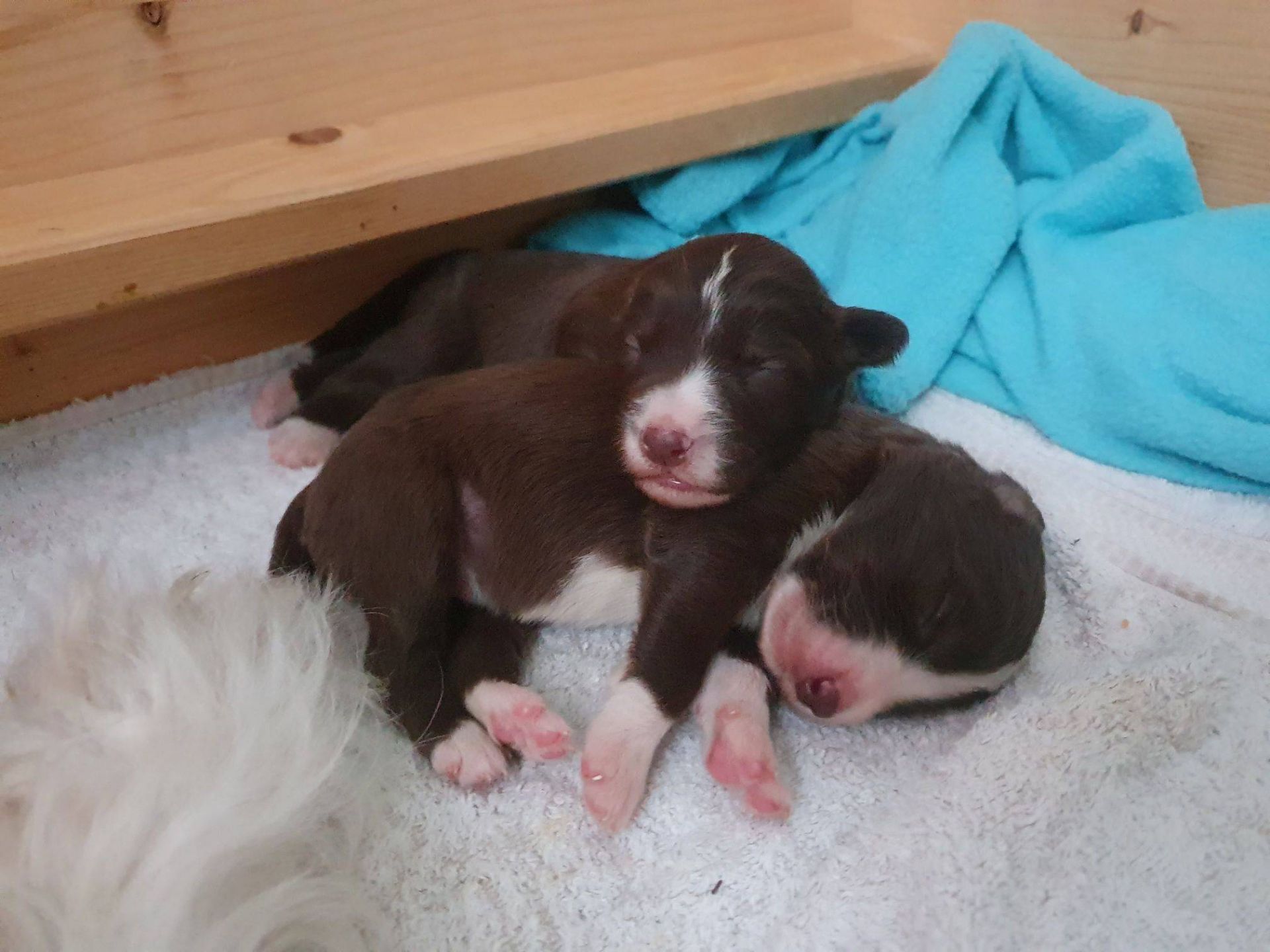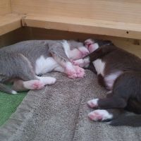So lieb, verkuschelt, chillig, sanft und brav die Welpis sind, so energisch und rabiat werden sie, wenn es ums Trinken geht. Die arme Blaze bekommt Knutschflecken und wird ausgesaugt. Kein Wunder, dass sie nur noch zum Säugen und Putzen reingeht. Nuckeln gibt es momentan nicht. Sie schläft lieber vor der Wurfbox.