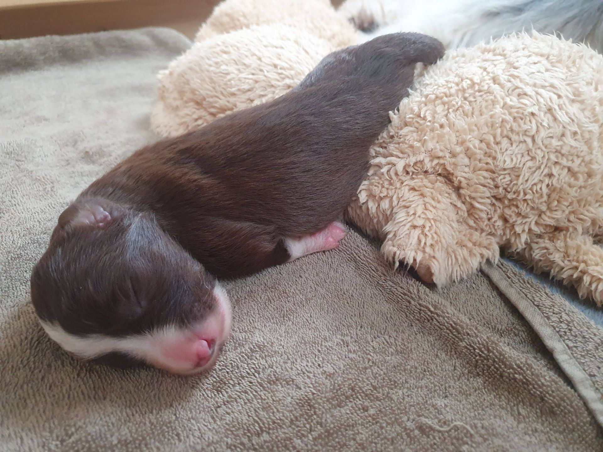Blaze hält ihren 2-Stundenrythmus bei, liegt jetzt aber nach dem Säugen und Putzen außerhalb der Wurfbox. Tagsüber geht sie wieder mit ins Büro, dann erinnere ich sie, dass es wieder Zeit für die Babies ist. Nachts ist es andersrum, da weckt sie mich :-) Man kann die Uhr danach stellen.