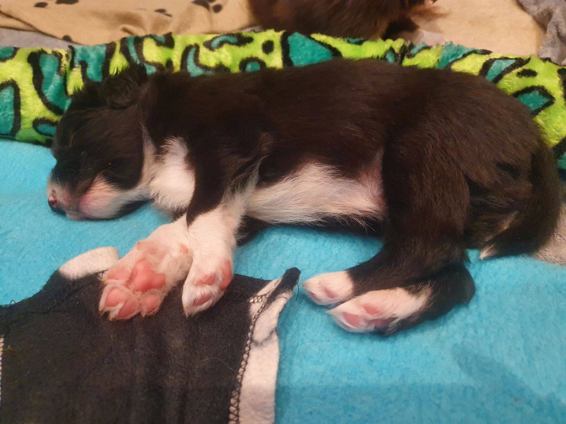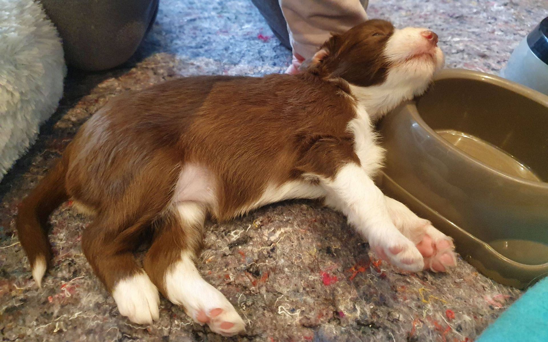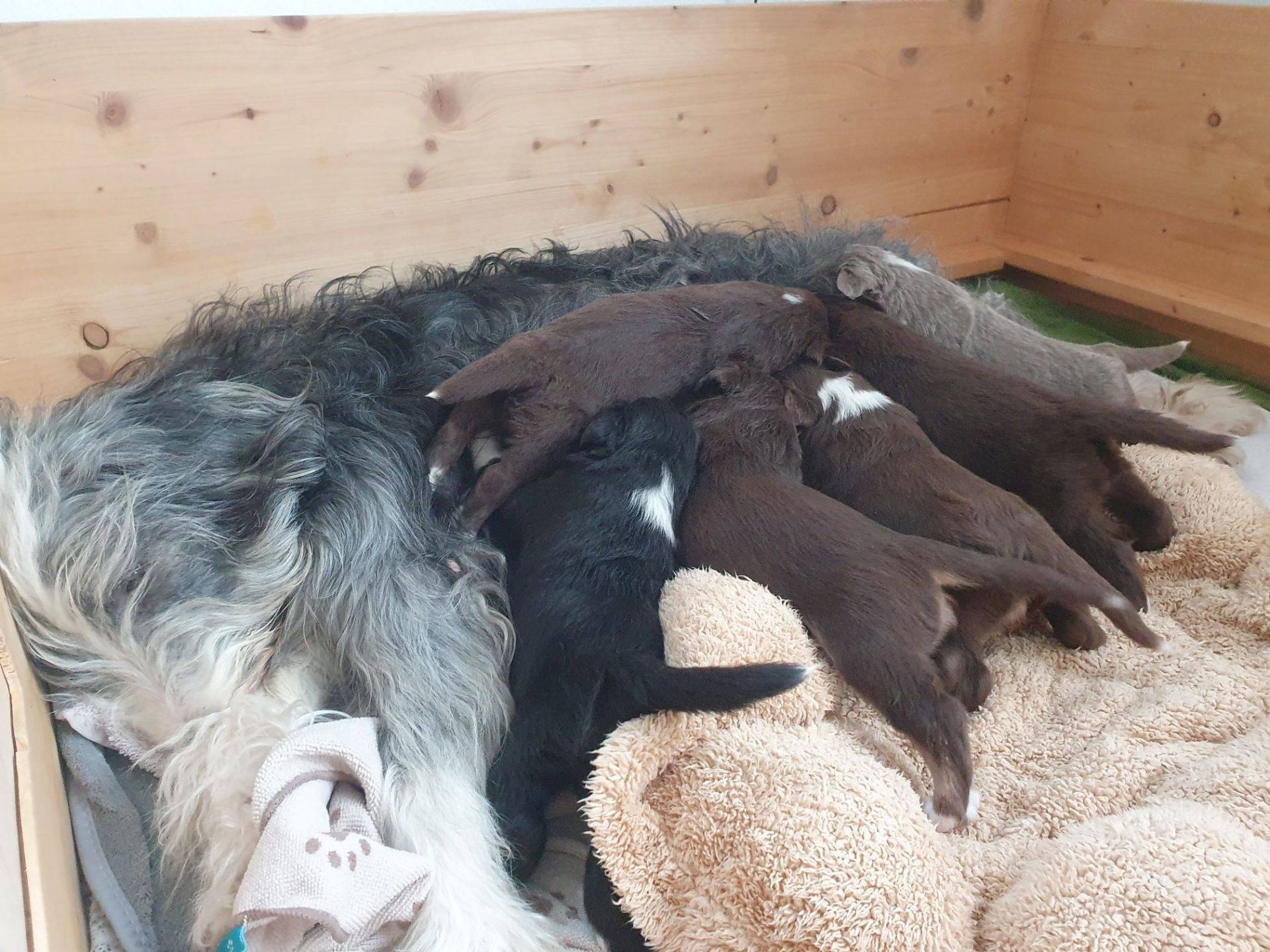 Die Welpen werden immer mobiler und fangen auch an, mit dem Spielzeug zu spielen. Der Energiebedarf steigt, was man merkt, wie sie beim Fressen reinhauen. Allerdings melden sie sich gar nicht, wenn sie Hunger haben. Es sind einfach nur zufriedene und ausgeglichene Babies. Man muss sie zum Fressen wecken. Seit heute können sie auch aus dem Napf trinken. Bei der Mama zugeschaut, ausprobiert und für gut befunden.