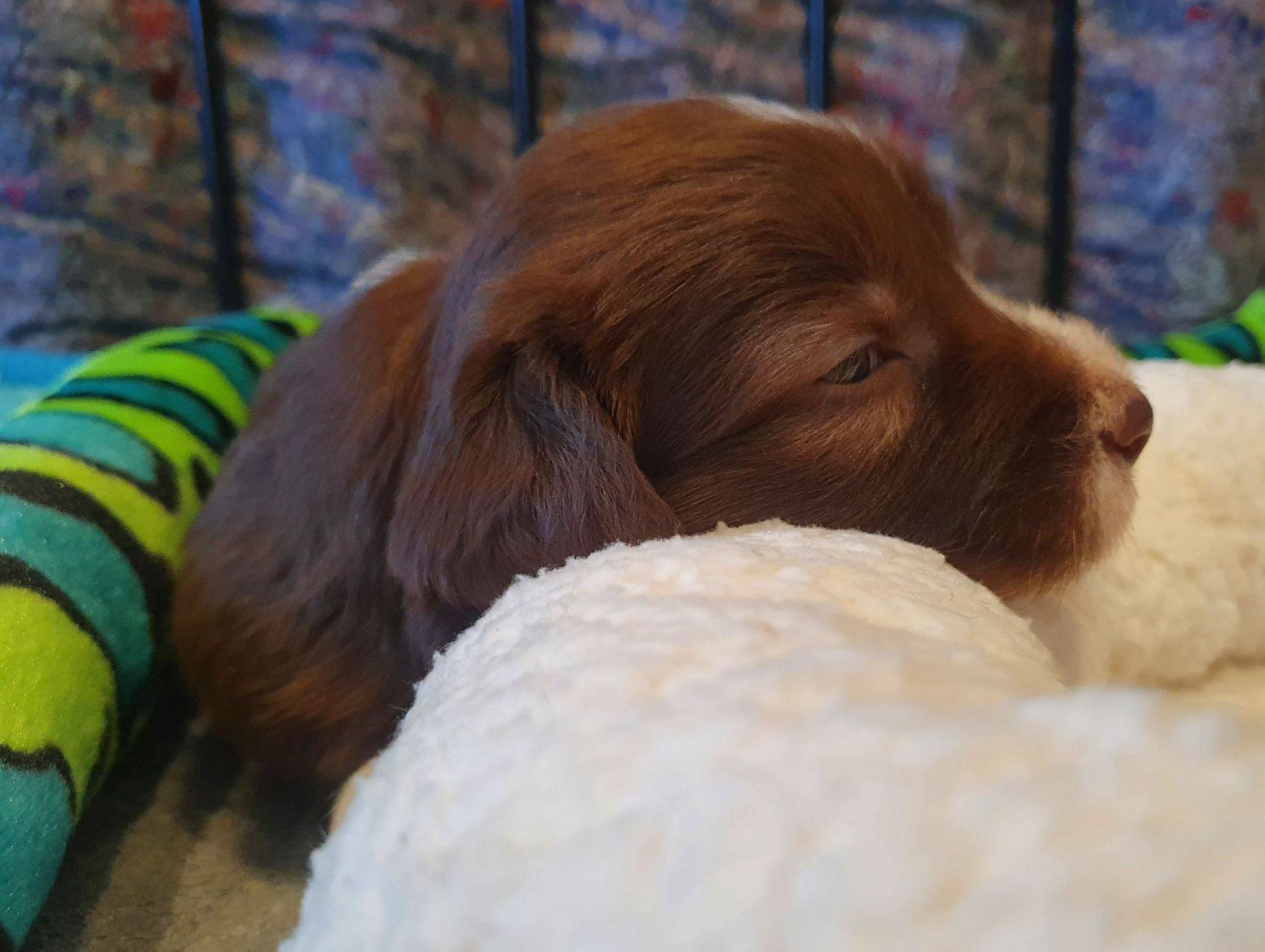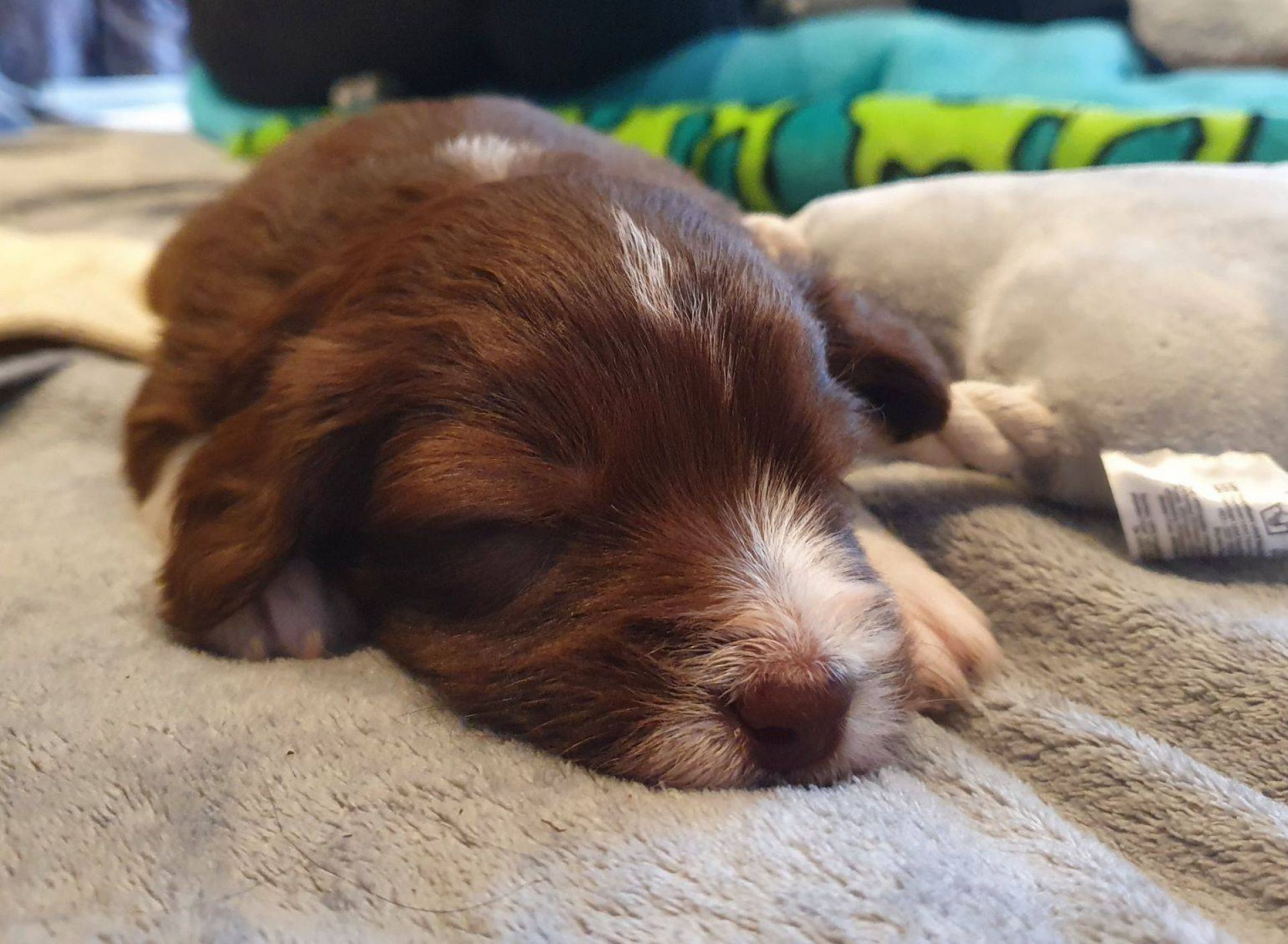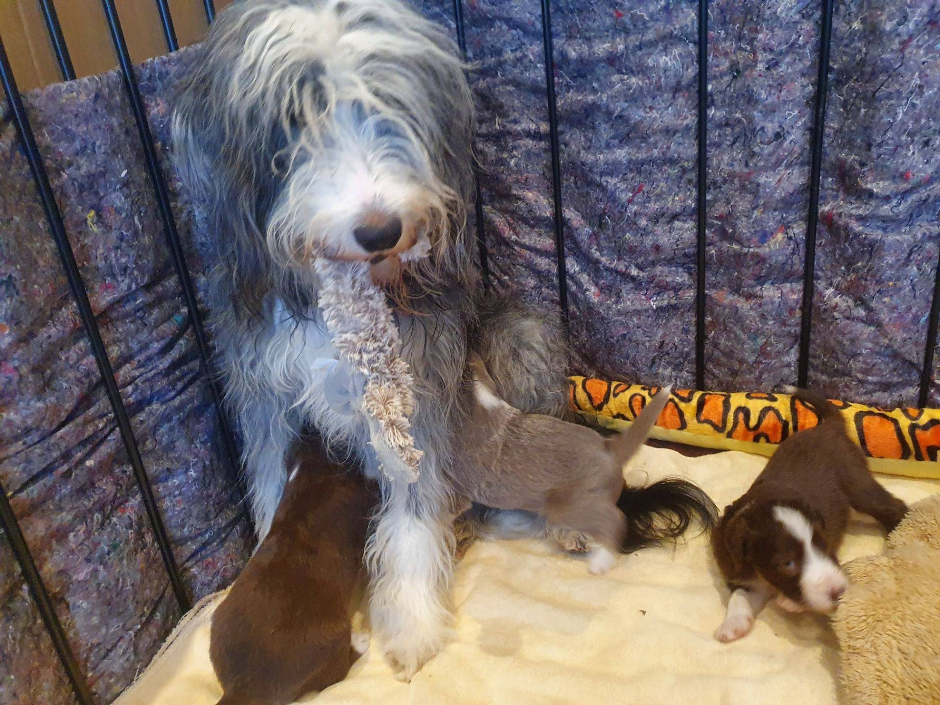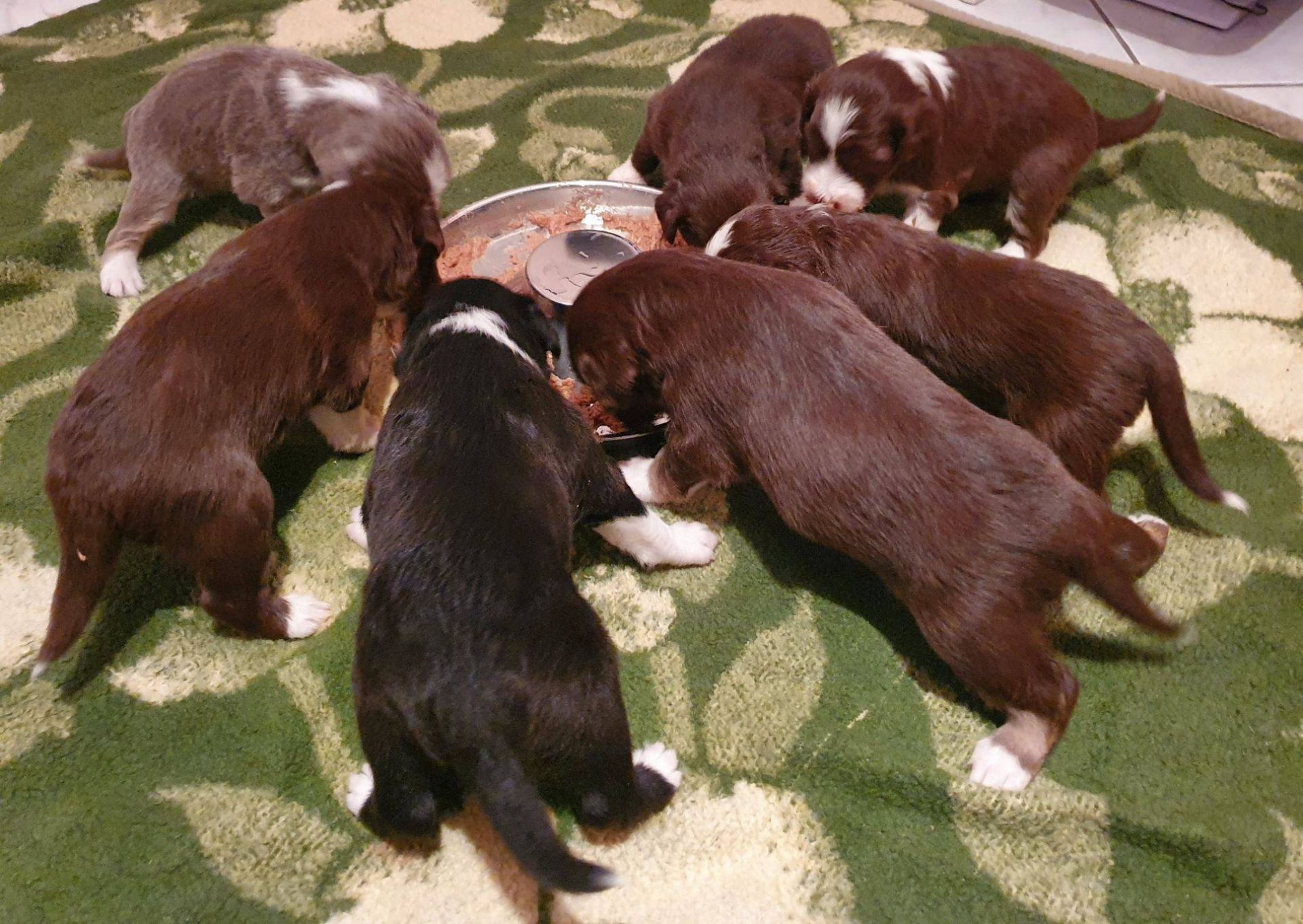 Die Welpen werden immer mobiler und fangen auch an, mit dem Spielzeug zu spielen. Der Energiebedarf steigt, was man merkt, wie sie beim Fressen reinhauen. Allerdings melden sie sich gar nicht, wenn sie Hunger haben. Es sind einfach nur zufriedene und ausgeglichene Babies. Man muss sie zum Fressen wecken. Seit heute können sie auch aus dem Napf trinken. Bei der Mama zugeschaut, ausprobiert und für gut befunden.