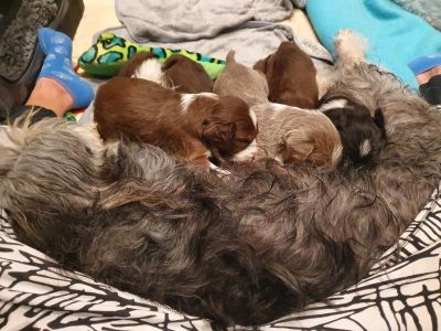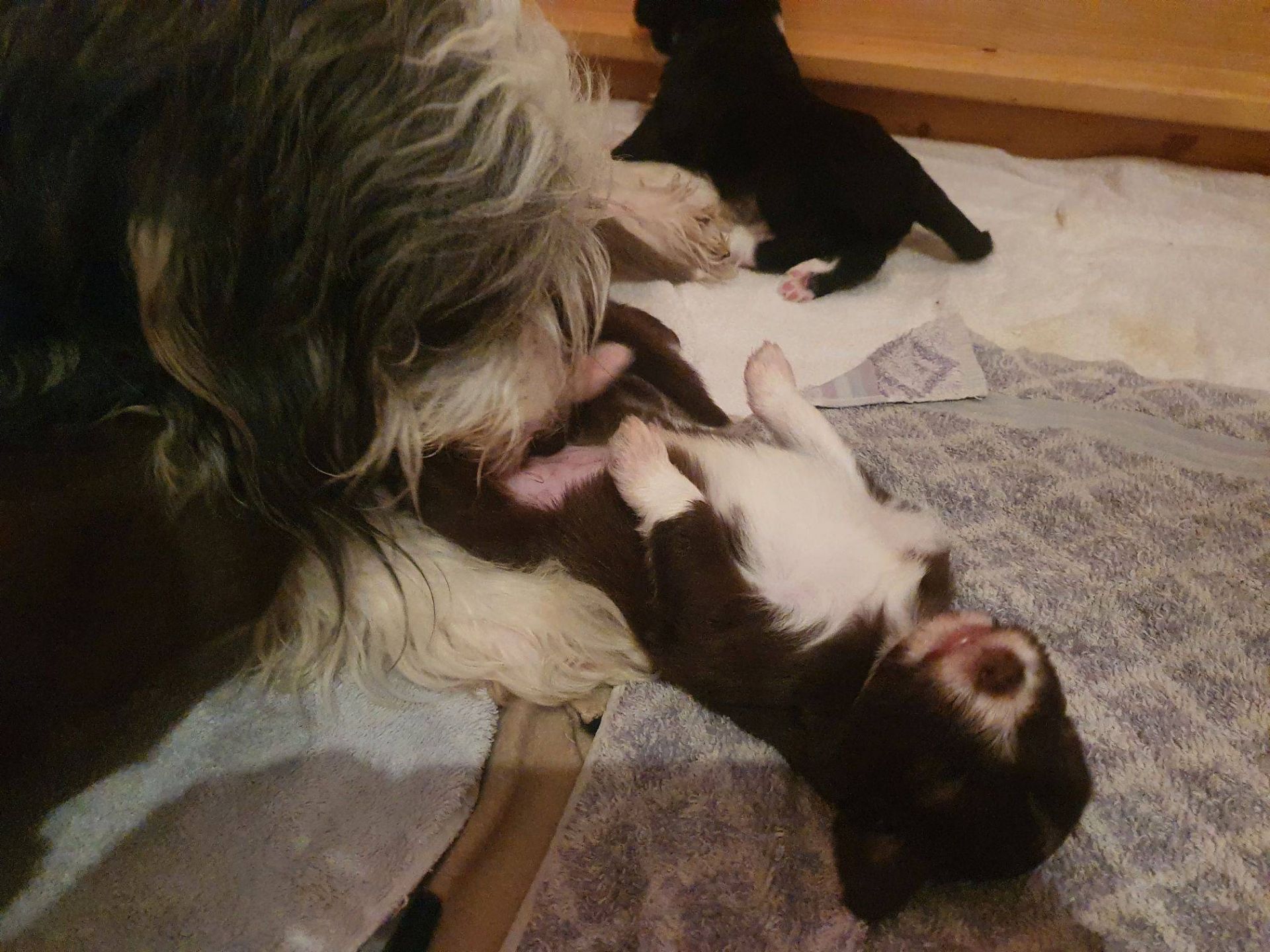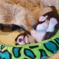 Die Zähne sind bei allen Babies spürbar und seit ich zufüttere, säugt Blaze nur noch 4-5 Mal am Tag, was sie aber nicht davon abhält, mich nachts trotzdem alle 2-3 Stunden zu wecken, um nach den Babies zu schauen. Es wird einmal kurz durchgezählt, alle abgeschleckt und dann lässt sie mich mit der quäckenden Bande sitzen :-) Zweimal am Tag bekommen sie ihr Starter Mousse, was ihnen sehr gut schmeckt. Die Ziegenmilch verschmähen sie weiterhin, die wird nur im äussersten Notfall, also wenn die Mama sie weckt und dann geht, genommen.