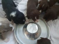 Heute sind sie genau drei Wochen alt. An der Milchbar wird es zunehmend enger, obwohl Blaze wirklich in den unmöglichsten Positionen liegt, damit alle was abbekommen. Sie ist und bleibt einfach eine Supermama. Trotzdem haben wir heute angefangen, zuzufüttern. Für eine etwas größere Motivation gab es die Ziegenmilch vor der Mamamilch. Das Geschrei war groß, wie immer, wenn was neues kommt. Sehr witzig, wie jeder einzelne unterschiedlich reagiert hat. Claire war sehr skeptisch und hat sich das alles erst mal angeschaut, Cody, unternehmungslustig wie er ist, einmal komplett durch die Schüssel, Caja sehr neugierig aber zurückhaltend, ebenso Cleo und Carlo, Clarence und Cleon hatten den Dreh relativ schnell raus, dass man nicht nur saugen sondern auch schlecken kann. Wirkliche Begeisterung sieht anders aus. Was waren sie froh als endlich die Mama kam und alles seinen gewohnten Gang ging :-) Sie bekommen die Ziegenmilch jetzt vor jedem Säugen angeboten und von mal zu mal klappt es besser.